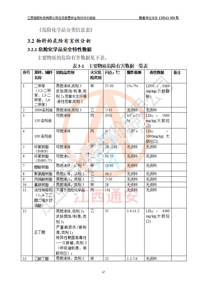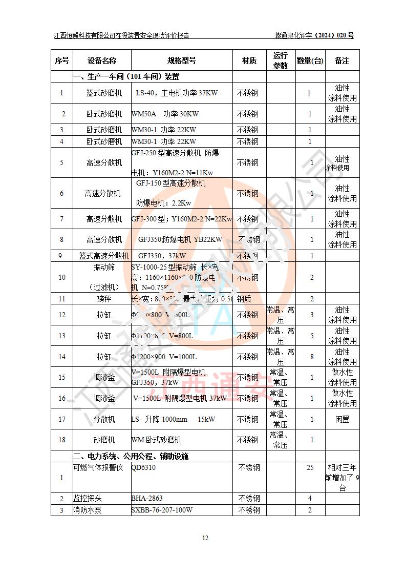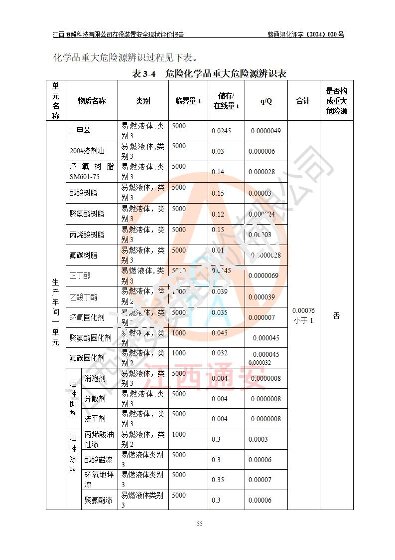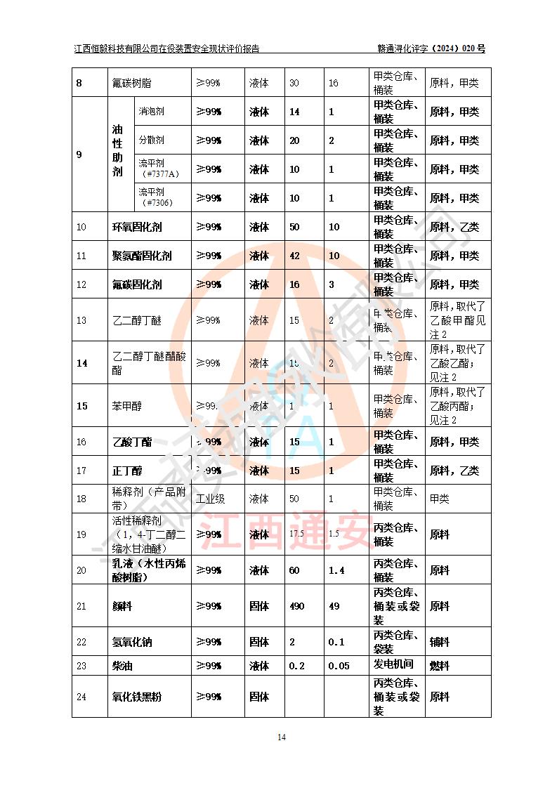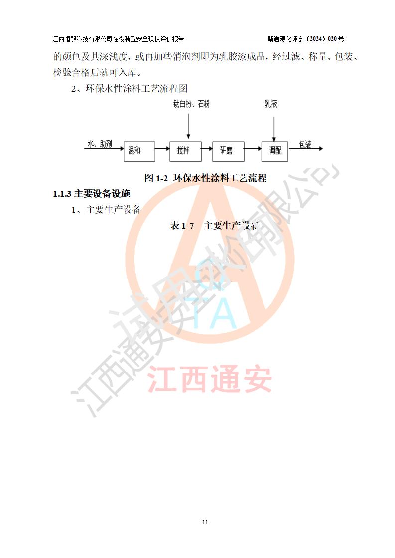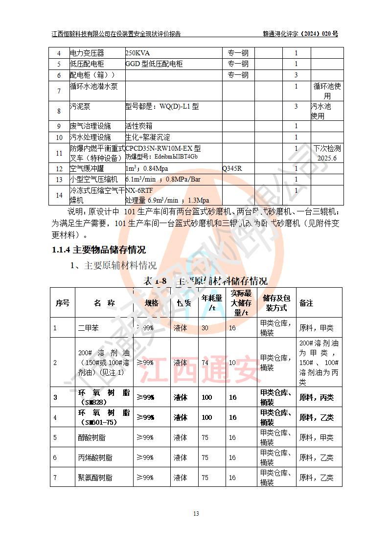 項(xiàng)目簡介 | 江西恒毅科技有限公司是一家民營企業(yè),主要從事油漆、涂料的生產(chǎn)、銷售。企業(yè)于2012年在江西永修云山經(jīng)濟(jì)開發(fā)區(qū)星火工業(yè)園建設(shè)年產(chǎn)2000噸高固體分紫外光固化樹脂涂料、200噸**丙烯酸水性涂料、1000噸油性涂料生產(chǎn)裝置。企業(yè)于2015年12月取得了安全生產(chǎn)許可證;2018年、2021年辦理了延期。其中,年產(chǎn)2000噸高固體分紫外光固化樹脂涂料(非危險(xiǎn)化學(xué)品)因?yàn)槭袌?chǎng)原因一直沒有生產(chǎn),本報(bào)告不予以介紹、評(píng)價(jià)。企業(yè)**丙烯酸水性涂料根據(jù)市場(chǎng)情況生產(chǎn)(有業(yè)務(wù)單需求才生產(chǎn)),一般生產(chǎn)油性涂料,很少生產(chǎn)**丙烯酸水性涂料,**丙烯酸水性涂料不用辦理生產(chǎn)許可證。 | ||||