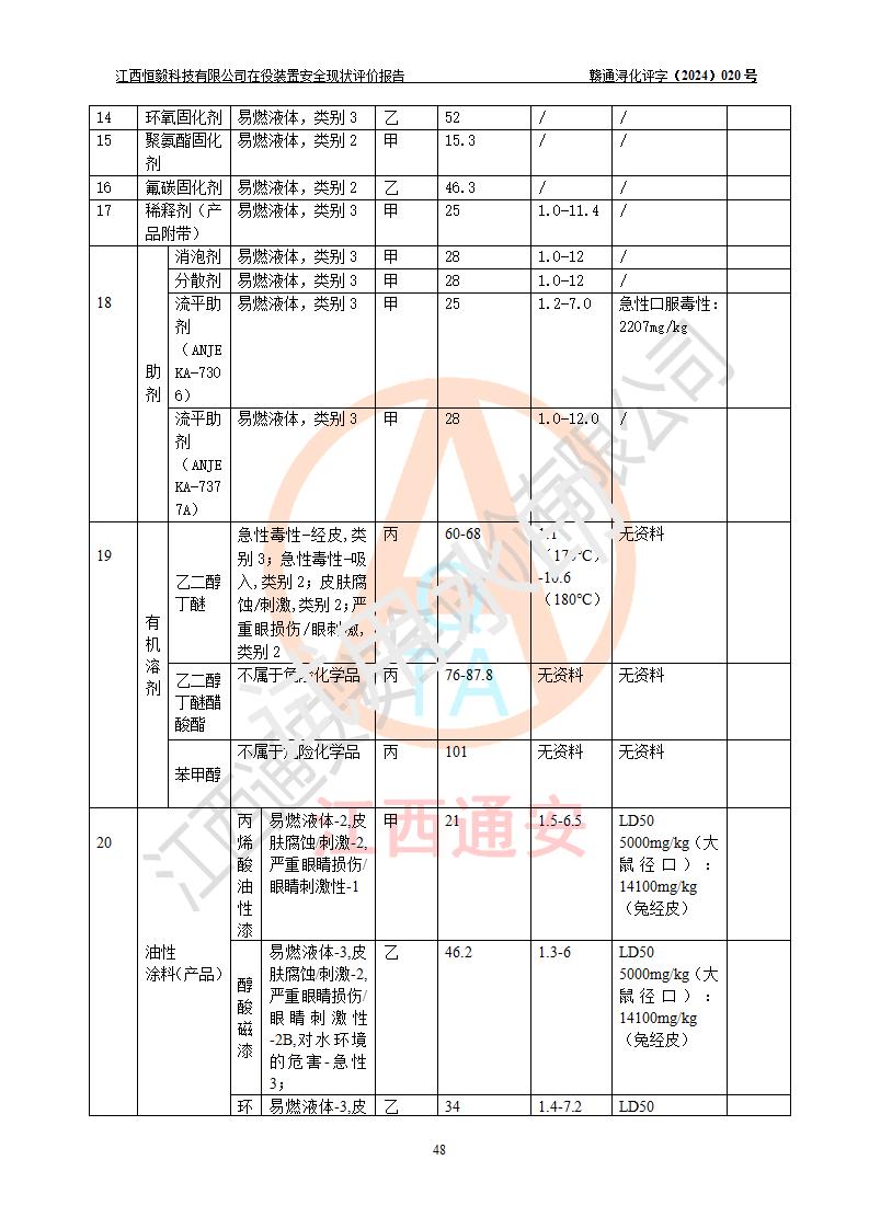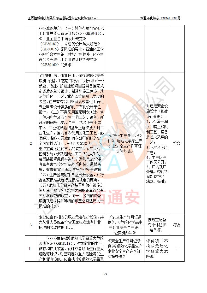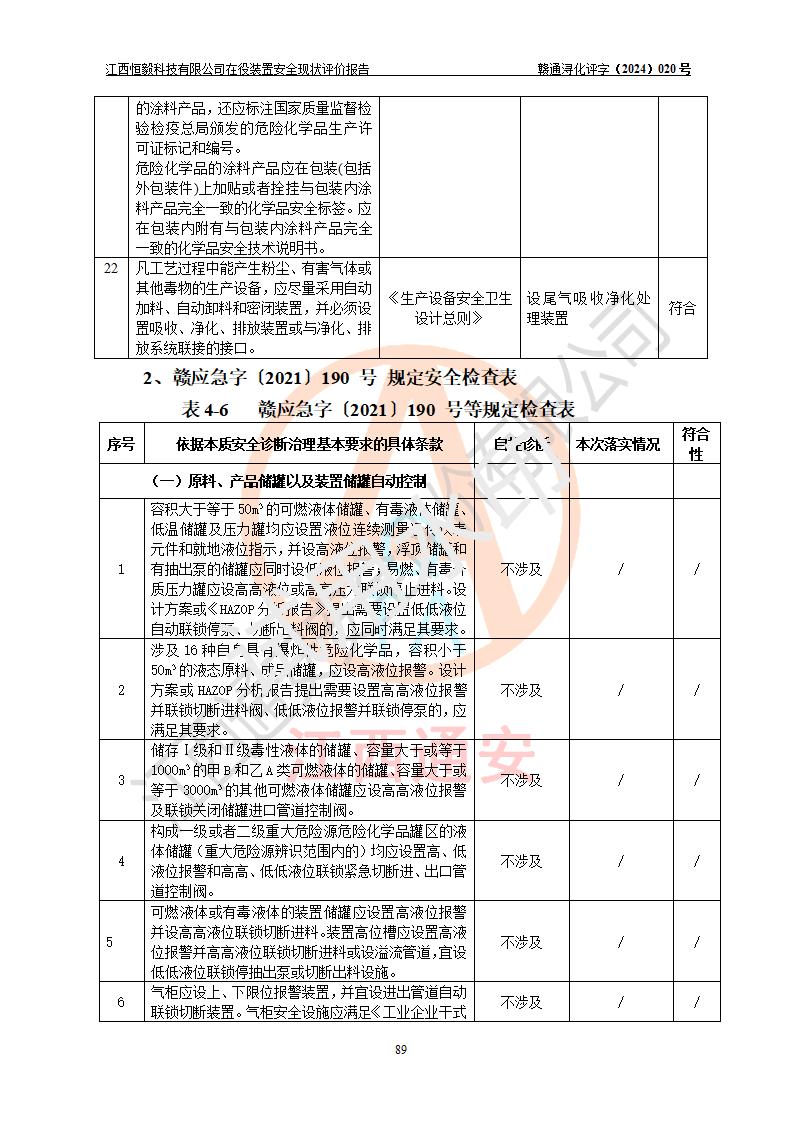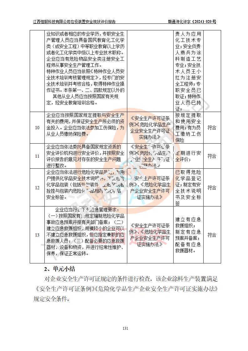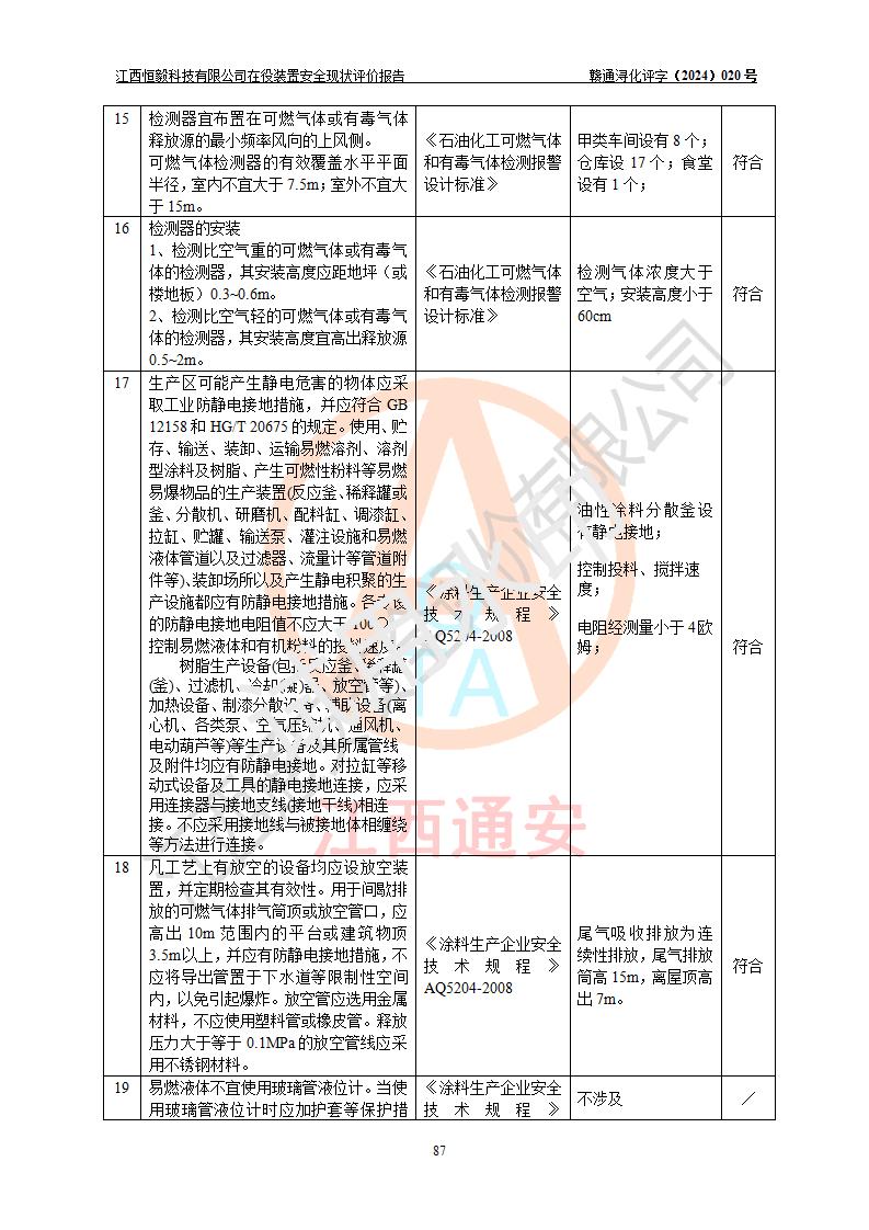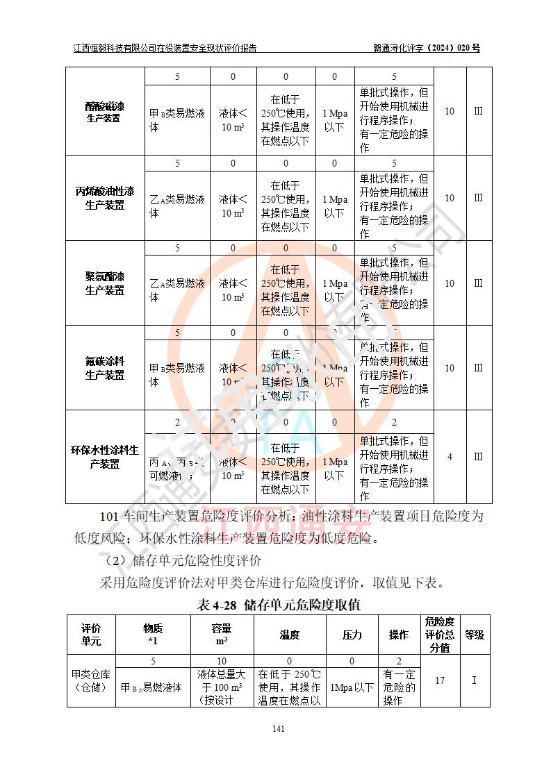 評(píng)價(jià)結(jié)論 | 經(jīng)評(píng)價(jià)組評(píng)價(jià),江西恒毅科技有限公司總體布局、設(shè)備布置情況與設(shè)計(jì)圖紙一致,在役裝置不涉及重點(diǎn)監(jiān)管的危險(xiǎn)化學(xué)品、危險(xiǎn)工藝、重大危險(xiǎn)源(自動(dòng)化監(jiān)控設(shè)施可滿足《江西省化工企業(yè)自動(dòng)化提升實(shí)施方案(試行)》要求),企業(yè)主要負(fù)責(zé)人、安全負(fù)責(zé)人有相關(guān)化學(xué)專業(yè)學(xué)歷,且有3年以上化工行業(yè)從業(yè)經(jīng)歷,企業(yè)法人**及安全負(fù)責(zé)人已取得安全考核合格證。江西恒毅科技有限公司1000噸油性涂料在役裝置配套安全裝置、防護(hù)設(shè)施以及采取的安全技術(shù)措施及安全管理措施符合**有關(guān)法規(guī)、標(biāo)準(zhǔn)、規(guī)范要求,符合《危險(xiǎn)化學(xué)品生產(chǎn)企業(yè)安全生產(chǎn)許可證實(shí)施辦法》規(guī)定的安全生產(chǎn)條件,風(fēng)險(xiǎn)可控,可滿足安全生產(chǎn)條件。 | ||||