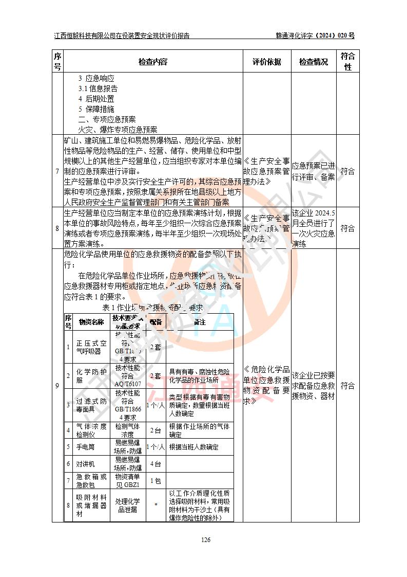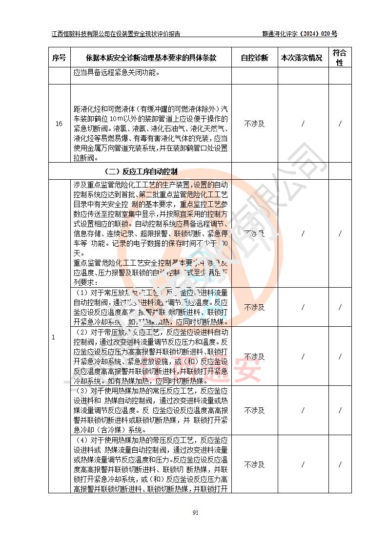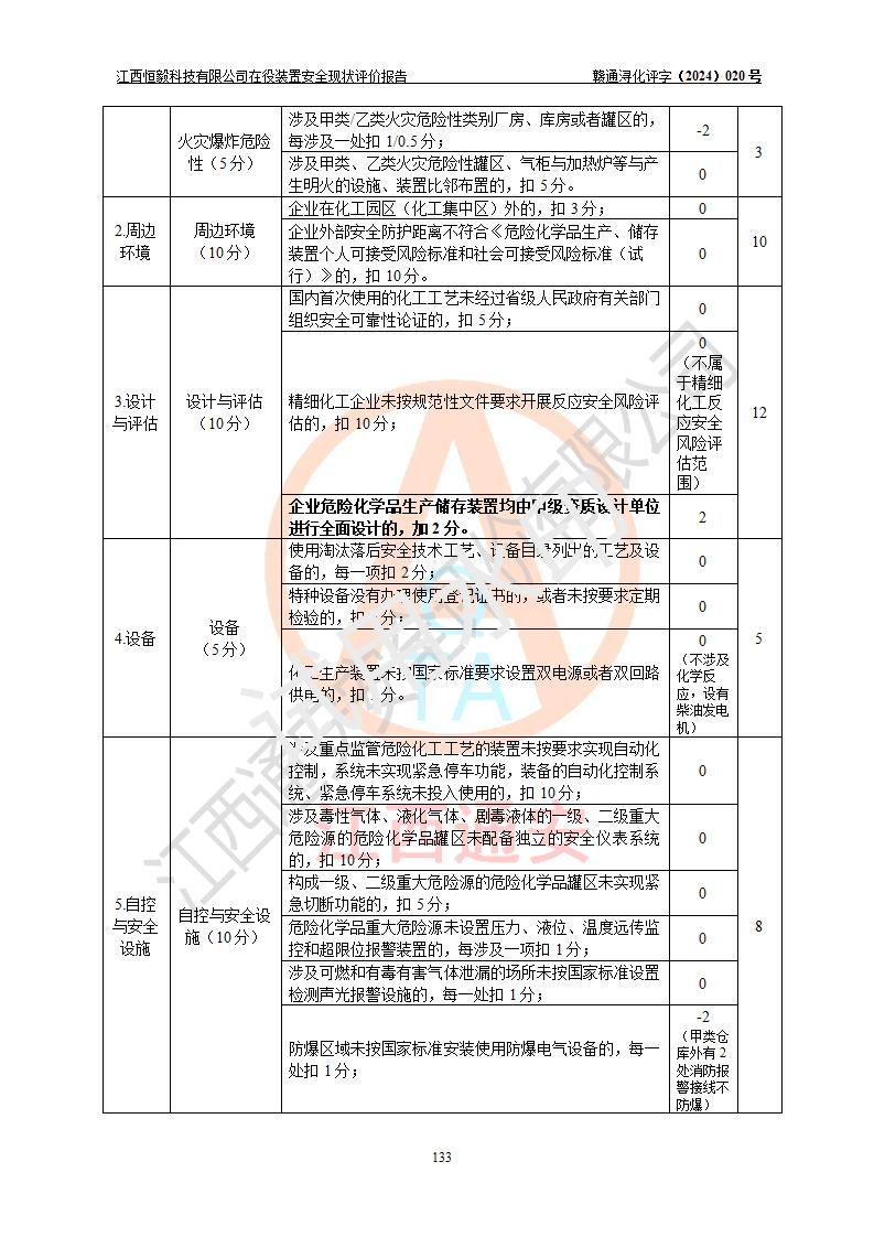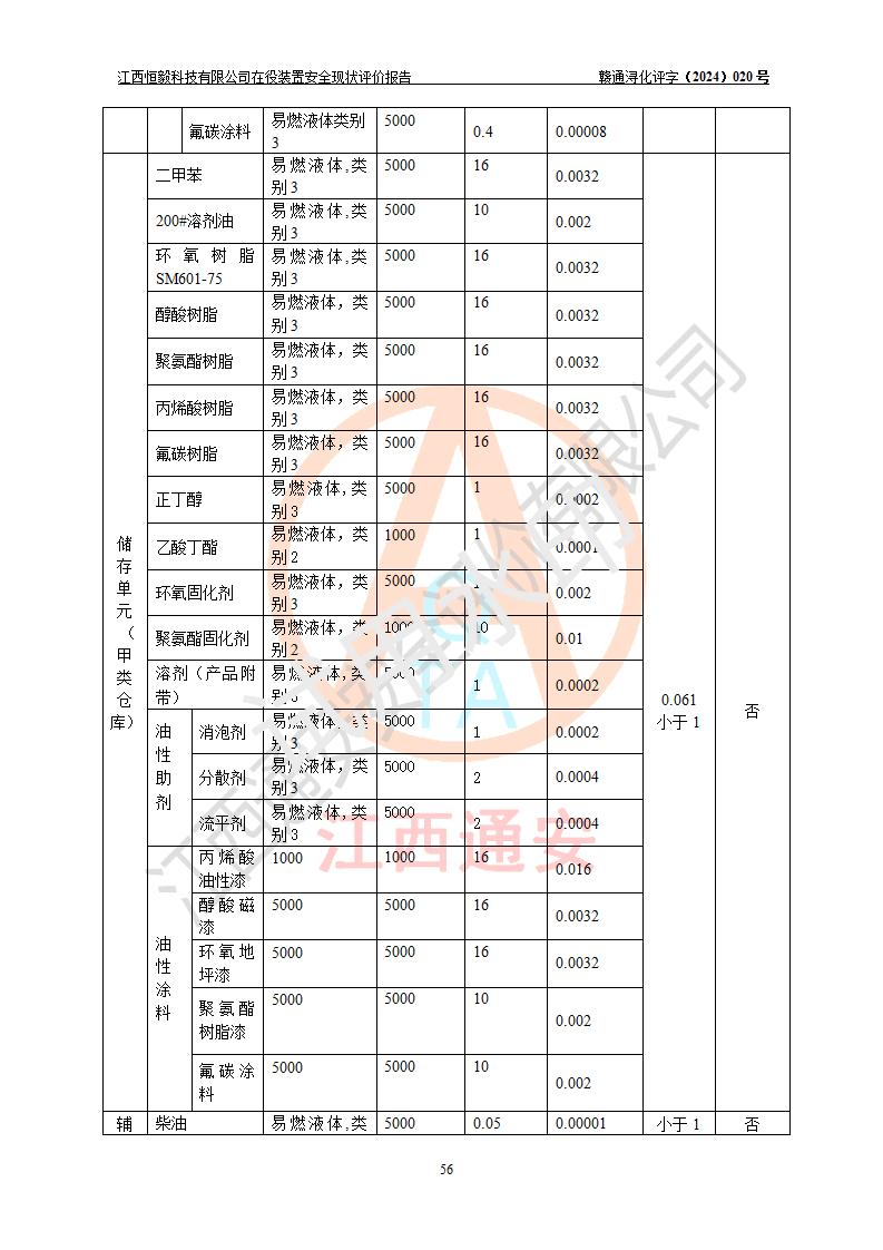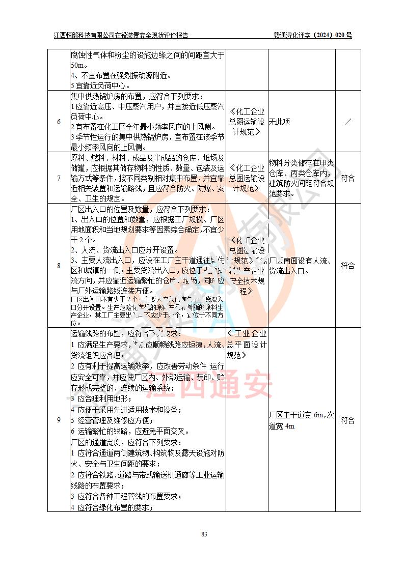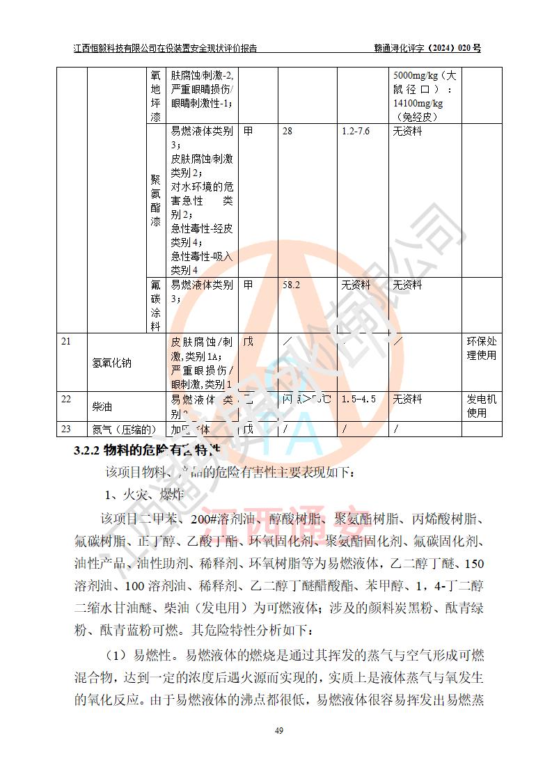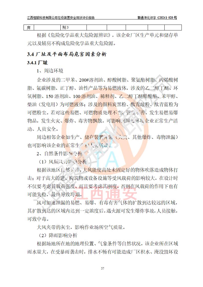 評(píng)價(jià)結(jié)論 | 經(jīng)評(píng)價(jià)組評(píng)價(jià),江西恒毅科技有限公司總體布局、設(shè)備布置情況與設(shè)計(jì)圖紙一致,在役裝置不涉及重點(diǎn)監(jiān)管的危險(xiǎn)化學(xué)品、危險(xiǎn)工藝、重大危險(xiǎn)源(自動(dòng)化監(jiān)控設(shè)施可滿足《江西省化工企業(yè)自動(dòng)化提升實(shí)施方案(試行)》要求),企業(yè)主要負(fù)責(zé)人、安全負(fù)責(zé)人有相關(guān)化學(xué)專業(yè)學(xué)歷,且有3年以上化工行業(yè)從業(yè)經(jīng)歷,企業(yè)法人**及安全負(fù)責(zé)人已取得安全考核合格證。江西恒毅科技有限公司1000噸油性涂料在役裝置配套安全裝置、防護(hù)設(shè)施以及采取的安全技術(shù)措施及安全管理措施符合**有關(guān)法規(guī)、標(biāo)準(zhǔn)、規(guī)范要求,符合《危險(xiǎn)化學(xué)品生產(chǎn)企業(yè)安全生產(chǎn)許可證實(shí)施辦法》規(guī)定的安全生產(chǎn)條件,風(fēng)險(xiǎn)可控,可滿足安全生產(chǎn)條件。 | ||||