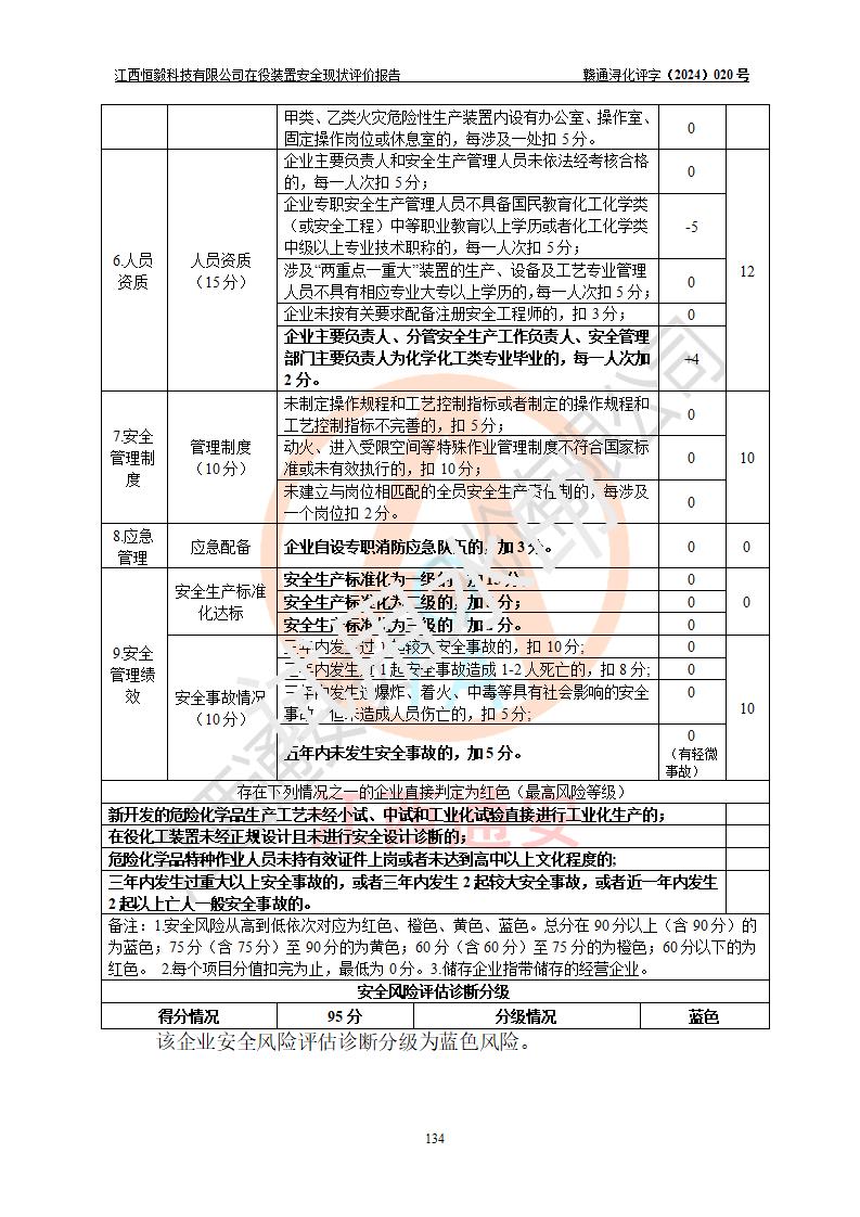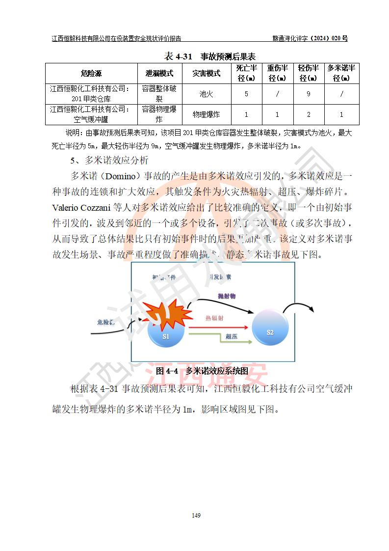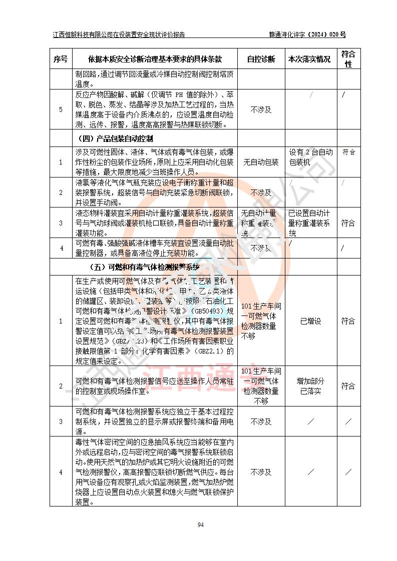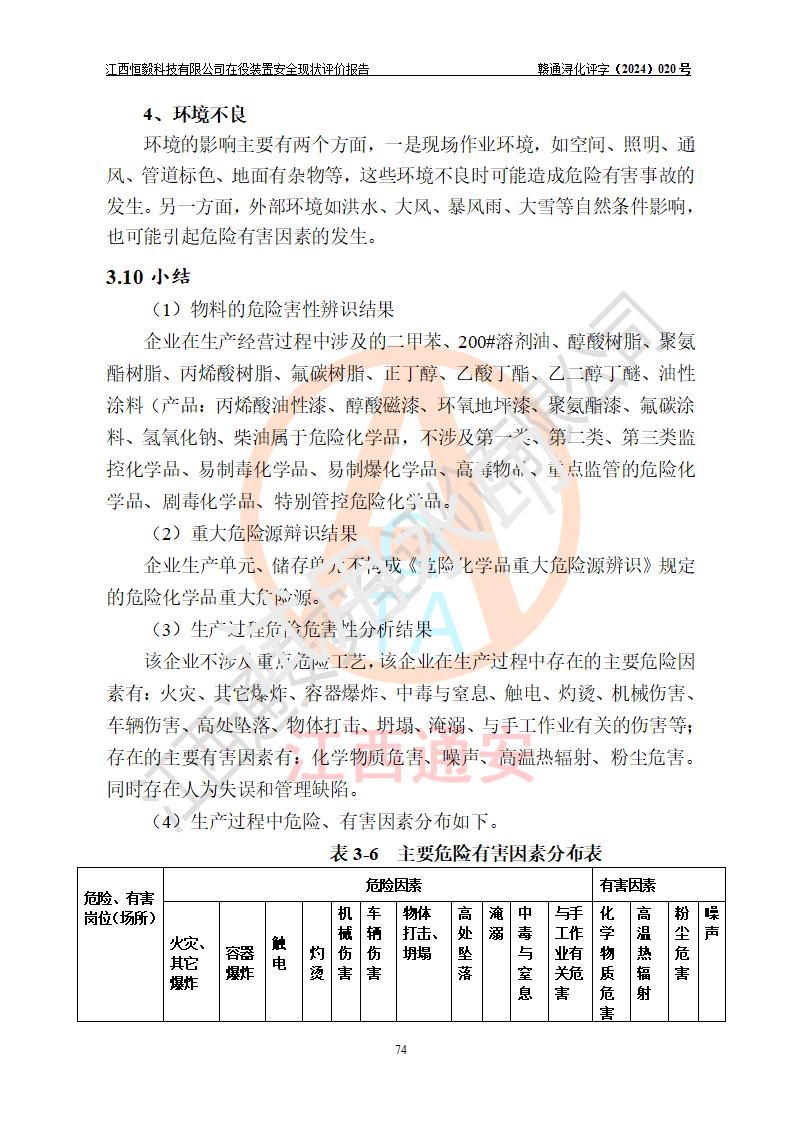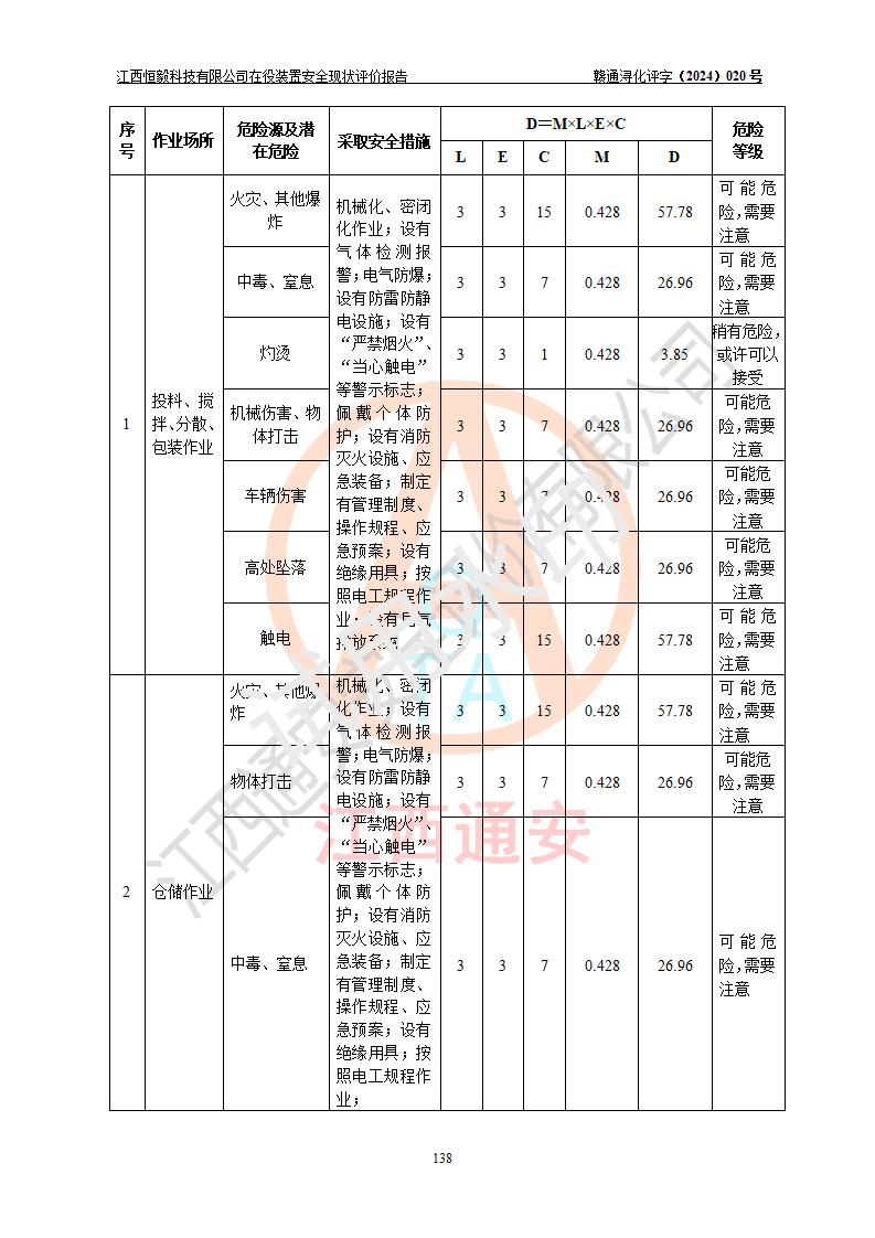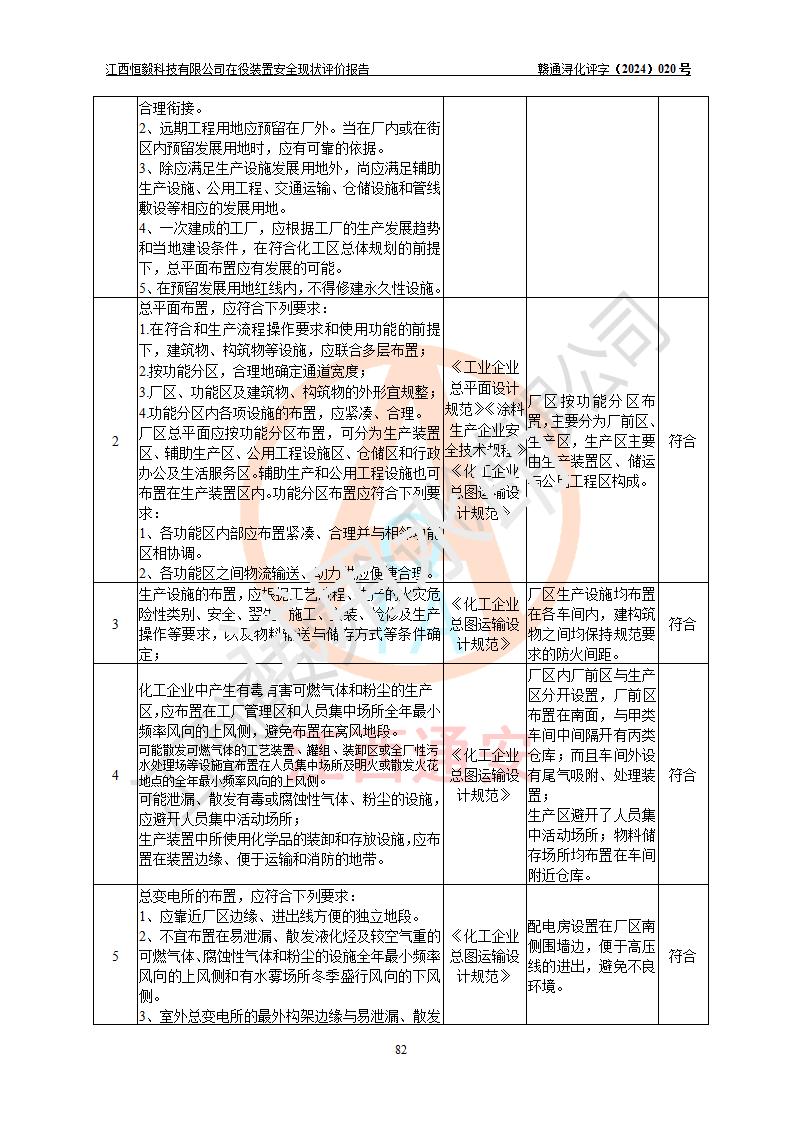 評(píng)價(jià)結(jié)論 | 經(jīng)評(píng)價(jià)組評(píng)價(jià),江西恒毅科技有限公司總體布局、設(shè)備布置情況與設(shè)計(jì)圖紙一致,在役裝置不涉及重點(diǎn)監(jiān)管的危險(xiǎn)化學(xué)品、危險(xiǎn)工藝、重大危險(xiǎn)源(自動(dòng)化監(jiān)控設(shè)施可滿足《江西省化工企業(yè)自動(dòng)化提升實(shí)施方案(試行)》要求),企業(yè)主要負(fù)責(zé)人、安全負(fù)責(zé)人有相關(guān)化學(xué)專業(yè)學(xué)歷,且有3年以上化工行業(yè)從業(yè)經(jīng)歷,企業(yè)法人**及安全負(fù)責(zé)人已取得安全考核合格證。江西恒毅科技有限公司1000噸油性涂料在役裝置配套安全裝置、防護(hù)設(shè)施以及采取的安全技術(shù)措施及安全管理措施符合**有關(guān)法規(guī)、標(biāo)準(zhǔn)、規(guī)范要求,符合《危險(xiǎn)化學(xué)品生產(chǎn)企業(yè)安全生產(chǎn)許可證實(shí)施辦法》規(guī)定的安全生產(chǎn)條件,風(fēng)險(xiǎn)可控,可滿足安全生產(chǎn)條件。 | ||||