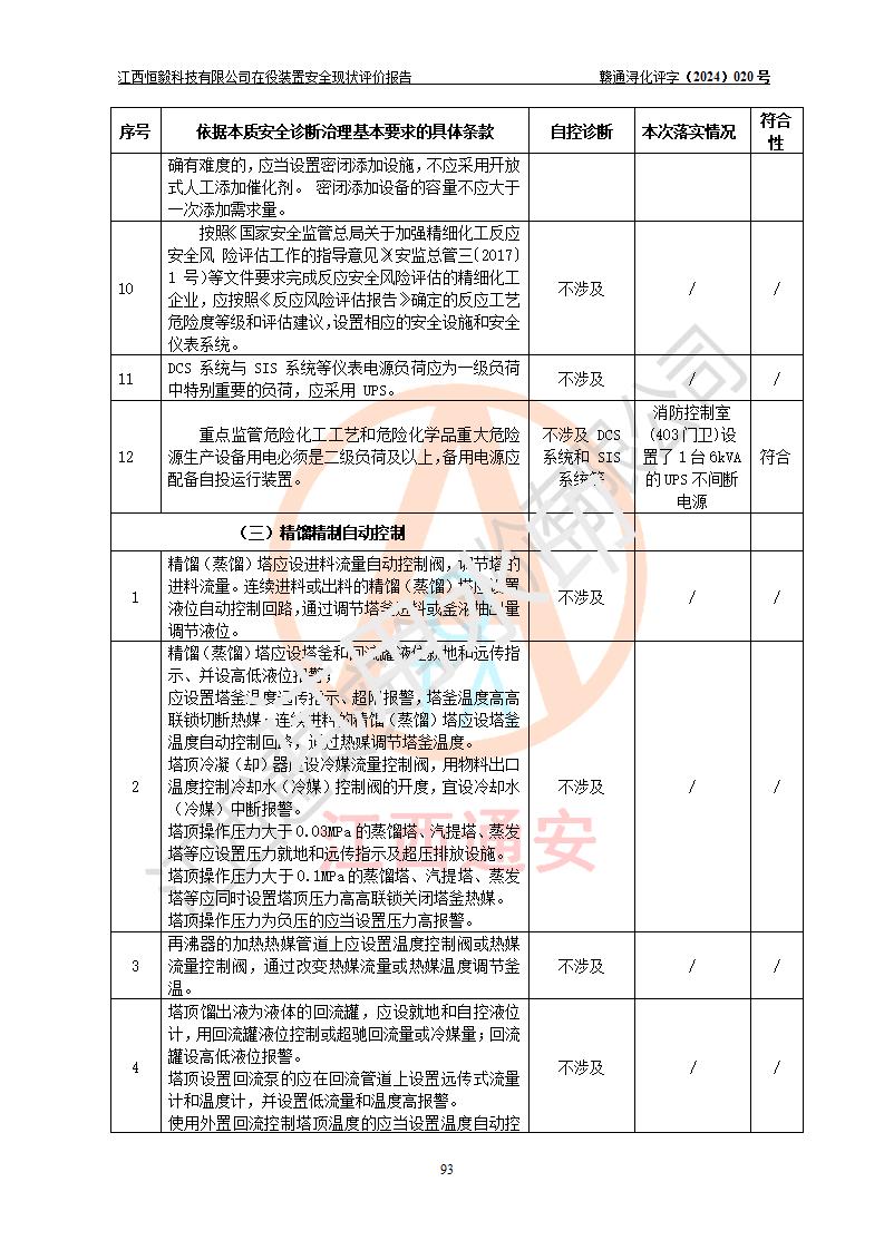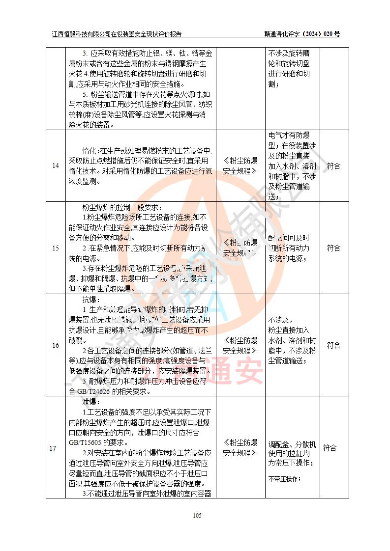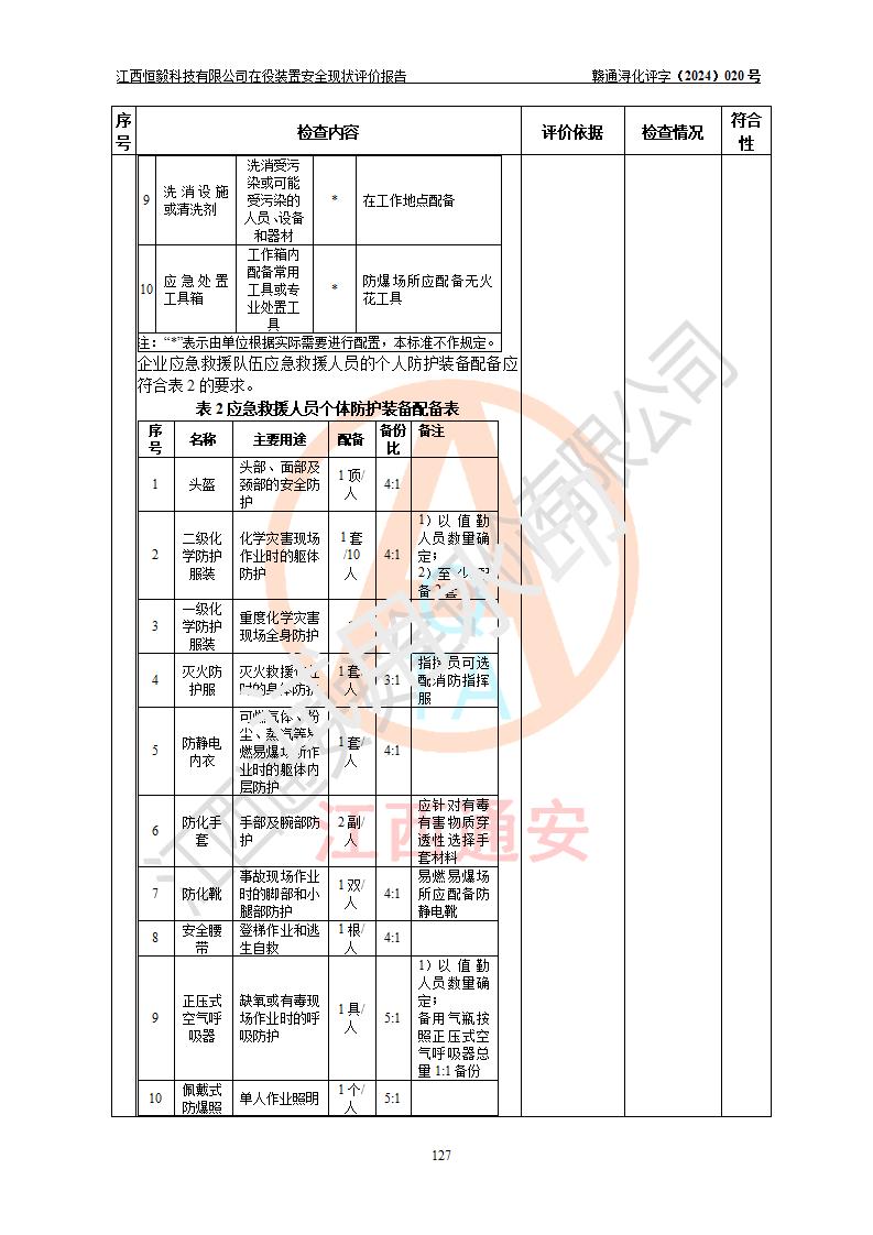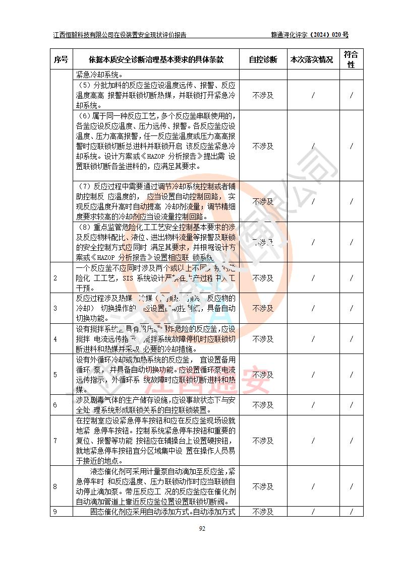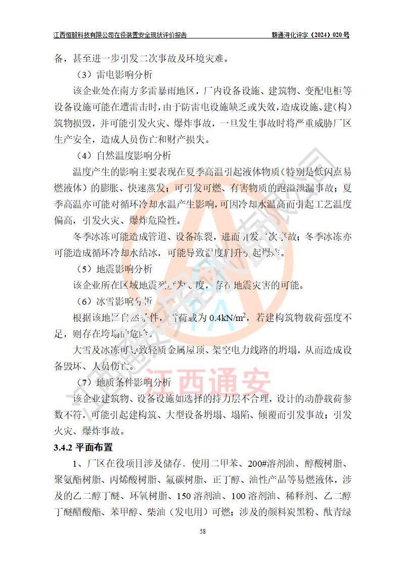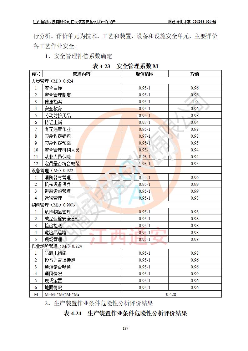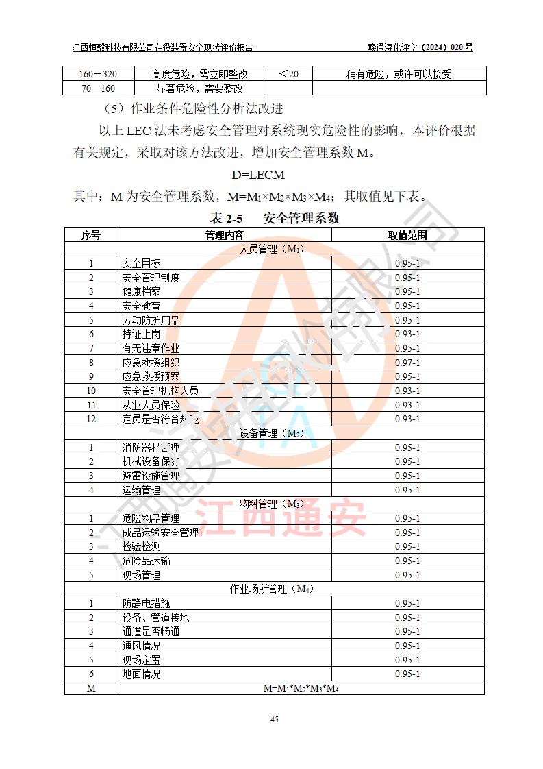 評(píng)價(jià)結(jié)論 | 經(jīng)評(píng)價(jià)組評(píng)價(jià),江西恒毅科技有限公司總體布局、設(shè)備布置情況與設(shè)計(jì)圖紙一致,在役裝置不涉及重點(diǎn)監(jiān)管的危險(xiǎn)化學(xué)品、危險(xiǎn)工藝、重大危險(xiǎn)源(自動(dòng)化監(jiān)控設(shè)施可滿足《江西省化工企業(yè)自動(dòng)化提升實(shí)施方案(試行)》要求),企業(yè)主要負(fù)責(zé)人、安全負(fù)責(zé)人有相關(guān)化學(xué)專業(yè)學(xué)歷,且有3年以上化工行業(yè)從業(yè)經(jīng)歷,企業(yè)法人**及安全負(fù)責(zé)人已取得安全考核合格證。江西恒毅科技有限公司1000噸油性涂料在役裝置配套安全裝置、防護(hù)設(shè)施以及采取的安全技術(shù)措施及安全管理措施符合**有關(guān)法規(guī)、標(biāo)準(zhǔn)、規(guī)范要求,符合《危險(xiǎn)化學(xué)品生產(chǎn)企業(yè)安全生產(chǎn)許可證實(shí)施辦法》規(guī)定的安全生產(chǎn)條件,風(fēng)險(xiǎn)可控,可滿足安全生產(chǎn)條件。 | ||||