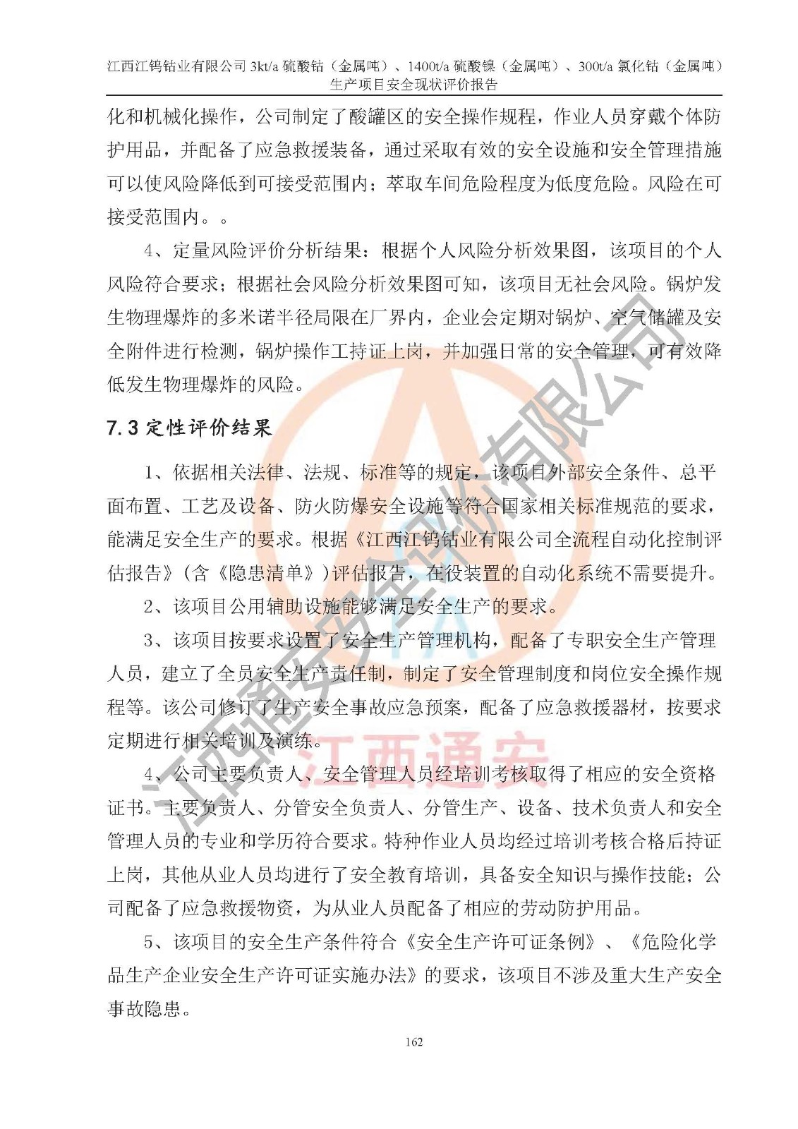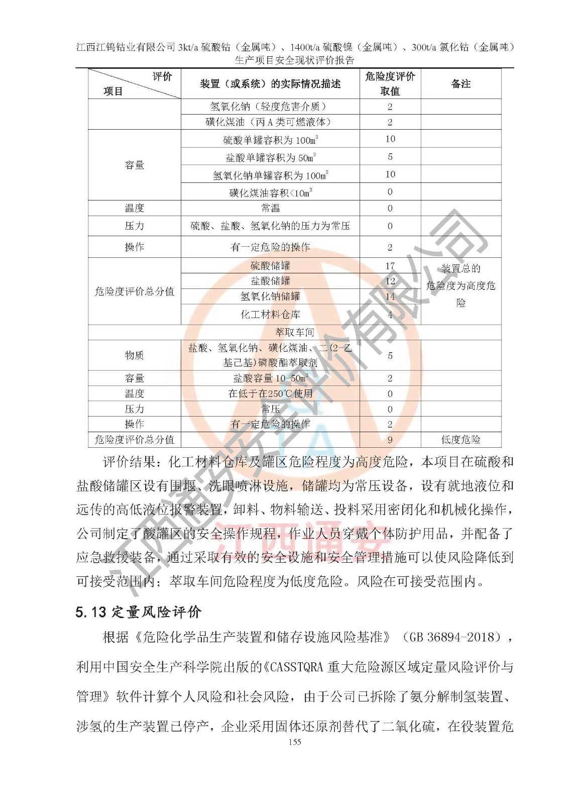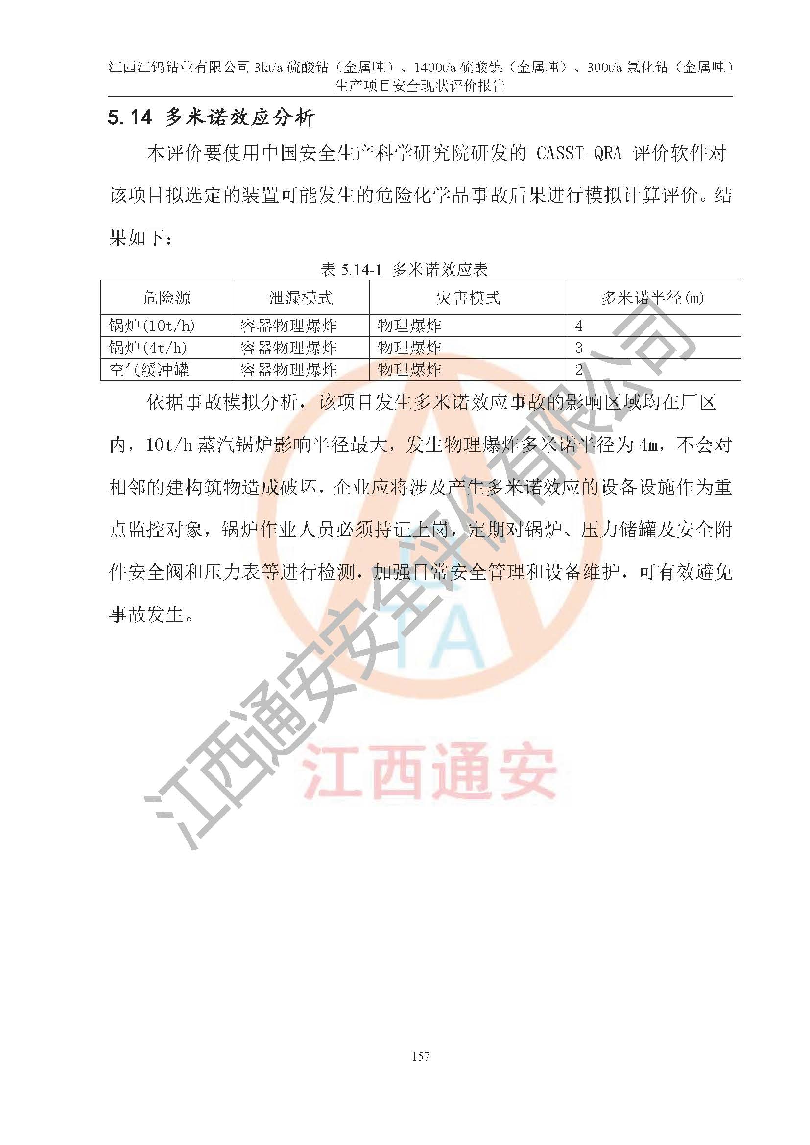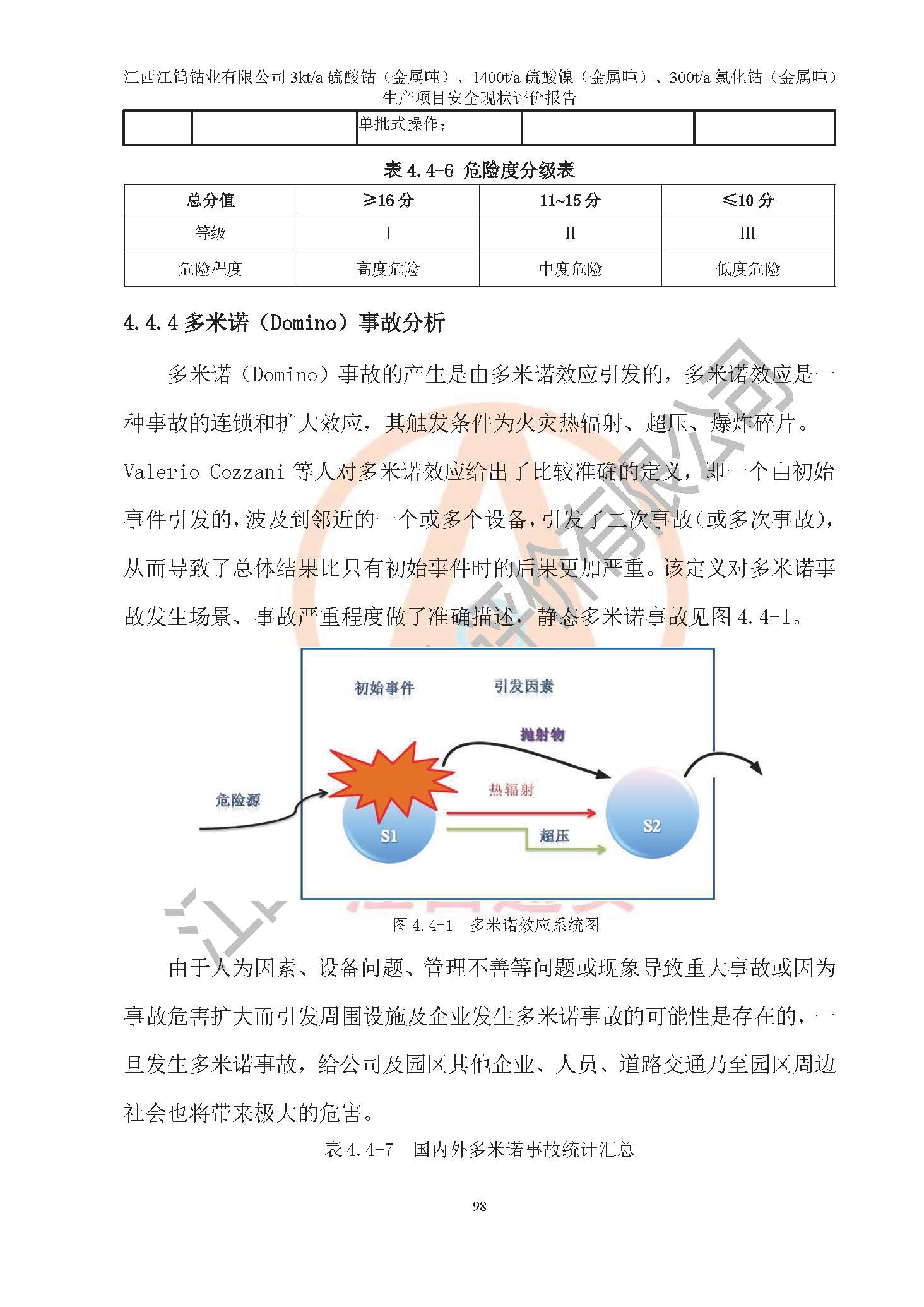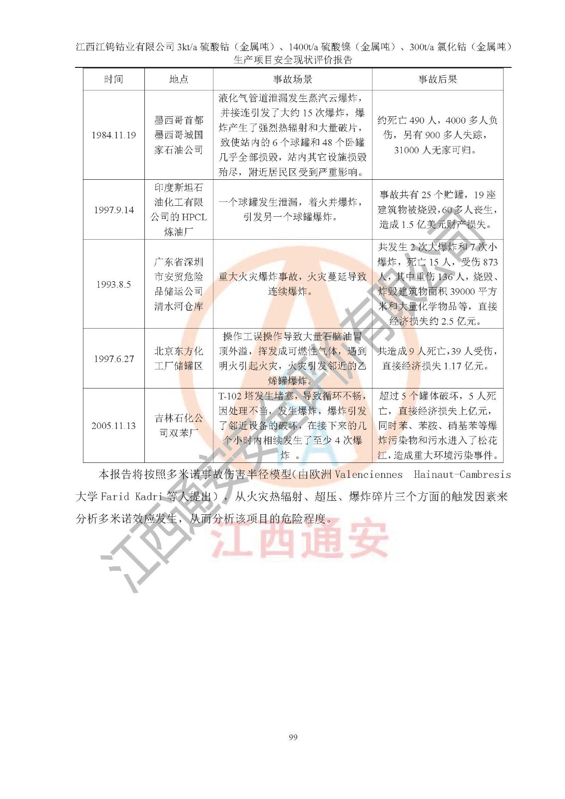 一、定量評價(jià)結(jié)果 1、作業(yè)條件危險(xiǎn)性分析評價(jià)結(jié)果:在選定的13個(gè)評價(jià)單元中,作業(yè)危險(xiǎn)等級為“可能危險(xiǎn),需要注意”,作業(yè)條件相對安全。 2、危險(xiǎn)程評價(jià)法分析結(jié)果:化工材料倉庫及罐區(qū)危險(xiǎn)程度為**危險(xiǎn),本項(xiàng)目在硫酸和鹽酸儲罐區(qū)設(shè)有圍堰、洗眼噴淋設(shè)施,儲罐均為常壓設(shè)備,設(shè)有就地液位和遠(yuǎn)傳的高低液位報(bào)警裝置,卸料、物料輸送、投料采用密閉化和機(jī)械化操作,公司制定了酸罐區(qū)的安全操作規(guī)程,作業(yè)人員穿戴個(gè)體防護(hù)用品,并配備了應(yīng)急救援裝備,通過采取**的安全設(shè)施和安全管理措施可以使風(fēng)險(xiǎn)降低到可接受范圍內(nèi);萃取車間危險(xiǎn)程度為低度危險(xiǎn)。風(fēng)險(xiǎn)在可接受范圍內(nèi)。。 4、定量風(fēng)險(xiǎn)評價(jià)分析結(jié)果:根據(jù)個(gè)人風(fēng)險(xiǎn)分析效果圖,該項(xiàng)目的個(gè)人風(fēng)險(xiǎn)符合要求;根據(jù)社會風(fēng)險(xiǎn)分析效果圖可知,該項(xiàng)目無社會風(fēng)險(xiǎn)。鍋爐發(fā)生物理爆炸的多米諾半徑局限在廠界內(nèi),企業(yè)會定期對鍋爐、空氣儲罐及安全附件進(jìn)行檢測,鍋爐操作工持證上崗,并加強(qiáng)日常的安全管理,可**降低發(fā)生物理爆炸的風(fēng)險(xiǎn)。 二、定性評價(jià)結(jié)果 1、依據(jù)相關(guān)法律、法規(guī)、標(biāo)準(zhǔn)等的規(guī)定,該項(xiàng)目外部安全條件、總平面布置、工藝及設(shè)備、防火防爆安全設(shè)施等符合**相關(guān)標(biāo)準(zhǔn)規(guī)范的要求,能滿足安全生產(chǎn)的要求。根據(jù)《江西江鎢鈷業(yè)有限公司全流程自動(dòng)化控制評估報(bào)告》(含《隱患清單》)評估報(bào)告,在役裝置的自動(dòng)化系統(tǒng)不需要提升。 2、該項(xiàng)目公用輔助設(shè)施能夠滿足安全生產(chǎn)的要求。 3、該項(xiàng)目按要求設(shè)置了安全生產(chǎn)管理機(jī)構(gòu),配備了專職安全生產(chǎn)管理人員,建立了全員安全生產(chǎn)責(zé)任制,制定了安全管理制度和崗位安全操作規(guī)程等。該公司修訂了生產(chǎn)安全事故應(yīng)急預(yù)案,配備了應(yīng)急救援器材,按要求定期進(jìn)行相關(guān)培訓(xùn)及演練。 4、公司主要負(fù)責(zé)人、安全管理人員經(jīng)培訓(xùn)考核取得了相應(yīng)的安全資格證書。主要負(fù)責(zé)人、分管安全負(fù)責(zé)人、分管生產(chǎn)、設(shè)備、技術(shù)負(fù)責(zé)人和安全管理人員的專業(yè)和學(xué)歷符合要求。特種作業(yè)人員均經(jīng)過培訓(xùn)考核合格后持證上崗,其他從業(yè)人員均進(jìn)行了安全教育培訓(xùn),具備安全知識與操作技能;公司配備了應(yīng)急救援物資,為從業(yè)人員配備了相應(yīng)的勞動(dòng)防護(hù)用品。 5、該項(xiàng)目的安全生產(chǎn)條件符合《安全生產(chǎn)許可證條例》、《危險(xiǎn)化學(xué)品生產(chǎn)企業(yè)安全生產(chǎn)許可證實(shí)施辦法》的要求,該項(xiàng)目不涉及重大生產(chǎn)安全事故隱患。 6、該項(xiàng)目不涉及重大生產(chǎn)安全事故隱患,采取的安全設(shè)施符合要求。 三、評價(jià)結(jié)論 江西江鎢鈷業(yè)有限公司符合城鄉(xiāng)規(guī)劃和布局,總平面布置符合《建筑設(shè)計(jì)防火規(guī)范(2018年版)》GB50016-2014等標(biāo)準(zhǔn)、規(guī)范的要求,采用成熟的生產(chǎn)工藝和設(shè)備,本質(zhì)安全程度較高;生產(chǎn)項(xiàng)目對現(xiàn)場存在事故危險(xiǎn)的設(shè)施和場所采取了合理可行的防護(hù)措施和科學(xué)的管理,使生產(chǎn)過程中的危險(xiǎn)有害因素能得到**控制。建設(shè)項(xiàng)目安全設(shè)施符合**現(xiàn)行有關(guān)法律、法規(guī)、標(biāo)準(zhǔn)的要求。企業(yè)對現(xiàn)場存在的安全問題進(jìn)行了整改,主要的安全缺陷消除。 評價(jià)結(jié)論:江西江鎢鈷業(yè)有限公司3kt/a硫酸鈷(金屬噸)、1400t/a硫酸鎳(金屬噸)、300t/a氯化鈷(金屬噸)生產(chǎn)項(xiàng)目的現(xiàn)場情況與設(shè)計(jì)變更圖紙一致,PLC控制系統(tǒng)設(shè)計(jì)符合要求、運(yùn)行正常,有關(guān)從業(yè)人員資質(zhì)符合《江西省危險(xiǎn)化學(xué)品安全專項(xiàng)整治三年行動(dòng)實(shí)施方案》要求,安全設(shè)施及安全管理符合法律、法規(guī)、標(biāo)準(zhǔn)的要求,安全風(fēng)險(xiǎn)是受控制的,其風(fēng)險(xiǎn)程度是可以接受的,安全設(shè)施符合安全生產(chǎn)條件,能夠滿足安全生產(chǎn)的要求。 |