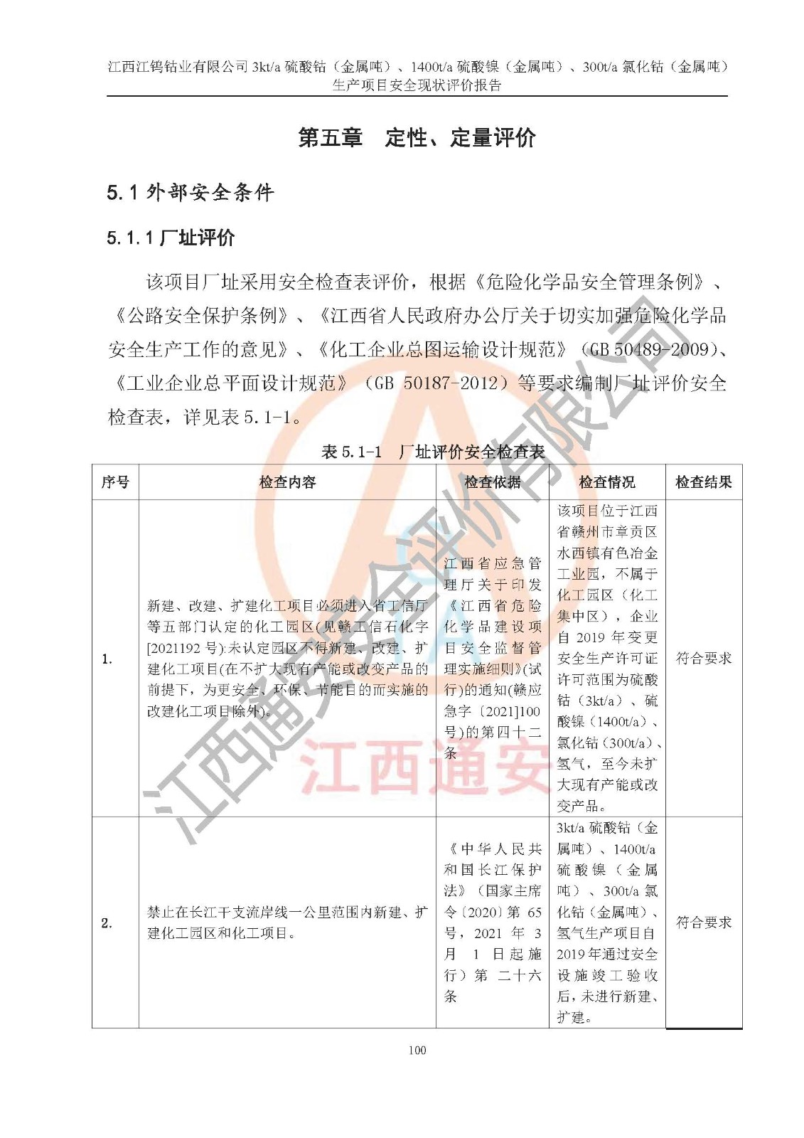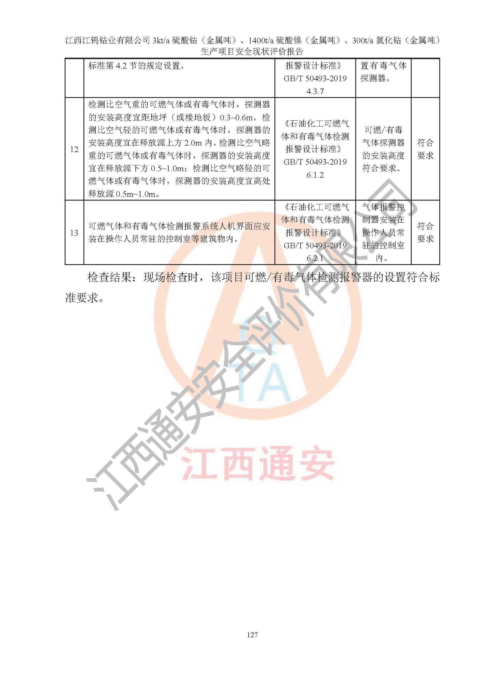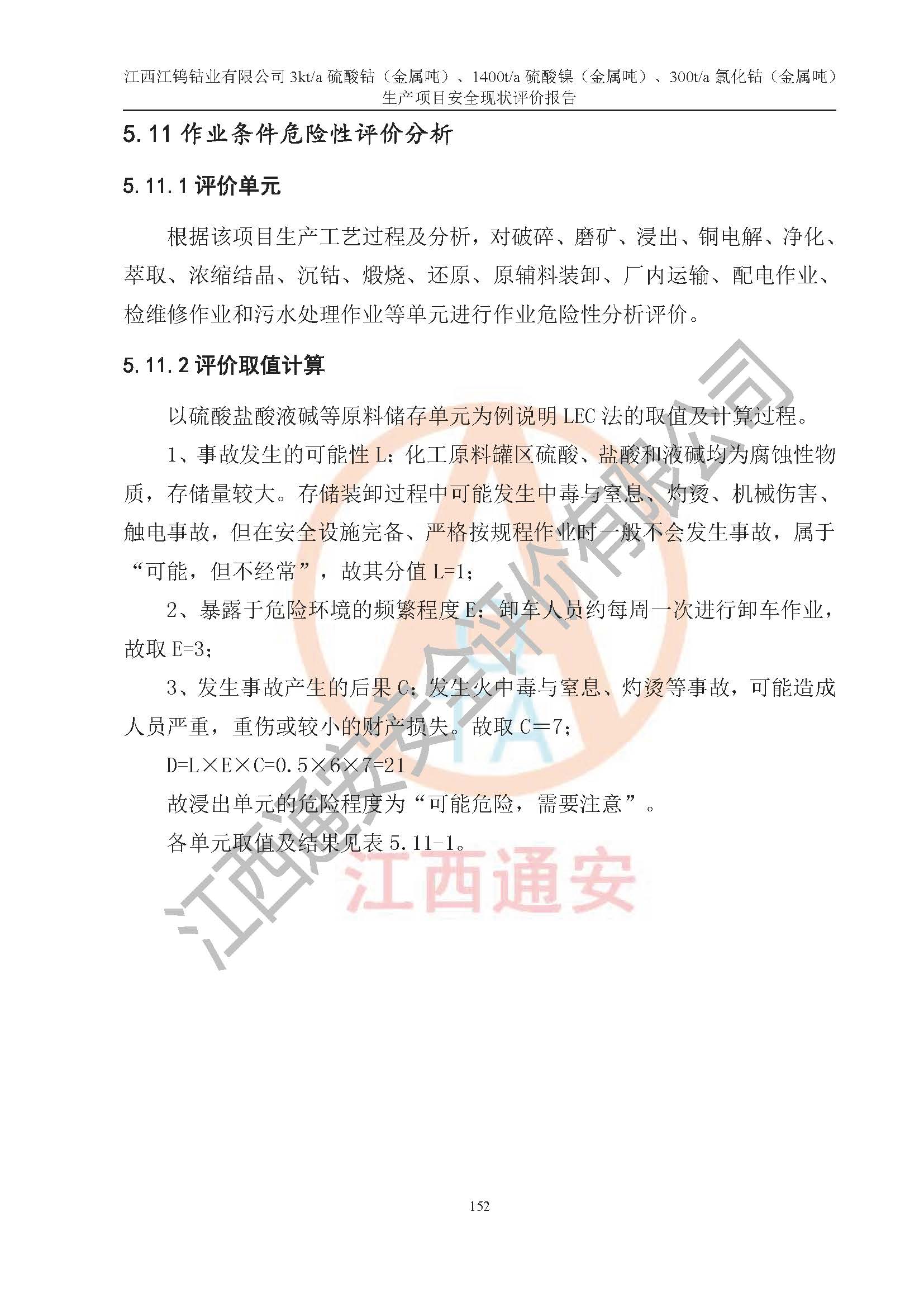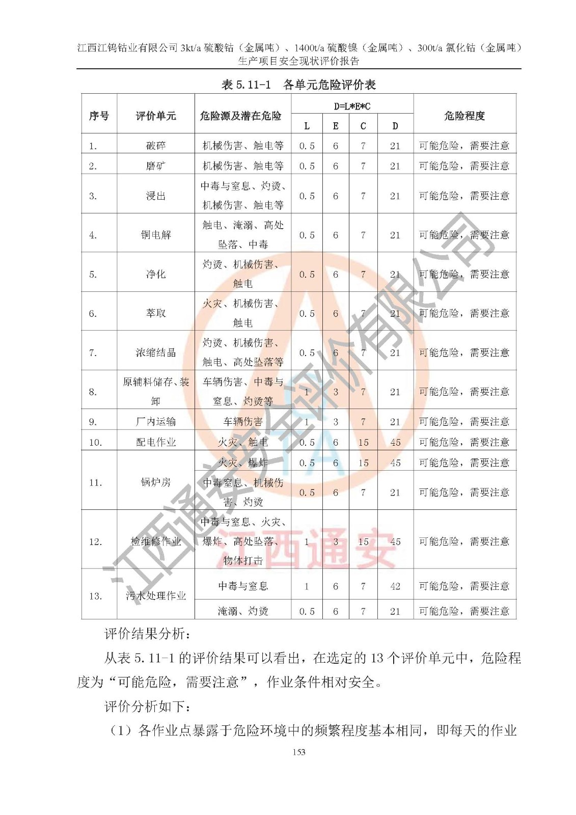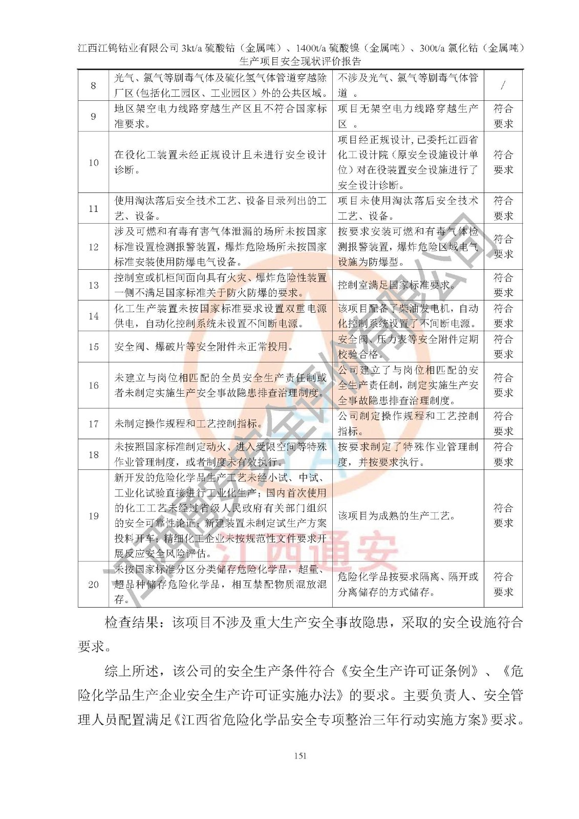 一、定量評價(jià)結(jié)果 1、作業(yè)條件危險(xiǎn)性分析評價(jià)結(jié)果:在選定的13個(gè)評價(jià)單元中,作業(yè)危險(xiǎn)等級為“可能危險(xiǎn),需要注意”,作業(yè)條件相對安全。 2、危險(xiǎn)程評價(jià)法分析結(jié)果:化工材料倉庫及罐區(qū)危險(xiǎn)程度為**危險(xiǎn),本項(xiàng)目在硫酸和鹽酸儲罐區(qū)設(shè)有圍堰、洗眼噴淋設(shè)施,儲罐均為常壓設(shè)備,設(shè)有就地液位和遠(yuǎn)傳的高低液位報(bào)警裝置,卸料、物料輸送、投料采用密閉化和機(jī)械化操作,公司制定了酸罐區(qū)的安全操作規(guī)程,作業(yè)人員穿戴個(gè)體防護(hù)用品,并配備了應(yīng)急救援裝備,通過采取**的安全設(shè)施和安全管理措施可以使風(fēng)險(xiǎn)降低到可接受范圍內(nèi);萃取車間危險(xiǎn)程度為低度危險(xiǎn)。風(fēng)險(xiǎn)在可接受范圍內(nèi)。。 4、定量風(fēng)險(xiǎn)評價(jià)分析結(jié)果:根據(jù)個(gè)人風(fēng)險(xiǎn)分析效果圖,該項(xiàng)目的個(gè)人風(fēng)險(xiǎn)符合要求;根據(jù)社會風(fēng)險(xiǎn)分析效果圖可知,該項(xiàng)目無社會風(fēng)險(xiǎn)。鍋爐發(fā)生物理爆炸的多米諾半徑局限在廠界內(nèi),企業(yè)會定期對鍋爐、空氣儲罐及安全附件進(jìn)行檢測,鍋爐操作工持證上崗,并加強(qiáng)日常的安全管理,可**降低發(fā)生物理爆炸的風(fēng)險(xiǎn)。 二、定性評價(jià)結(jié)果 1、依據(jù)相關(guān)法律、法規(guī)、標(biāo)準(zhǔn)等的規(guī)定,該項(xiàng)目外部安全條件、總平面布置、工藝及設(shè)備、防火防爆安全設(shè)施等符合**相關(guān)標(biāo)準(zhǔn)規(guī)范的要求,能滿足安全生產(chǎn)的要求。根據(jù)《江西江鎢鈷業(yè)有限公司全流程自動(dòng)化控制評估報(bào)告》(含《隱患清單》)評估報(bào)告,在役裝置的自動(dòng)化系統(tǒng)不需要提升。 2、該項(xiàng)目公用輔助設(shè)施能夠滿足安全生產(chǎn)的要求。 3、該項(xiàng)目按要求設(shè)置了安全生產(chǎn)管理機(jī)構(gòu),配備了專職安全生產(chǎn)管理人員,建立了全員安全生產(chǎn)責(zé)任制,制定了安全管理制度和崗位安全操作規(guī)程等。該公司修訂了生產(chǎn)安全事故應(yīng)急預(yù)案,配備了應(yīng)急救援器材,按要求定期進(jìn)行相關(guān)培訓(xùn)及演練。 4、公司主要負(fù)責(zé)人、安全管理人員經(jīng)培訓(xùn)考核取得了相應(yīng)的安全資格證書。主要負(fù)責(zé)人、分管安全負(fù)責(zé)人、分管生產(chǎn)、設(shè)備、技術(shù)負(fù)責(zé)人和安全管理人員的專業(yè)和學(xué)歷符合要求。特種作業(yè)人員均經(jīng)過培訓(xùn)考核合格后持證上崗,其他從業(yè)人員均進(jìn)行了安全教育培訓(xùn),具備安全知識與操作技能;公司配備了應(yīng)急救援物資,為從業(yè)人員配備了相應(yīng)的勞動(dòng)防護(hù)用品。 5、該項(xiàng)目的安全生產(chǎn)條件符合《安全生產(chǎn)許可證條例》、《危險(xiǎn)化學(xué)品生產(chǎn)企業(yè)安全生產(chǎn)許可證實(shí)施辦法》的要求,該項(xiàng)目不涉及重大生產(chǎn)安全事故隱患。 6、該項(xiàng)目不涉及重大生產(chǎn)安全事故隱患,采取的安全設(shè)施符合要求。 三、評價(jià)結(jié)論 江西江鎢鈷業(yè)有限公司符合城鄉(xiāng)規(guī)劃和布局,總平面布置符合《建筑設(shè)計(jì)防火規(guī)范(2018年版)》GB50016-2014等標(biāo)準(zhǔn)、規(guī)范的要求,采用成熟的生產(chǎn)工藝和設(shè)備,本質(zhì)安全程度較高;生產(chǎn)項(xiàng)目對現(xiàn)場存在事故危險(xiǎn)的設(shè)施和場所采取了合理可行的防護(hù)措施和科學(xué)的管理,使生產(chǎn)過程中的危險(xiǎn)有害因素能得到**控制。建設(shè)項(xiàng)目安全設(shè)施符合**現(xiàn)行有關(guān)法律、法規(guī)、標(biāo)準(zhǔn)的要求。企業(yè)對現(xiàn)場存在的安全問題進(jìn)行了整改,主要的安全缺陷消除。 評價(jià)結(jié)論:江西江鎢鈷業(yè)有限公司3kt/a硫酸鈷(金屬噸)、1400t/a硫酸鎳(金屬噸)、300t/a氯化鈷(金屬噸)生產(chǎn)項(xiàng)目的現(xiàn)場情況與設(shè)計(jì)變更圖紙一致,PLC控制系統(tǒng)設(shè)計(jì)符合要求、運(yùn)行正常,有關(guān)從業(yè)人員資質(zhì)符合《江西省危險(xiǎn)化學(xué)品安全專項(xiàng)整治三年行動(dòng)實(shí)施方案》要求,安全設(shè)施及安全管理符合法律、法規(guī)、標(biāo)準(zhǔn)的要求,安全風(fēng)險(xiǎn)是受控制的,其風(fēng)險(xiǎn)程度是可以接受的,安全設(shè)施符合安全生產(chǎn)條件,能夠滿足安全生產(chǎn)的要求。 |