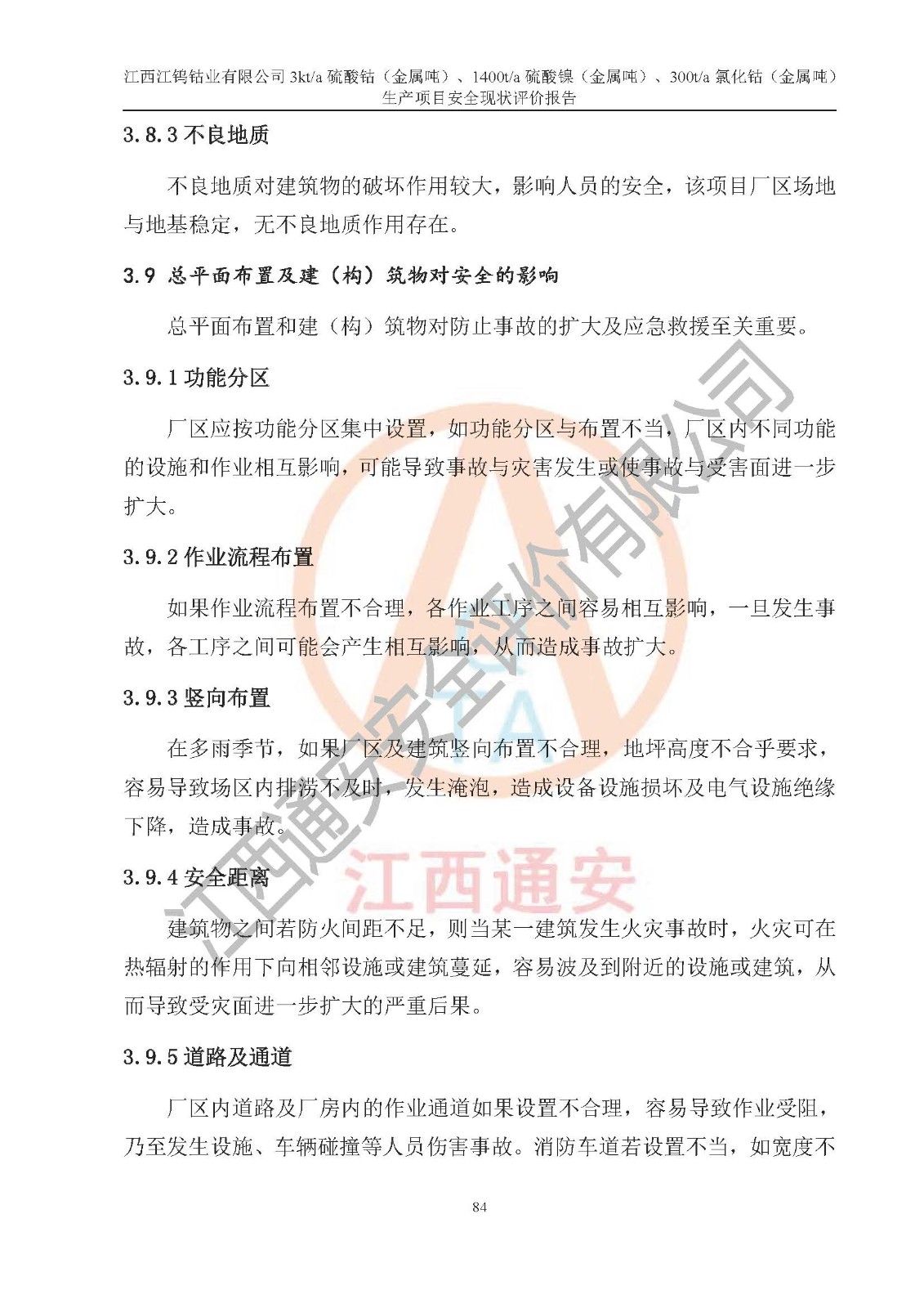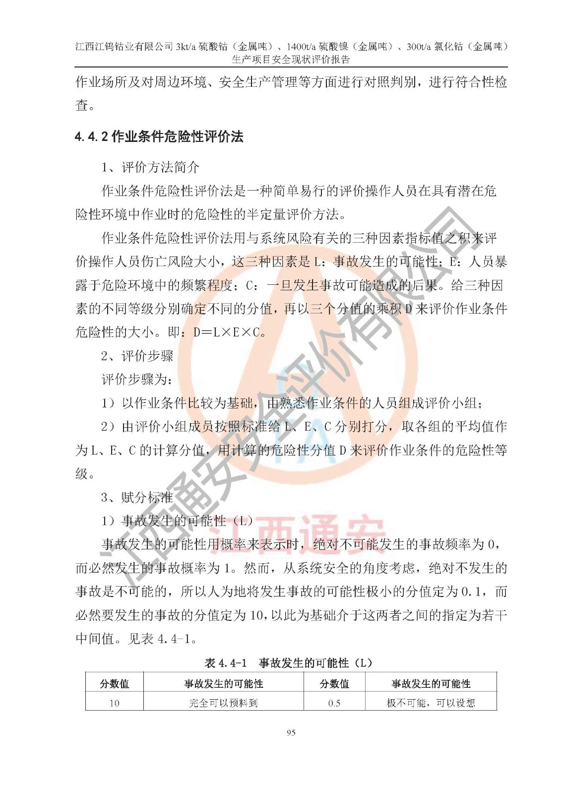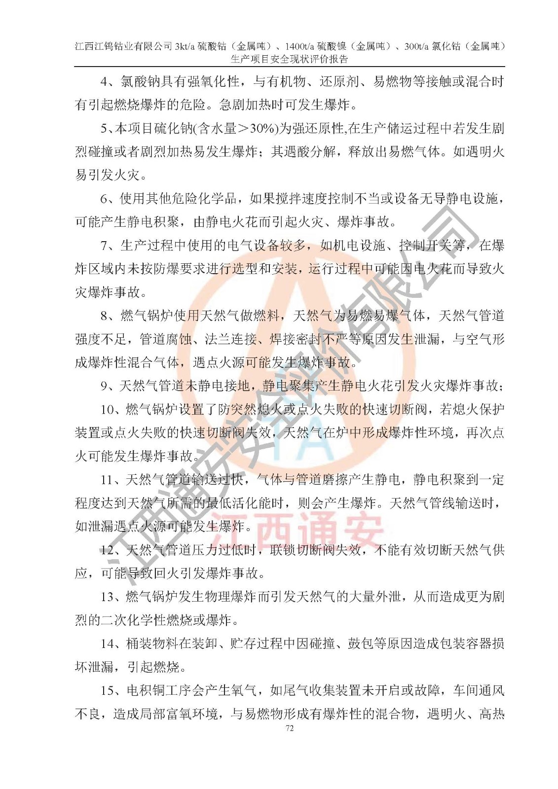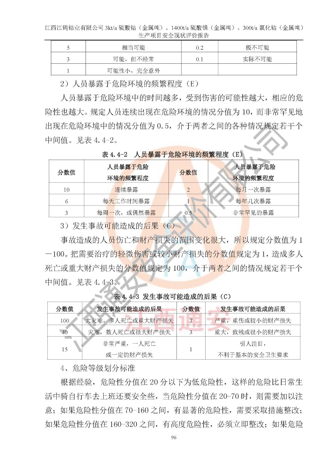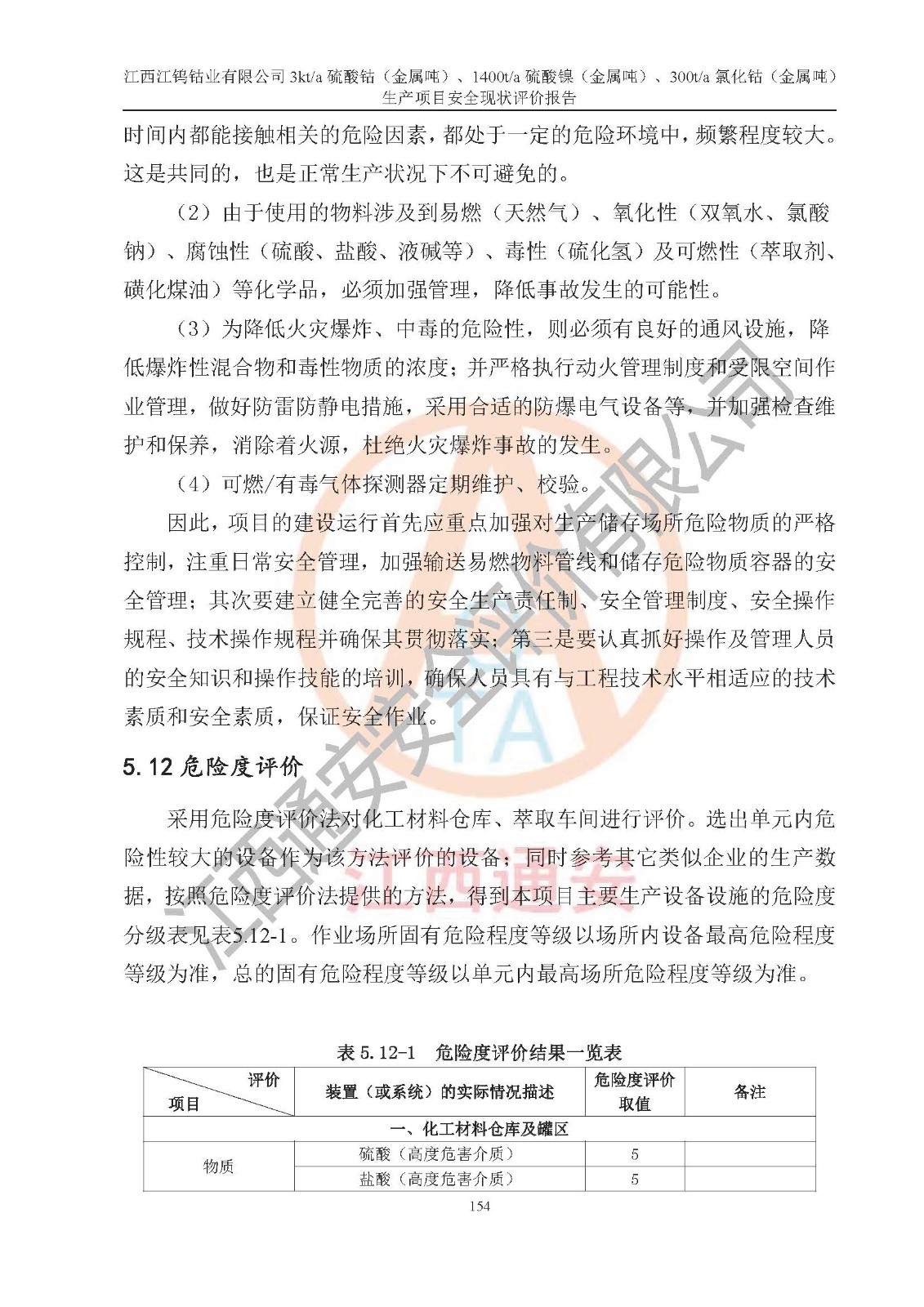 一、定量評價(jià)結(jié)果 1、作業(yè)條件危險(xiǎn)性分析評價(jià)結(jié)果:在選定的13個(gè)評價(jià)單元中,作業(yè)危險(xiǎn)等級為“可能危險(xiǎn),需要注意”,作業(yè)條件相對安全。 2、危險(xiǎn)程評價(jià)法分析結(jié)果:化工材料倉庫及罐區(qū)危險(xiǎn)程度為**危險(xiǎn),本項(xiàng)目在硫酸和鹽酸儲罐區(qū)設(shè)有圍堰、洗眼噴淋設(shè)施,儲罐均為常壓設(shè)備,設(shè)有就地液位和遠(yuǎn)傳的高低液位報(bào)警裝置,卸料、物料輸送、投料采用密閉化和機(jī)械化操作,公司制定了酸罐區(qū)的安全操作規(guī)程,作業(yè)人員穿戴個(gè)體防護(hù)用品,并配備了應(yīng)急救援裝備,通過采取**的安全設(shè)施和安全管理措施可以使風(fēng)險(xiǎn)降低到可接受范圍內(nèi);萃取車間危險(xiǎn)程度為低度危險(xiǎn)。風(fēng)險(xiǎn)在可接受范圍內(nèi)。。 4、定量風(fēng)險(xiǎn)評價(jià)分析結(jié)果:根據(jù)個(gè)人風(fēng)險(xiǎn)分析效果圖,該項(xiàng)目的個(gè)人風(fēng)險(xiǎn)符合要求;根據(jù)社會風(fēng)險(xiǎn)分析效果圖可知,該項(xiàng)目無社會風(fēng)險(xiǎn)。鍋爐發(fā)生物理爆炸的多米諾半徑局限在廠界內(nèi),企業(yè)會定期對鍋爐、空氣儲罐及安全附件進(jìn)行檢測,鍋爐操作工持證上崗,并加強(qiáng)日常的安全管理,可**降低發(fā)生物理爆炸的風(fēng)險(xiǎn)。 二、定性評價(jià)結(jié)果 1、依據(jù)相關(guān)法律、法規(guī)、標(biāo)準(zhǔn)等的規(guī)定,該項(xiàng)目外部安全條件、總平面布置、工藝及設(shè)備、防火防爆安全設(shè)施等符合**相關(guān)標(biāo)準(zhǔn)規(guī)范的要求,能滿足安全生產(chǎn)的要求。根據(jù)《江西江鎢鈷業(yè)有限公司全流程自動(dòng)化控制評估報(bào)告》(含《隱患清單》)評估報(bào)告,在役裝置的自動(dòng)化系統(tǒng)不需要提升。 2、該項(xiàng)目公用輔助設(shè)施能夠滿足安全生產(chǎn)的要求。 3、該項(xiàng)目按要求設(shè)置了安全生產(chǎn)管理機(jī)構(gòu),配備了專職安全生產(chǎn)管理人員,建立了全員安全生產(chǎn)責(zé)任制,制定了安全管理制度和崗位安全操作規(guī)程等。該公司修訂了生產(chǎn)安全事故應(yīng)急預(yù)案,配備了應(yīng)急救援器材,按要求定期進(jìn)行相關(guān)培訓(xùn)及演練。 4、公司主要負(fù)責(zé)人、安全管理人員經(jīng)培訓(xùn)考核取得了相應(yīng)的安全資格證書。主要負(fù)責(zé)人、分管安全負(fù)責(zé)人、分管生產(chǎn)、設(shè)備、技術(shù)負(fù)責(zé)人和安全管理人員的專業(yè)和學(xué)歷符合要求。特種作業(yè)人員均經(jīng)過培訓(xùn)考核合格后持證上崗,其他從業(yè)人員均進(jìn)行了安全教育培訓(xùn),具備安全知識與操作技能;公司配備了應(yīng)急救援物資,為從業(yè)人員配備了相應(yīng)的勞動(dòng)防護(hù)用品。 5、該項(xiàng)目的安全生產(chǎn)條件符合《安全生產(chǎn)許可證條例》、《危險(xiǎn)化學(xué)品生產(chǎn)企業(yè)安全生產(chǎn)許可證實(shí)施辦法》的要求,該項(xiàng)目不涉及重大生產(chǎn)安全事故隱患。 6、該項(xiàng)目不涉及重大生產(chǎn)安全事故隱患,采取的安全設(shè)施符合要求。 三、評價(jià)結(jié)論 江西江鎢鈷業(yè)有限公司符合城鄉(xiāng)規(guī)劃和布局,總平面布置符合《建筑設(shè)計(jì)防火規(guī)范(2018年版)》GB50016-2014等標(biāo)準(zhǔn)、規(guī)范的要求,采用成熟的生產(chǎn)工藝和設(shè)備,本質(zhì)安全程度較高;生產(chǎn)項(xiàng)目對現(xiàn)場存在事故危險(xiǎn)的設(shè)施和場所采取了合理可行的防護(hù)措施和科學(xué)的管理,使生產(chǎn)過程中的危險(xiǎn)有害因素能得到**控制。建設(shè)項(xiàng)目安全設(shè)施符合**現(xiàn)行有關(guān)法律、法規(guī)、標(biāo)準(zhǔn)的要求。企業(yè)對現(xiàn)場存在的安全問題進(jìn)行了整改,主要的安全缺陷消除。 評價(jià)結(jié)論:江西江鎢鈷業(yè)有限公司3kt/a硫酸鈷(金屬噸)、1400t/a硫酸鎳(金屬噸)、300t/a氯化鈷(金屬噸)生產(chǎn)項(xiàng)目的現(xiàn)場情況與設(shè)計(jì)變更圖紙一致,PLC控制系統(tǒng)設(shè)計(jì)符合要求、運(yùn)行正常,有關(guān)從業(yè)人員資質(zhì)符合《江西省危險(xiǎn)化學(xué)品安全專項(xiàng)整治三年行動(dòng)實(shí)施方案》要求,安全設(shè)施及安全管理符合法律、法規(guī)、標(biāo)準(zhǔn)的要求,安全風(fēng)險(xiǎn)是受控制的,其風(fēng)險(xiǎn)程度是可以接受的,安全設(shè)施符合安全生產(chǎn)條件,能夠滿足安全生產(chǎn)的要求。 |