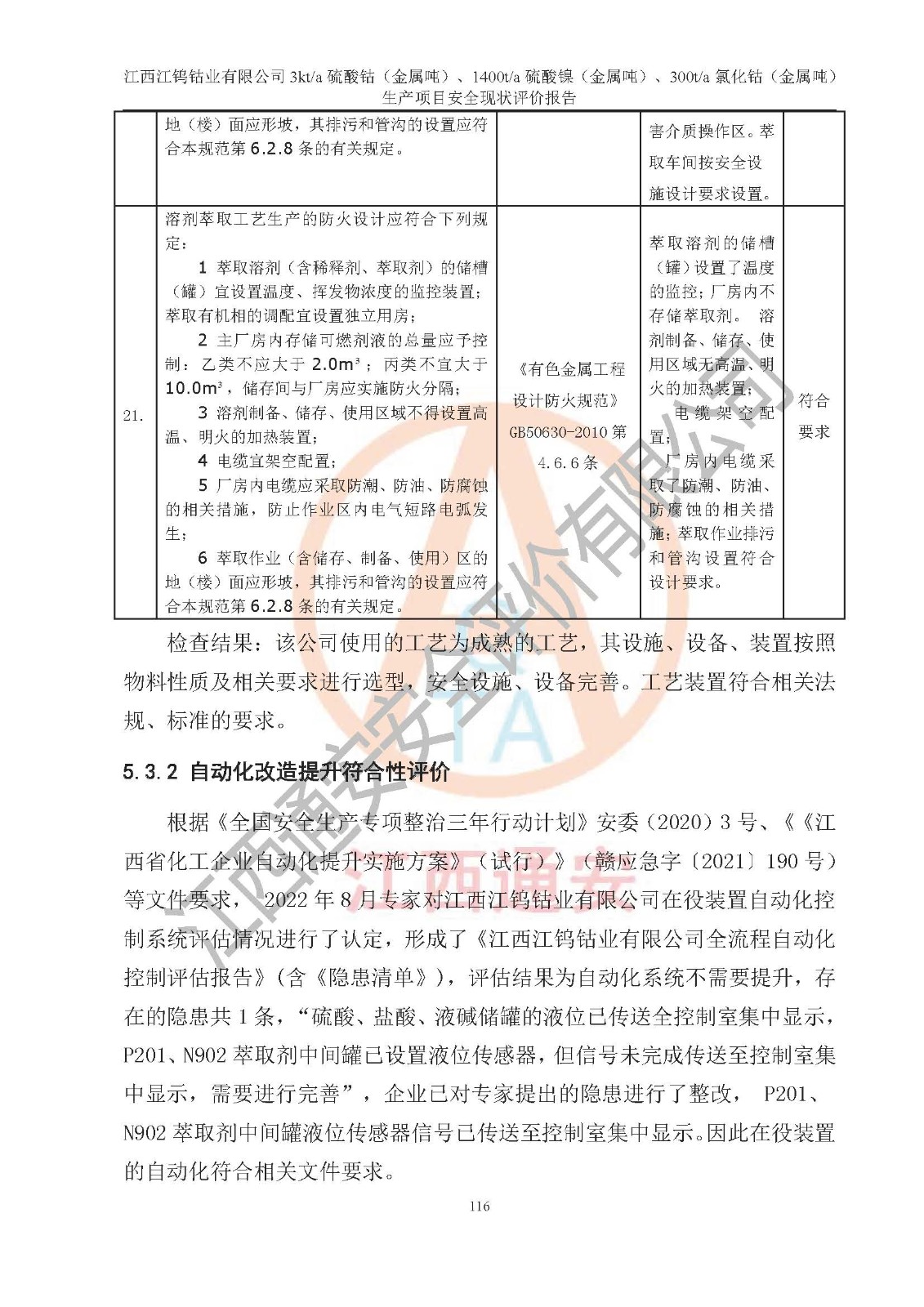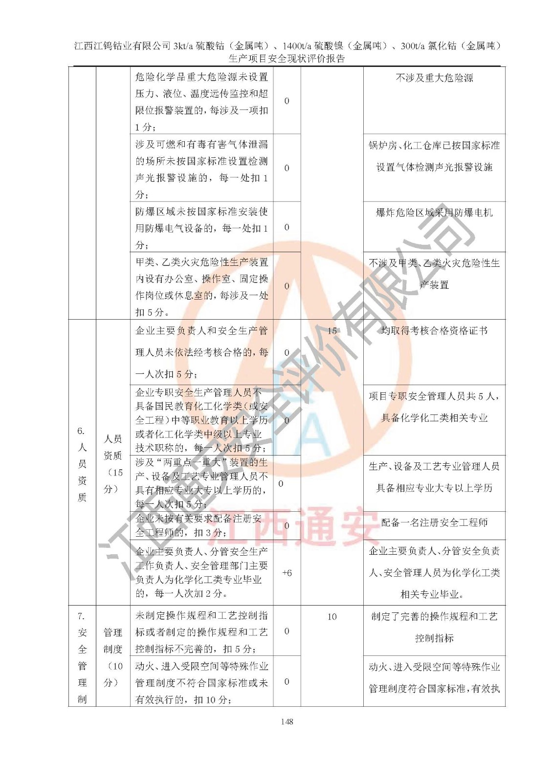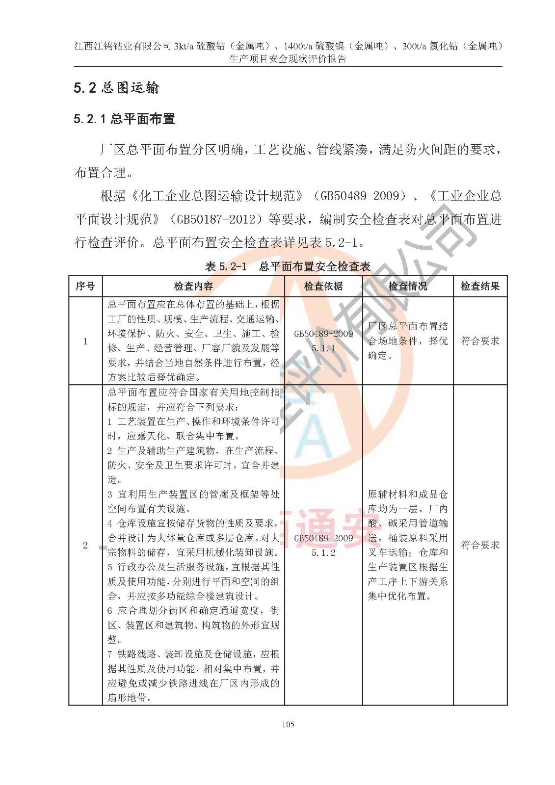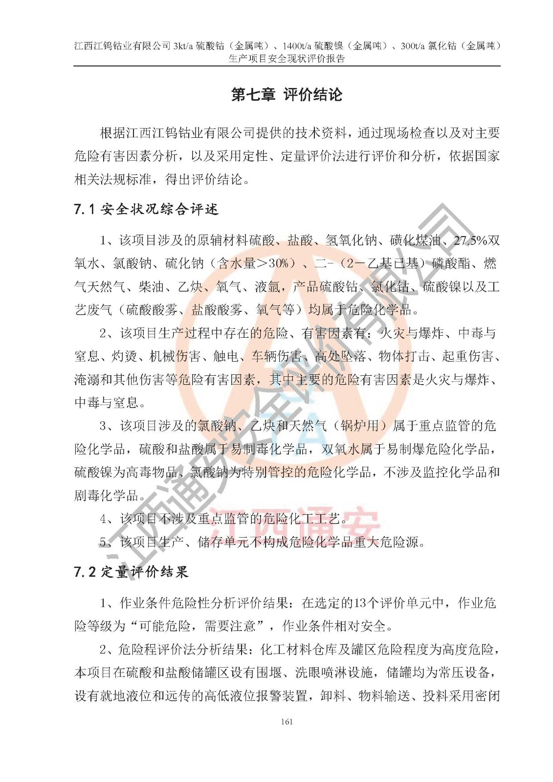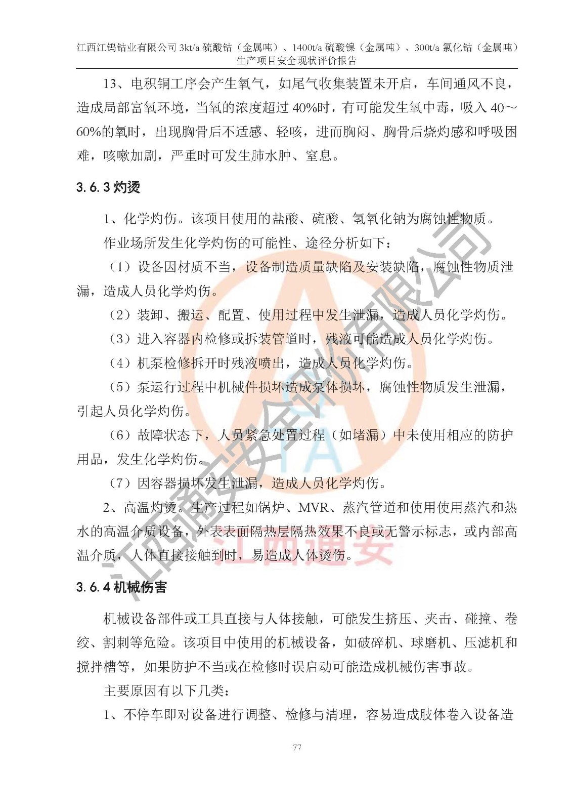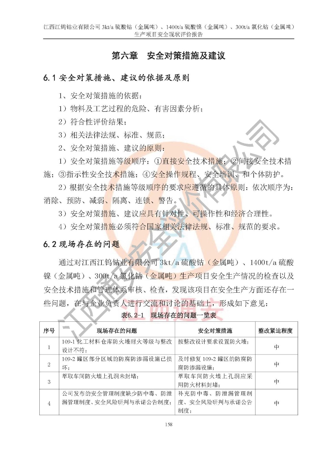 一、定量評價(jià)結(jié)果 1、作業(yè)條件危險(xiǎn)性分析評價(jià)結(jié)果:在選定的13個(gè)評價(jià)單元中,作業(yè)危險(xiǎn)等級為“可能危險(xiǎn),需要注意”,作業(yè)條件相對安全。 2、危險(xiǎn)程評價(jià)法分析結(jié)果:化工材料倉庫及罐區(qū)危險(xiǎn)程度為**危險(xiǎn),本項(xiàng)目在硫酸和鹽酸儲罐區(qū)設(shè)有圍堰、洗眼噴淋設(shè)施,儲罐均為常壓設(shè)備,設(shè)有就地液位和遠(yuǎn)傳的高低液位報(bào)警裝置,卸料、物料輸送、投料采用密閉化和機(jī)械化操作,公司制定了酸罐區(qū)的安全操作規(guī)程,作業(yè)人員穿戴個(gè)體防護(hù)用品,并配備了應(yīng)急救援裝備,通過采取**的安全設(shè)施和安全管理措施可以使風(fēng)險(xiǎn)降低到可接受范圍內(nèi);萃取車間危險(xiǎn)程度為低度危險(xiǎn)。風(fēng)險(xiǎn)在可接受范圍內(nèi)。。 4、定量風(fēng)險(xiǎn)評價(jià)分析結(jié)果:根據(jù)個(gè)人風(fēng)險(xiǎn)分析效果圖,該項(xiàng)目的個(gè)人風(fēng)險(xiǎn)符合要求;根據(jù)社會風(fēng)險(xiǎn)分析效果圖可知,該項(xiàng)目無社會風(fēng)險(xiǎn)。鍋爐發(fā)生物理爆炸的多米諾半徑局限在廠界內(nèi),企業(yè)會定期對鍋爐、空氣儲罐及安全附件進(jìn)行檢測,鍋爐操作工持證上崗,并加強(qiáng)日常的安全管理,可**降低發(fā)生物理爆炸的風(fēng)險(xiǎn)。 二、定性評價(jià)結(jié)果 1、依據(jù)相關(guān)法律、法規(guī)、標(biāo)準(zhǔn)等的規(guī)定,該項(xiàng)目外部安全條件、總平面布置、工藝及設(shè)備、防火防爆安全設(shè)施等符合**相關(guān)標(biāo)準(zhǔn)規(guī)范的要求,能滿足安全生產(chǎn)的要求。根據(jù)《江西江鎢鈷業(yè)有限公司全流程自動(dòng)化控制評估報(bào)告》(含《隱患清單》)評估報(bào)告,在役裝置的自動(dòng)化系統(tǒng)不需要提升。 2、該項(xiàng)目公用輔助設(shè)施能夠滿足安全生產(chǎn)的要求。 3、該項(xiàng)目按要求設(shè)置了安全生產(chǎn)管理機(jī)構(gòu),配備了專職安全生產(chǎn)管理人員,建立了全員安全生產(chǎn)責(zé)任制,制定了安全管理制度和崗位安全操作規(guī)程等。該公司修訂了生產(chǎn)安全事故應(yīng)急預(yù)案,配備了應(yīng)急救援器材,按要求定期進(jìn)行相關(guān)培訓(xùn)及演練。 4、公司主要負(fù)責(zé)人、安全管理人員經(jīng)培訓(xùn)考核取得了相應(yīng)的安全資格證書。主要負(fù)責(zé)人、分管安全負(fù)責(zé)人、分管生產(chǎn)、設(shè)備、技術(shù)負(fù)責(zé)人和安全管理人員的專業(yè)和學(xué)歷符合要求。特種作業(yè)人員均經(jīng)過培訓(xùn)考核合格后持證上崗,其他從業(yè)人員均進(jìn)行了安全教育培訓(xùn),具備安全知識與操作技能;公司配備了應(yīng)急救援物資,為從業(yè)人員配備了相應(yīng)的勞動(dòng)防護(hù)用品。 5、該項(xiàng)目的安全生產(chǎn)條件符合《安全生產(chǎn)許可證條例》、《危險(xiǎn)化學(xué)品生產(chǎn)企業(yè)安全生產(chǎn)許可證實(shí)施辦法》的要求,該項(xiàng)目不涉及重大生產(chǎn)安全事故隱患。 6、該項(xiàng)目不涉及重大生產(chǎn)安全事故隱患,采取的安全設(shè)施符合要求。 三、評價(jià)結(jié)論 江西江鎢鈷業(yè)有限公司符合城鄉(xiāng)規(guī)劃和布局,總平面布置符合《建筑設(shè)計(jì)防火規(guī)范(2018年版)》GB50016-2014等標(biāo)準(zhǔn)、規(guī)范的要求,采用成熟的生產(chǎn)工藝和設(shè)備,本質(zhì)安全程度較高;生產(chǎn)項(xiàng)目對現(xiàn)場存在事故危險(xiǎn)的設(shè)施和場所采取了合理可行的防護(hù)措施和科學(xué)的管理,使生產(chǎn)過程中的危險(xiǎn)有害因素能得到**控制。建設(shè)項(xiàng)目安全設(shè)施符合**現(xiàn)行有關(guān)法律、法規(guī)、標(biāo)準(zhǔn)的要求。企業(yè)對現(xiàn)場存在的安全問題進(jìn)行了整改,主要的安全缺陷消除。 評價(jià)結(jié)論:江西江鎢鈷業(yè)有限公司3kt/a硫酸鈷(金屬噸)、1400t/a硫酸鎳(金屬噸)、300t/a氯化鈷(金屬噸)生產(chǎn)項(xiàng)目的現(xiàn)場情況與設(shè)計(jì)變更圖紙一致,PLC控制系統(tǒng)設(shè)計(jì)符合要求、運(yùn)行正常,有關(guān)從業(yè)人員資質(zhì)符合《江西省危險(xiǎn)化學(xué)品安全專項(xiàng)整治三年行動(dòng)實(shí)施方案》要求,安全設(shè)施及安全管理符合法律、法規(guī)、標(biāo)準(zhǔn)的要求,安全風(fēng)險(xiǎn)是受控制的,其風(fēng)險(xiǎn)程度是可以接受的,安全設(shè)施符合安全生產(chǎn)條件,能夠滿足安全生產(chǎn)的要求。 |