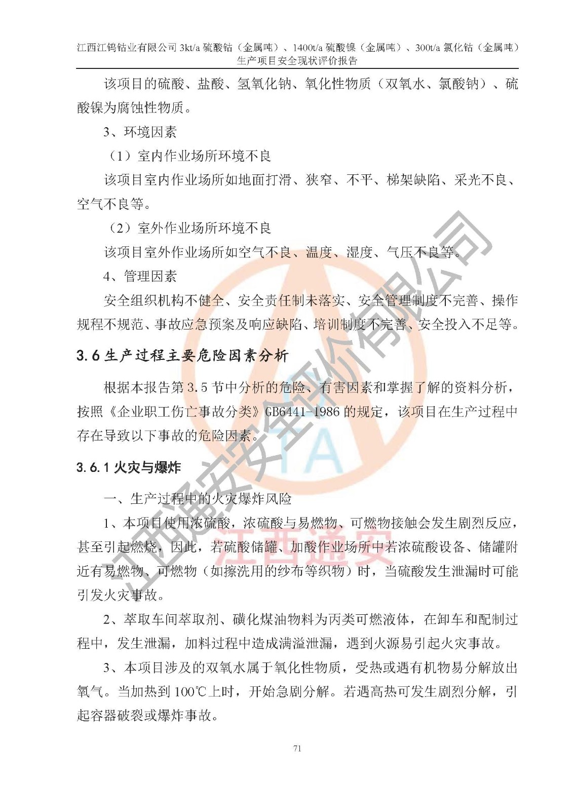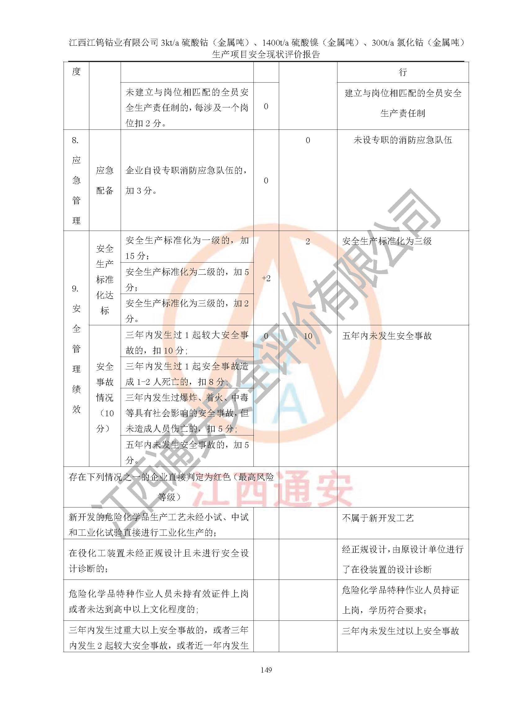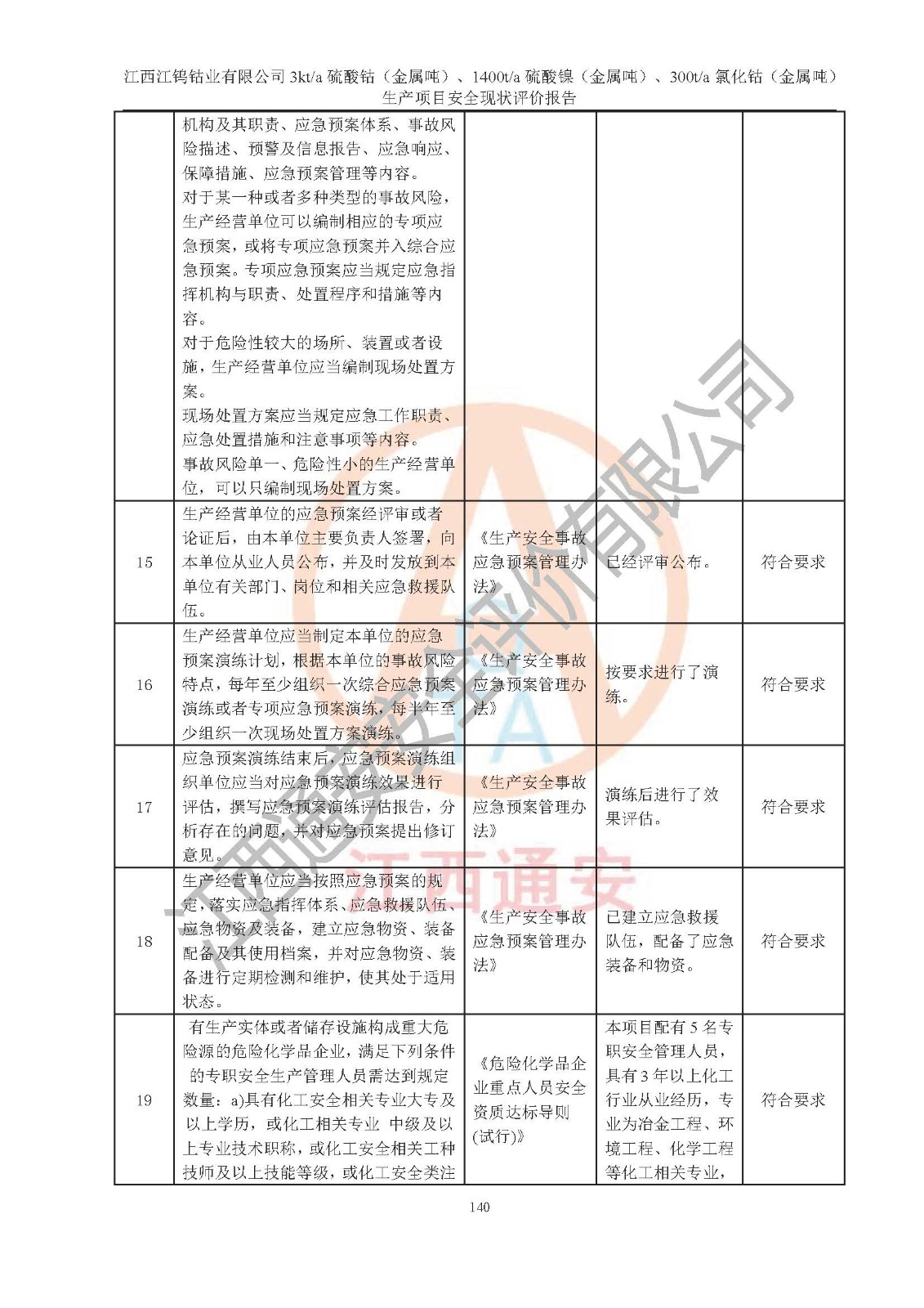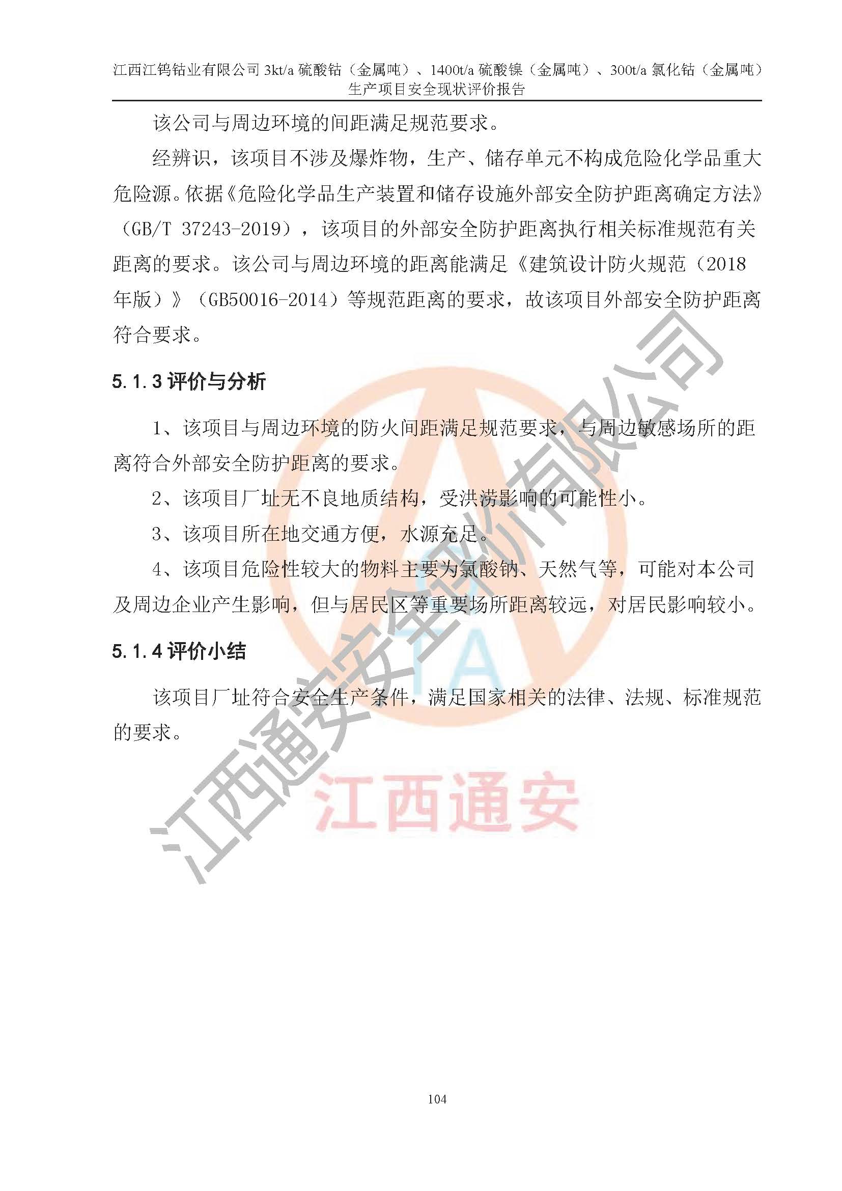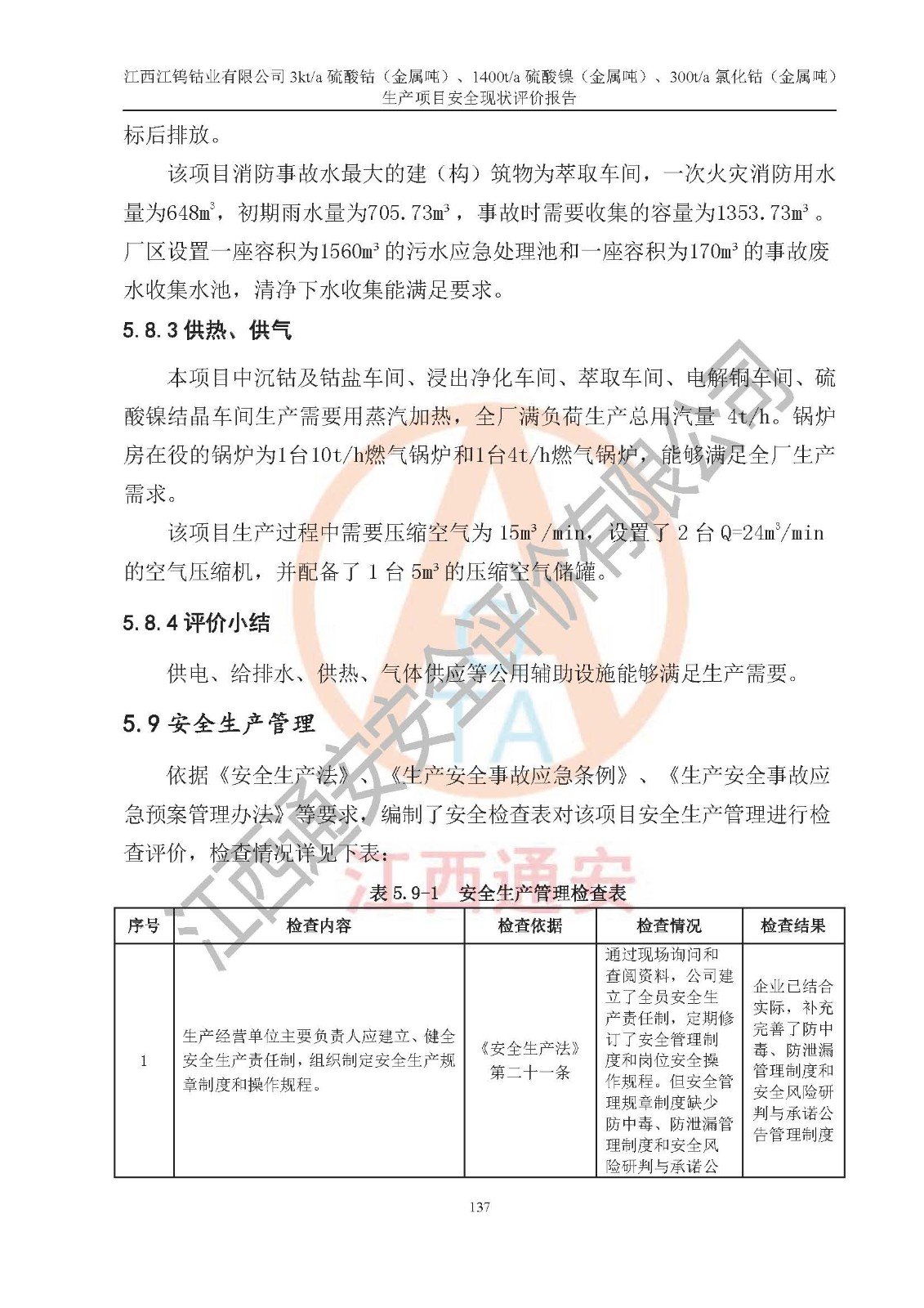 一、定量評價(jià)結(jié)果 1、作業(yè)條件危險(xiǎn)性分析評價(jià)結(jié)果:在選定的13個(gè)評價(jià)單元中,作業(yè)危險(xiǎn)等級為“可能危險(xiǎn),需要注意”,作業(yè)條件相對安全。 2、危險(xiǎn)程評價(jià)法分析結(jié)果:化工材料倉庫及罐區(qū)危險(xiǎn)程度為**危險(xiǎn),本項(xiàng)目在硫酸和鹽酸儲罐區(qū)設(shè)有圍堰、洗眼噴淋設(shè)施,儲罐均為常壓設(shè)備,設(shè)有就地液位和遠(yuǎn)傳的高低液位報(bào)警裝置,卸料、物料輸送、投料采用密閉化和機(jī)械化操作,公司制定了酸罐區(qū)的安全操作規(guī)程,作業(yè)人員穿戴個(gè)體防護(hù)用品,并配備了應(yīng)急救援裝備,通過采取**的安全設(shè)施和安全管理措施可以使風(fēng)險(xiǎn)降低到可接受范圍內(nèi);萃取車間危險(xiǎn)程度為低度危險(xiǎn)。風(fēng)險(xiǎn)在可接受范圍內(nèi)。。 4、定量風(fēng)險(xiǎn)評價(jià)分析結(jié)果:根據(jù)個(gè)人風(fēng)險(xiǎn)分析效果圖,該項(xiàng)目的個(gè)人風(fēng)險(xiǎn)符合要求;根據(jù)社會風(fēng)險(xiǎn)分析效果圖可知,該項(xiàng)目無社會風(fēng)險(xiǎn)。鍋爐發(fā)生物理爆炸的多米諾半徑局限在廠界內(nèi),企業(yè)會定期對鍋爐、空氣儲罐及安全附件進(jìn)行檢測,鍋爐操作工持證上崗,并加強(qiáng)日常的安全管理,可**降低發(fā)生物理爆炸的風(fēng)險(xiǎn)。 二、定性評價(jià)結(jié)果 1、依據(jù)相關(guān)法律、法規(guī)、標(biāo)準(zhǔn)等的規(guī)定,該項(xiàng)目外部安全條件、總平面布置、工藝及設(shè)備、防火防爆安全設(shè)施等符合**相關(guān)標(biāo)準(zhǔn)規(guī)范的要求,能滿足安全生產(chǎn)的要求。根據(jù)《江西江鎢鈷業(yè)有限公司全流程自動(dòng)化控制評估報(bào)告》(含《隱患清單》)評估報(bào)告,在役裝置的自動(dòng)化系統(tǒng)不需要提升。 2、該項(xiàng)目公用輔助設(shè)施能夠滿足安全生產(chǎn)的要求。 3、該項(xiàng)目按要求設(shè)置了安全生產(chǎn)管理機(jī)構(gòu),配備了專職安全生產(chǎn)管理人員,建立了全員安全生產(chǎn)責(zé)任制,制定了安全管理制度和崗位安全操作規(guī)程等。該公司修訂了生產(chǎn)安全事故應(yīng)急預(yù)案,配備了應(yīng)急救援器材,按要求定期進(jìn)行相關(guān)培訓(xùn)及演練。 4、公司主要負(fù)責(zé)人、安全管理人員經(jīng)培訓(xùn)考核取得了相應(yīng)的安全資格證書。主要負(fù)責(zé)人、分管安全負(fù)責(zé)人、分管生產(chǎn)、設(shè)備、技術(shù)負(fù)責(zé)人和安全管理人員的專業(yè)和學(xué)歷符合要求。特種作業(yè)人員均經(jīng)過培訓(xùn)考核合格后持證上崗,其他從業(yè)人員均進(jìn)行了安全教育培訓(xùn),具備安全知識與操作技能;公司配備了應(yīng)急救援物資,為從業(yè)人員配備了相應(yīng)的勞動(dòng)防護(hù)用品。 5、該項(xiàng)目的安全生產(chǎn)條件符合《安全生產(chǎn)許可證條例》、《危險(xiǎn)化學(xué)品生產(chǎn)企業(yè)安全生產(chǎn)許可證實(shí)施辦法》的要求,該項(xiàng)目不涉及重大生產(chǎn)安全事故隱患。 6、該項(xiàng)目不涉及重大生產(chǎn)安全事故隱患,采取的安全設(shè)施符合要求。 三、評價(jià)結(jié)論 江西江鎢鈷業(yè)有限公司符合城鄉(xiāng)規(guī)劃和布局,總平面布置符合《建筑設(shè)計(jì)防火規(guī)范(2018年版)》GB50016-2014等標(biāo)準(zhǔn)、規(guī)范的要求,采用成熟的生產(chǎn)工藝和設(shè)備,本質(zhì)安全程度較高;生產(chǎn)項(xiàng)目對現(xiàn)場存在事故危險(xiǎn)的設(shè)施和場所采取了合理可行的防護(hù)措施和科學(xué)的管理,使生產(chǎn)過程中的危險(xiǎn)有害因素能得到**控制。建設(shè)項(xiàng)目安全設(shè)施符合**現(xiàn)行有關(guān)法律、法規(guī)、標(biāo)準(zhǔn)的要求。企業(yè)對現(xiàn)場存在的安全問題進(jìn)行了整改,主要的安全缺陷消除。 評價(jià)結(jié)論:江西江鎢鈷業(yè)有限公司3kt/a硫酸鈷(金屬噸)、1400t/a硫酸鎳(金屬噸)、300t/a氯化鈷(金屬噸)生產(chǎn)項(xiàng)目的現(xiàn)場情況與設(shè)計(jì)變更圖紙一致,PLC控制系統(tǒng)設(shè)計(jì)符合要求、運(yùn)行正常,有關(guān)從業(yè)人員資質(zhì)符合《江西省危險(xiǎn)化學(xué)品安全專項(xiàng)整治三年行動(dòng)實(shí)施方案》要求,安全設(shè)施及安全管理符合法律、法規(guī)、標(biāo)準(zhǔn)的要求,安全風(fēng)險(xiǎn)是受控制的,其風(fēng)險(xiǎn)程度是可以接受的,安全設(shè)施符合安全生產(chǎn)條件,能夠滿足安全生產(chǎn)的要求。 |
