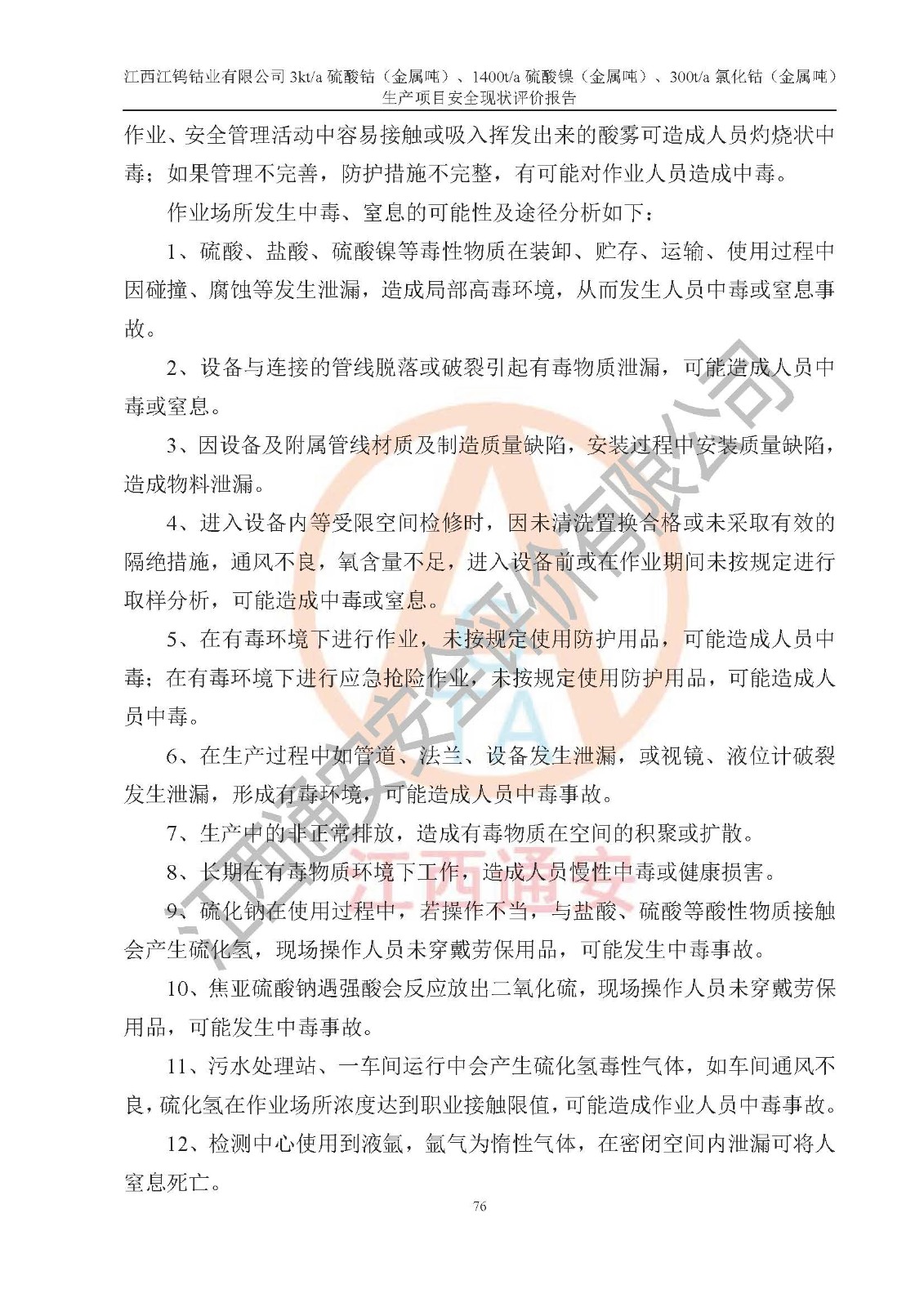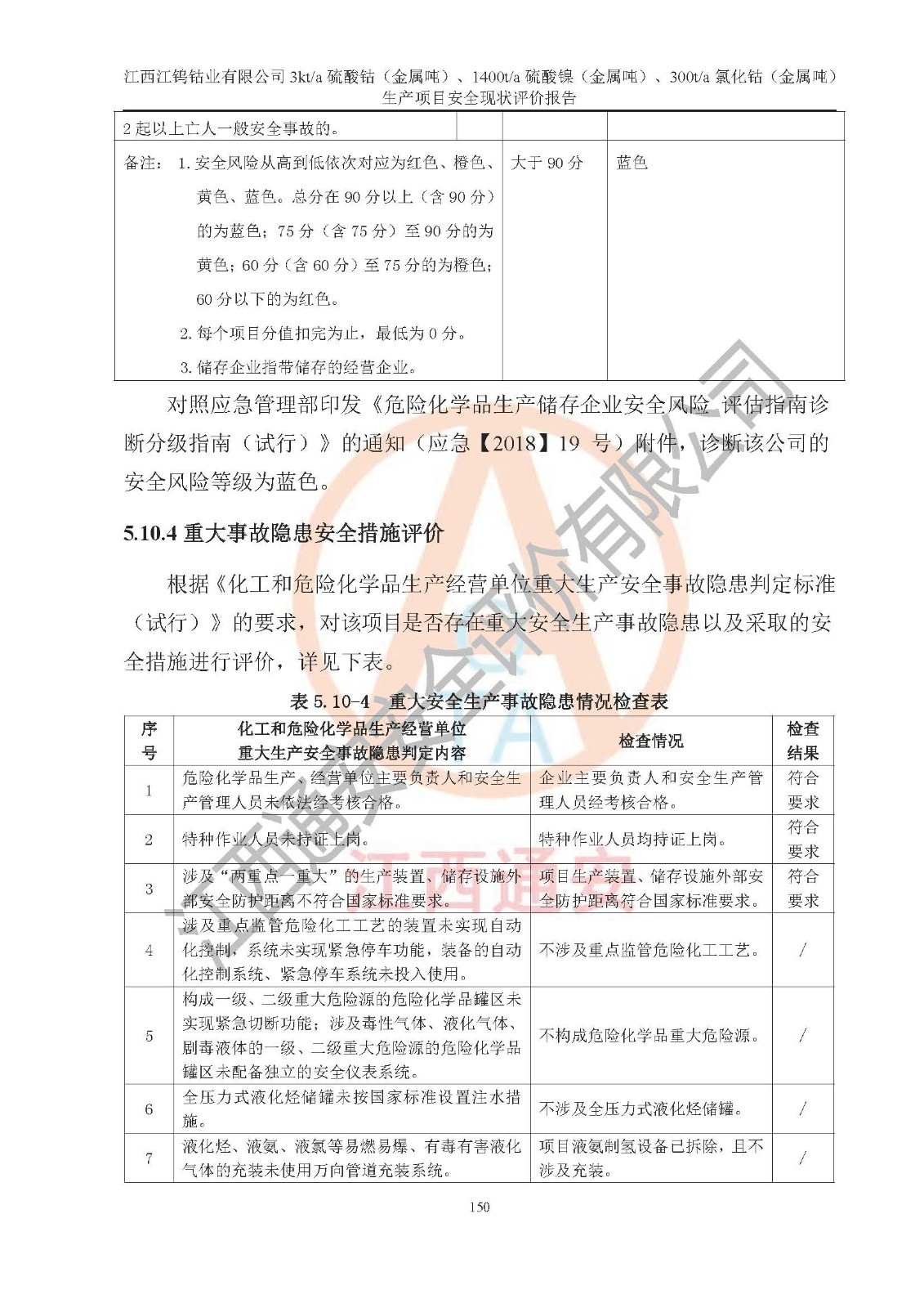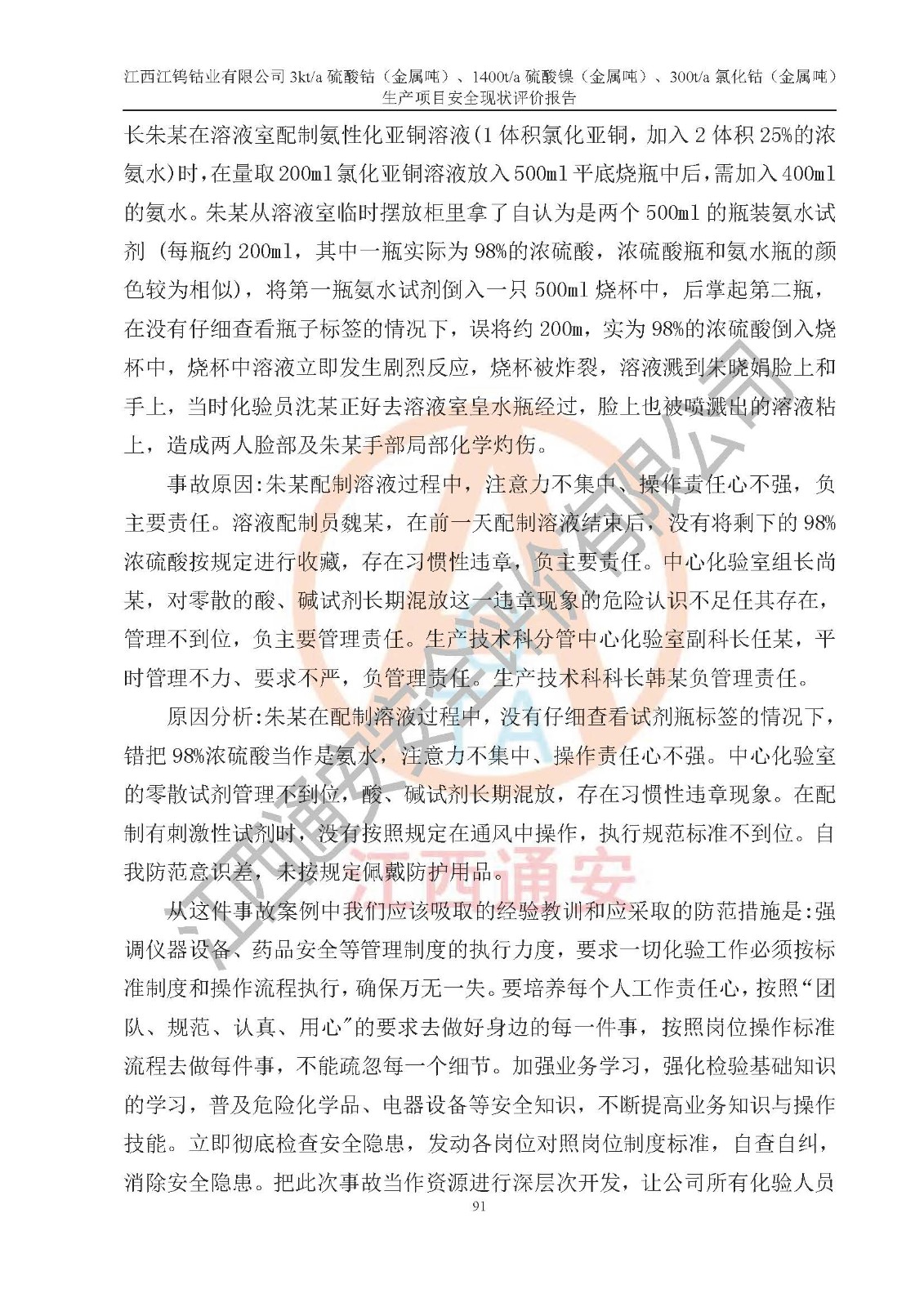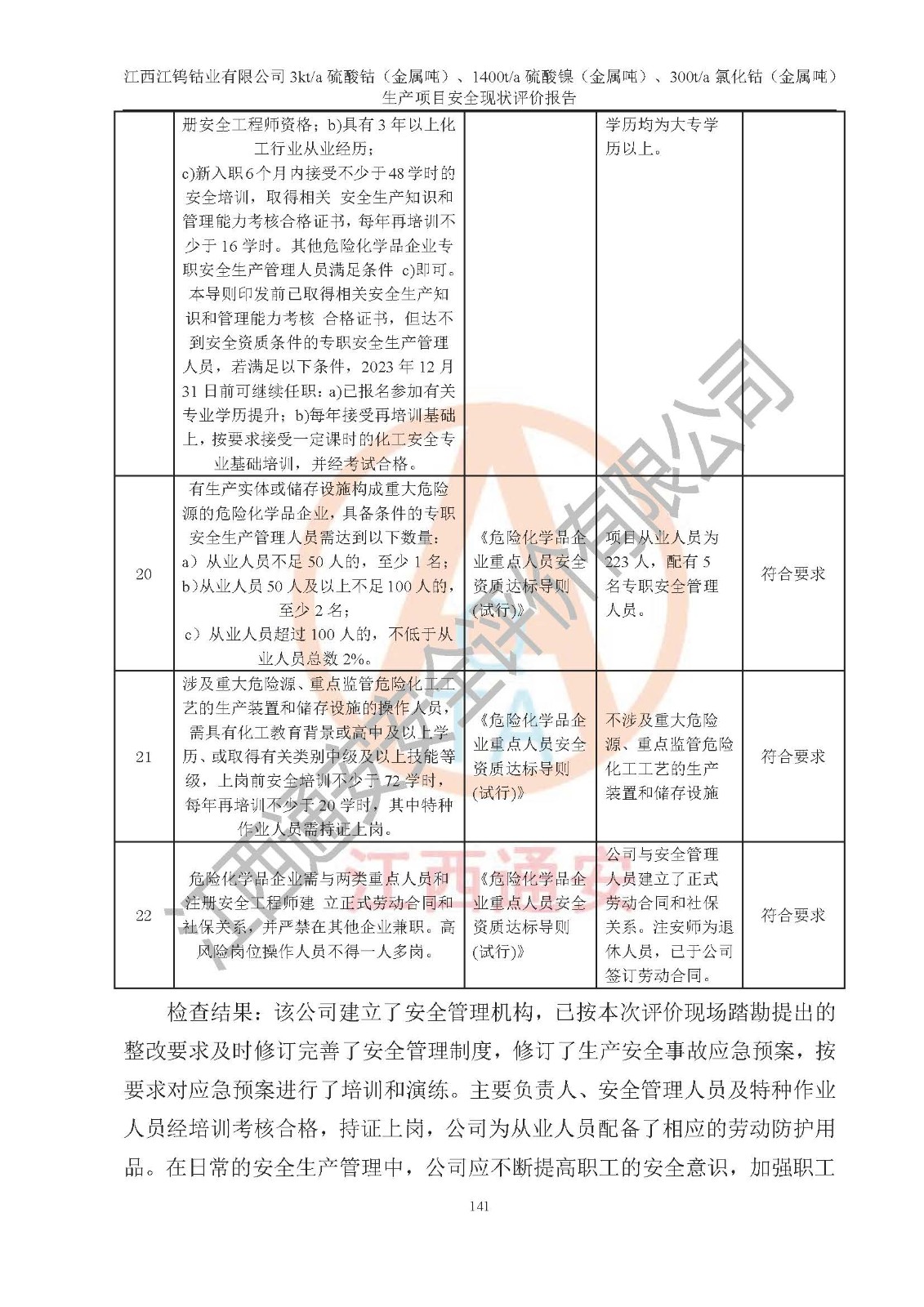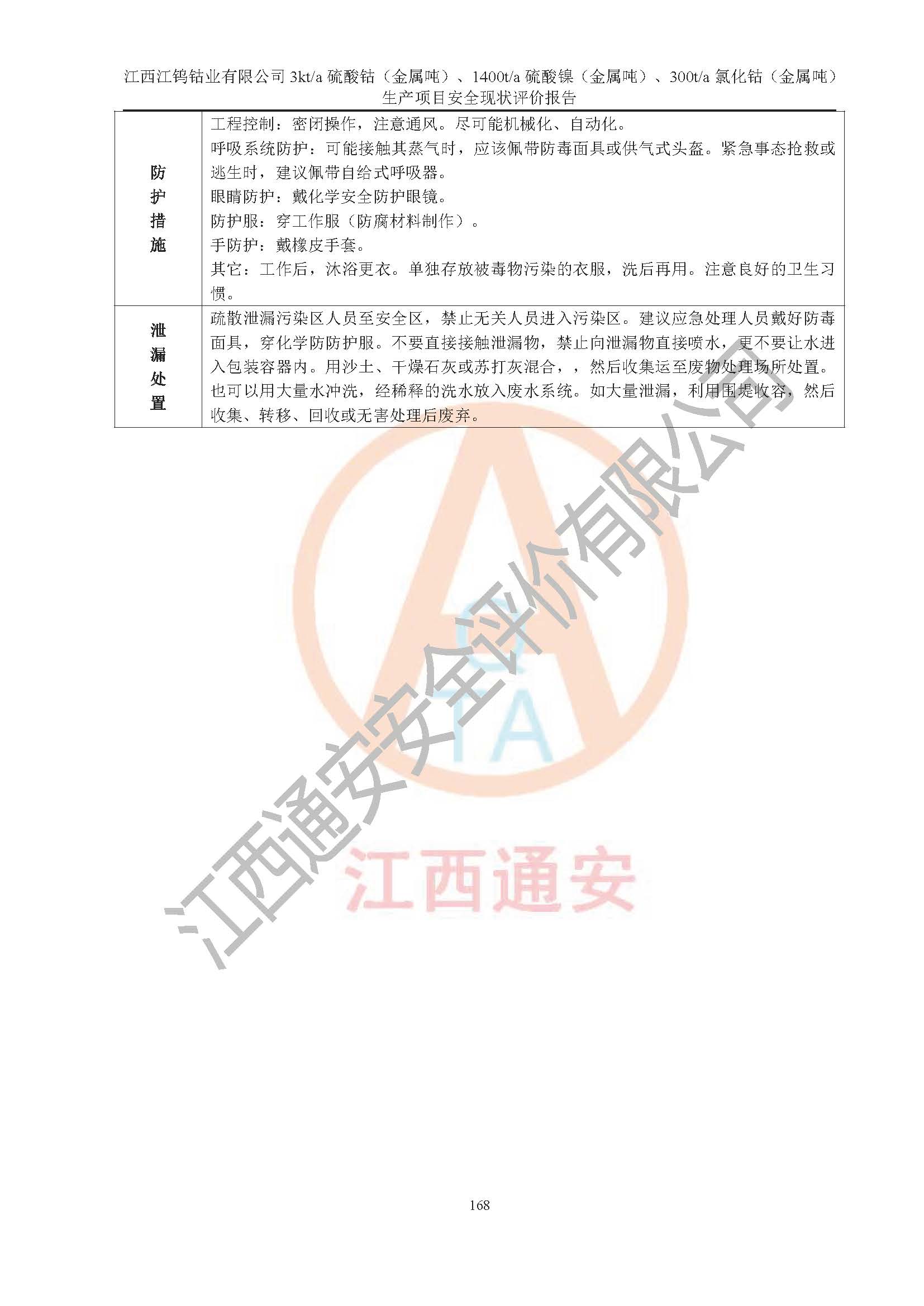 一、定量評價(jià)結(jié)果 1、作業(yè)條件危險(xiǎn)性分析評價(jià)結(jié)果:在選定的13個(gè)評價(jià)單元中,作業(yè)危險(xiǎn)等級為“可能危險(xiǎn),需要注意”,作業(yè)條件相對安全。 2、危險(xiǎn)程評價(jià)法分析結(jié)果:化工材料倉庫及罐區(qū)危險(xiǎn)程度為**危險(xiǎn),本項(xiàng)目在硫酸和鹽酸儲罐區(qū)設(shè)有圍堰、洗眼噴淋設(shè)施,儲罐均為常壓設(shè)備,設(shè)有就地液位和遠(yuǎn)傳的高低液位報(bào)警裝置,卸料、物料輸送、投料采用密閉化和機(jī)械化操作,公司制定了酸罐區(qū)的安全操作規(guī)程,作業(yè)人員穿戴個(gè)體防護(hù)用品,并配備了應(yīng)急救援裝備,通過采取**的安全設(shè)施和安全管理措施可以使風(fēng)險(xiǎn)降低到可接受范圍內(nèi);萃取車間危險(xiǎn)程度為低度危險(xiǎn)。風(fēng)險(xiǎn)在可接受范圍內(nèi)。。 4、定量風(fēng)險(xiǎn)評價(jià)分析結(jié)果:根據(jù)個(gè)人風(fēng)險(xiǎn)分析效果圖,該項(xiàng)目的個(gè)人風(fēng)險(xiǎn)符合要求;根據(jù)社會風(fēng)險(xiǎn)分析效果圖可知,該項(xiàng)目無社會風(fēng)險(xiǎn)。鍋爐發(fā)生物理爆炸的多米諾半徑局限在廠界內(nèi),企業(yè)會定期對鍋爐、空氣儲罐及安全附件進(jìn)行檢測,鍋爐操作工持證上崗,并加強(qiáng)日常的安全管理,可**降低發(fā)生物理爆炸的風(fēng)險(xiǎn)。 二、定性評價(jià)結(jié)果 1、依據(jù)相關(guān)法律、法規(guī)、標(biāo)準(zhǔn)等的規(guī)定,該項(xiàng)目外部安全條件、總平面布置、工藝及設(shè)備、防火防爆安全設(shè)施等符合**相關(guān)標(biāo)準(zhǔn)規(guī)范的要求,能滿足安全生產(chǎn)的要求。根據(jù)《江西江鎢鈷業(yè)有限公司全流程自動(dòng)化控制評估報(bào)告》(含《隱患清單》)評估報(bào)告,在役裝置的自動(dòng)化系統(tǒng)不需要提升。 2、該項(xiàng)目公用輔助設(shè)施能夠滿足安全生產(chǎn)的要求。 3、該項(xiàng)目按要求設(shè)置了安全生產(chǎn)管理機(jī)構(gòu),配備了專職安全生產(chǎn)管理人員,建立了全員安全生產(chǎn)責(zé)任制,制定了安全管理制度和崗位安全操作規(guī)程等。該公司修訂了生產(chǎn)安全事故應(yīng)急預(yù)案,配備了應(yīng)急救援器材,按要求定期進(jìn)行相關(guān)培訓(xùn)及演練。 4、公司主要負(fù)責(zé)人、安全管理人員經(jīng)培訓(xùn)考核取得了相應(yīng)的安全資格證書。主要負(fù)責(zé)人、分管安全負(fù)責(zé)人、分管生產(chǎn)、設(shè)備、技術(shù)負(fù)責(zé)人和安全管理人員的專業(yè)和學(xué)歷符合要求。特種作業(yè)人員均經(jīng)過培訓(xùn)考核合格后持證上崗,其他從業(yè)人員均進(jìn)行了安全教育培訓(xùn),具備安全知識與操作技能;公司配備了應(yīng)急救援物資,為從業(yè)人員配備了相應(yīng)的勞動(dòng)防護(hù)用品。 5、該項(xiàng)目的安全生產(chǎn)條件符合《安全生產(chǎn)許可證條例》、《危險(xiǎn)化學(xué)品生產(chǎn)企業(yè)安全生產(chǎn)許可證實(shí)施辦法》的要求,該項(xiàng)目不涉及重大生產(chǎn)安全事故隱患。 6、該項(xiàng)目不涉及重大生產(chǎn)安全事故隱患,采取的安全設(shè)施符合要求。 三、評價(jià)結(jié)論 江西江鎢鈷業(yè)有限公司符合城鄉(xiāng)規(guī)劃和布局,總平面布置符合《建筑設(shè)計(jì)防火規(guī)范(2018年版)》GB50016-2014等標(biāo)準(zhǔn)、規(guī)范的要求,采用成熟的生產(chǎn)工藝和設(shè)備,本質(zhì)安全程度較高;生產(chǎn)項(xiàng)目對現(xiàn)場存在事故危險(xiǎn)的設(shè)施和場所采取了合理可行的防護(hù)措施和科學(xué)的管理,使生產(chǎn)過程中的危險(xiǎn)有害因素能得到**控制。建設(shè)項(xiàng)目安全設(shè)施符合**現(xiàn)行有關(guān)法律、法規(guī)、標(biāo)準(zhǔn)的要求。企業(yè)對現(xiàn)場存在的安全問題進(jìn)行了整改,主要的安全缺陷消除。 評價(jià)結(jié)論:江西江鎢鈷業(yè)有限公司3kt/a硫酸鈷(金屬噸)、1400t/a硫酸鎳(金屬噸)、300t/a氯化鈷(金屬噸)生產(chǎn)項(xiàng)目的現(xiàn)場情況與設(shè)計(jì)變更圖紙一致,PLC控制系統(tǒng)設(shè)計(jì)符合要求、運(yùn)行正常,有關(guān)從業(yè)人員資質(zhì)符合《江西省危險(xiǎn)化學(xué)品安全專項(xiàng)整治三年行動(dòng)實(shí)施方案》要求,安全設(shè)施及安全管理符合法律、法規(guī)、標(biāo)準(zhǔn)的要求,安全風(fēng)險(xiǎn)是受控制的,其風(fēng)險(xiǎn)程度是可以接受的,安全設(shè)施符合安全生產(chǎn)條件,能夠滿足安全生產(chǎn)的要求。 |