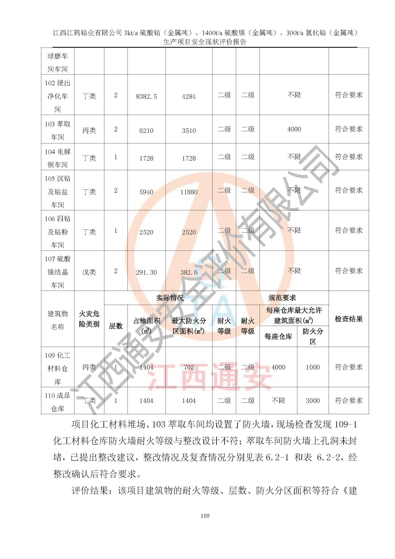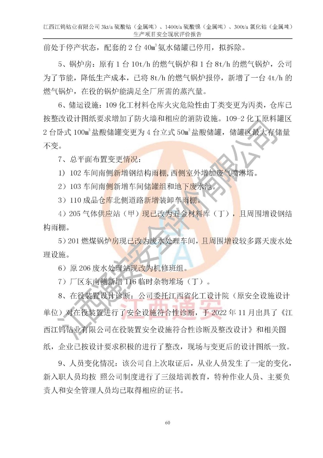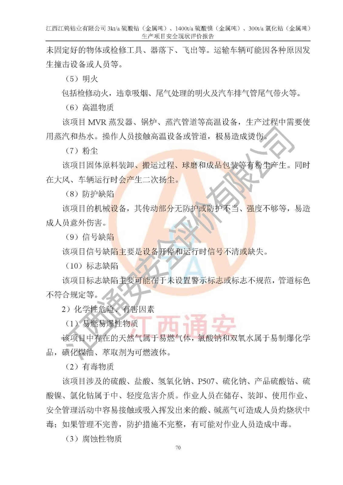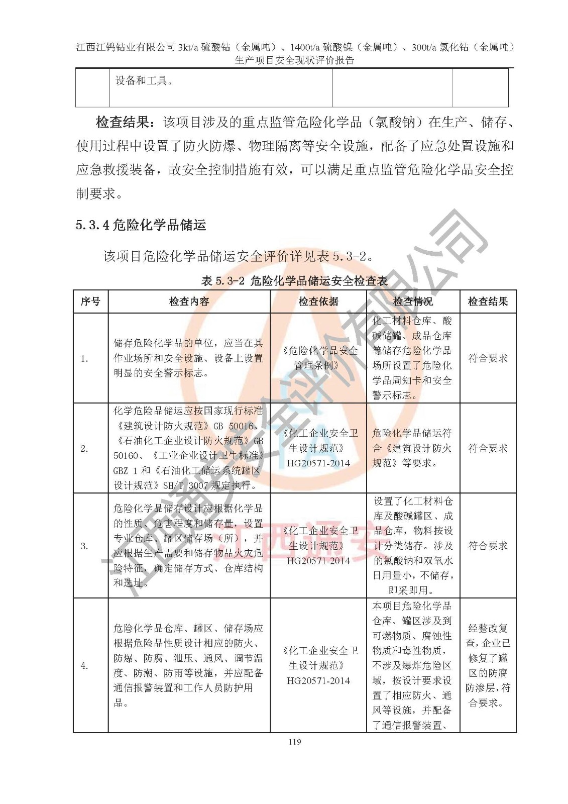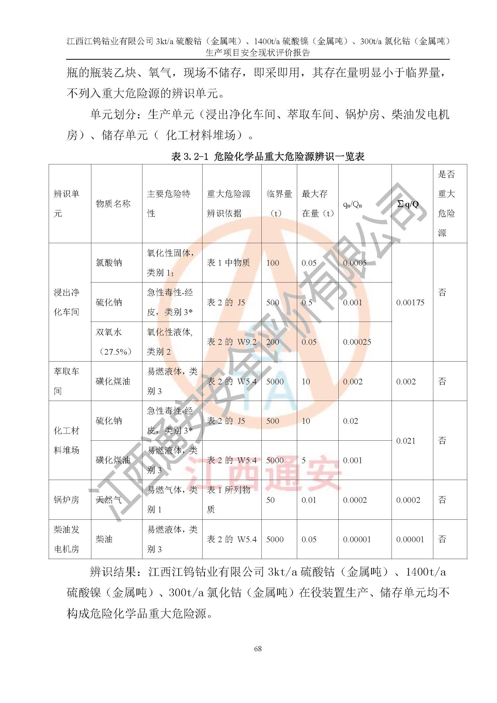 一、定量評價(jià)結(jié)果 1、作業(yè)條件危險(xiǎn)性分析評價(jià)結(jié)果:在選定的13個(gè)評價(jià)單元中,作業(yè)危險(xiǎn)等級為“可能危險(xiǎn),需要注意”,作業(yè)條件相對安全。 2、危險(xiǎn)程評價(jià)法分析結(jié)果:化工材料倉庫及罐區(qū)危險(xiǎn)程度為**危險(xiǎn),本項(xiàng)目在硫酸和鹽酸儲罐區(qū)設(shè)有圍堰、洗眼噴淋設(shè)施,儲罐均為常壓設(shè)備,設(shè)有就地液位和遠(yuǎn)傳的高低液位報(bào)警裝置,卸料、物料輸送、投料采用密閉化和機(jī)械化操作,公司制定了酸罐區(qū)的安全操作規(guī)程,作業(yè)人員穿戴個(gè)體防護(hù)用品,并配備了應(yīng)急救援裝備,通過采取**的安全設(shè)施和安全管理措施可以使風(fēng)險(xiǎn)降低到可接受范圍內(nèi);萃取車間危險(xiǎn)程度為低度危險(xiǎn)。風(fēng)險(xiǎn)在可接受范圍內(nèi)。。 4、定量風(fēng)險(xiǎn)評價(jià)分析結(jié)果:根據(jù)個(gè)人風(fēng)險(xiǎn)分析效果圖,該項(xiàng)目的個(gè)人風(fēng)險(xiǎn)符合要求;根據(jù)社會風(fēng)險(xiǎn)分析效果圖可知,該項(xiàng)目無社會風(fēng)險(xiǎn)。鍋爐發(fā)生物理爆炸的多米諾半徑局限在廠界內(nèi),企業(yè)會定期對鍋爐、空氣儲罐及安全附件進(jìn)行檢測,鍋爐操作工持證上崗,并加強(qiáng)日常的安全管理,可**降低發(fā)生物理爆炸的風(fēng)險(xiǎn)。 二、定性評價(jià)結(jié)果 1、依據(jù)相關(guān)法律、法規(guī)、標(biāo)準(zhǔn)等的規(guī)定,該項(xiàng)目外部安全條件、總平面布置、工藝及設(shè)備、防火防爆安全設(shè)施等符合**相關(guān)標(biāo)準(zhǔn)規(guī)范的要求,能滿足安全生產(chǎn)的要求。根據(jù)《江西江鎢鈷業(yè)有限公司全流程自動(dòng)化控制評估報(bào)告》(含《隱患清單》)評估報(bào)告,在役裝置的自動(dòng)化系統(tǒng)不需要提升。 2、該項(xiàng)目公用輔助設(shè)施能夠滿足安全生產(chǎn)的要求。 3、該項(xiàng)目按要求設(shè)置了安全生產(chǎn)管理機(jī)構(gòu),配備了專職安全生產(chǎn)管理人員,建立了全員安全生產(chǎn)責(zé)任制,制定了安全管理制度和崗位安全操作規(guī)程等。該公司修訂了生產(chǎn)安全事故應(yīng)急預(yù)案,配備了應(yīng)急救援器材,按要求定期進(jìn)行相關(guān)培訓(xùn)及演練。 4、公司主要負(fù)責(zé)人、安全管理人員經(jīng)培訓(xùn)考核取得了相應(yīng)的安全資格證書。主要負(fù)責(zé)人、分管安全負(fù)責(zé)人、分管生產(chǎn)、設(shè)備、技術(shù)負(fù)責(zé)人和安全管理人員的專業(yè)和學(xué)歷符合要求。特種作業(yè)人員均經(jīng)過培訓(xùn)考核合格后持證上崗,其他從業(yè)人員均進(jìn)行了安全教育培訓(xùn),具備安全知識與操作技能;公司配備了應(yīng)急救援物資,為從業(yè)人員配備了相應(yīng)的勞動(dòng)防護(hù)用品。 5、該項(xiàng)目的安全生產(chǎn)條件符合《安全生產(chǎn)許可證條例》、《危險(xiǎn)化學(xué)品生產(chǎn)企業(yè)安全生產(chǎn)許可證實(shí)施辦法》的要求,該項(xiàng)目不涉及重大生產(chǎn)安全事故隱患。 6、該項(xiàng)目不涉及重大生產(chǎn)安全事故隱患,采取的安全設(shè)施符合要求。 三、評價(jià)結(jié)論 江西江鎢鈷業(yè)有限公司符合城鄉(xiāng)規(guī)劃和布局,總平面布置符合《建筑設(shè)計(jì)防火規(guī)范(2018年版)》GB50016-2014等標(biāo)準(zhǔn)、規(guī)范的要求,采用成熟的生產(chǎn)工藝和設(shè)備,本質(zhì)安全程度較高;生產(chǎn)項(xiàng)目對現(xiàn)場存在事故危險(xiǎn)的設(shè)施和場所采取了合理可行的防護(hù)措施和科學(xué)的管理,使生產(chǎn)過程中的危險(xiǎn)有害因素能得到**控制。建設(shè)項(xiàng)目安全設(shè)施符合**現(xiàn)行有關(guān)法律、法規(guī)、標(biāo)準(zhǔn)的要求。企業(yè)對現(xiàn)場存在的安全問題進(jìn)行了整改,主要的安全缺陷消除。 評價(jià)結(jié)論:江西江鎢鈷業(yè)有限公司3kt/a硫酸鈷(金屬噸)、1400t/a硫酸鎳(金屬噸)、300t/a氯化鈷(金屬噸)生產(chǎn)項(xiàng)目的現(xiàn)場情況與設(shè)計(jì)變更圖紙一致,PLC控制系統(tǒng)設(shè)計(jì)符合要求、運(yùn)行正常,有關(guān)從業(yè)人員資質(zhì)符合《江西省危險(xiǎn)化學(xué)品安全專項(xiàng)整治三年行動(dòng)實(shí)施方案》要求,安全設(shè)施及安全管理符合法律、法規(guī)、標(biāo)準(zhǔn)的要求,安全風(fēng)險(xiǎn)是受控制的,其風(fēng)險(xiǎn)程度是可以接受的,安全設(shè)施符合安全生產(chǎn)條件,能夠滿足安全生產(chǎn)的要求。 |