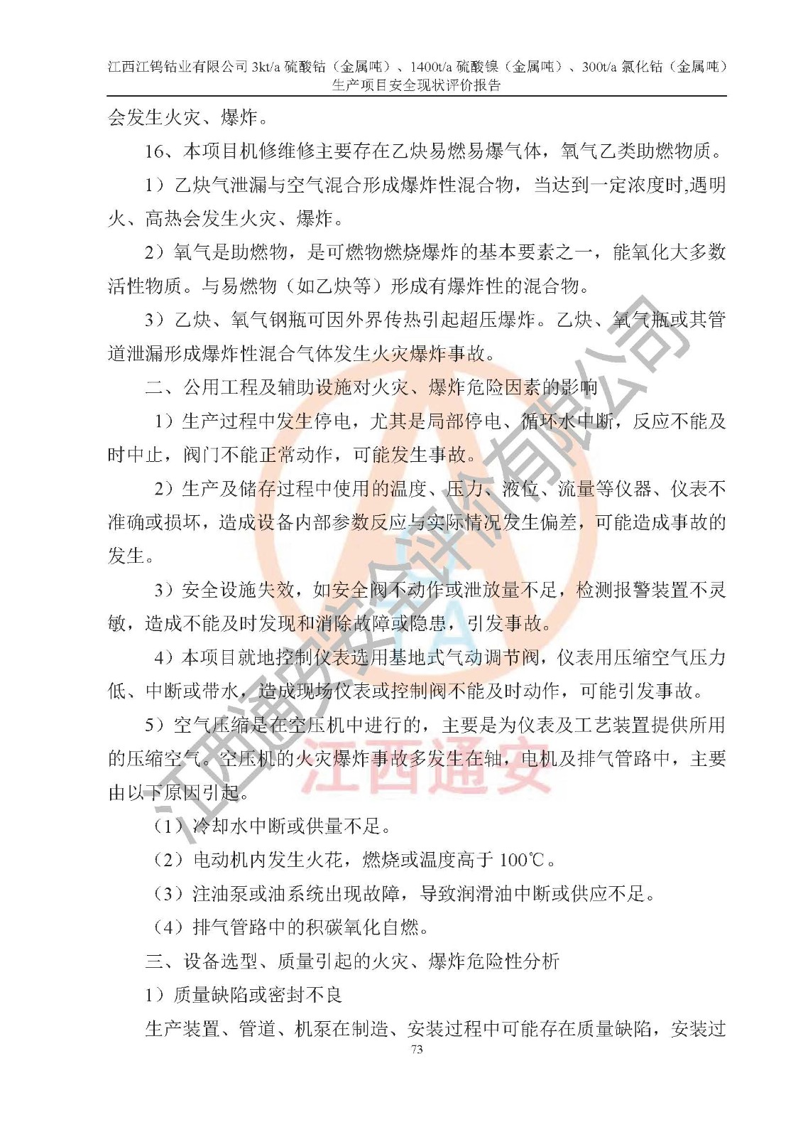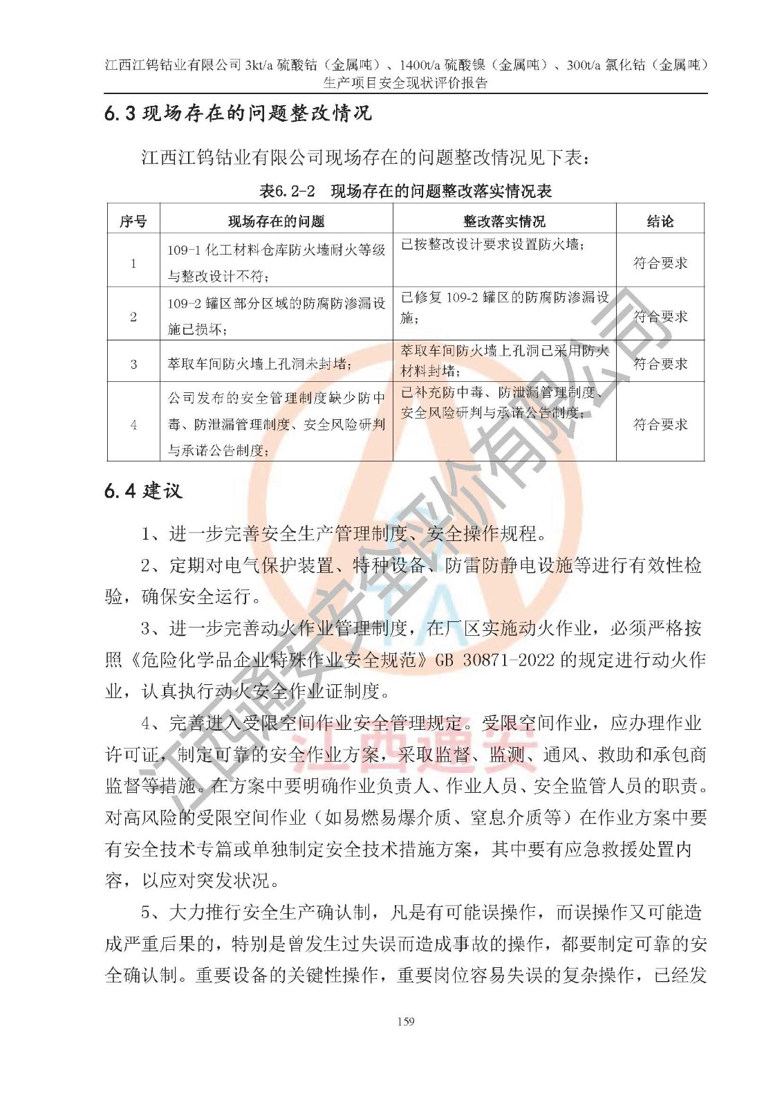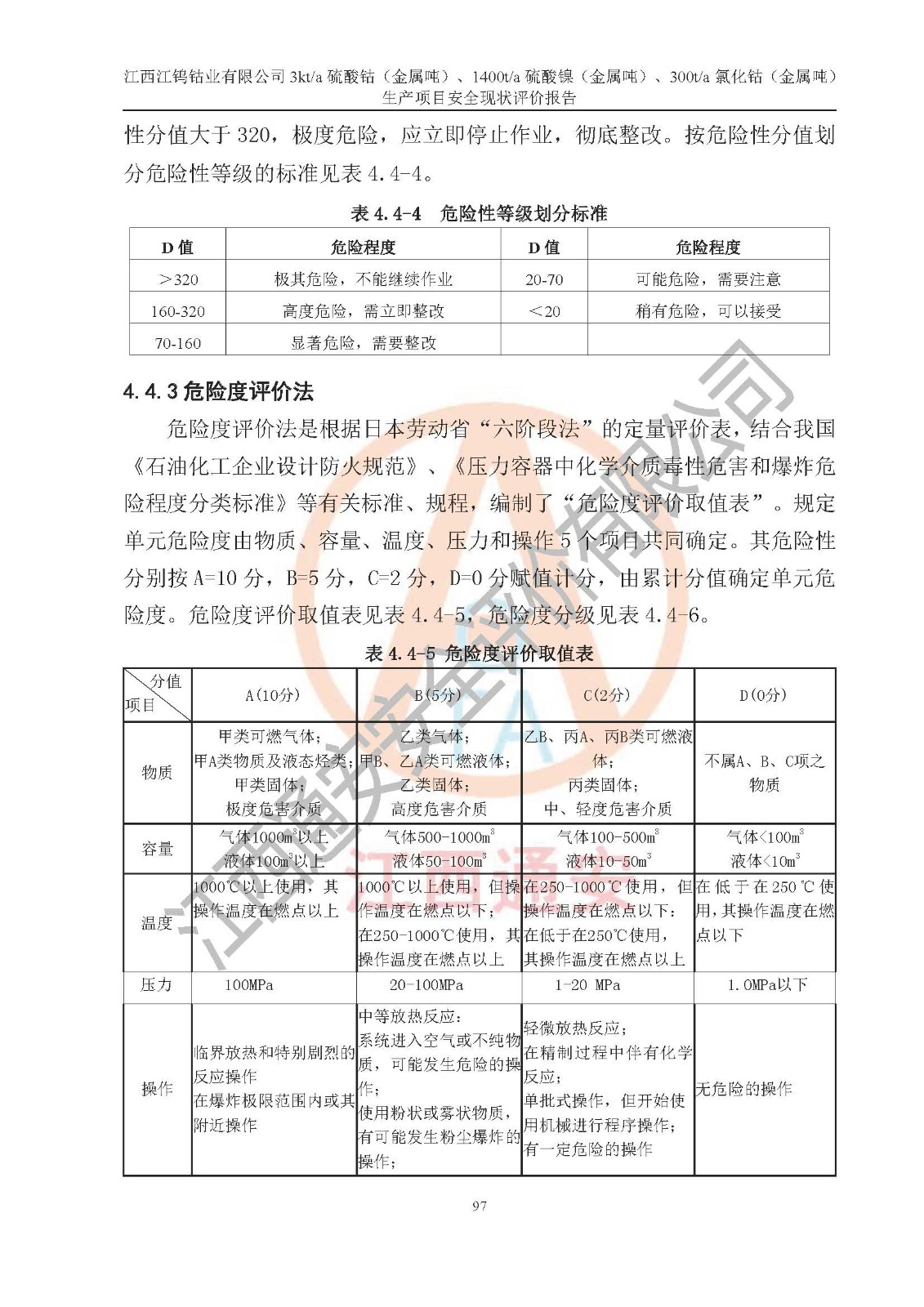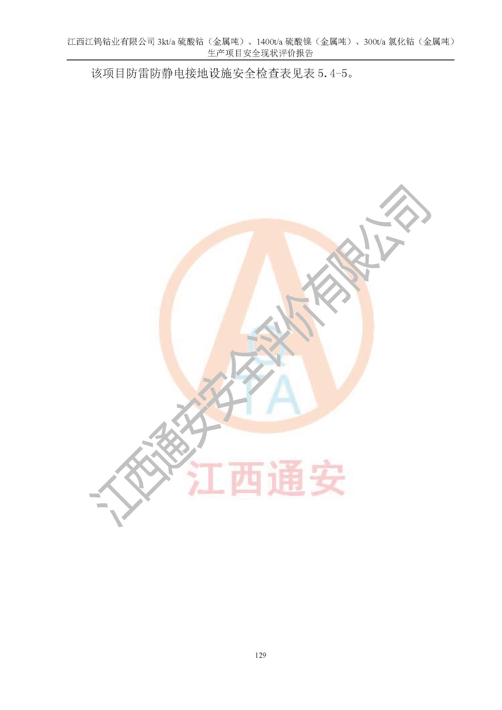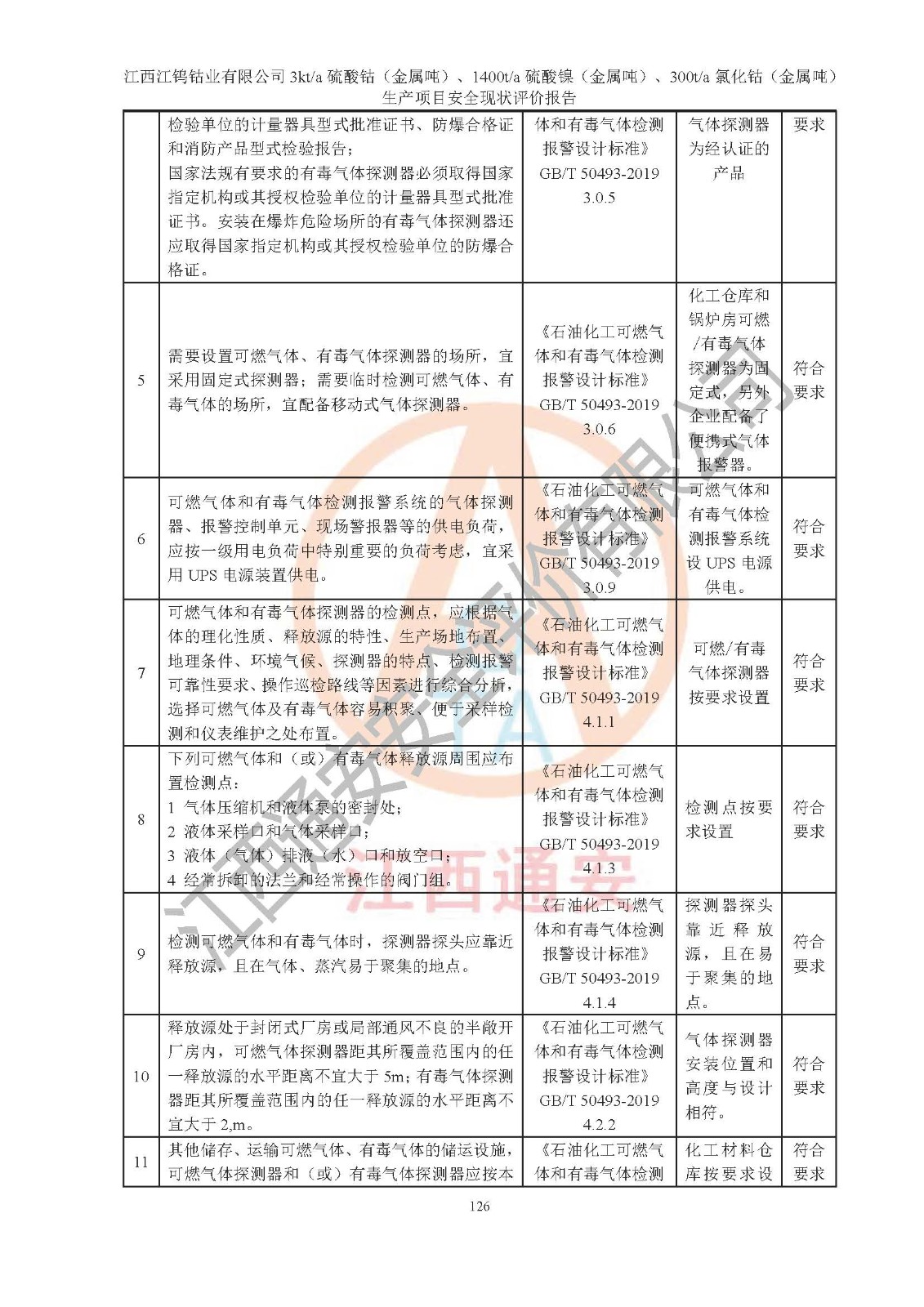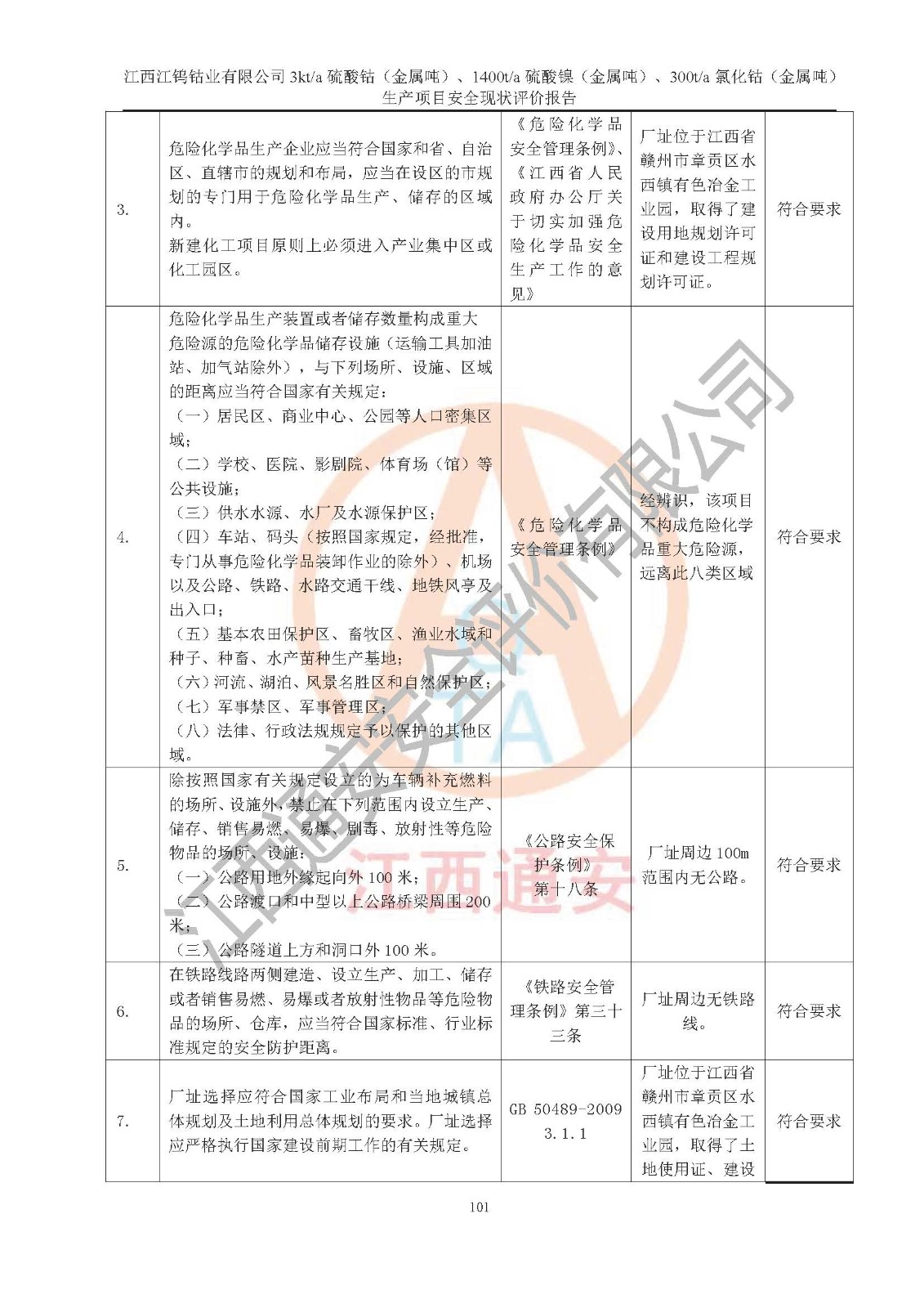 一、定量評價(jià)結(jié)果 1、作業(yè)條件危險(xiǎn)性分析評價(jià)結(jié)果:在選定的13個(gè)評價(jià)單元中,作業(yè)危險(xiǎn)等級為“可能危險(xiǎn),需要注意”,作業(yè)條件相對安全。 2、危險(xiǎn)程評價(jià)法分析結(jié)果:化工材料倉庫及罐區(qū)危險(xiǎn)程度為**危險(xiǎn),本項(xiàng)目在硫酸和鹽酸儲罐區(qū)設(shè)有圍堰、洗眼噴淋設(shè)施,儲罐均為常壓設(shè)備,設(shè)有就地液位和遠(yuǎn)傳的高低液位報(bào)警裝置,卸料、物料輸送、投料采用密閉化和機(jī)械化操作,公司制定了酸罐區(qū)的安全操作規(guī)程,作業(yè)人員穿戴個(gè)體防護(hù)用品,并配備了應(yīng)急救援裝備,通過采取**的安全設(shè)施和安全管理措施可以使風(fēng)險(xiǎn)降低到可接受范圍內(nèi);萃取車間危險(xiǎn)程度為低度危險(xiǎn)。風(fēng)險(xiǎn)在可接受范圍內(nèi)。。 4、定量風(fēng)險(xiǎn)評價(jià)分析結(jié)果:根據(jù)個(gè)人風(fēng)險(xiǎn)分析效果圖,該項(xiàng)目的個(gè)人風(fēng)險(xiǎn)符合要求;根據(jù)社會風(fēng)險(xiǎn)分析效果圖可知,該項(xiàng)目無社會風(fēng)險(xiǎn)。鍋爐發(fā)生物理爆炸的多米諾半徑局限在廠界內(nèi),企業(yè)會定期對鍋爐、空氣儲罐及安全附件進(jìn)行檢測,鍋爐操作工持證上崗,并加強(qiáng)日常的安全管理,可**降低發(fā)生物理爆炸的風(fēng)險(xiǎn)。 二、定性評價(jià)結(jié)果 1、依據(jù)相關(guān)法律、法規(guī)、標(biāo)準(zhǔn)等的規(guī)定,該項(xiàng)目外部安全條件、總平面布置、工藝及設(shè)備、防火防爆安全設(shè)施等符合**相關(guān)標(biāo)準(zhǔn)規(guī)范的要求,能滿足安全生產(chǎn)的要求。根據(jù)《江西江鎢鈷業(yè)有限公司全流程自動(dòng)化控制評估報(bào)告》(含《隱患清單》)評估報(bào)告,在役裝置的自動(dòng)化系統(tǒng)不需要提升。 2、該項(xiàng)目公用輔助設(shè)施能夠滿足安全生產(chǎn)的要求。 3、該項(xiàng)目按要求設(shè)置了安全生產(chǎn)管理機(jī)構(gòu),配備了專職安全生產(chǎn)管理人員,建立了全員安全生產(chǎn)責(zé)任制,制定了安全管理制度和崗位安全操作規(guī)程等。該公司修訂了生產(chǎn)安全事故應(yīng)急預(yù)案,配備了應(yīng)急救援器材,按要求定期進(jìn)行相關(guān)培訓(xùn)及演練。 4、公司主要負(fù)責(zé)人、安全管理人員經(jīng)培訓(xùn)考核取得了相應(yīng)的安全資格證書。主要負(fù)責(zé)人、分管安全負(fù)責(zé)人、分管生產(chǎn)、設(shè)備、技術(shù)負(fù)責(zé)人和安全管理人員的專業(yè)和學(xué)歷符合要求。特種作業(yè)人員均經(jīng)過培訓(xùn)考核合格后持證上崗,其他從業(yè)人員均進(jìn)行了安全教育培訓(xùn),具備安全知識與操作技能;公司配備了應(yīng)急救援物資,為從業(yè)人員配備了相應(yīng)的勞動(dòng)防護(hù)用品。 5、該項(xiàng)目的安全生產(chǎn)條件符合《安全生產(chǎn)許可證條例》、《危險(xiǎn)化學(xué)品生產(chǎn)企業(yè)安全生產(chǎn)許可證實(shí)施辦法》的要求,該項(xiàng)目不涉及重大生產(chǎn)安全事故隱患。 6、該項(xiàng)目不涉及重大生產(chǎn)安全事故隱患,采取的安全設(shè)施符合要求。 三、評價(jià)結(jié)論 江西江鎢鈷業(yè)有限公司符合城鄉(xiāng)規(guī)劃和布局,總平面布置符合《建筑設(shè)計(jì)防火規(guī)范(2018年版)》GB50016-2014等標(biāo)準(zhǔn)、規(guī)范的要求,采用成熟的生產(chǎn)工藝和設(shè)備,本質(zhì)安全程度較高;生產(chǎn)項(xiàng)目對現(xiàn)場存在事故危險(xiǎn)的設(shè)施和場所采取了合理可行的防護(hù)措施和科學(xué)的管理,使生產(chǎn)過程中的危險(xiǎn)有害因素能得到**控制。建設(shè)項(xiàng)目安全設(shè)施符合**現(xiàn)行有關(guān)法律、法規(guī)、標(biāo)準(zhǔn)的要求。企業(yè)對現(xiàn)場存在的安全問題進(jìn)行了整改,主要的安全缺陷消除。 評價(jià)結(jié)論:江西江鎢鈷業(yè)有限公司3kt/a硫酸鈷(金屬噸)、1400t/a硫酸鎳(金屬噸)、300t/a氯化鈷(金屬噸)生產(chǎn)項(xiàng)目的現(xiàn)場情況與設(shè)計(jì)變更圖紙一致,PLC控制系統(tǒng)設(shè)計(jì)符合要求、運(yùn)行正常,有關(guān)從業(yè)人員資質(zhì)符合《江西省危險(xiǎn)化學(xué)品安全專項(xiàng)整治三年行動(dòng)實(shí)施方案》要求,安全設(shè)施及安全管理符合法律、法規(guī)、標(biāo)準(zhǔn)的要求,安全風(fēng)險(xiǎn)是受控制的,其風(fēng)險(xiǎn)程度是可以接受的,安全設(shè)施符合安全生產(chǎn)條件,能夠滿足安全生產(chǎn)的要求。 |