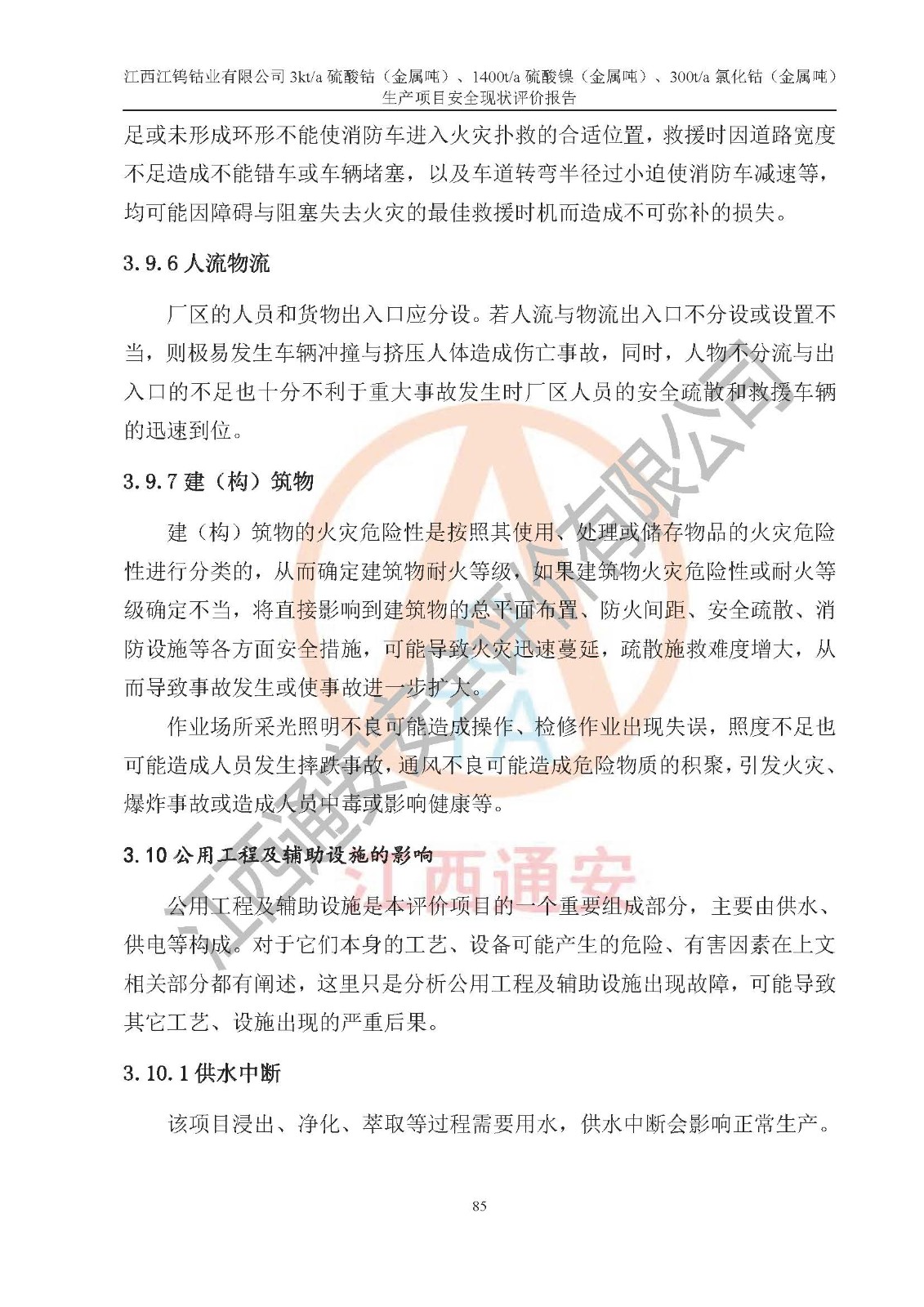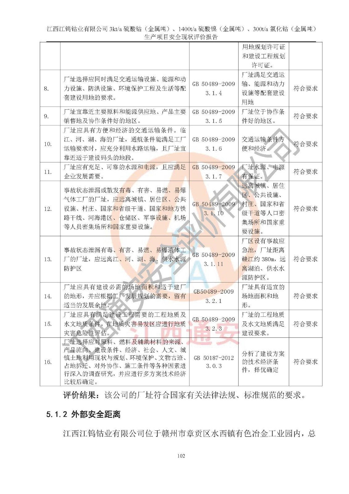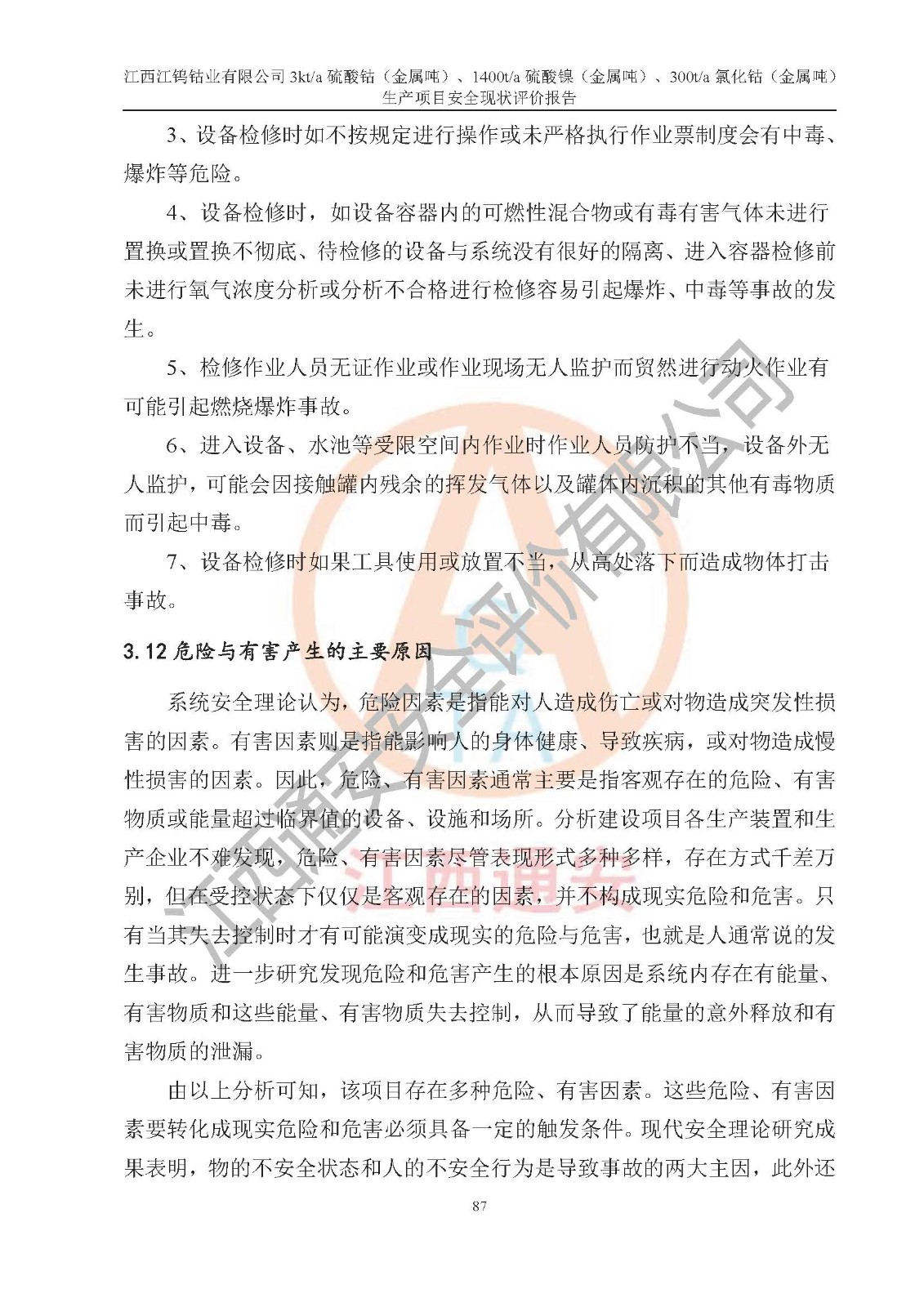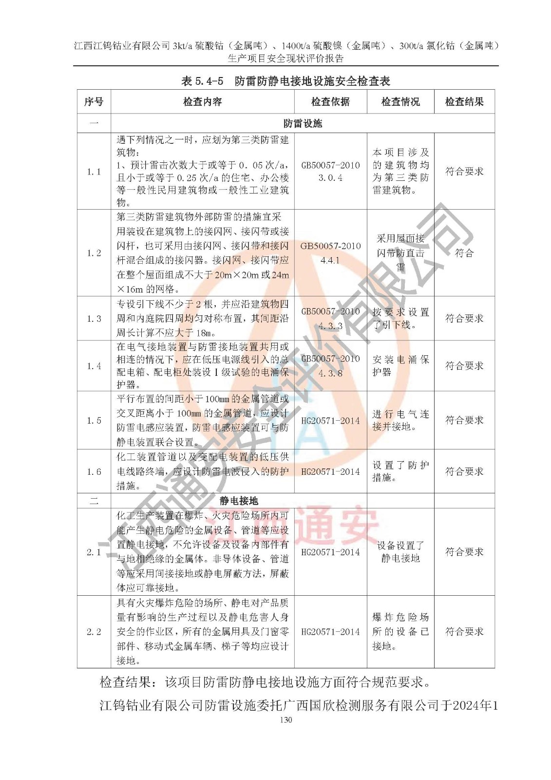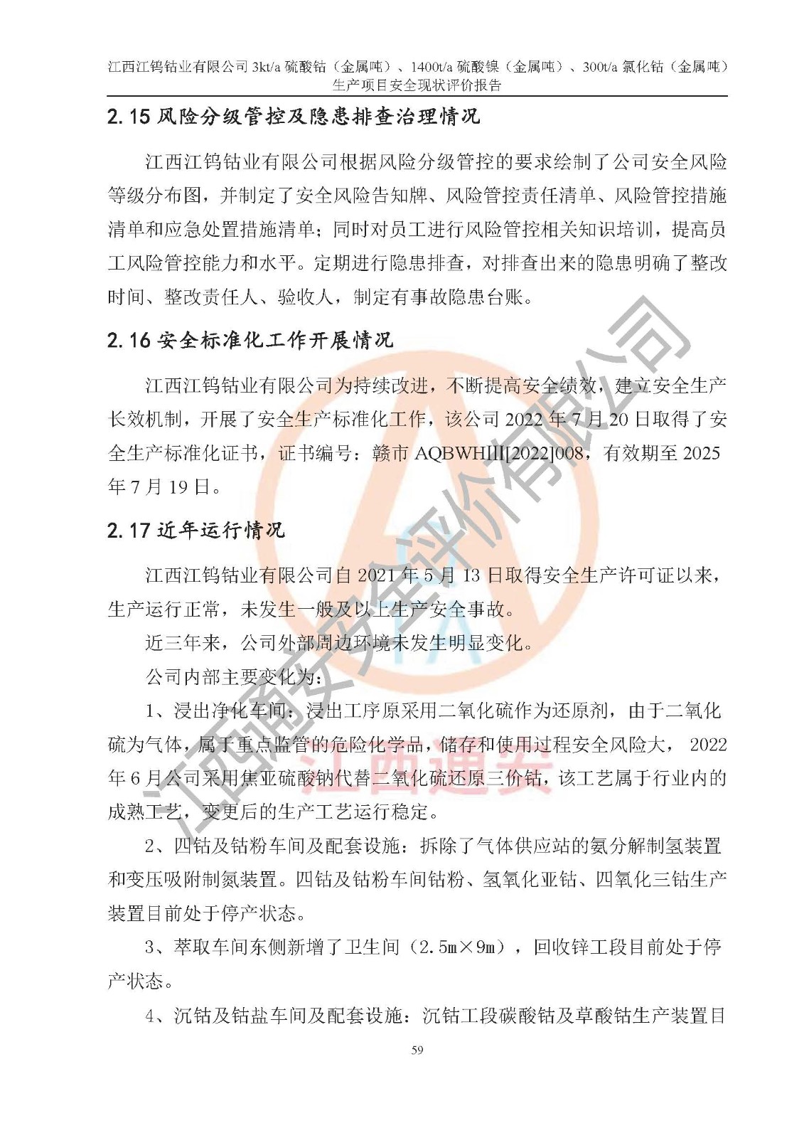 一、定量評價(jià)結(jié)果 1、作業(yè)條件危險(xiǎn)性分析評價(jià)結(jié)果:在選定的13個(gè)評價(jià)單元中,作業(yè)危險(xiǎn)等級為“可能危險(xiǎn),需要注意”,作業(yè)條件相對安全。 2、危險(xiǎn)程評價(jià)法分析結(jié)果:化工材料倉庫及罐區(qū)危險(xiǎn)程度為**危險(xiǎn),本項(xiàng)目在硫酸和鹽酸儲罐區(qū)設(shè)有圍堰、洗眼噴淋設(shè)施,儲罐均為常壓設(shè)備,設(shè)有就地液位和遠(yuǎn)傳的高低液位報(bào)警裝置,卸料、物料輸送、投料采用密閉化和機(jī)械化操作,公司制定了酸罐區(qū)的安全操作規(guī)程,作業(yè)人員穿戴個(gè)體防護(hù)用品,并配備了應(yīng)急救援裝備,通過采取**的安全設(shè)施和安全管理措施可以使風(fēng)險(xiǎn)降低到可接受范圍內(nèi);萃取車間危險(xiǎn)程度為低度危險(xiǎn)。風(fēng)險(xiǎn)在可接受范圍內(nèi)。。 4、定量風(fēng)險(xiǎn)評價(jià)分析結(jié)果:根據(jù)個(gè)人風(fēng)險(xiǎn)分析效果圖,該項(xiàng)目的個(gè)人風(fēng)險(xiǎn)符合要求;根據(jù)社會風(fēng)險(xiǎn)分析效果圖可知,該項(xiàng)目無社會風(fēng)險(xiǎn)。鍋爐發(fā)生物理爆炸的多米諾半徑局限在廠界內(nèi),企業(yè)會定期對鍋爐、空氣儲罐及安全附件進(jìn)行檢測,鍋爐操作工持證上崗,并加強(qiáng)日常的安全管理,可**降低發(fā)生物理爆炸的風(fēng)險(xiǎn)。 二、定性評價(jià)結(jié)果 1、依據(jù)相關(guān)法律、法規(guī)、標(biāo)準(zhǔn)等的規(guī)定,該項(xiàng)目外部安全條件、總平面布置、工藝及設(shè)備、防火防爆安全設(shè)施等符合**相關(guān)標(biāo)準(zhǔn)規(guī)范的要求,能滿足安全生產(chǎn)的要求。根據(jù)《江西江鎢鈷業(yè)有限公司全流程自動(dòng)化控制評估報(bào)告》(含《隱患清單》)評估報(bào)告,在役裝置的自動(dòng)化系統(tǒng)不需要提升。 2、該項(xiàng)目公用輔助設(shè)施能夠滿足安全生產(chǎn)的要求。 3、該項(xiàng)目按要求設(shè)置了安全生產(chǎn)管理機(jī)構(gòu),配備了專職安全生產(chǎn)管理人員,建立了全員安全生產(chǎn)責(zé)任制,制定了安全管理制度和崗位安全操作規(guī)程等。該公司修訂了生產(chǎn)安全事故應(yīng)急預(yù)案,配備了應(yīng)急救援器材,按要求定期進(jìn)行相關(guān)培訓(xùn)及演練。 4、公司主要負(fù)責(zé)人、安全管理人員經(jīng)培訓(xùn)考核取得了相應(yīng)的安全資格證書。主要負(fù)責(zé)人、分管安全負(fù)責(zé)人、分管生產(chǎn)、設(shè)備、技術(shù)負(fù)責(zé)人和安全管理人員的專業(yè)和學(xué)歷符合要求。特種作業(yè)人員均經(jīng)過培訓(xùn)考核合格后持證上崗,其他從業(yè)人員均進(jìn)行了安全教育培訓(xùn),具備安全知識與操作技能;公司配備了應(yīng)急救援物資,為從業(yè)人員配備了相應(yīng)的勞動(dòng)防護(hù)用品。 5、該項(xiàng)目的安全生產(chǎn)條件符合《安全生產(chǎn)許可證條例》、《危險(xiǎn)化學(xué)品生產(chǎn)企業(yè)安全生產(chǎn)許可證實(shí)施辦法》的要求,該項(xiàng)目不涉及重大生產(chǎn)安全事故隱患。 6、該項(xiàng)目不涉及重大生產(chǎn)安全事故隱患,采取的安全設(shè)施符合要求。 三、評價(jià)結(jié)論 江西江鎢鈷業(yè)有限公司符合城鄉(xiāng)規(guī)劃和布局,總平面布置符合《建筑設(shè)計(jì)防火規(guī)范(2018年版)》GB50016-2014等標(biāo)準(zhǔn)、規(guī)范的要求,采用成熟的生產(chǎn)工藝和設(shè)備,本質(zhì)安全程度較高;生產(chǎn)項(xiàng)目對現(xiàn)場存在事故危險(xiǎn)的設(shè)施和場所采取了合理可行的防護(hù)措施和科學(xué)的管理,使生產(chǎn)過程中的危險(xiǎn)有害因素能得到**控制。建設(shè)項(xiàng)目安全設(shè)施符合**現(xiàn)行有關(guān)法律、法規(guī)、標(biāo)準(zhǔn)的要求。企業(yè)對現(xiàn)場存在的安全問題進(jìn)行了整改,主要的安全缺陷消除。 評價(jià)結(jié)論:江西江鎢鈷業(yè)有限公司3kt/a硫酸鈷(金屬噸)、1400t/a硫酸鎳(金屬噸)、300t/a氯化鈷(金屬噸)生產(chǎn)項(xiàng)目的現(xiàn)場情況與設(shè)計(jì)變更圖紙一致,PLC控制系統(tǒng)設(shè)計(jì)符合要求、運(yùn)行正常,有關(guān)從業(yè)人員資質(zhì)符合《江西省危險(xiǎn)化學(xué)品安全專項(xiàng)整治三年行動(dòng)實(shí)施方案》要求,安全設(shè)施及安全管理符合法律、法規(guī)、標(biāo)準(zhǔn)的要求,安全風(fēng)險(xiǎn)是受控制的,其風(fēng)險(xiǎn)程度是可以接受的,安全設(shè)施符合安全生產(chǎn)條件,能夠滿足安全生產(chǎn)的要求。 |