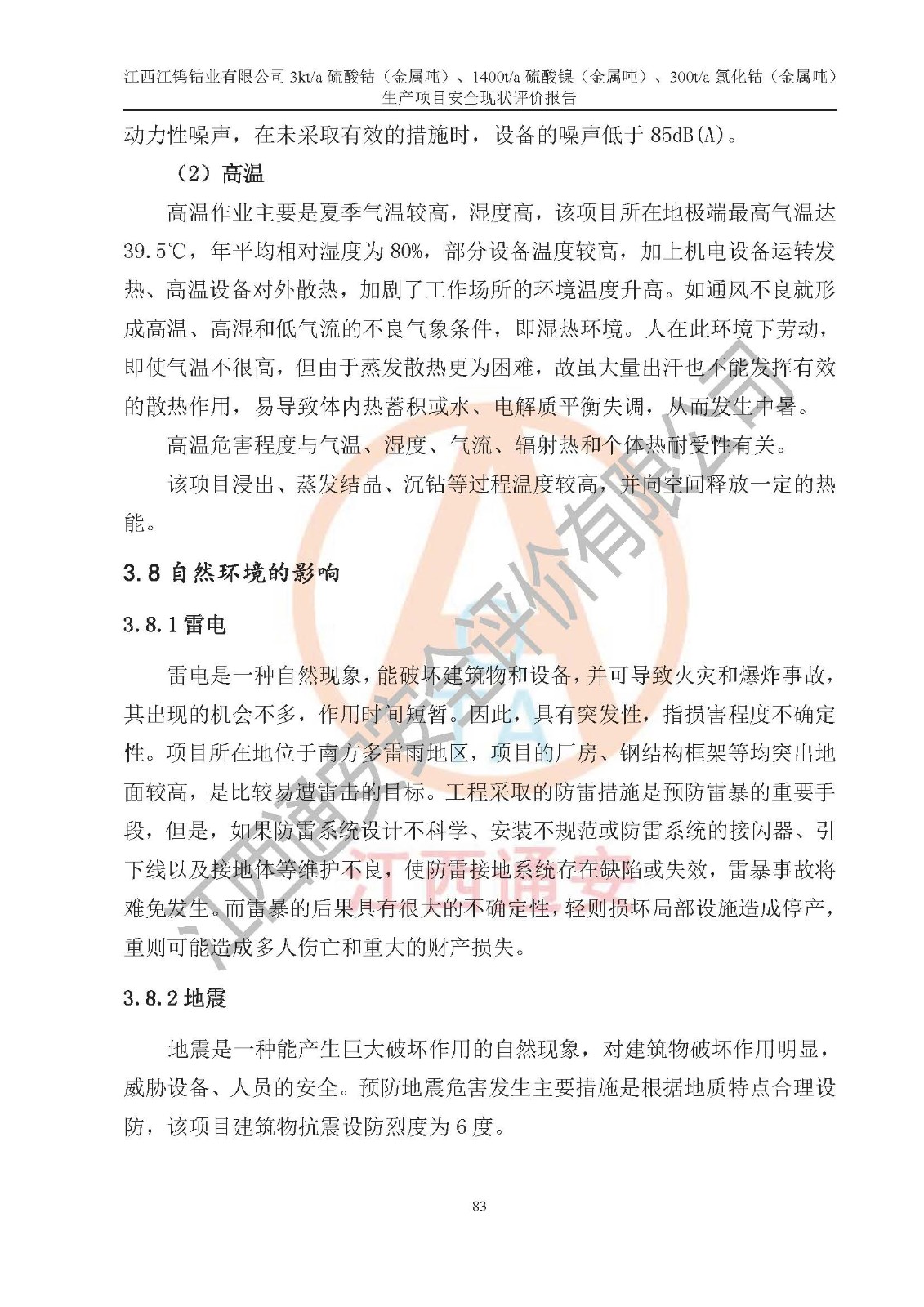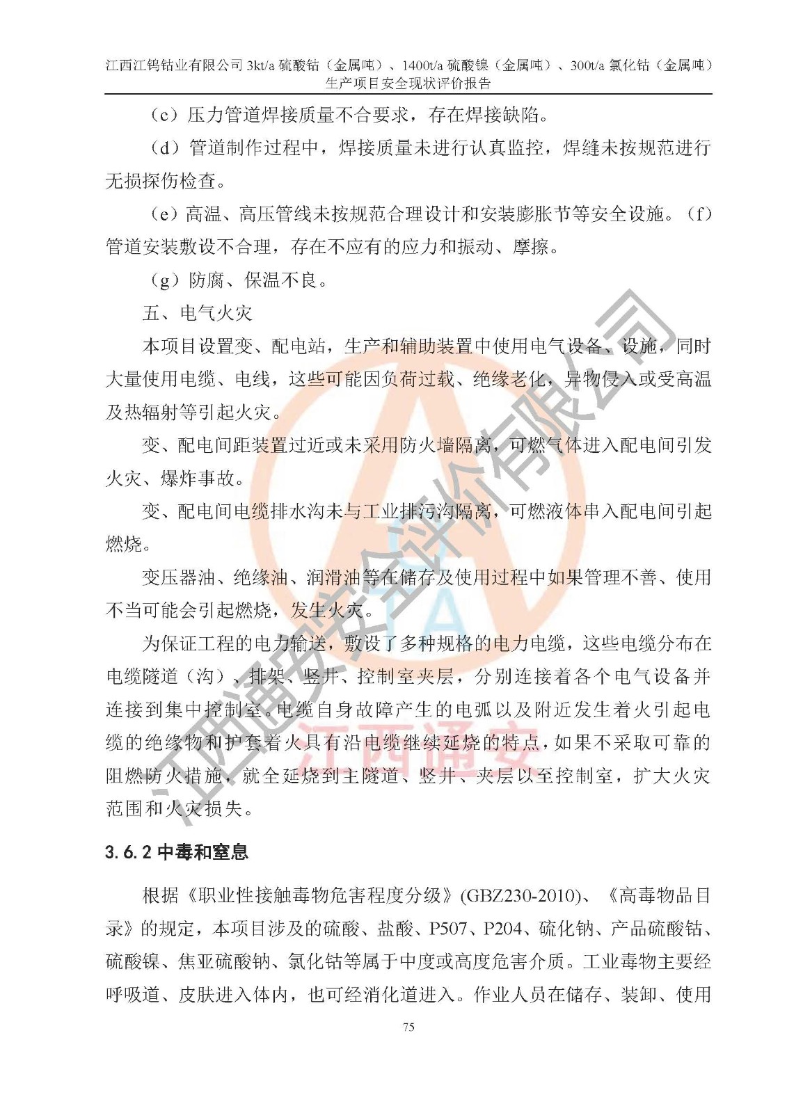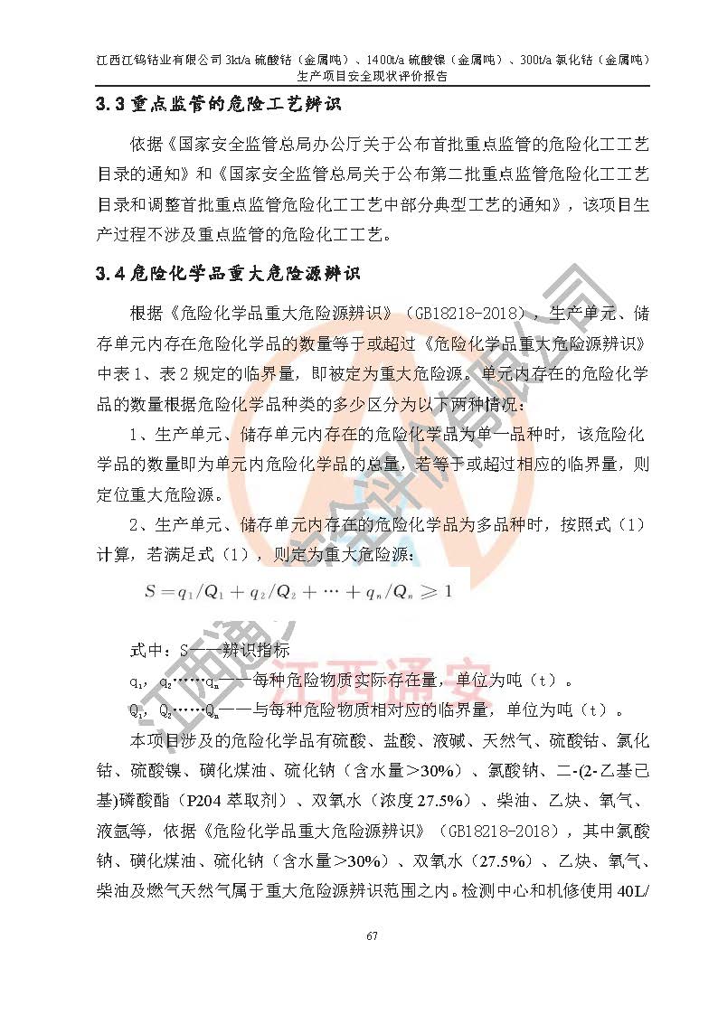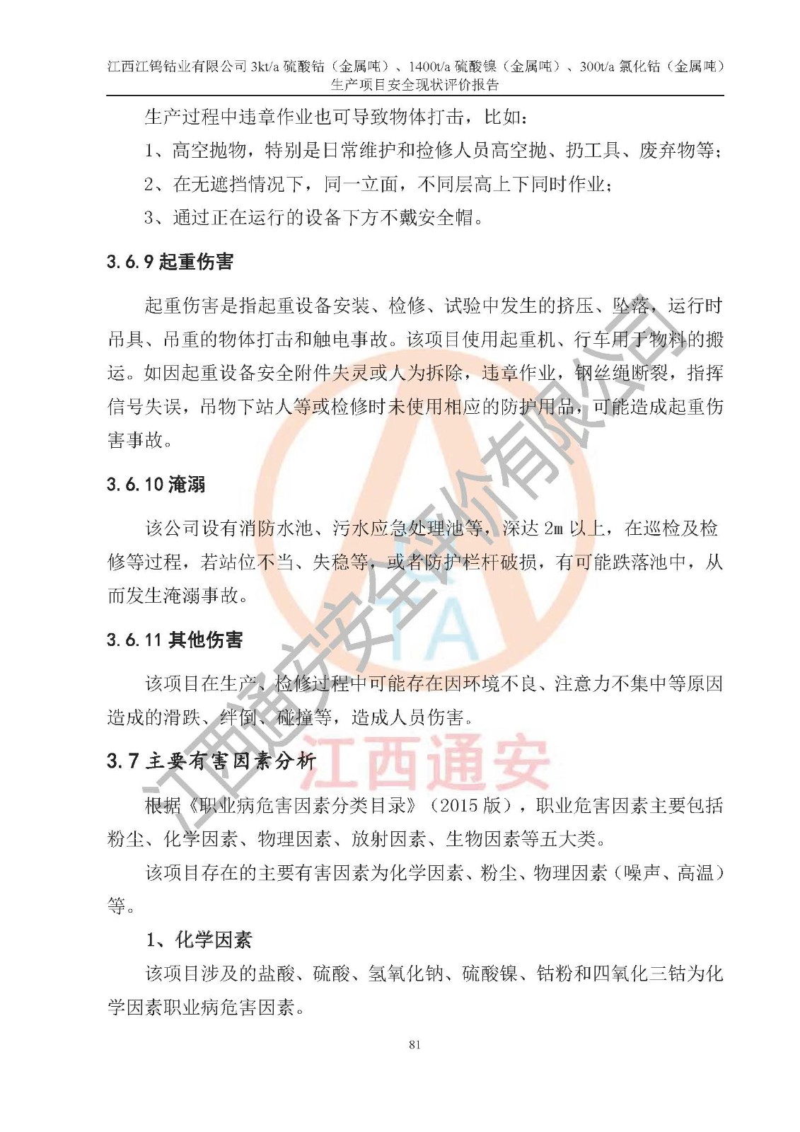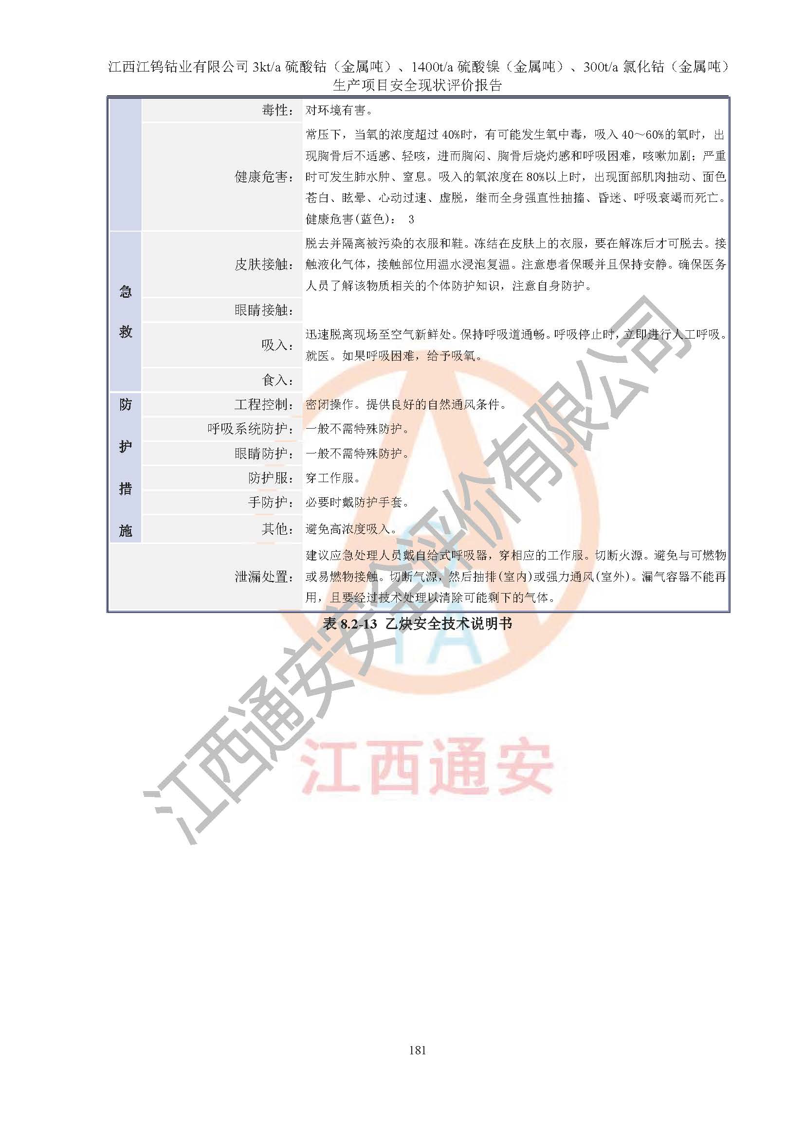 一、定量評價(jià)結(jié)果 1、作業(yè)條件危險(xiǎn)性分析評價(jià)結(jié)果:在選定的13個(gè)評價(jià)單元中,作業(yè)危險(xiǎn)等級為“可能危險(xiǎn),需要注意”,作業(yè)條件相對安全。 2、危險(xiǎn)程評價(jià)法分析結(jié)果:化工材料倉庫及罐區(qū)危險(xiǎn)程度為**危險(xiǎn),本項(xiàng)目在硫酸和鹽酸儲罐區(qū)設(shè)有圍堰、洗眼噴淋設(shè)施,儲罐均為常壓設(shè)備,設(shè)有就地液位和遠(yuǎn)傳的高低液位報(bào)警裝置,卸料、物料輸送、投料采用密閉化和機(jī)械化操作,公司制定了酸罐區(qū)的安全操作規(guī)程,作業(yè)人員穿戴個(gè)體防護(hù)用品,并配備了應(yīng)急救援裝備,通過采取**的安全設(shè)施和安全管理措施可以使風(fēng)險(xiǎn)降低到可接受范圍內(nèi);萃取車間危險(xiǎn)程度為低度危險(xiǎn)。風(fēng)險(xiǎn)在可接受范圍內(nèi)。。 4、定量風(fēng)險(xiǎn)評價(jià)分析結(jié)果:根據(jù)個(gè)人風(fēng)險(xiǎn)分析效果圖,該項(xiàng)目的個(gè)人風(fēng)險(xiǎn)符合要求;根據(jù)社會風(fēng)險(xiǎn)分析效果圖可知,該項(xiàng)目無社會風(fēng)險(xiǎn)。鍋爐發(fā)生物理爆炸的多米諾半徑局限在廠界內(nèi),企業(yè)會定期對鍋爐、空氣儲罐及安全附件進(jìn)行檢測,鍋爐操作工持證上崗,并加強(qiáng)日常的安全管理,可**降低發(fā)生物理爆炸的風(fēng)險(xiǎn)。 二、定性評價(jià)結(jié)果 1、依據(jù)相關(guān)法律、法規(guī)、標(biāo)準(zhǔn)等的規(guī)定,該項(xiàng)目外部安全條件、總平面布置、工藝及設(shè)備、防火防爆安全設(shè)施等符合**相關(guān)標(biāo)準(zhǔn)規(guī)范的要求,能滿足安全生產(chǎn)的要求。根據(jù)《江西江鎢鈷業(yè)有限公司全流程自動(dòng)化控制評估報(bào)告》(含《隱患清單》)評估報(bào)告,在役裝置的自動(dòng)化系統(tǒng)不需要提升。 2、該項(xiàng)目公用輔助設(shè)施能夠滿足安全生產(chǎn)的要求。 3、該項(xiàng)目按要求設(shè)置了安全生產(chǎn)管理機(jī)構(gòu),配備了專職安全生產(chǎn)管理人員,建立了全員安全生產(chǎn)責(zé)任制,制定了安全管理制度和崗位安全操作規(guī)程等。該公司修訂了生產(chǎn)安全事故應(yīng)急預(yù)案,配備了應(yīng)急救援器材,按要求定期進(jìn)行相關(guān)培訓(xùn)及演練。 4、公司主要負(fù)責(zé)人、安全管理人員經(jīng)培訓(xùn)考核取得了相應(yīng)的安全資格證書。主要負(fù)責(zé)人、分管安全負(fù)責(zé)人、分管生產(chǎn)、設(shè)備、技術(shù)負(fù)責(zé)人和安全管理人員的專業(yè)和學(xué)歷符合要求。特種作業(yè)人員均經(jīng)過培訓(xùn)考核合格后持證上崗,其他從業(yè)人員均進(jìn)行了安全教育培訓(xùn),具備安全知識與操作技能;公司配備了應(yīng)急救援物資,為從業(yè)人員配備了相應(yīng)的勞動(dòng)防護(hù)用品。 5、該項(xiàng)目的安全生產(chǎn)條件符合《安全生產(chǎn)許可證條例》、《危險(xiǎn)化學(xué)品生產(chǎn)企業(yè)安全生產(chǎn)許可證實(shí)施辦法》的要求,該項(xiàng)目不涉及重大生產(chǎn)安全事故隱患。 6、該項(xiàng)目不涉及重大生產(chǎn)安全事故隱患,采取的安全設(shè)施符合要求。 三、評價(jià)結(jié)論 江西江鎢鈷業(yè)有限公司符合城鄉(xiāng)規(guī)劃和布局,總平面布置符合《建筑設(shè)計(jì)防火規(guī)范(2018年版)》GB50016-2014等標(biāo)準(zhǔn)、規(guī)范的要求,采用成熟的生產(chǎn)工藝和設(shè)備,本質(zhì)安全程度較高;生產(chǎn)項(xiàng)目對現(xiàn)場存在事故危險(xiǎn)的設(shè)施和場所采取了合理可行的防護(hù)措施和科學(xué)的管理,使生產(chǎn)過程中的危險(xiǎn)有害因素能得到**控制。建設(shè)項(xiàng)目安全設(shè)施符合**現(xiàn)行有關(guān)法律、法規(guī)、標(biāo)準(zhǔn)的要求。企業(yè)對現(xiàn)場存在的安全問題進(jìn)行了整改,主要的安全缺陷消除。 評價(jià)結(jié)論:江西江鎢鈷業(yè)有限公司3kt/a硫酸鈷(金屬噸)、1400t/a硫酸鎳(金屬噸)、300t/a氯化鈷(金屬噸)生產(chǎn)項(xiàng)目的現(xiàn)場情況與設(shè)計(jì)變更圖紙一致,PLC控制系統(tǒng)設(shè)計(jì)符合要求、運(yùn)行正常,有關(guān)從業(yè)人員資質(zhì)符合《江西省危險(xiǎn)化學(xué)品安全專項(xiàng)整治三年行動(dòng)實(shí)施方案》要求,安全設(shè)施及安全管理符合法律、法規(guī)、標(biāo)準(zhǔn)的要求,安全風(fēng)險(xiǎn)是受控制的,其風(fēng)險(xiǎn)程度是可以接受的,安全設(shè)施符合安全生產(chǎn)條件,能夠滿足安全生產(chǎn)的要求。 |