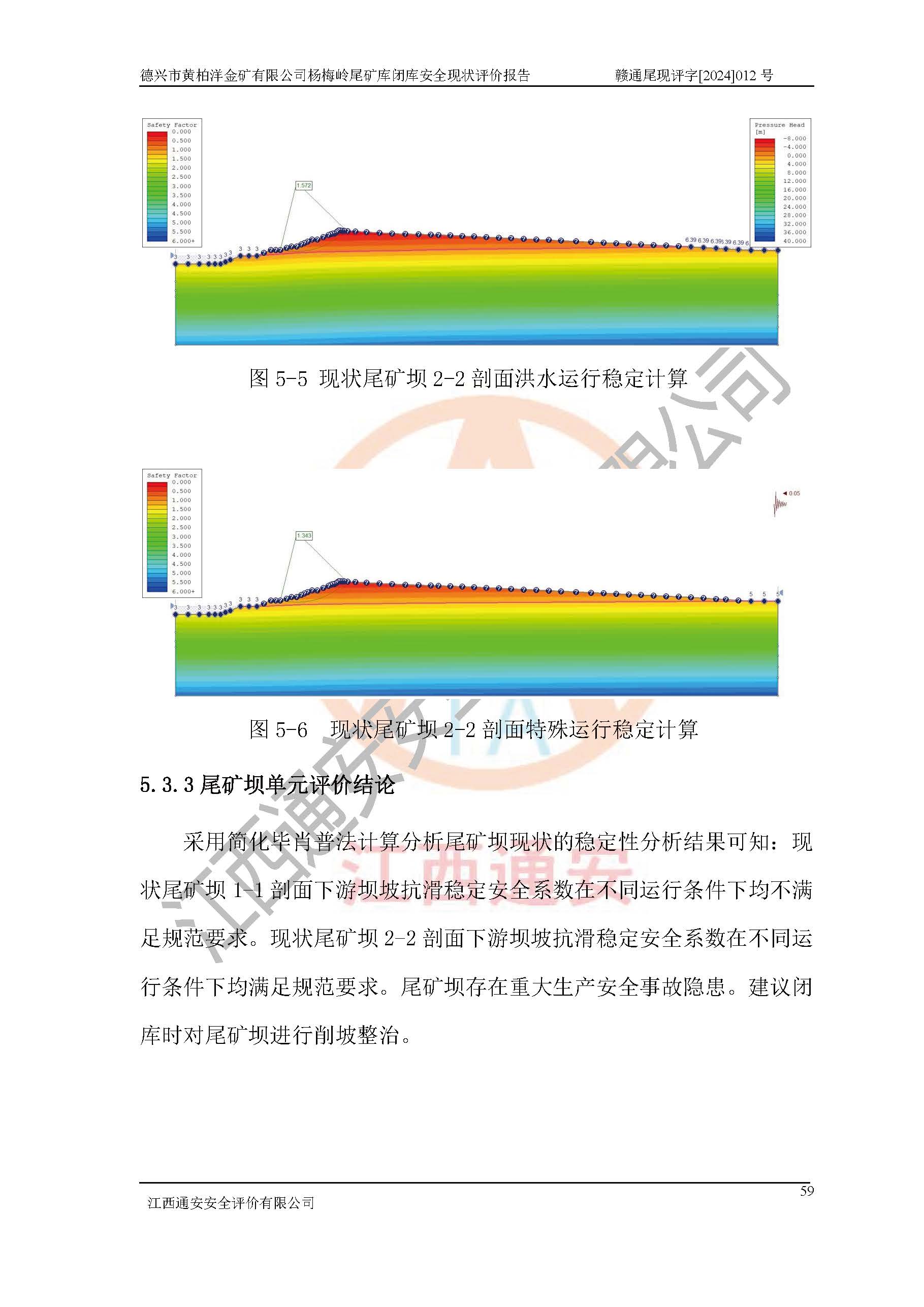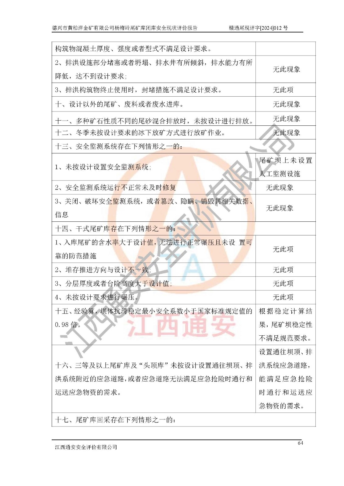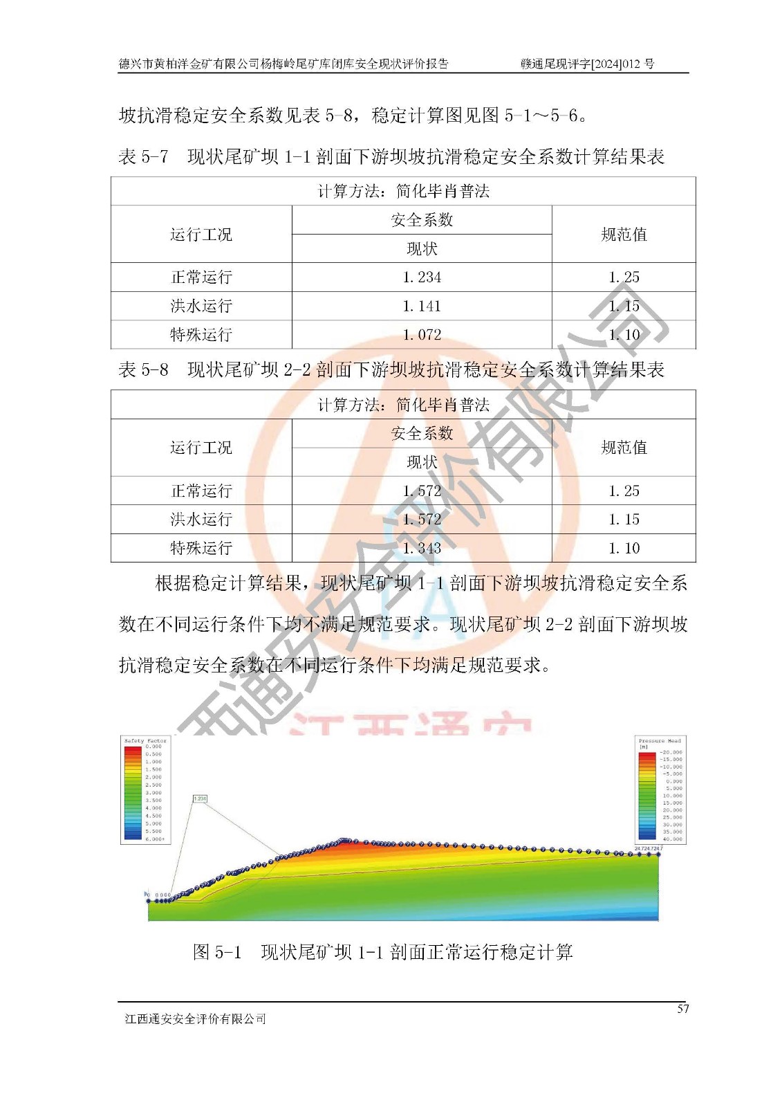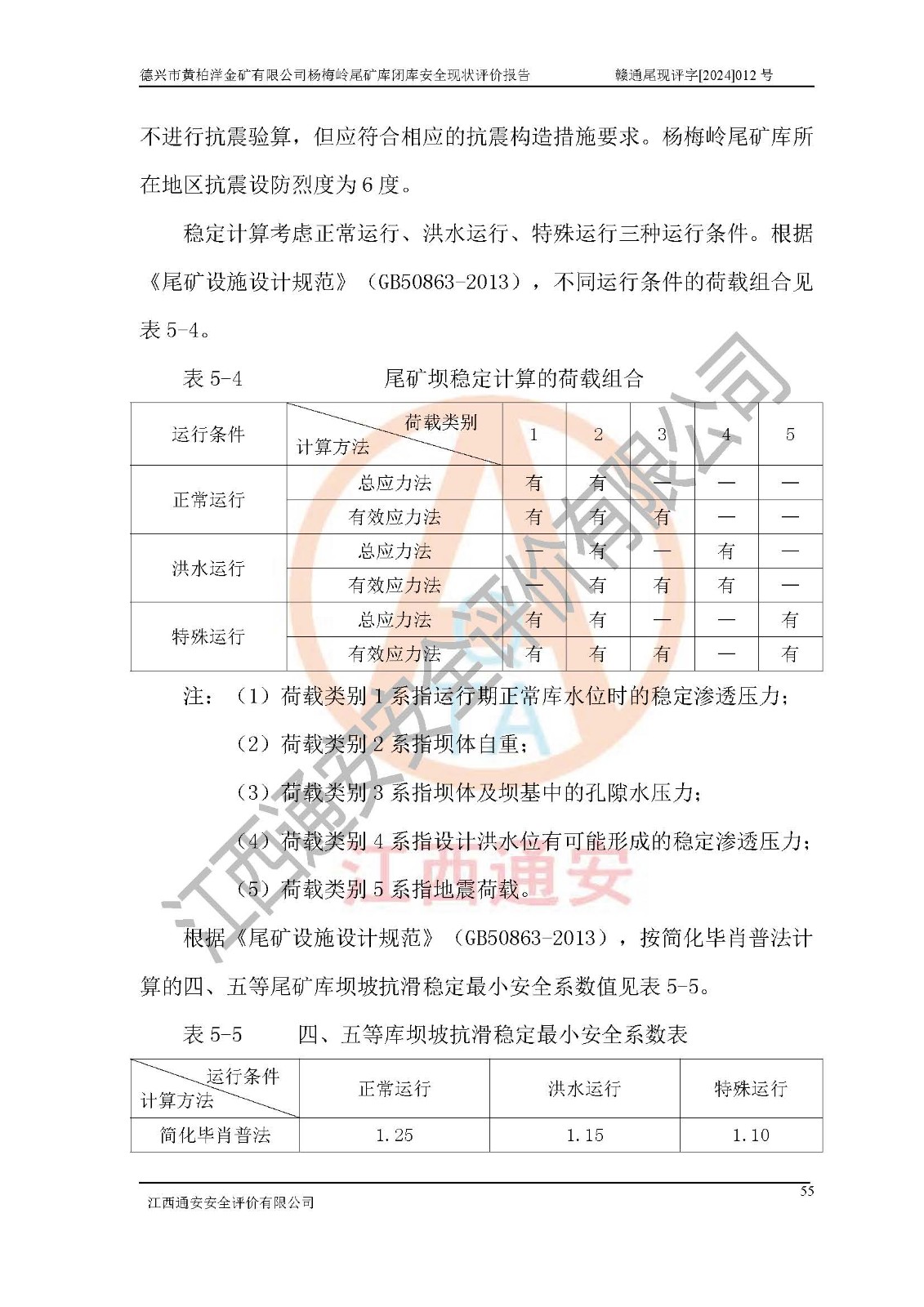 評(píng)價(jià)結(jié)論 | 德興市黃柏洋金礦有限公司楊梅嶺尾礦庫(kù)尾礦壩穩(wěn)定性不滿足規(guī)范要求,壩體***過(guò)設(shè)計(jì)總壩高,尾礦庫(kù)*過(guò)設(shè)計(jì)庫(kù)容貯存尾礦,未設(shè)置人工監(jiān)測(cè)設(shè)施;堆積子壩的外坡比陡于設(shè)計(jì)坡比,未配備尾礦庫(kù)專職安全生產(chǎn)管理人員、特種作業(yè)人員及專業(yè)技術(shù)人員等;根據(jù)**礦山安全監(jiān)察局礦安〔2022〕88號(hào)文《金屬非金屬礦山重大事故隱患判定標(biāo)準(zhǔn)》、**礦山安全監(jiān)察局礦安〔2024〕41號(hào)文《金屬非金屬礦山重大事故隱患判定標(biāo)準(zhǔn)補(bǔ)充情形》,尾礦庫(kù)存在重大事故隱患。德興市黃柏洋金礦有限公司楊梅嶺尾礦庫(kù)應(yīng)盡快完成所有閉庫(kù)程序,閉庫(kù)設(shè)計(jì)應(yīng)按正常運(yùn)行標(biāo)準(zhǔn)進(jìn)行閉庫(kù)整治設(shè)計(jì),**尾礦庫(kù)防洪能力和尾礦壩穩(wěn)定性滿足規(guī)程要求,維持尾礦庫(kù)閉庫(kù)后長(zhǎng)期安全穩(wěn)定。 | |||