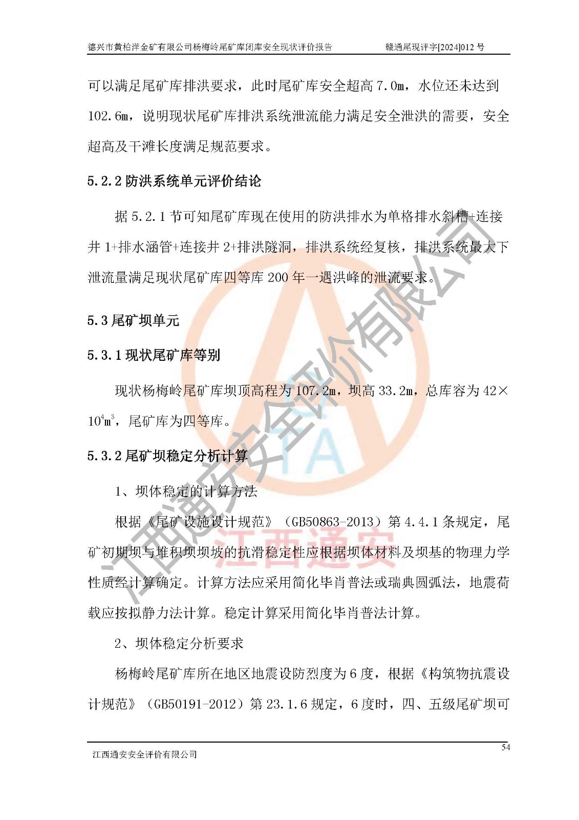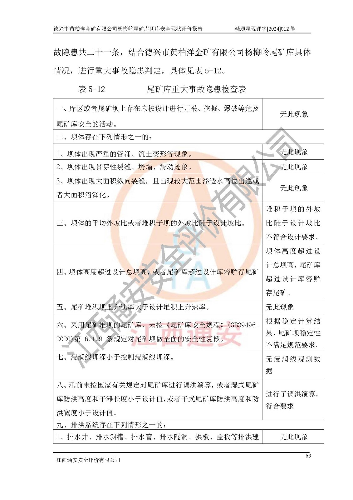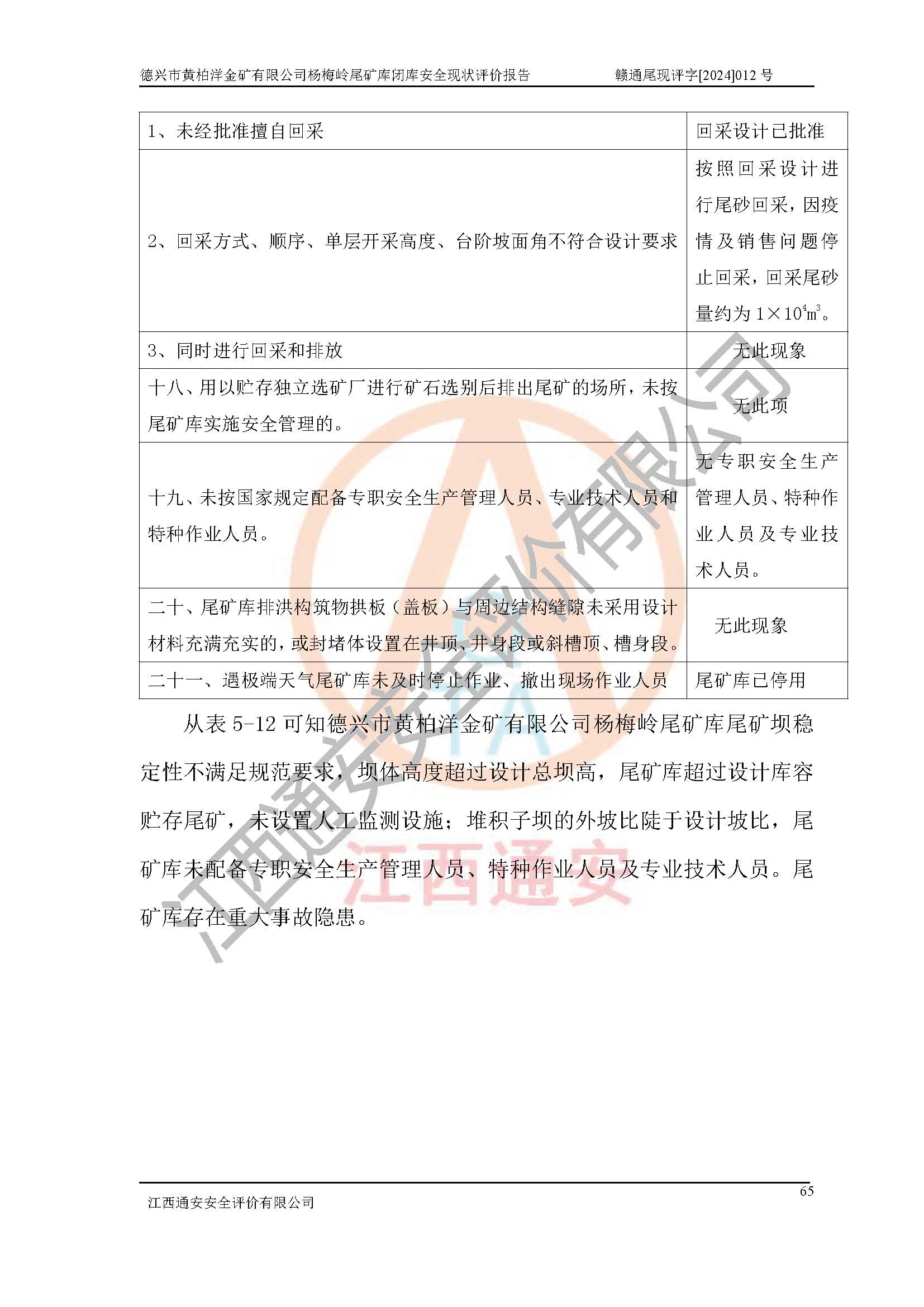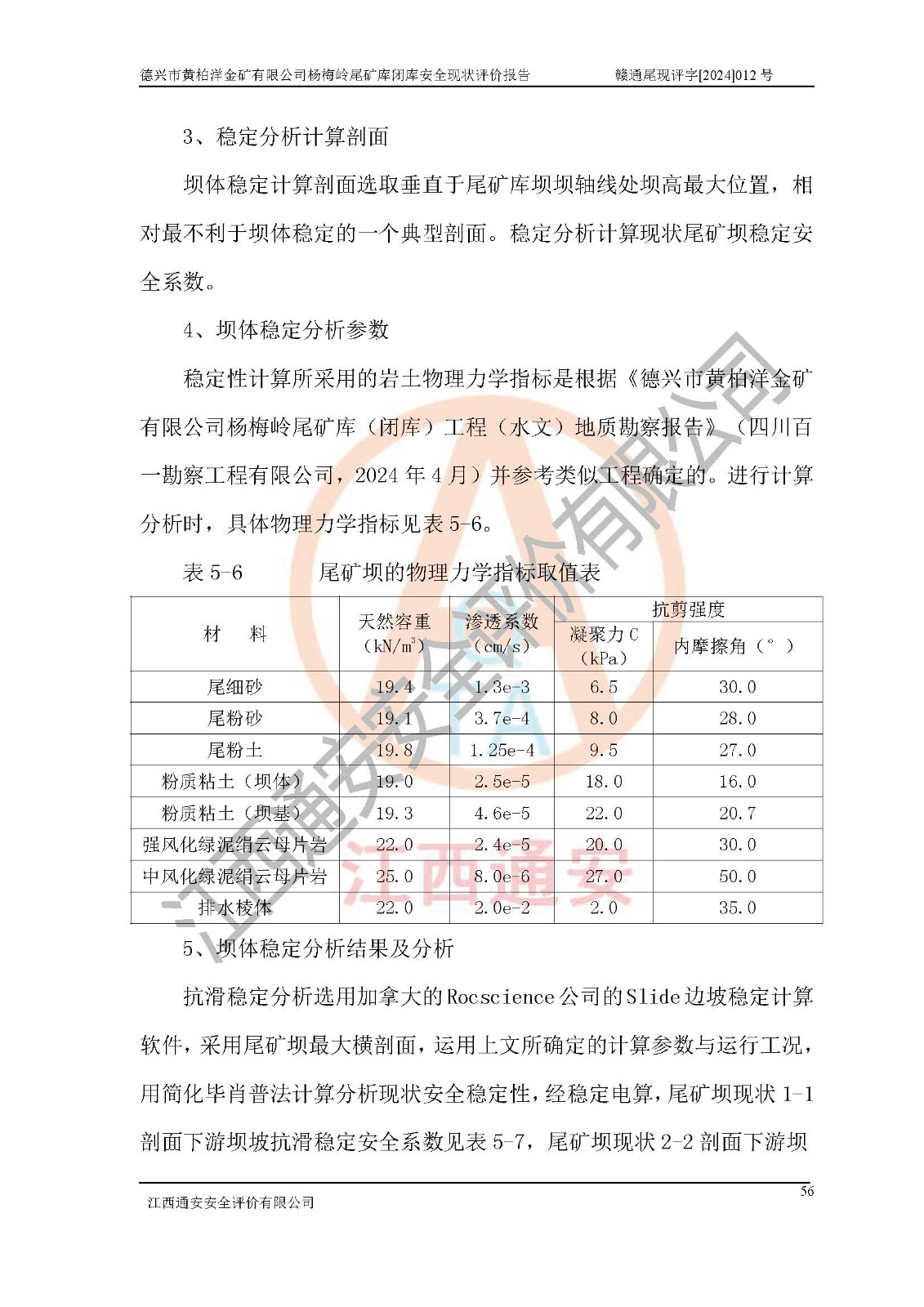 評(píng)價(jià)結(jié)論 | 德興市黃柏洋金礦有限公司楊梅嶺尾礦庫(kù)尾礦壩穩(wěn)定性不滿足規(guī)范要求,壩體***過(guò)設(shè)計(jì)總壩高,尾礦庫(kù)*過(guò)設(shè)計(jì)庫(kù)容貯存尾礦,未設(shè)置人工監(jiān)測(cè)設(shè)施;堆積子壩的外坡比陡于設(shè)計(jì)坡比,未配備尾礦庫(kù)專職安全生產(chǎn)管理人員、特種作業(yè)人員及專業(yè)技術(shù)人員等;根據(jù)**礦山安全監(jiān)察局礦安〔2022〕88號(hào)文《金屬非金屬礦山重大事故隱患判定標(biāo)準(zhǔn)》、**礦山安全監(jiān)察局礦安〔2024〕41號(hào)文《金屬非金屬礦山重大事故隱患判定標(biāo)準(zhǔn)補(bǔ)充情形》,尾礦庫(kù)存在重大事故隱患。德興市黃柏洋金礦有限公司楊梅嶺尾礦庫(kù)應(yīng)盡快完成所有閉庫(kù)程序,閉庫(kù)設(shè)計(jì)應(yīng)按正常運(yùn)行標(biāo)準(zhǔn)進(jìn)行閉庫(kù)整治設(shè)計(jì),**尾礦庫(kù)防洪能力和尾礦壩穩(wěn)定性滿足規(guī)程要求,維持尾礦庫(kù)閉庫(kù)后長(zhǎng)期安全穩(wěn)定。 | |||