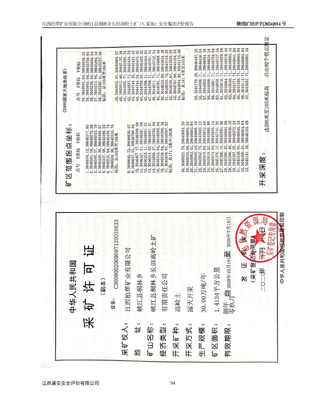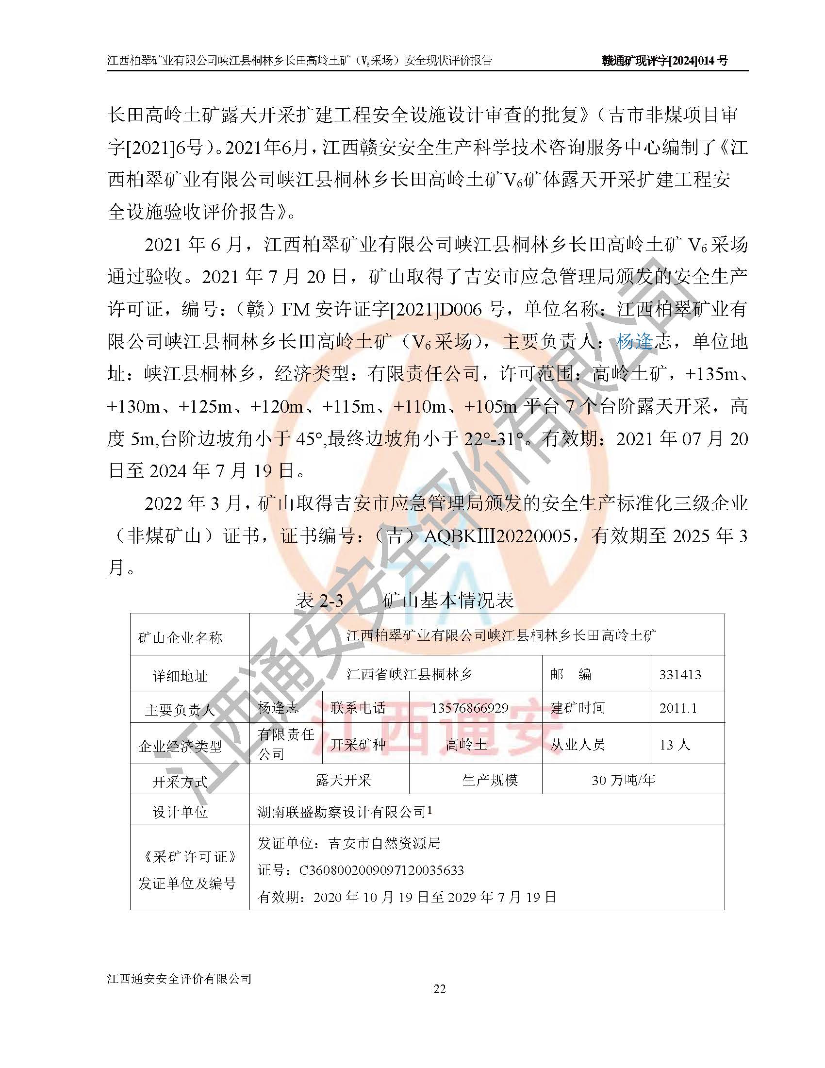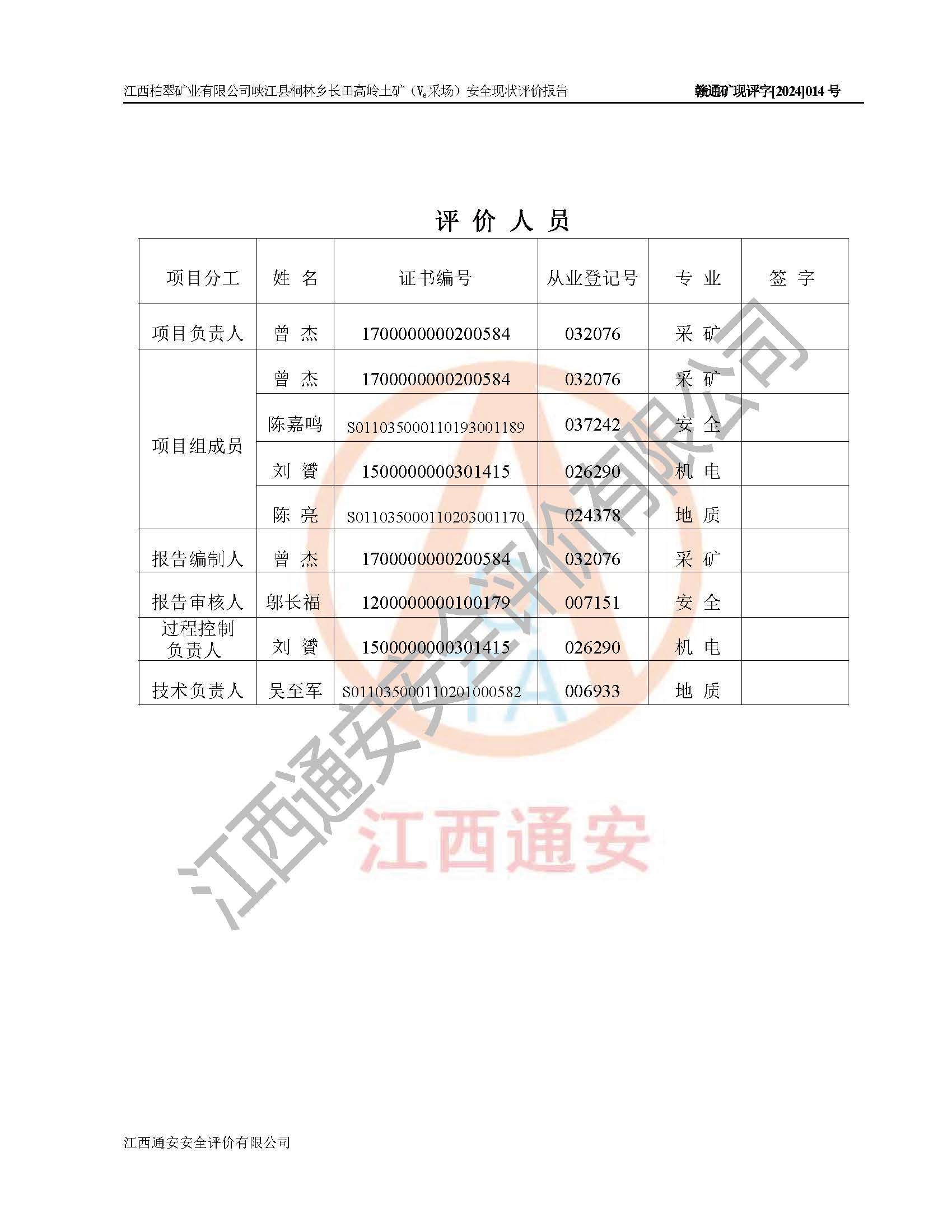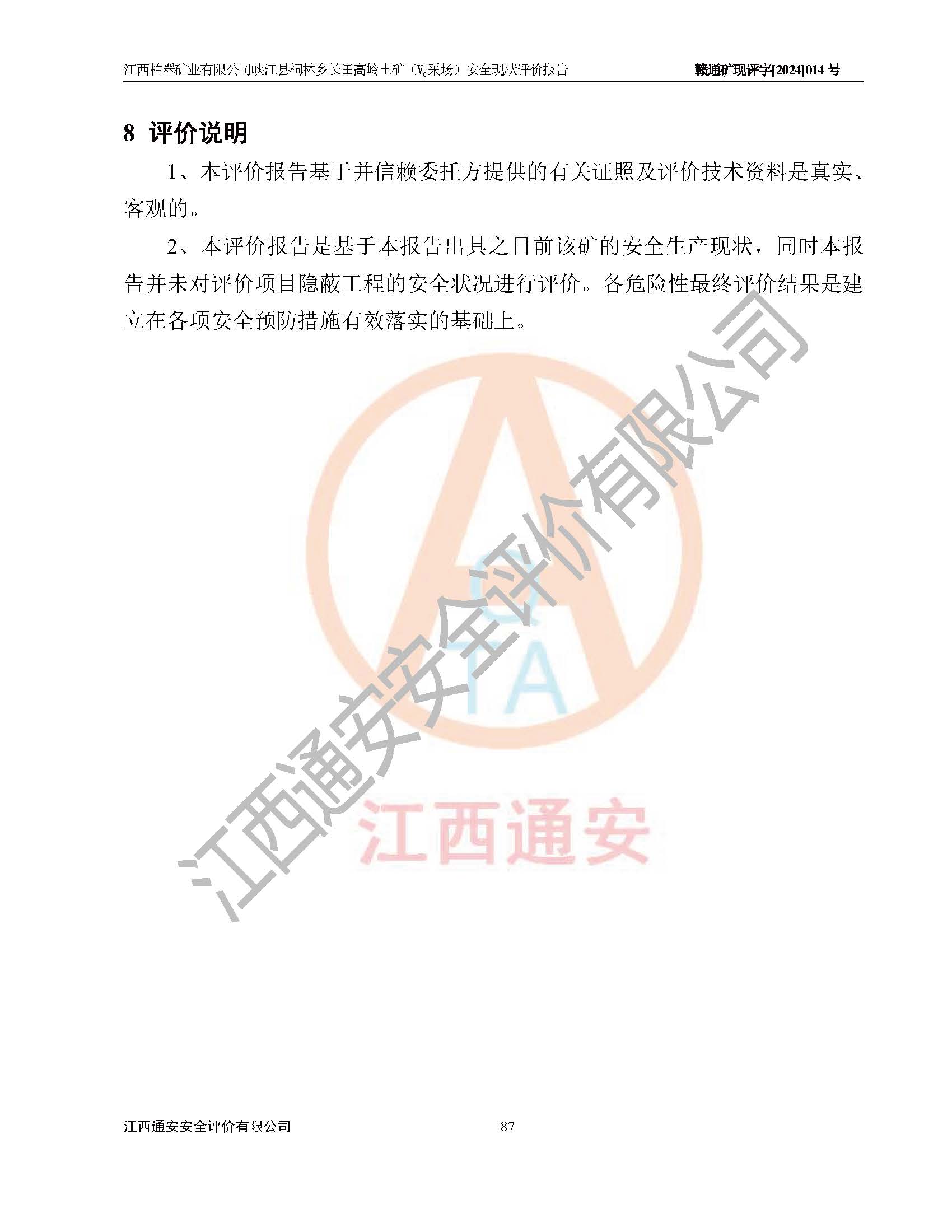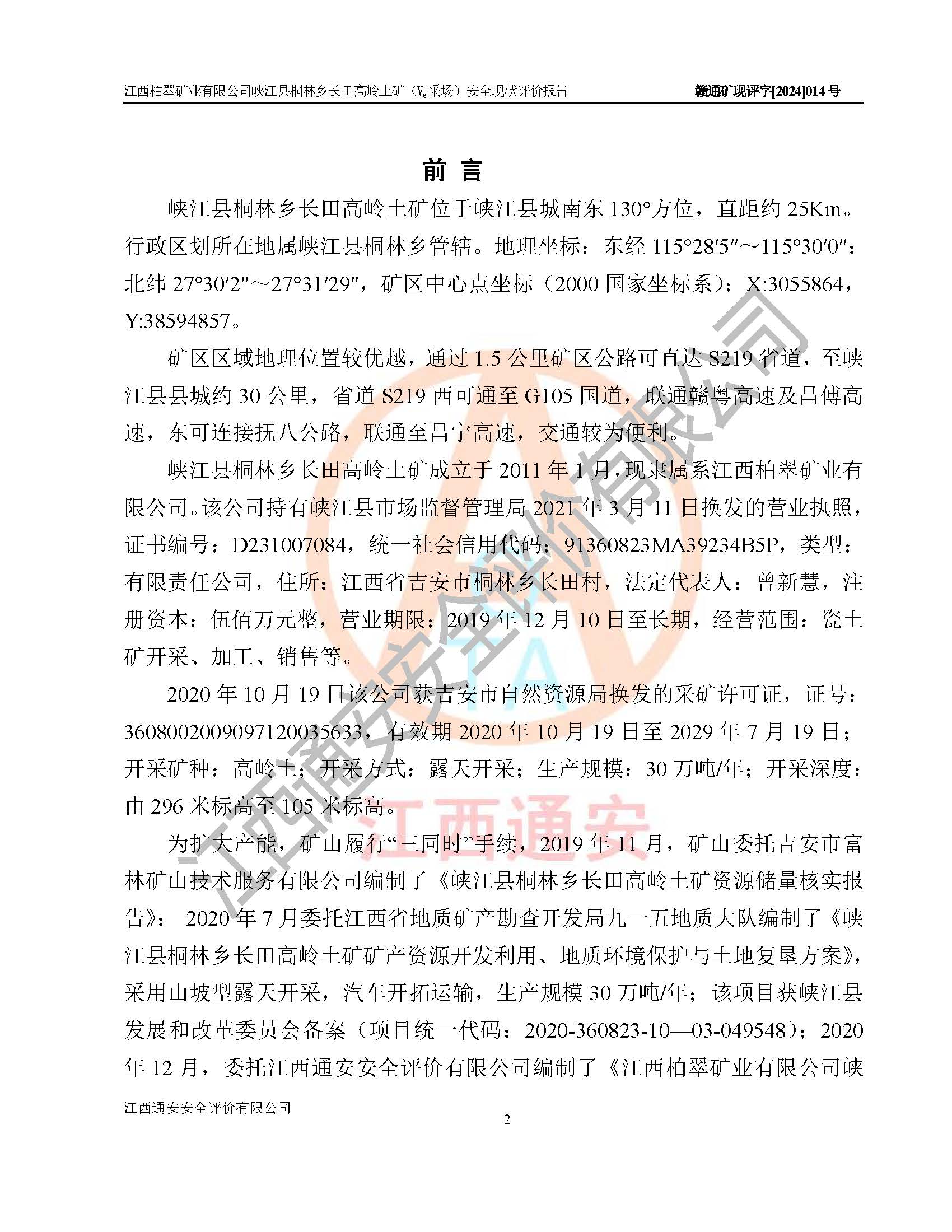 評(píng)價(jià)報(bào)告名稱 | 江西柏翠礦業(yè)有限公司峽江縣桐林鄉(xiāng)長(zhǎng)田高嶺土礦(V6采場(chǎng))安全現(xiàn)狀評(píng)價(jià)報(bào)告 | ||||