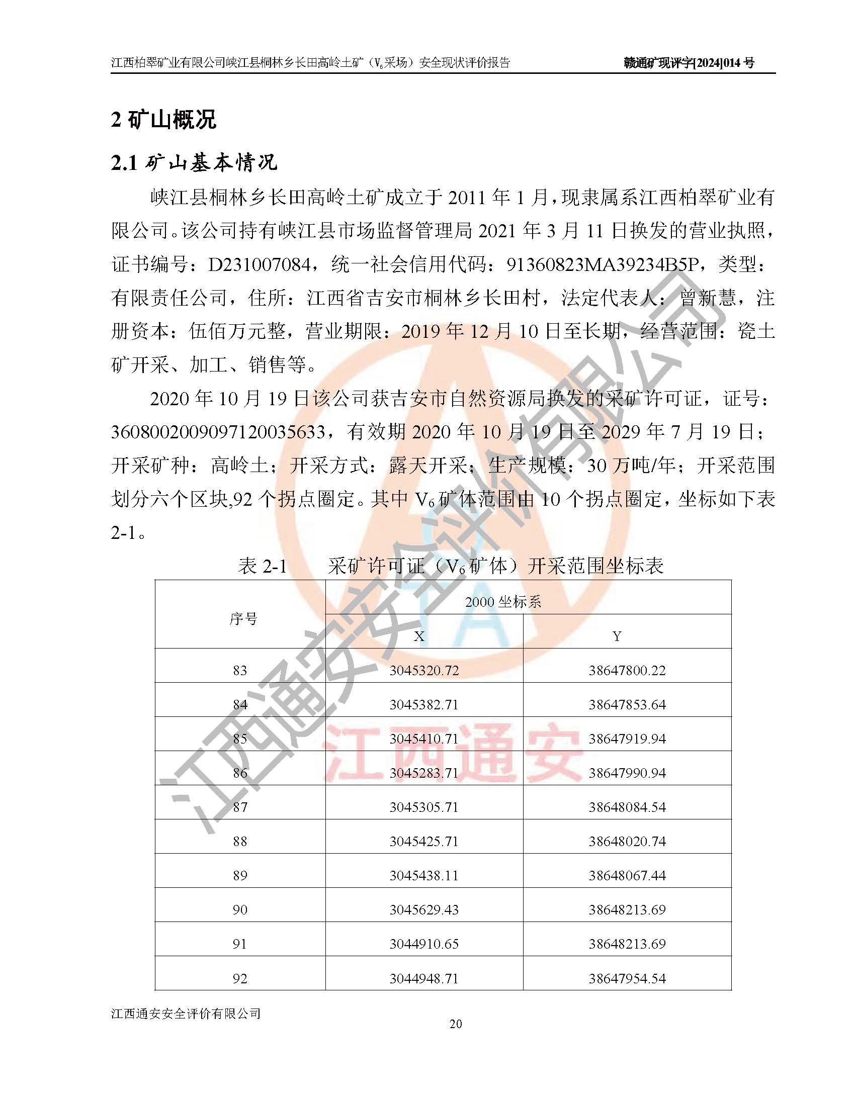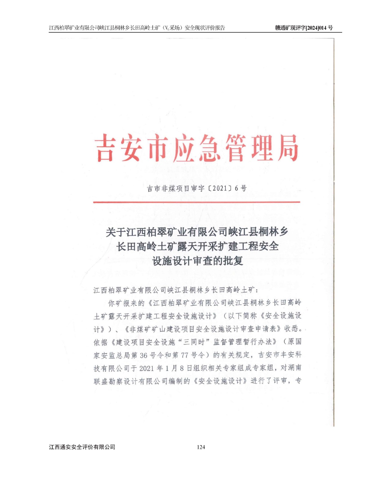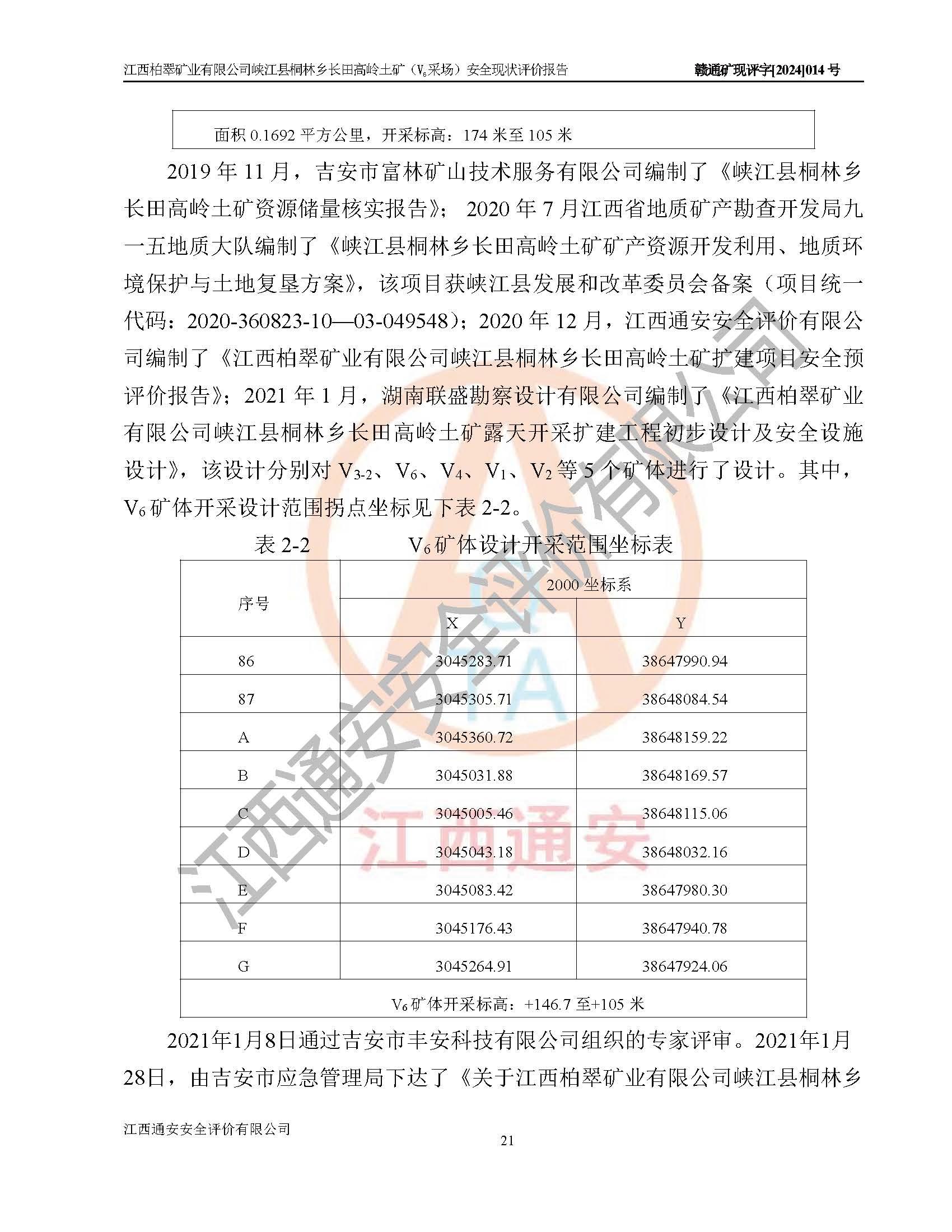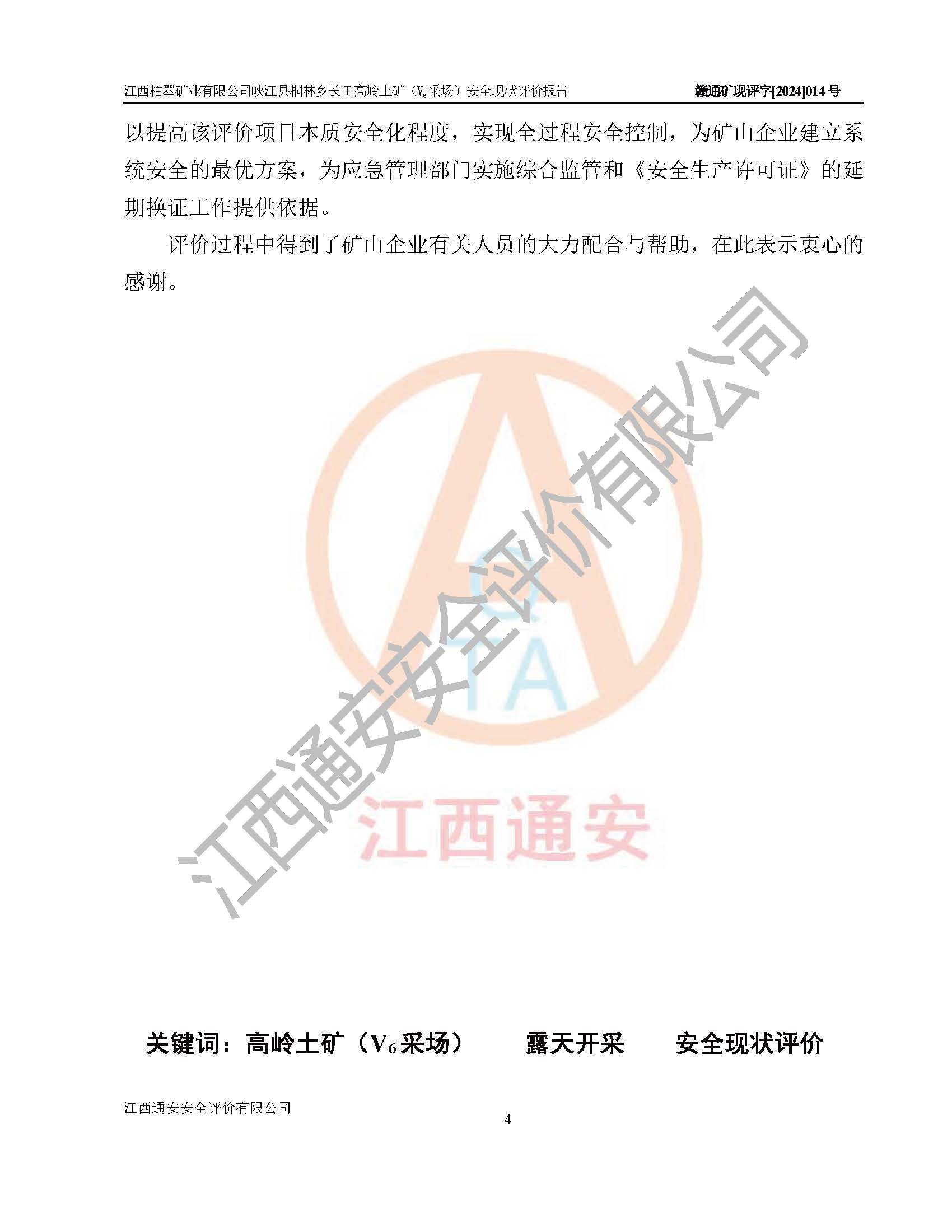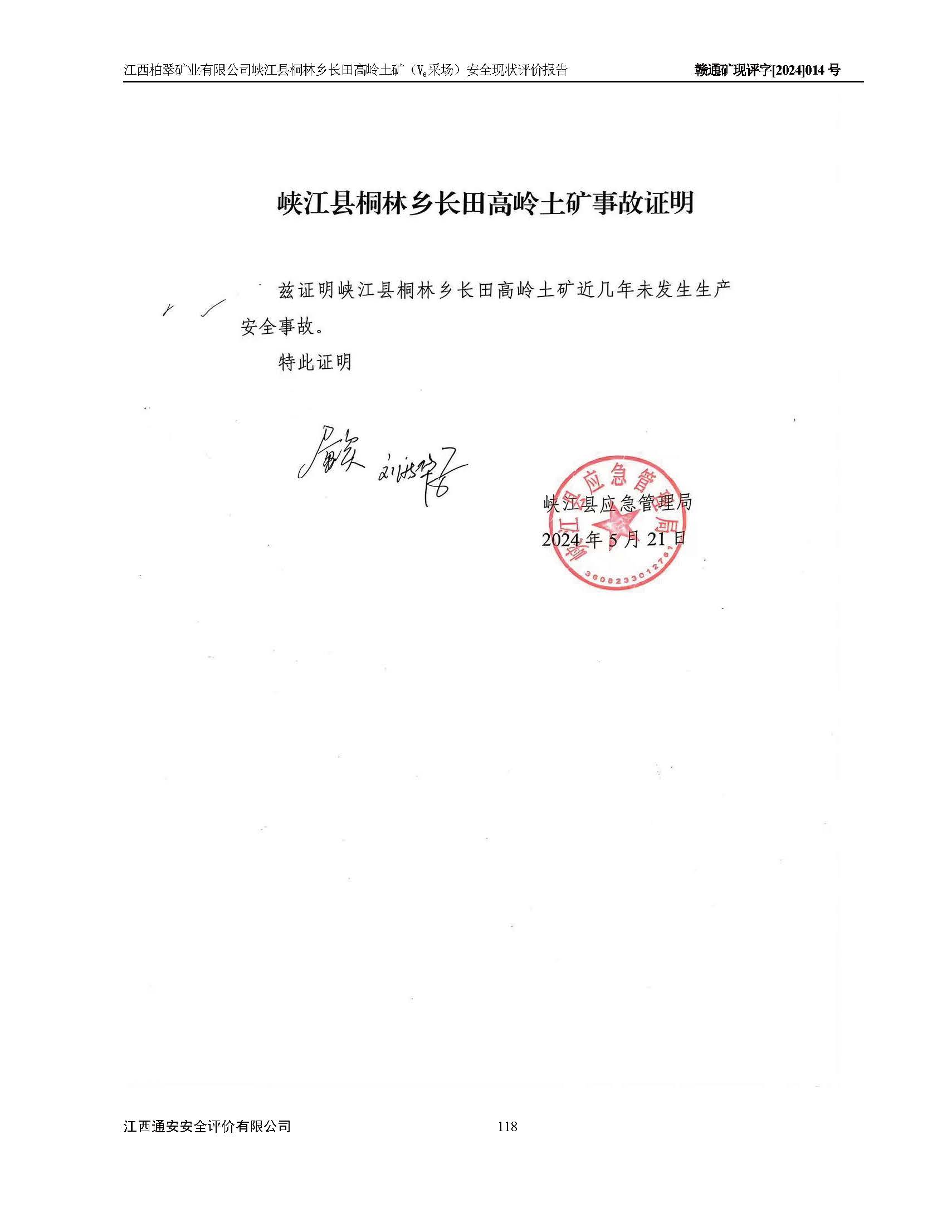 評(píng)價(jià)報(bào)告名稱 | 江西柏翠礦業(yè)有限公司峽江縣桐林鄉(xiāng)長(zhǎng)田高嶺土礦(V6采場(chǎng))安全現(xiàn)狀評(píng)價(jià)報(bào)告 | ||||