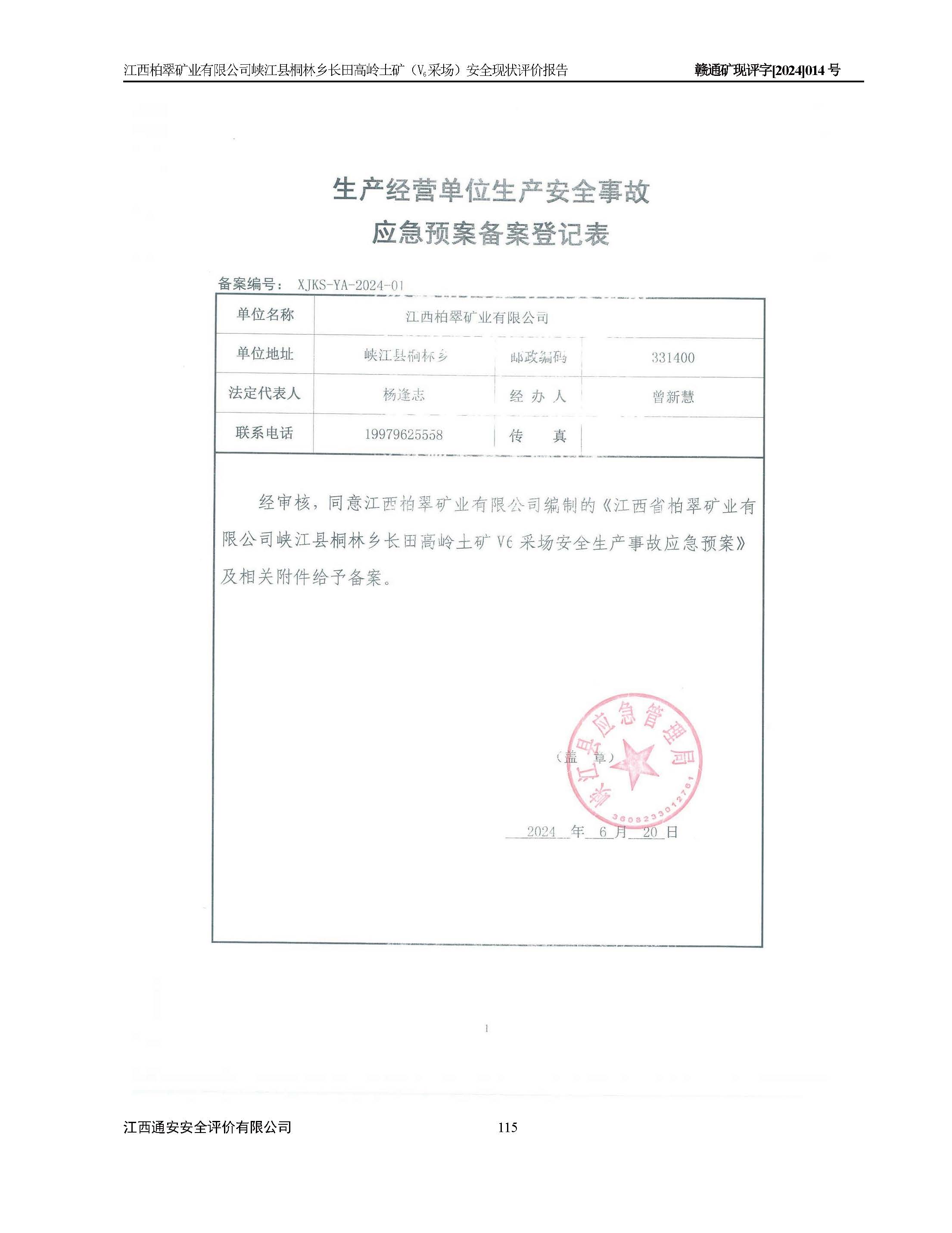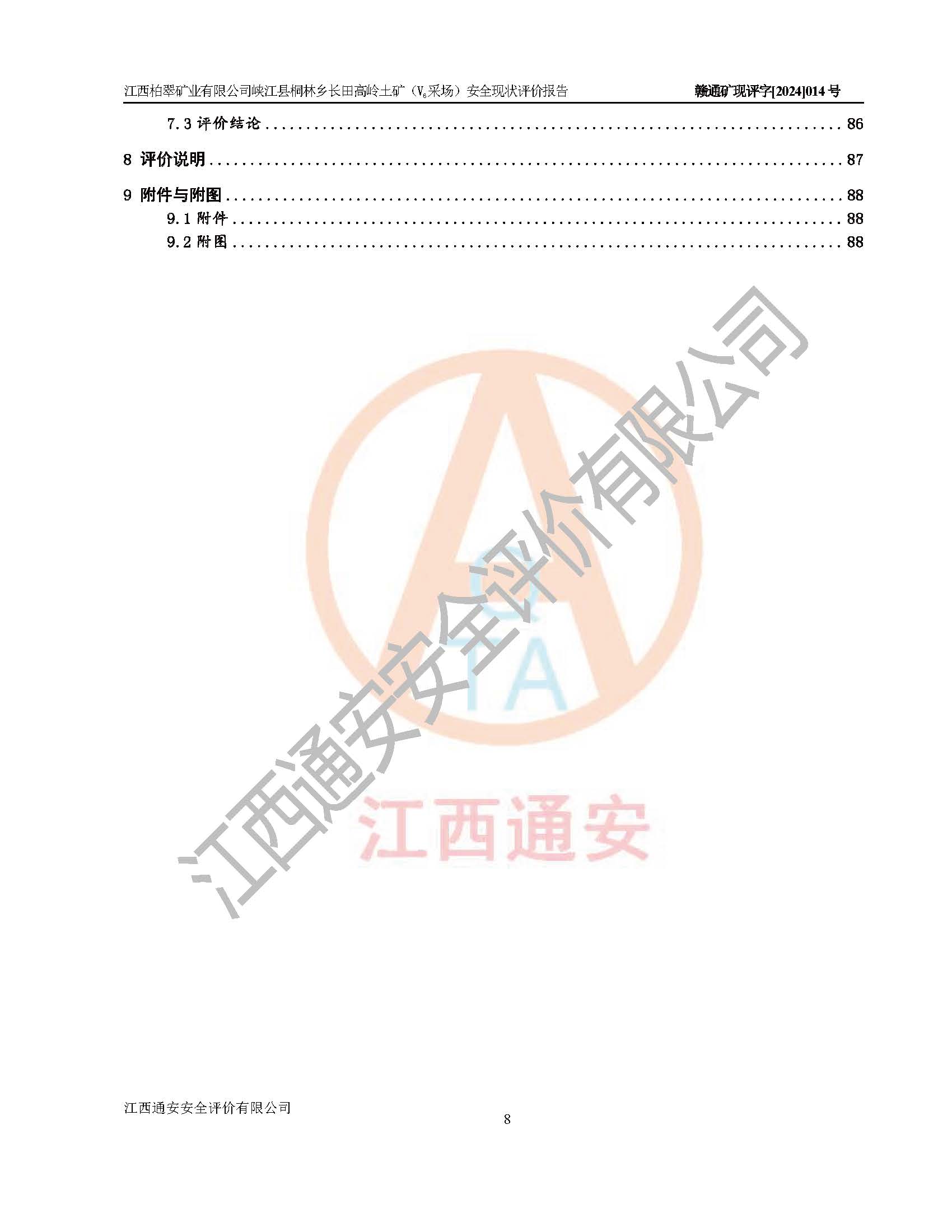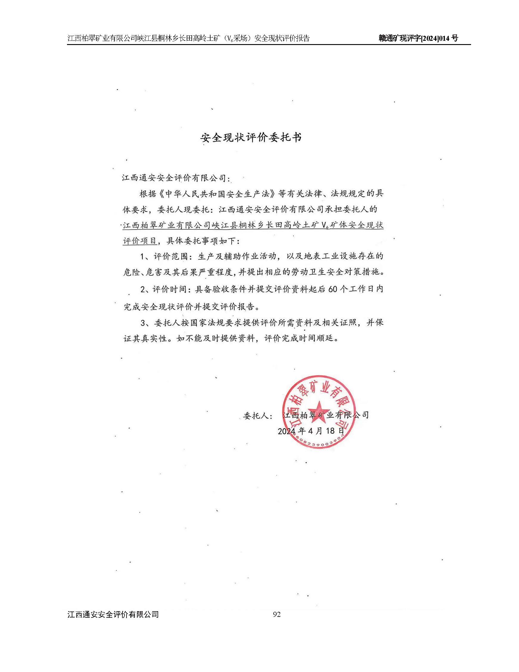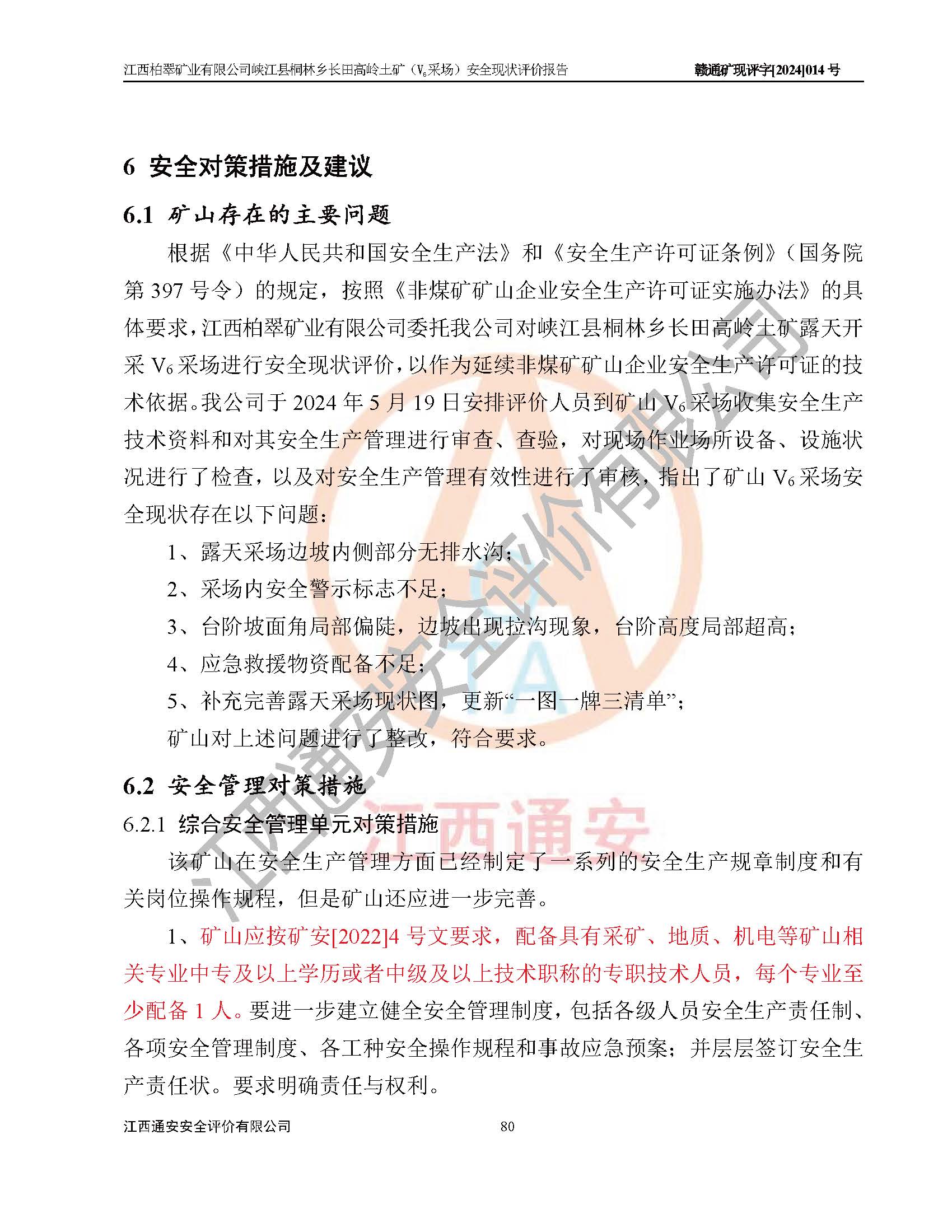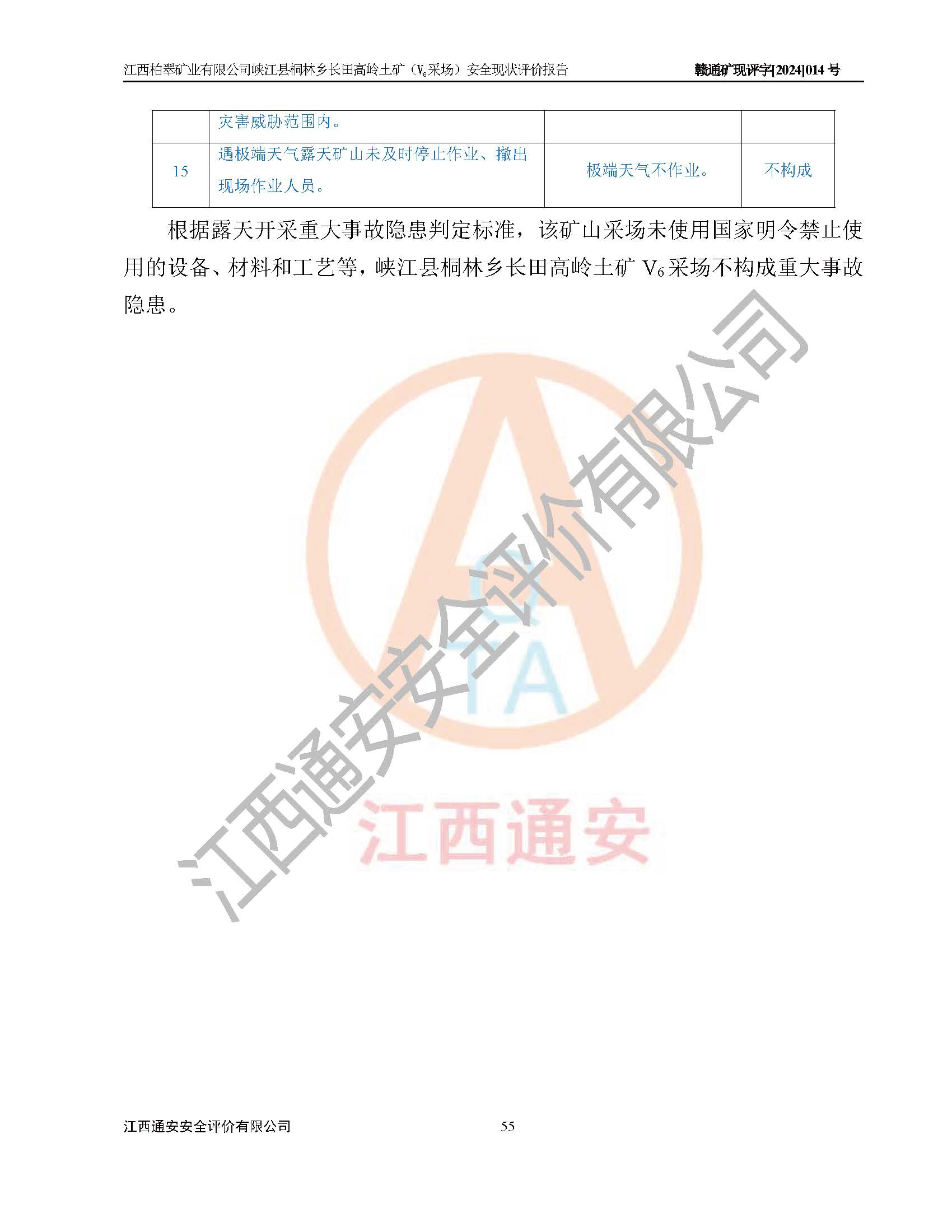 評(píng)價(jià)報(bào)告名稱 | 江西柏翠礦業(yè)有限公司峽江縣桐林鄉(xiāng)長(zhǎng)田高嶺土礦(V6采場(chǎng))安全現(xiàn)狀評(píng)價(jià)報(bào)告 | ||||