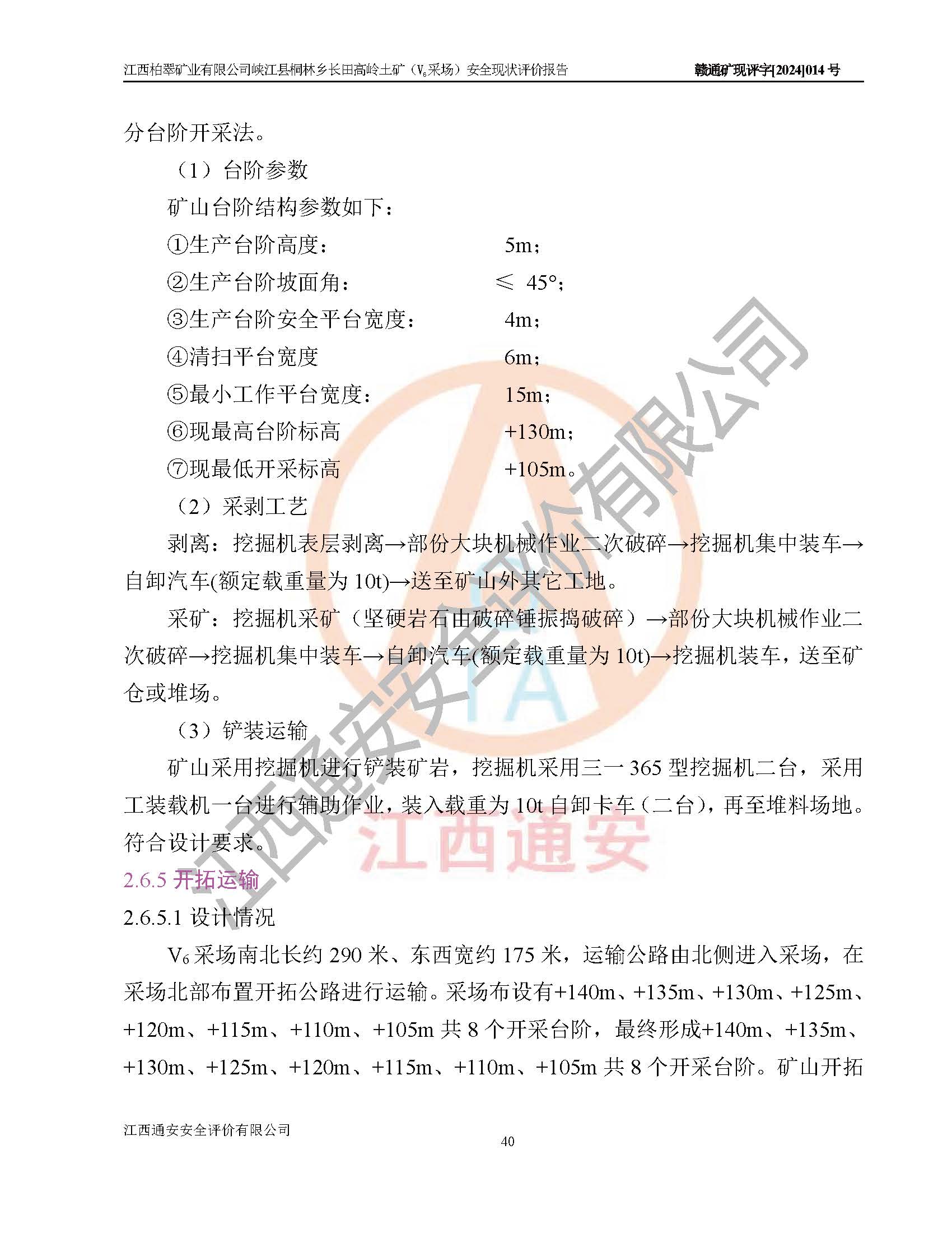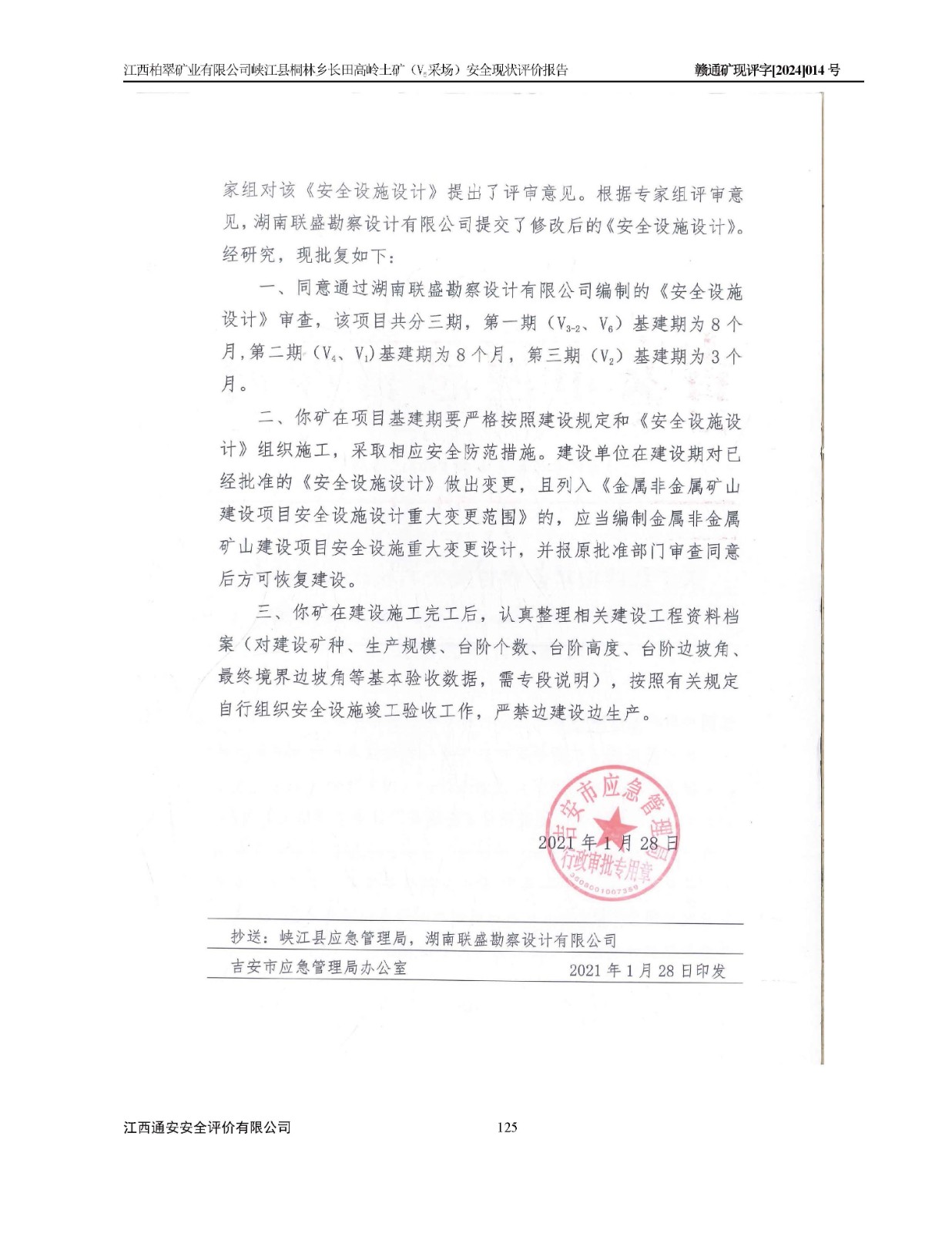 項(xiàng)目簡(jiǎn)介 | 峽江縣桐林鄉(xiāng)長(zhǎng)田高嶺土礦位于峽江縣城南東130°方位,直距約25Km。行政區(qū)劃所在地屬峽江縣桐林鄉(xiāng)管轄。地理坐標(biāo):東經(jīng)115°28′5″~115°30′0″;北緯27°30′2″~27°31′29″,礦區(qū)中心點(diǎn)坐標(biāo)(2000**坐標(biāo)系):X:3055864,Y:38594857。 礦區(qū)區(qū)域地理位置較優(yōu)越,通過(guò)1.5**礦區(qū)公路可直達(dá)S219省道,至峽江縣縣城約30**,省道S219西可通至G105國(guó)道,聯(lián)通贛粵高速及昌傅高速,東可連接撫八公路,聯(lián)通至昌寧高速,交通較為便利。 峽江縣桐林鄉(xiāng)長(zhǎng)田高嶺土礦成立于2011年1月,現(xiàn)隸屬系江西柏翠礦業(yè)有限公司。該公司持有峽江縣市場(chǎng)監(jiān)督管理局2021年3月11日換發(fā)的營(yíng)業(yè)執(zhí)照,證書(shū)編號(hào):D231007084,統(tǒng)一社會(huì)信用代碼:91360823MA39234B5P,類型:有限責(zé)任公司,住所:江西省吉安市桐林鄉(xiāng)長(zhǎng)田村,法定**人:曾新慧,注冊(cè)資本:伍佰萬(wàn)元整,營(yíng)業(yè)期限:2019年12月10日至長(zhǎng)期,經(jīng)營(yíng)范圍:瓷土礦開(kāi)采、加工、銷售等。 2020年10月19日該公司獲吉安市自然資源局換發(fā)的采礦許可證,證號(hào):3608002009097120035633,**期2020年10月19日至2029年7月19日;開(kāi)采礦種:高嶺土;開(kāi)采方式:露天開(kāi)采;生產(chǎn)規(guī)模:30萬(wàn)噸/年;開(kāi)采深度:由296米標(biāo)高至105米標(biāo)高。 為擴(kuò)大產(chǎn)能,礦山履行“三同時(shí)”手續(xù),2019年11月,礦山委托吉安市富林礦山技術(shù)服務(wù)有限公司編制了《峽江縣桐林鄉(xiāng)長(zhǎng)田高嶺土礦資源儲(chǔ)量核實(shí)報(bào)告》; 2020年7月委托江西省地質(zhì)礦產(chǎn)勘查開(kāi)發(fā)局九一五地質(zhì)大隊(duì)編制了《峽江縣桐林鄉(xiāng)長(zhǎng)田高嶺土礦礦產(chǎn)資源開(kāi)發(fā)利用、地質(zhì)環(huán)境保護(hù)與土地復(fù)墾方案》,采用山坡型露天開(kāi)采,汽車開(kāi)拓運(yùn)輸,生產(chǎn)規(guī)模30萬(wàn)噸/年;該項(xiàng)目獲峽江縣發(fā)展和改革委員會(huì)備案(項(xiàng)目統(tǒng)一代碼:2020-360823-10—03-049548);2020年12月,委托江西通安安全評(píng)價(jià)有限公司編制了《江西柏翠礦業(yè)有限公司峽江縣桐林鄉(xiāng)長(zhǎng)田高嶺土礦擴(kuò)建項(xiàng)目安全預(yù)評(píng)價(jià)報(bào)告》;2021年1月,礦山委托湖南聯(lián)盛勘察設(shè)計(jì)有限公司編制了《江西柏翠礦業(yè)有限公司峽江縣桐林鄉(xiāng)長(zhǎng)田高嶺土礦露天開(kāi)采擴(kuò)建工程初步設(shè)計(jì)及安全設(shè)施設(shè)計(jì)》,該設(shè)計(jì)分別對(duì)V3-2、V6、V4、V1、V2等5個(gè)礦體進(jìn)行了設(shè)計(jì)。并于2021年1月8日通過(guò)吉安市豐安科技有限公司組織的專家評(píng)審。2021年1月28日,由吉安市應(yīng)急管理局下達(dá)了《關(guān)于江西柏翠礦業(yè)有限公司峽江縣桐林鄉(xiāng)長(zhǎng)田高嶺土礦露天開(kāi)采擴(kuò)建工程安全設(shè)施設(shè)計(jì)審查的批復(fù)》(吉市非煤項(xiàng)目審字[2021]6號(hào))。 2021年6月,江西柏翠礦業(yè)有限公司峽江縣桐林鄉(xiāng)長(zhǎng)田高嶺土礦V6采場(chǎng)通過(guò)驗(yàn)收。2021年7月20日,礦山取得了吉安市應(yīng)急管理局頒發(fā)的安全生產(chǎn)許可證,編號(hào):(贛)FM安許證字[2021]D006號(hào),單位名稱:江西柏翠礦業(yè)有限公司峽江縣桐林鄉(xiāng)長(zhǎng)田高嶺土礦(V6采場(chǎng)),主要負(fù)責(zé)人:楊逢志,單位地址:峽江縣桐林鄉(xiāng),經(jīng)濟(jì)類型:有限責(zé)任公司,許可范圍:高嶺土礦,+135m、+130m、+125m、+120m、+115m、+110m、+105m平臺(tái)7個(gè)臺(tái)階露天開(kāi)采,**5m,臺(tái)階邊坡角小于45°,*終邊坡角小于22°-31°。**期:2021年07月20日至2024年7月19日。 現(xiàn)V6采場(chǎng)《安全生產(chǎn)許可證》即將到期,根據(jù)《安全生產(chǎn)法》、《礦山安全法》、《安全生產(chǎn)許可證條例》、《非煤礦礦山企業(yè)安全生產(chǎn)許可證實(shí)施辦法》和原江西省安全生產(chǎn)監(jiān)督管理局《關(guān)于做好非煤礦礦山企業(yè)安全生產(chǎn)許可證延期換證工作的通知》的要求,江西柏翠礦業(yè)有限公司委托江西通安安全評(píng)價(jià)有限公司對(duì)峽江縣桐林鄉(xiāng)長(zhǎng)田高嶺土礦V6采場(chǎng)進(jìn)行安全現(xiàn)狀評(píng)價(jià)。 評(píng)價(jià)范圍:包括江西柏翠礦業(yè)有限公司峽江縣桐林鄉(xiāng)長(zhǎng)田高嶺土礦采礦許可證圈定礦區(qū)范圍內(nèi)的(V6采場(chǎng))露天開(kāi)采系統(tǒng)及地表工業(yè)場(chǎng)地和設(shè)備、設(shè)施。 本評(píng)價(jià)報(bào)告不包括外部運(yùn)輸、環(huán)境保護(hù)、職業(yè)衛(wèi)生、以及危險(xiǎn)化學(xué)品使用場(chǎng)所。 | ||||