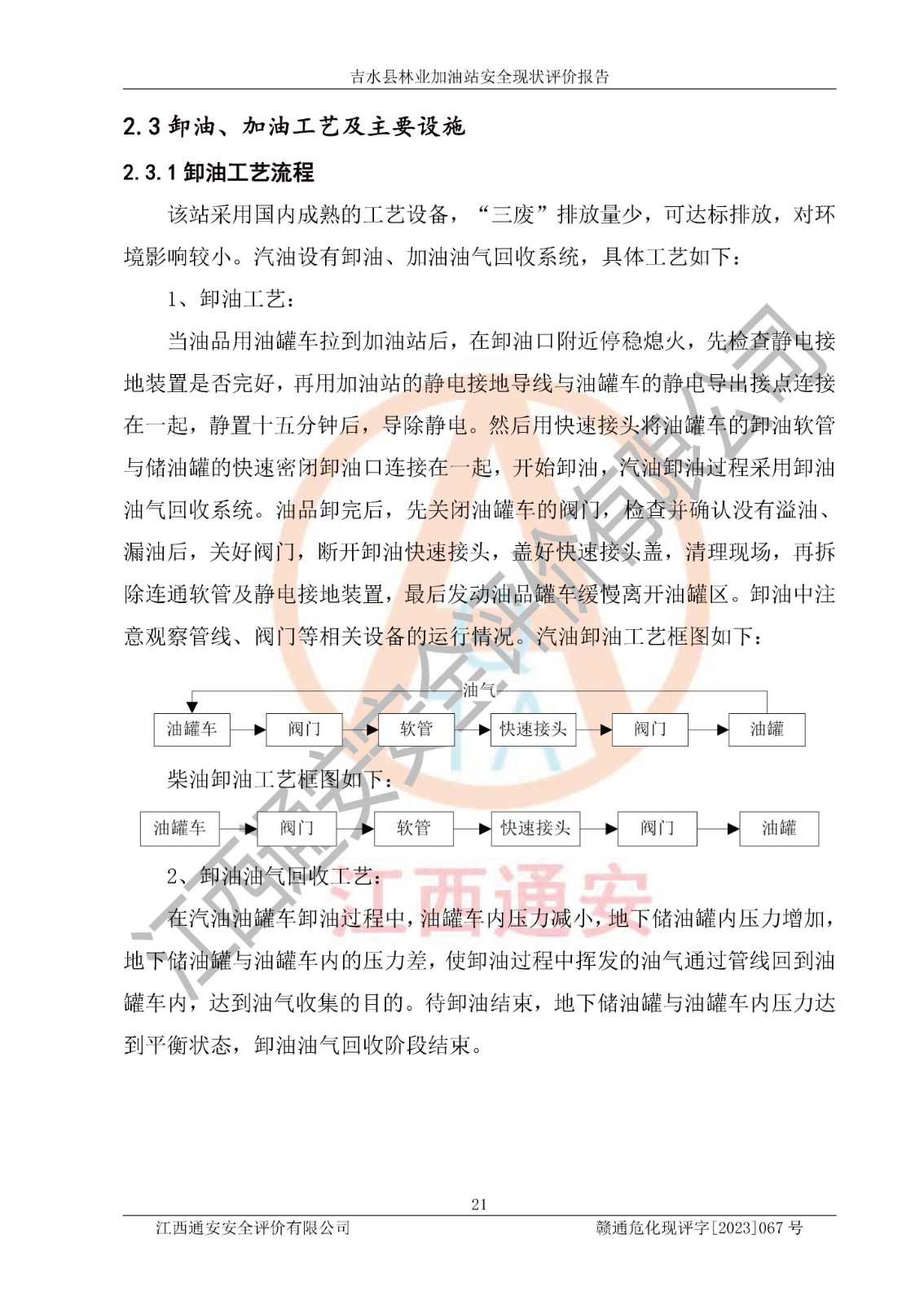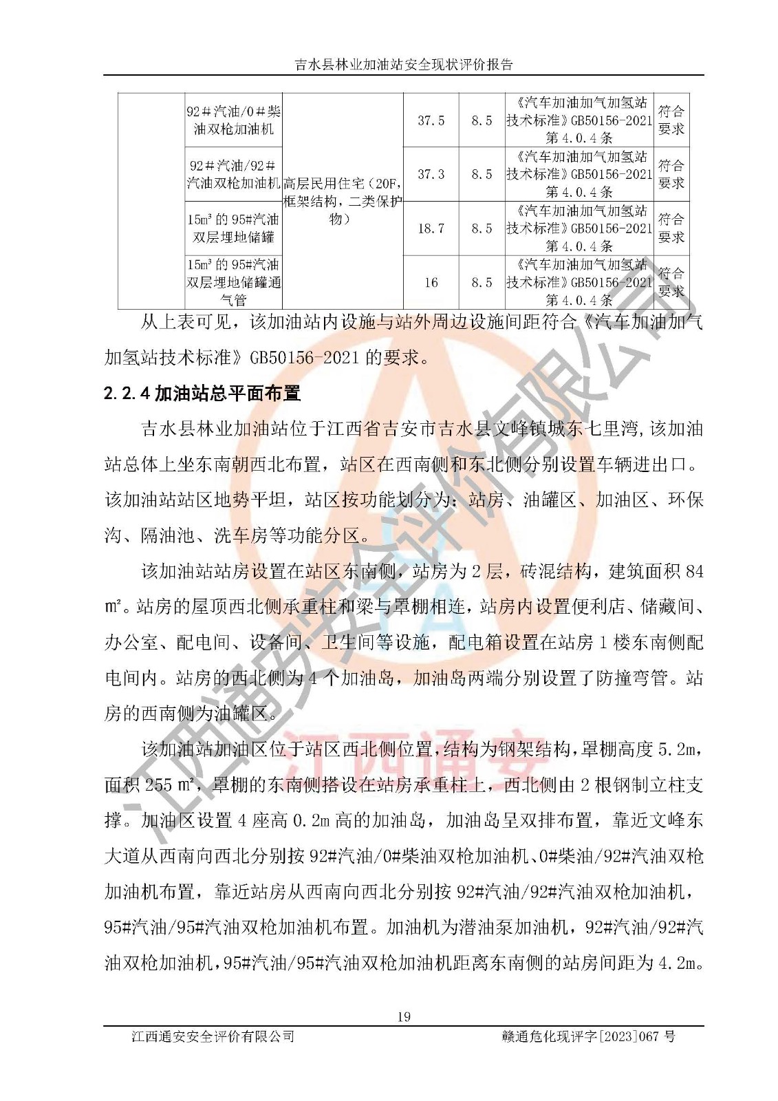項目簡介 | 吉水縣林業(yè)加油站是一家從事汽油、柴油零售經營的企業(yè)。該加油站于2005年4月30日經吉水縣市場監(jiān)督管理局核準注冊成立,營業(yè)場所位于江西省吉安市吉水縣文峰鎮(zhèn)城東七里灣。該加油站屬于普通合伙企業(yè),執(zhí)行事務合伙人宋兵明,營業(yè)執(zhí)照統一社會信用代碼為:91360822X129395763。營業(yè)執(zhí)照核準經營范圍:成品油(汽油、柴油、潤滑油)零售 (經營范圍涉及許可證的憑**許可證經營*。 吉水縣林業(yè)加油站占地面積1.5畝,加油站中設有1臺92#汽油/0#柴油雙槍加油機、1臺0#柴油/92#汽油雙槍加油機、1臺92#汽油/92#汽油雙槍加油機、1臺95#汽油/95#汽油雙槍加油機;1臺15m395#汽油雙層埋地儲罐、1臺20m30#柴油雙層埋地儲罐、1臺30m392#汽油雙層埋地儲罐,油品*大儲存能力為55m3(柴油罐容積折半計入油罐總容積),屬三級加油站,汽油卸油、加油設置了油氣回收系統。 吉水縣林業(yè)加油站于2021年4月15日經吉安市應急管理局核準,換發(fā)了新的《危險化學品經營許可證》,證書編號:贛吉?;涀諿2021]360800000043號,許可經營范圍:成品油。**期2021年4月21日至2024年4月20日。 吉水縣林業(yè)加油站2020年12月15日經吉安市商務局核準,換取了新的《成品油零售經營批準證書》,證書編號:油零售證書第吉0064號,批準從事成品油(汽油、柴油)零售業(yè)務。證書**期至2020年12月15日至2025年12月14日。 | ||||
