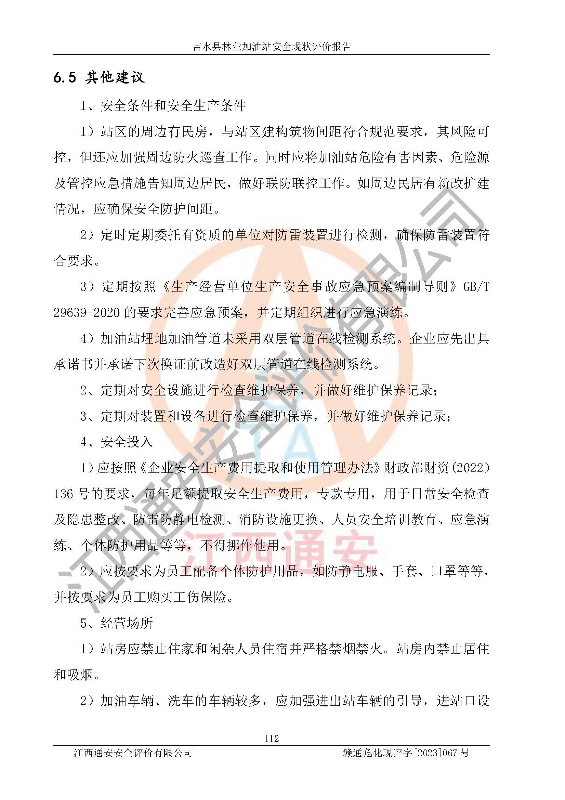 其它 | 在對該項目危險、有害因素辨識分析的基礎上,運用安全檢查表、預作業(yè)條件危險性分析法、危險度評價、重大事故后果分析結果等評價方法對該項目進行了分析評價,評價結果如下: 1、該項目位于江西省吉安市吉水縣文峰鎮(zhèn)城東七里灣,符合當地規(guī)劃,與周邊環(huán)境的距離符合有關標準、規(guī)范的要求。 2、總圖布置分區(qū)明確,布局合理,各建構筑物的防火間距滿足規(guī)范要求。 3、該項目無**明令淘汰的工藝,設備、設施與工藝條件、內部介質相適應,特種設備及設施較齊全,按規(guī)定設置防雷、防靜電接地,爆炸危險環(huán)境加油機按要求采用防爆型,符合相關標準規(guī)范要求。 5、企業(yè)設置了安全生產管理機構,配備了專職安全生產管理人員,建立了安全生產責任制和安全生產管理制度,編制了崗位操作規(guī)程,編制了生產安全事故應急預案,人員經過相應的培訓,企業(yè)的安全生產管理正常。 6、作業(yè)條件危險性評價結果:在選定的評價單元中,作業(yè)危險程度均為“一般危險,需要注意”,作業(yè)條件相對安全。 7、危險度評價結果:汽油儲罐的危險程度為中度危險。其設置了高液位遠傳報警系統,滲漏檢測報警系統,可以滿足安全生產條件要求。 評價結論: 吉水縣林業(yè)加油站工藝設備和安全設施運行正常,安全管理機制運行正常,安全設施、措施達到設計要求和預期結果,可以滿足建設項目安全生產的要求,安全生產管理**,項目具備危險化學品經營單位安全經營條件的要求。 | ||||