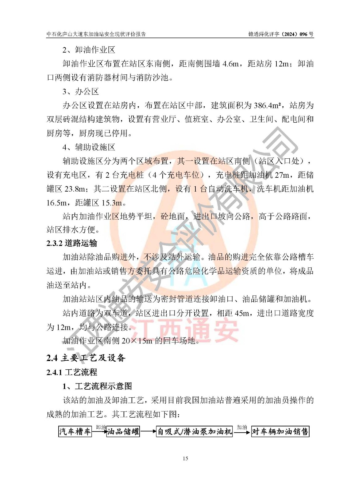 項目簡介 | 中國石化銷售股份有限公司江西九江濂溪石油分公司廬山大道東加油站是一家專門從事成品油零售經(jīng)營的有限公司分公司(外商投資企業(yè)分公司),經(jīng)營場所位于江西省九江市濂溪區(qū)廬山大道東側(cè),侯白壟路以南?,F(xiàn)有從業(yè)人員4名,其中安全管理人員1人,加油站負責(zé)人熊瑋。 該加油站占地面積4834.7m2,站區(qū)內(nèi)設(shè)置有3臺四槍稅控燃油加油機及配套的工藝管線,設(shè)有SF雙層儲罐4臺,其中50m3的0#柴油儲罐1臺、50m3的92#汽油儲罐1臺、30m3的92#汽油儲罐1臺和30m3的95#汽油儲罐1臺,油品儲罐總?cè)莘e為160m3(折算成汽油為135m3),按現(xiàn)行《汽車加油加氣加氫站技術(shù)標準》對加油站的等級劃分原則,屬二級加油站。 該站由九江市行政審批局換發(fā)《危險化學(xué)品經(jīng)營許可證》(證號:贛九行審經(jīng)(甲)字[2021]000065號),**期限2021年09月30日至2024年09月29日。 | |||