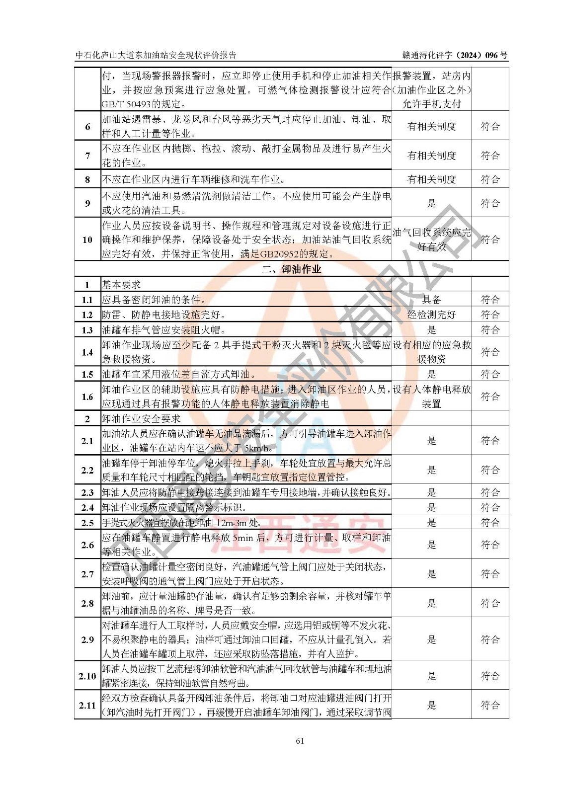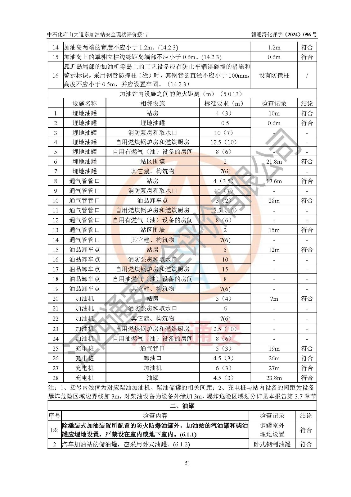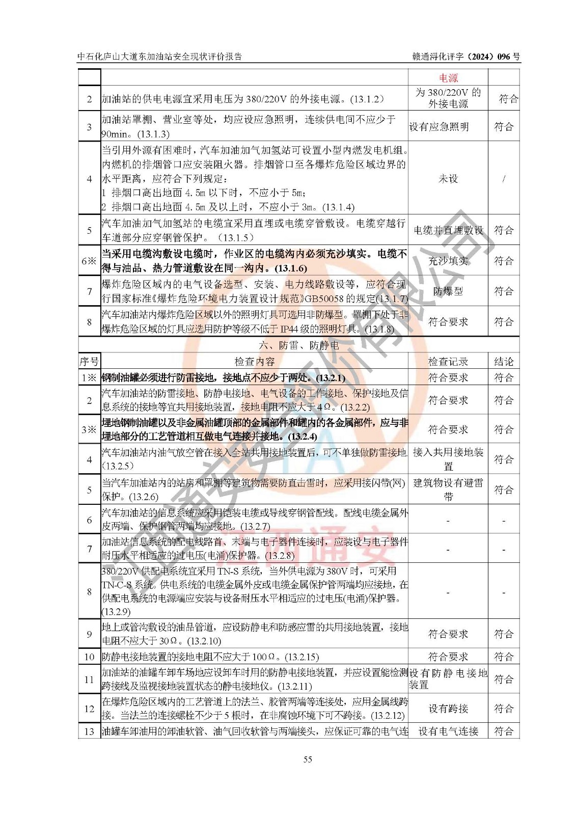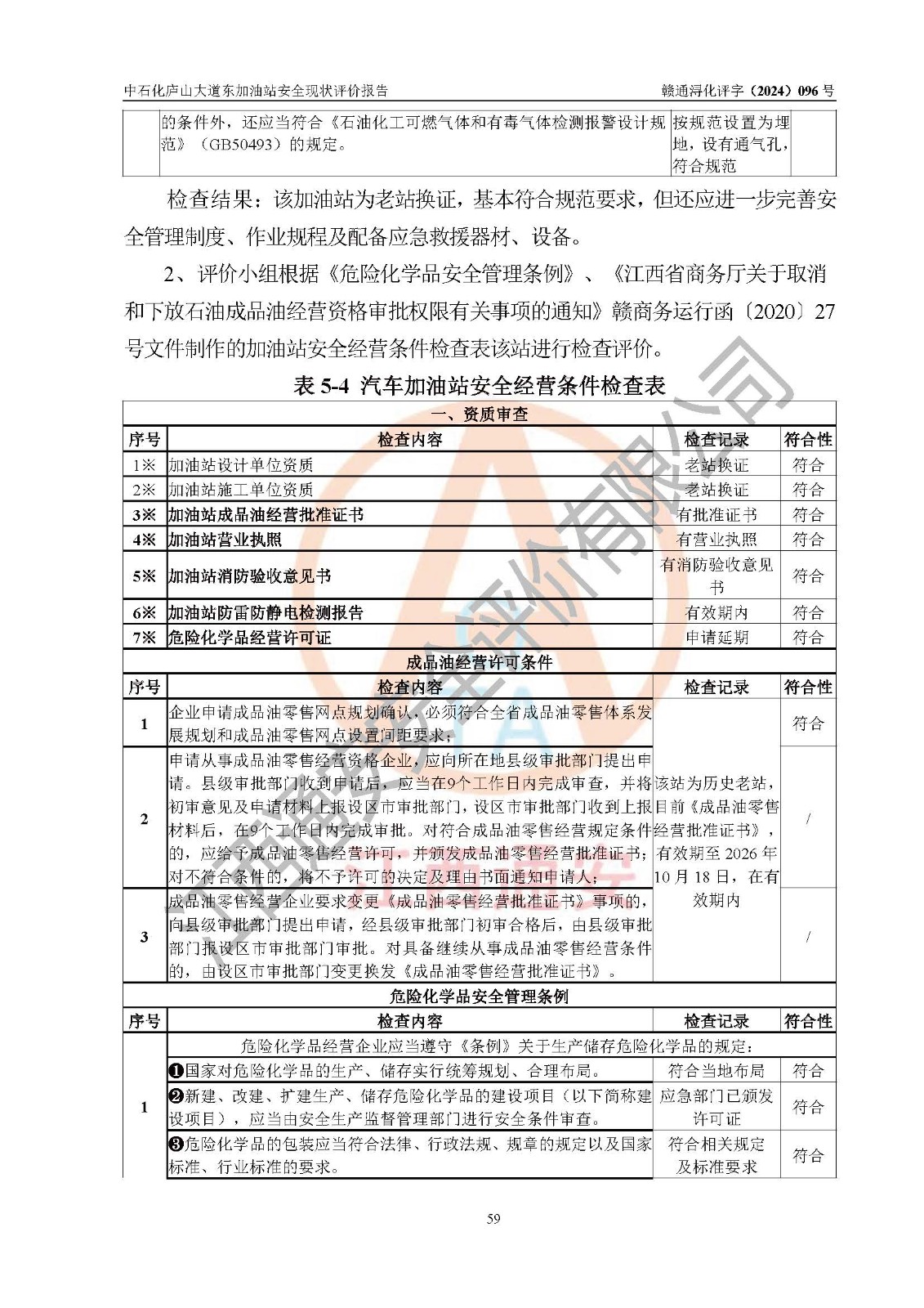 評價結(jié)論 | 中國石化銷售股份有限公司江西九江濂溪石油分公司廬山大道東加油站涉及的安全條件、安全經(jīng)營條件、安全生產(chǎn)管理符合《危險化學(xué)品經(jīng)營許可證管理辦法》、《汽車加油加氣加氫站技術(shù)標準》等**有關(guān)法規(guī)、標準、規(guī)范要求,能滿足危險化學(xué)品經(jīng)營安全條件。 | |||