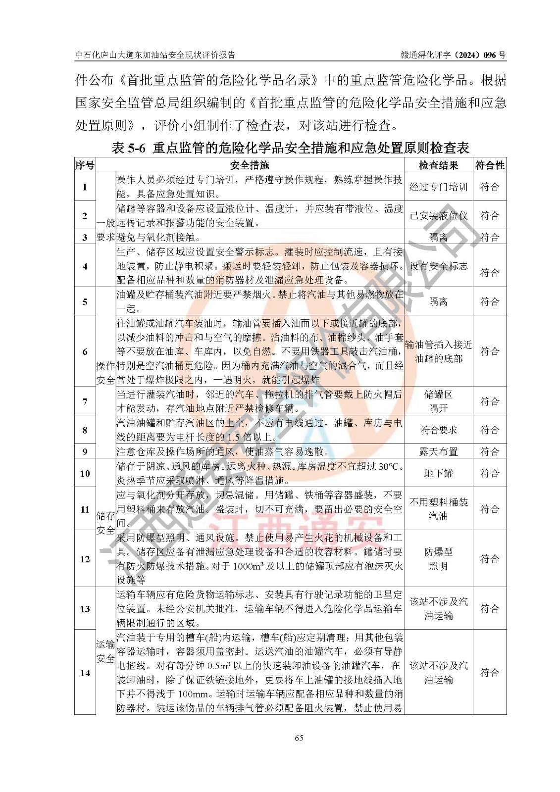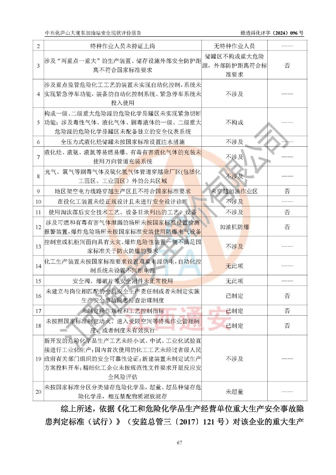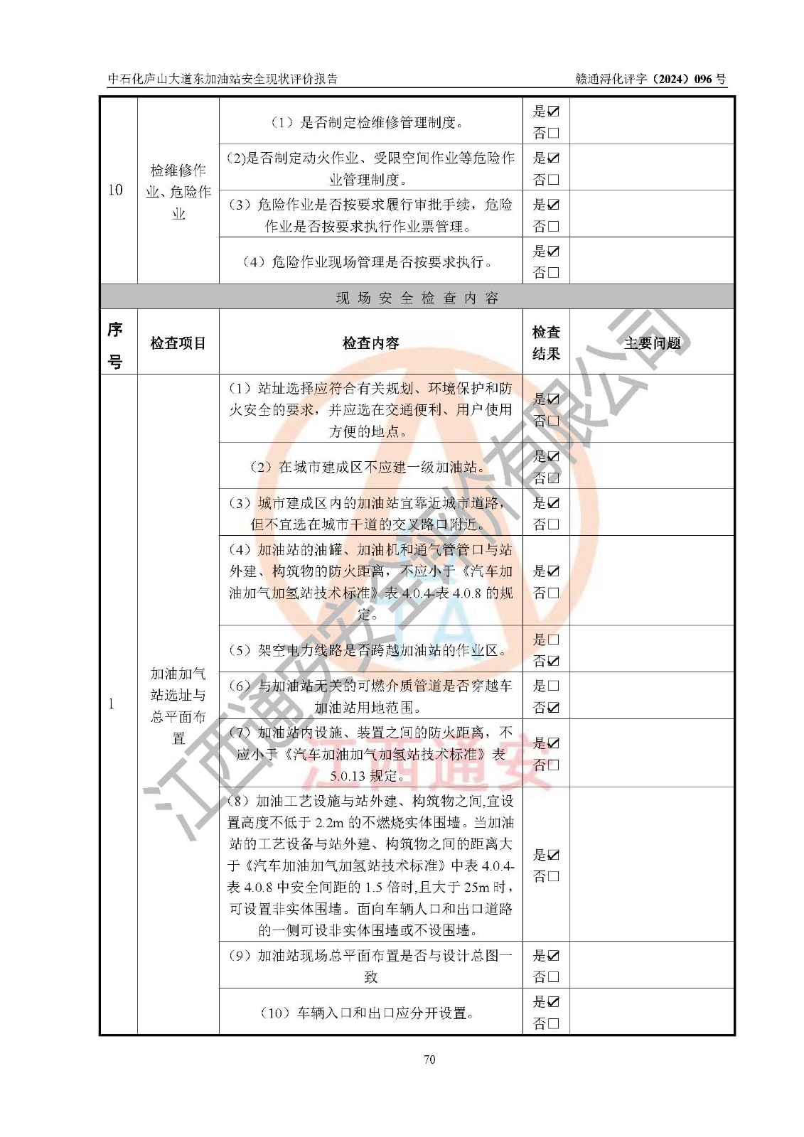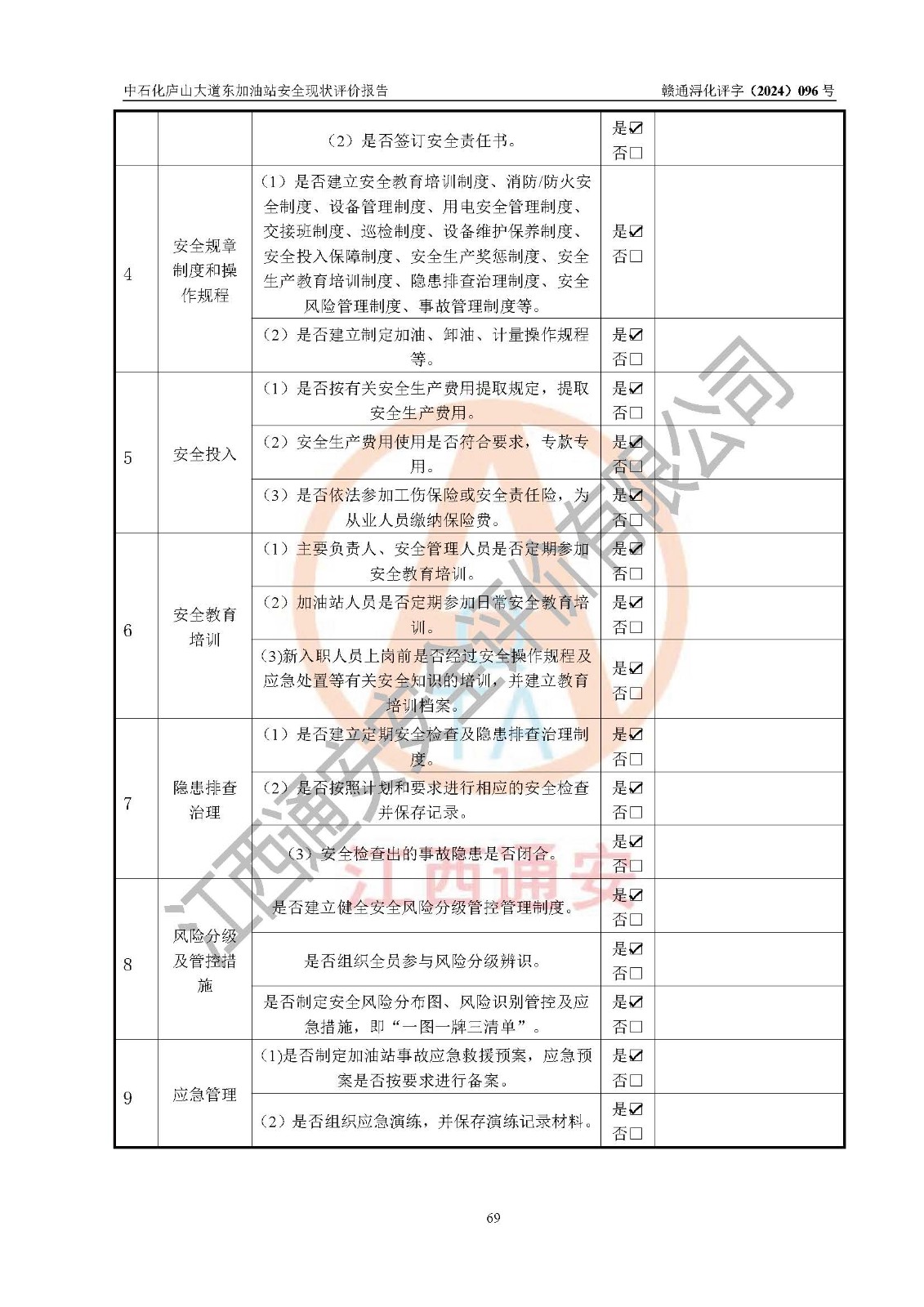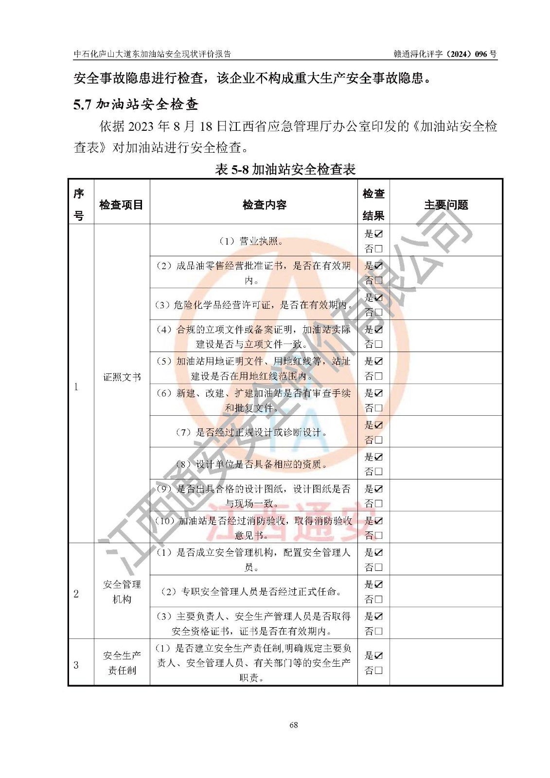 評價結(jié)論 | 中國石化銷售股份有限公司江西九江濂溪石油分公司廬山大道東加油站涉及的安全條件、安全經(jīng)營條件、安全生產(chǎn)管理符合《危險化學(xué)品經(jīng)營許可證管理辦法》、《汽車加油加氣加氫站技術(shù)標準》等**有關(guān)法規(guī)、標準、規(guī)范要求,能滿足危險化學(xué)品經(jīng)營安全條件。 | |||