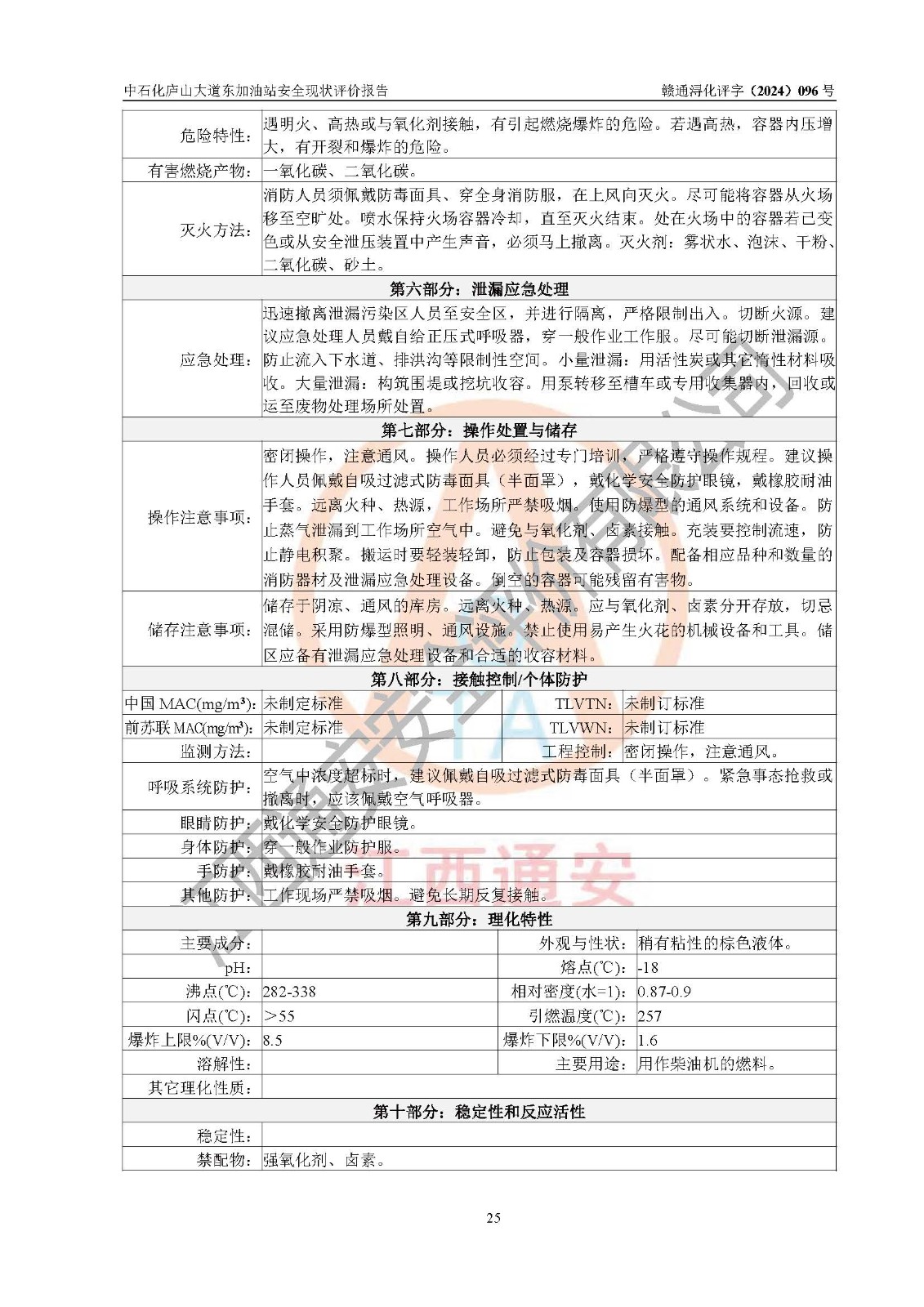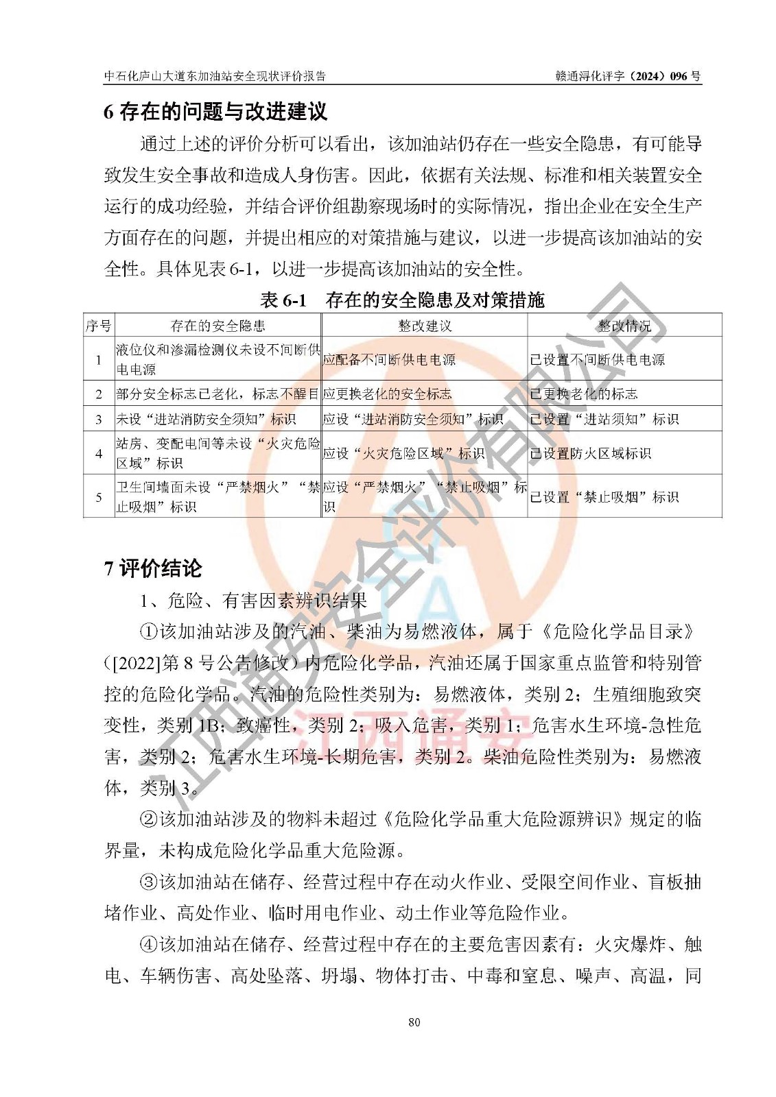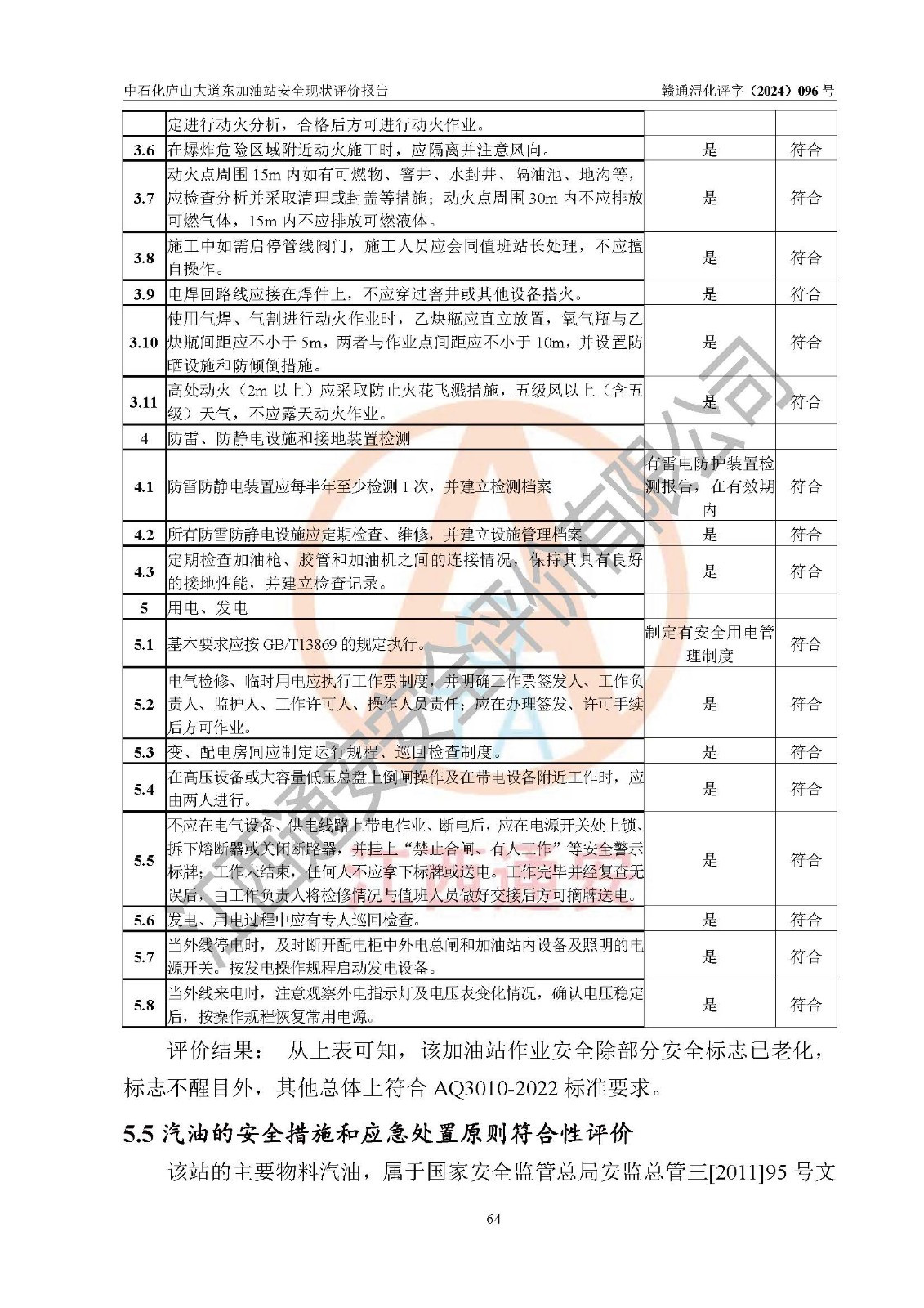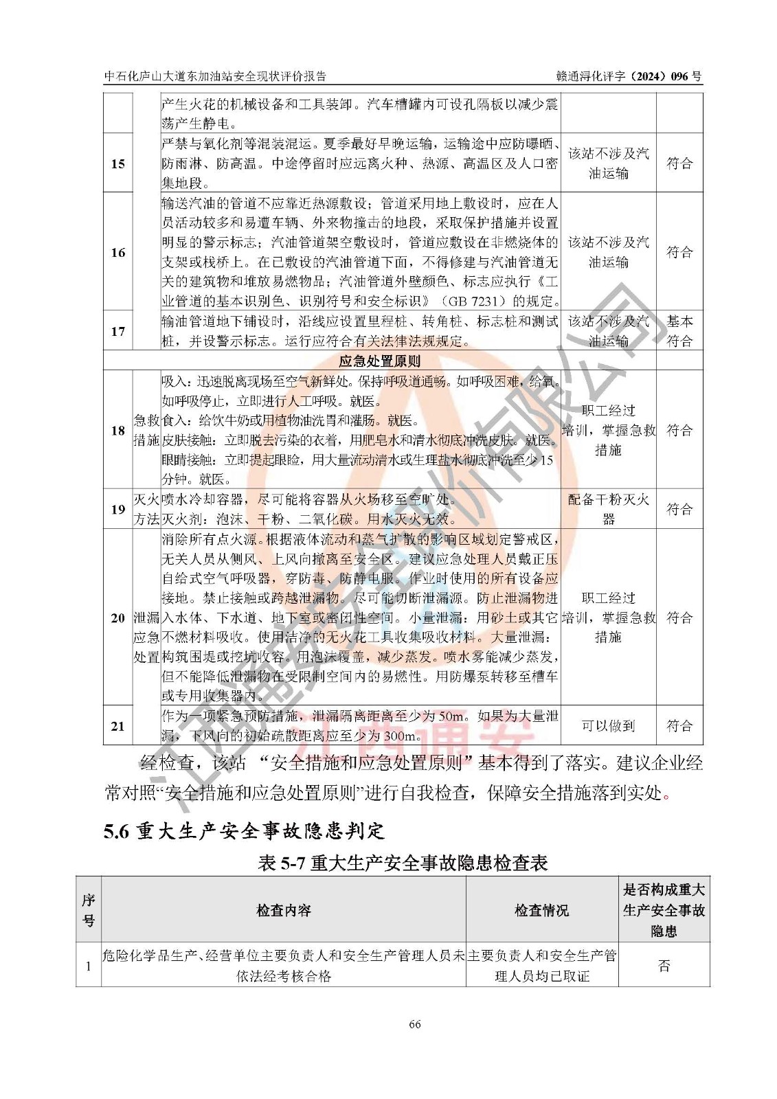 評價結(jié)論 | 中國石化銷售股份有限公司江西九江濂溪石油分公司廬山大道東加油站涉及的安全條件、安全經(jīng)營條件、安全生產(chǎn)管理符合《危險化學(xué)品經(jīng)營許可證管理辦法》、《汽車加油加氣加氫站技術(shù)標準》等**有關(guān)法規(guī)、標準、規(guī)范要求,能滿足危險化學(xué)品經(jīng)營安全條件。 | |||