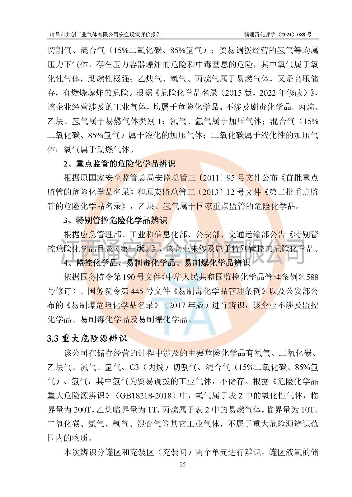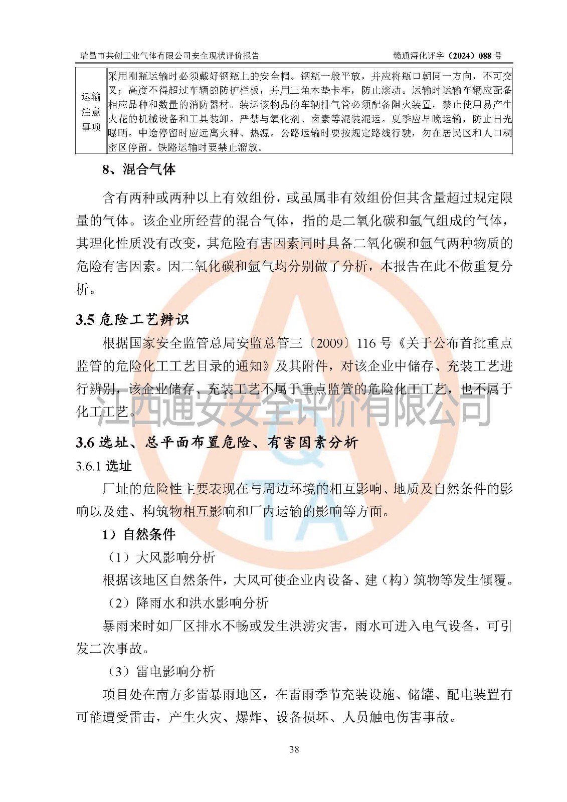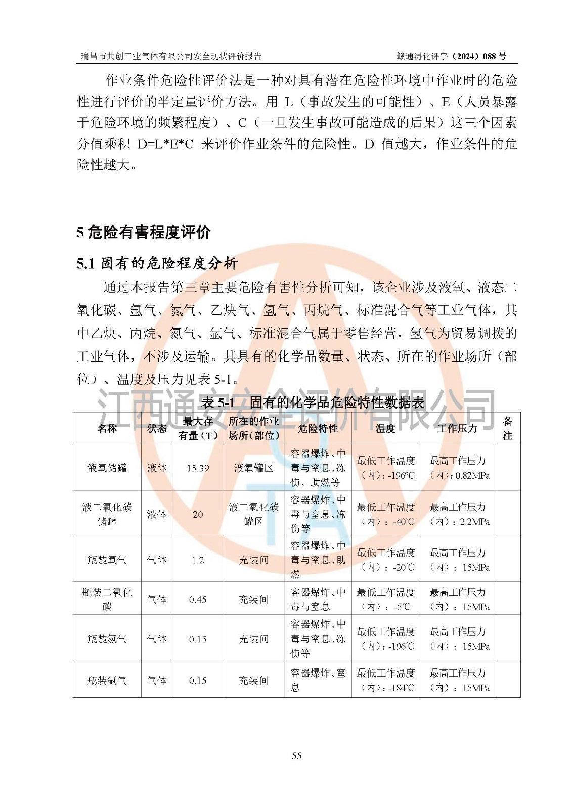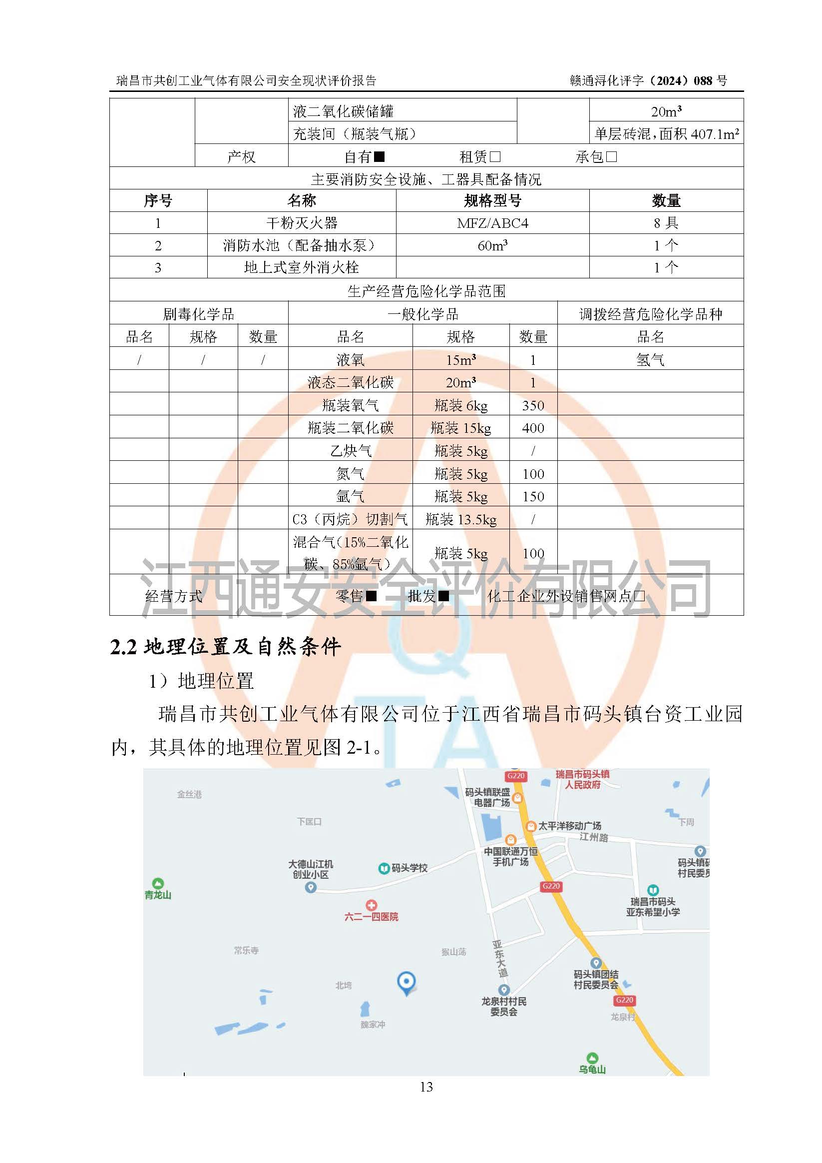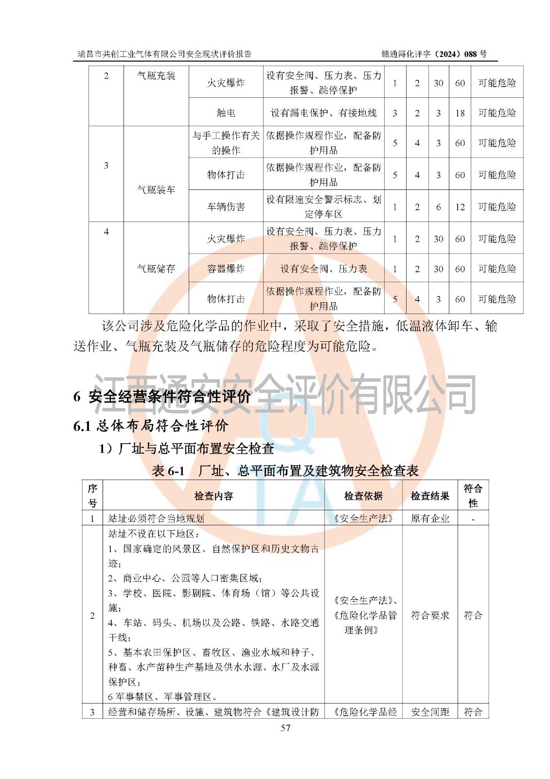 項(xiàng)目簡介 | 瑞昌市共創(chuàng)工業(yè)氣體有限公司位于瑞昌市碼頭鎮(zhèn)臺(tái)資工業(yè)園內(nèi),該企業(yè)在儲(chǔ)存、經(jīng)營過程中涉及的危險(xiǎn)化學(xué)品有低溫氧氣、壓縮氧氣、二氧化碳、乙炔氣、氮?dú)?、氬氣?/span>C3(丙烷)切割氣、混合氣(15%二氧化碳、85%的氬氣)、氫氣等工業(yè)氣體。其中氧氣、二氧化碳為儲(chǔ)存經(jīng)營;氮?dú)狻鍤狻?/span>C3(丙烷)切割氣、乙炔氣、混合氣(15%二氧化碳、85%氬氣)為零售經(jīng)營,氫氣為貿(mào)易調(diào)撥。法定**人周平峰,注冊(cè)資金20萬元整,占地面積約2635m2,現(xiàn)有員工9人,其中安全管理人員2人。 該企業(yè)于2021年11月8日由九江市行政審批局簽發(fā)的《危險(xiǎn)化學(xué)品經(jīng)營許可證》(證號(hào):贛九行審經(jīng)(甲)字[2021]000083),**期至2025年01月14日。根據(jù)《危險(xiǎn)化學(xué)品重大危險(xiǎn)源辨識(shí)》(GB18218-2018)中,該項(xiàng)目屬于重大危險(xiǎn)源辨識(shí)范圍內(nèi)的物質(zhì)為氧氣、乙炔、丙烷。經(jīng)辨識(shí),該企業(yè)生產(chǎn)單元、儲(chǔ)存單元危險(xiǎn)物質(zhì)的量不構(gòu)成**標(biāo)準(zhǔn)《危險(xiǎn)化學(xué)品重大危險(xiǎn)源辨識(shí)》(GB18218-2018)中規(guī)定的重大危險(xiǎn)源。 根據(jù)《危險(xiǎn)化學(xué)品經(jīng)營許可證管理辦法》(**安監(jiān)總局第55號(hào)令,第79號(hào)令修改)以及《江西省安全生產(chǎn)監(jiān)督管理局關(guān)于貫徹﹤危險(xiǎn)化學(xué)品經(jīng)營許可證管理辦法﹥的通知》(贛安監(jiān)管二字﹝2013﹞14號(hào))的要求,危險(xiǎn)化學(xué)品經(jīng)營許可證的**期為3年。**期滿后,企業(yè)需要繼續(xù)從事危險(xiǎn)化學(xué)品經(jīng)營活動(dòng)的,應(yīng)當(dāng)在危險(xiǎn)化學(xué)品經(jīng)營許可證**期滿3個(gè)月前,向發(fā)證機(jī)關(guān)提出危險(xiǎn)化學(xué)品經(jīng)營許可證的延期申請(qǐng)。申請(qǐng)證照延期的所有儲(chǔ)存、經(jīng)營危險(xiǎn)化學(xué)品的單位,應(yīng)當(dāng)提供安全評(píng)價(jià)報(bào)告。瑞昌市共創(chuàng)工業(yè)氣體有限公司目前正在做危險(xiǎn)化學(xué)品經(jīng)營許可證延期換證的準(zhǔn)備工作,故委托江西通安安全評(píng)價(jià)有限公司承擔(dān)其安全經(jīng)營條件現(xiàn)狀評(píng)價(jià)工作。 江西通安安全評(píng)價(jià)有限公司接受委托后,組織了評(píng)價(jià)小組。根據(jù)相關(guān)法律、法規(guī)和標(biāo)準(zhǔn)的規(guī)定,于2024年9月勘察了企業(yè)經(jīng)營場所。在對(duì)委托方相關(guān)裝置的運(yùn)行及其安全管理的現(xiàn)狀進(jìn)行充分了解后,充分查找了其存在的危險(xiǎn)、有害因素種類和危險(xiǎn)危害程度;對(duì)存在的問題,評(píng)價(jià)組成員和委托方的陪同人員進(jìn)行了及時(shí)的溝通,并提出了整改措施;企業(yè)及時(shí)完成了整改。評(píng)價(jià)小組在委托方提供的有關(guān)技術(shù)和管理資料基礎(chǔ)上,按照《安全評(píng)價(jià)通則》(AQ8001-2007)的要求,依據(jù)**有關(guān)法律、法規(guī)、標(biāo)準(zhǔn)和規(guī)范,采用合適的安全評(píng)價(jià)方法,編制完成了本安全評(píng)價(jià)報(bào)告,以作為企業(yè)安全生產(chǎn)技術(shù)與安全生產(chǎn)管理決策及應(yīng)急管理部門實(shí)施監(jiān)督管理提供安全技術(shù)依據(jù)。 本次安全評(píng)價(jià)范圍:瑞昌市共創(chuàng)工業(yè)氣體有限公司儲(chǔ)存經(jīng)營工業(yè)氣體的儲(chǔ)存裝置和輔助設(shè)施,以及充裝過程中設(shè)備設(shè)施的安全技術(shù)措施和安全管理措施。包括儲(chǔ)存經(jīng)營過程中的危險(xiǎn)有害因素、安全生產(chǎn)條件以及工藝、設(shè)備設(shè)施的安全可靠性和安全管理的組織、機(jī)構(gòu)、人員、防護(hù)設(shè)施、作業(yè)環(huán)境、管理制度等。 項(xiàng)目涉及的環(huán)境保護(hù)、消防、職業(yè)衛(wèi)生等問題則應(yīng)執(zhí)行**的有關(guān)規(guī)定及相關(guān)標(biāo)準(zhǔn)。本評(píng)價(jià)引用到的**、消防、職業(yè)衛(wèi)生等方面的法規(guī)標(biāo)準(zhǔn)與安全評(píng)價(jià)有**的關(guān)聯(lián),環(huán)境保護(hù)、職業(yè)衛(wèi)生與消防應(yīng)以其主管部門審核意見為準(zhǔn)。 | ||||||