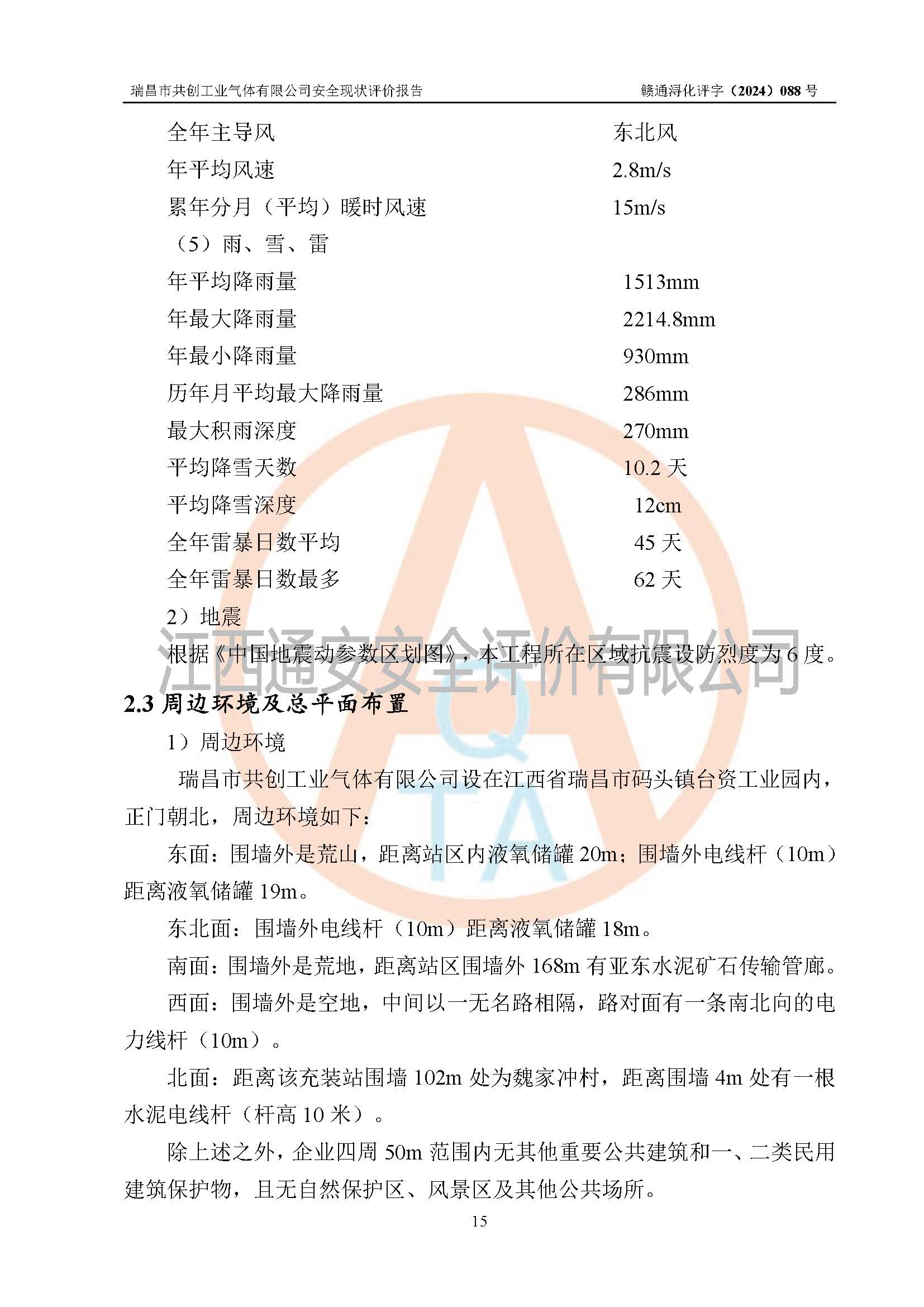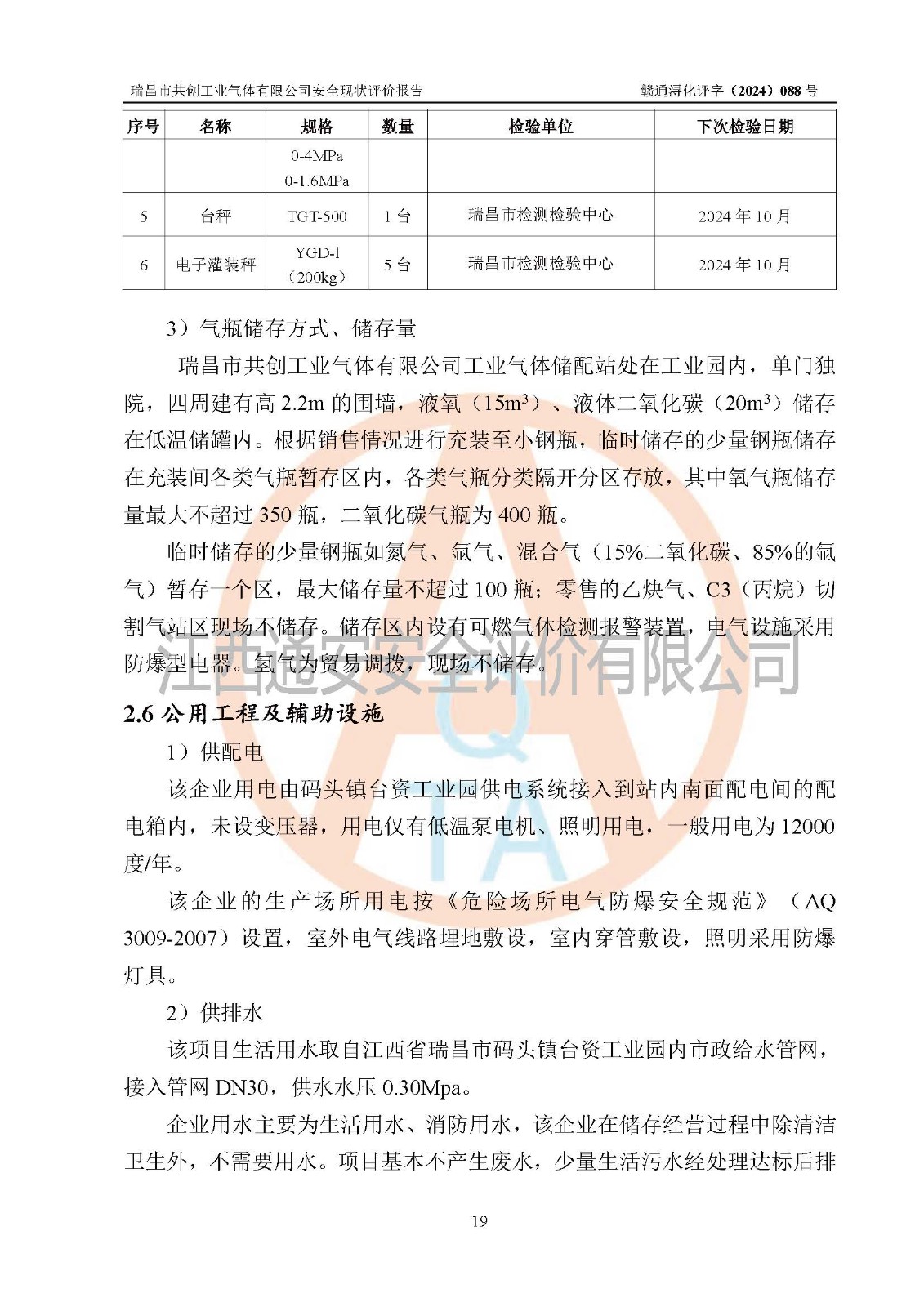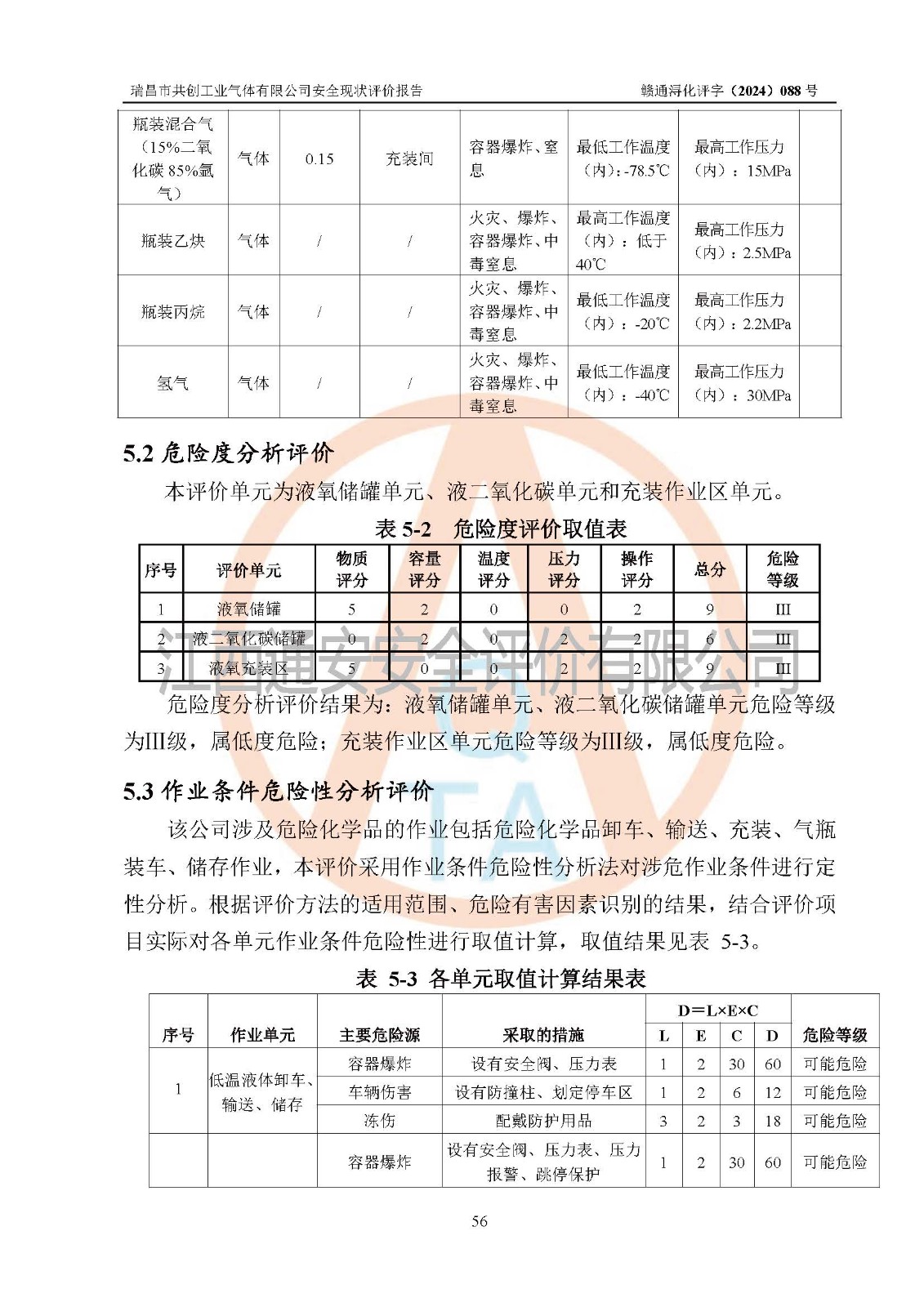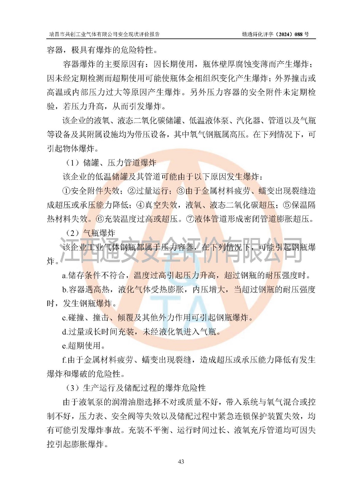 項(xiàng)目簡介 | 瑞昌市共創(chuàng)工業(yè)氣體有限公司位于瑞昌市碼頭鎮(zhèn)臺(tái)資工業(yè)園內(nèi),該企業(yè)在儲(chǔ)存、經(jīng)營過程中涉及的危險(xiǎn)化學(xué)品有低溫氧氣、壓縮氧氣、二氧化碳、乙炔氣、氮?dú)?、氬氣?/span>C3(丙烷)切割氣、混合氣(15%二氧化碳、85%的氬氣)、氫氣等工業(yè)氣體。其中氧氣、二氧化碳為儲(chǔ)存經(jīng)營;氮?dú)狻鍤狻?/span>C3(丙烷)切割氣、乙炔氣、混合氣(15%二氧化碳、85%氬氣)為零售經(jīng)營,氫氣為貿(mào)易調(diào)撥。法定**人周平峰,注冊(cè)資金20萬元整,占地面積約2635m2,現(xiàn)有員工9人,其中安全管理人員2人。 該企業(yè)于2021年11月8日由九江市行政審批局簽發(fā)的《危險(xiǎn)化學(xué)品經(jīng)營許可證》(證號(hào):贛九行審經(jīng)(甲)字[2021]000083),**期至2025年01月14日。根據(jù)《危險(xiǎn)化學(xué)品重大危險(xiǎn)源辨識(shí)》(GB18218-2018)中,該項(xiàng)目屬于重大危險(xiǎn)源辨識(shí)范圍內(nèi)的物質(zhì)為氧氣、乙炔、丙烷。經(jīng)辨識(shí),該企業(yè)生產(chǎn)單元、儲(chǔ)存單元危險(xiǎn)物質(zhì)的量不構(gòu)成**標(biāo)準(zhǔn)《危險(xiǎn)化學(xué)品重大危險(xiǎn)源辨識(shí)》(GB18218-2018)中規(guī)定的重大危險(xiǎn)源。 根據(jù)《危險(xiǎn)化學(xué)品經(jīng)營許可證管理辦法》(**安監(jiān)總局第55號(hào)令,第79號(hào)令修改)以及《江西省安全生產(chǎn)監(jiān)督管理局關(guān)于貫徹﹤危險(xiǎn)化學(xué)品經(jīng)營許可證管理辦法﹥的通知》(贛安監(jiān)管二字﹝2013﹞14號(hào))的要求,危險(xiǎn)化學(xué)品經(jīng)營許可證的**期為3年。**期滿后,企業(yè)需要繼續(xù)從事危險(xiǎn)化學(xué)品經(jīng)營活動(dòng)的,應(yīng)當(dāng)在危險(xiǎn)化學(xué)品經(jīng)營許可證**期滿3個(gè)月前,向發(fā)證機(jī)關(guān)提出危險(xiǎn)化學(xué)品經(jīng)營許可證的延期申請(qǐng)。申請(qǐng)證照延期的所有儲(chǔ)存、經(jīng)營危險(xiǎn)化學(xué)品的單位,應(yīng)當(dāng)提供安全評(píng)價(jià)報(bào)告。瑞昌市共創(chuàng)工業(yè)氣體有限公司目前正在做危險(xiǎn)化學(xué)品經(jīng)營許可證延期換證的準(zhǔn)備工作,故委托江西通安安全評(píng)價(jià)有限公司承擔(dān)其安全經(jīng)營條件現(xiàn)狀評(píng)價(jià)工作。 江西通安安全評(píng)價(jià)有限公司接受委托后,組織了評(píng)價(jià)小組。根據(jù)相關(guān)法律、法規(guī)和標(biāo)準(zhǔn)的規(guī)定,于2024年9月勘察了企業(yè)經(jīng)營場所。在對(duì)委托方相關(guān)裝置的運(yùn)行及其安全管理的現(xiàn)狀進(jìn)行充分了解后,充分查找了其存在的危險(xiǎn)、有害因素種類和危險(xiǎn)危害程度;對(duì)存在的問題,評(píng)價(jià)組成員和委托方的陪同人員進(jìn)行了及時(shí)的溝通,并提出了整改措施;企業(yè)及時(shí)完成了整改。評(píng)價(jià)小組在委托方提供的有關(guān)技術(shù)和管理資料基礎(chǔ)上,按照《安全評(píng)價(jià)通則》(AQ8001-2007)的要求,依據(jù)**有關(guān)法律、法規(guī)、標(biāo)準(zhǔn)和規(guī)范,采用合適的安全評(píng)價(jià)方法,編制完成了本安全評(píng)價(jià)報(bào)告,以作為企業(yè)安全生產(chǎn)技術(shù)與安全生產(chǎn)管理決策及應(yīng)急管理部門實(shí)施監(jiān)督管理提供安全技術(shù)依據(jù)。 本次安全評(píng)價(jià)范圍:瑞昌市共創(chuàng)工業(yè)氣體有限公司儲(chǔ)存經(jīng)營工業(yè)氣體的儲(chǔ)存裝置和輔助設(shè)施,以及充裝過程中設(shè)備設(shè)施的安全技術(shù)措施和安全管理措施。包括儲(chǔ)存經(jīng)營過程中的危險(xiǎn)有害因素、安全生產(chǎn)條件以及工藝、設(shè)備設(shè)施的安全可靠性和安全管理的組織、機(jī)構(gòu)、人員、防護(hù)設(shè)施、作業(yè)環(huán)境、管理制度等。 項(xiàng)目涉及的環(huán)境保護(hù)、消防、職業(yè)衛(wèi)生等問題則應(yīng)執(zhí)行**的有關(guān)規(guī)定及相關(guān)標(biāo)準(zhǔn)。本評(píng)價(jià)引用到的**、消防、職業(yè)衛(wèi)生等方面的法規(guī)標(biāo)準(zhǔn)與安全評(píng)價(jià)有**的關(guān)聯(lián),環(huán)境保護(hù)、職業(yè)衛(wèi)生與消防應(yīng)以其主管部門審核意見為準(zhǔn)。 | ||||||
