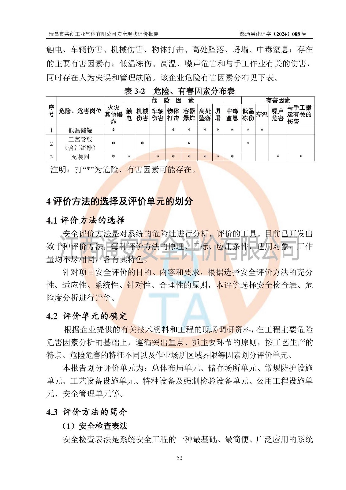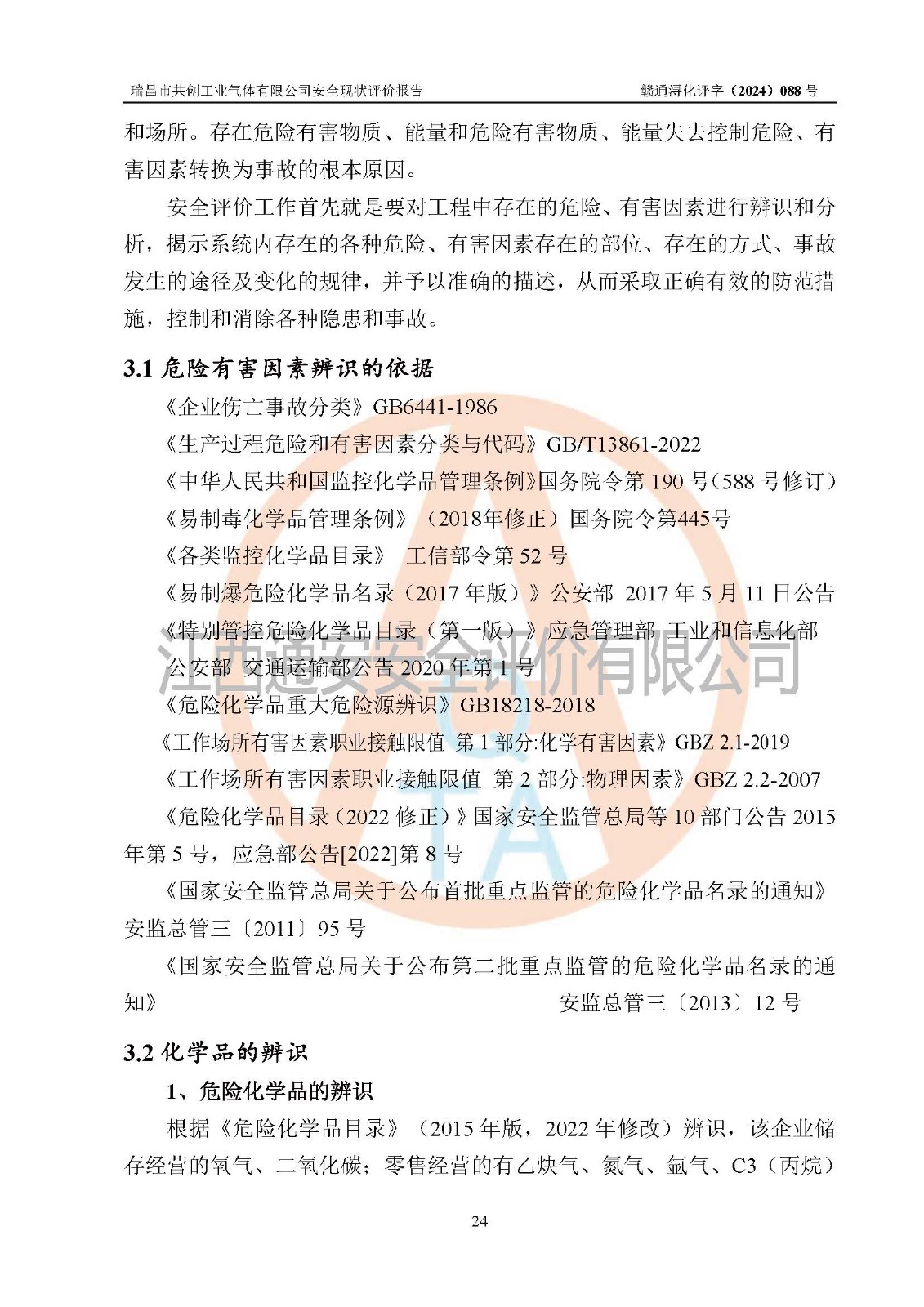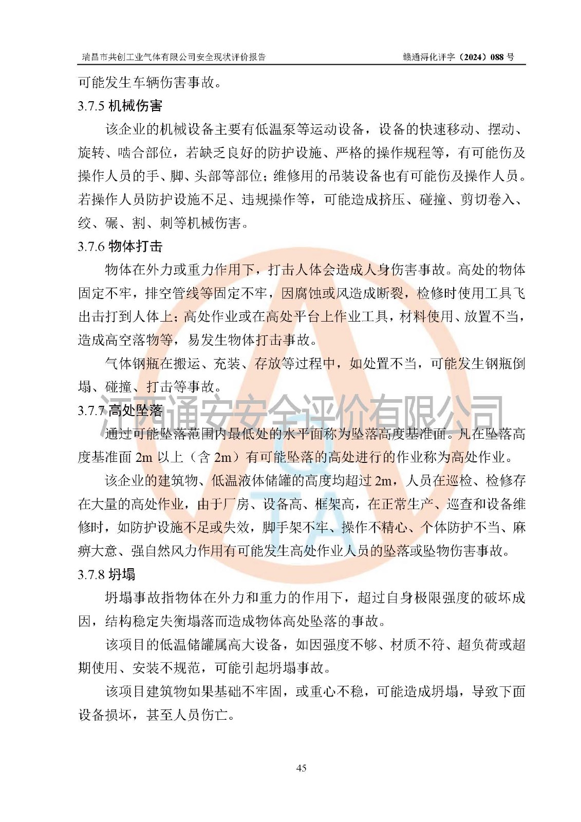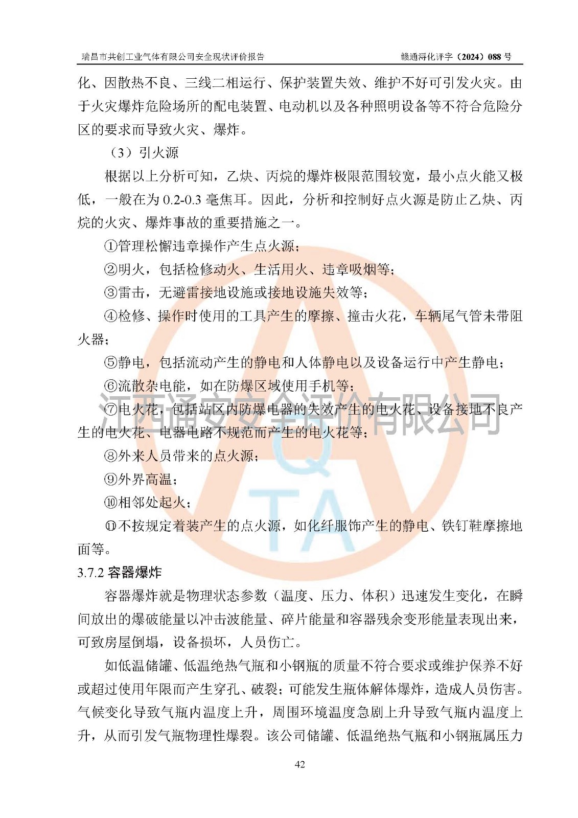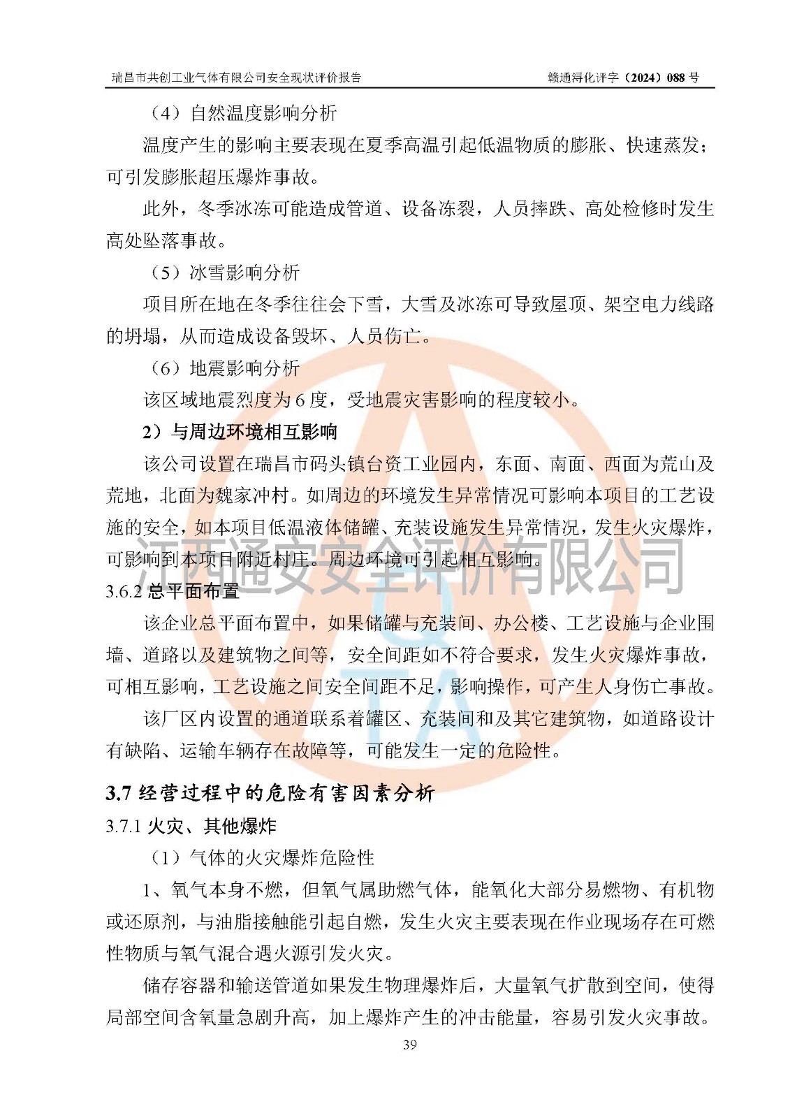 項(xiàng)目簡介 | 瑞昌市共創(chuàng)工業(yè)氣體有限公司位于瑞昌市碼頭鎮(zhèn)臺(tái)資工業(yè)園內(nèi),該企業(yè)在儲(chǔ)存、經(jīng)營過程中涉及的危險(xiǎn)化學(xué)品有低溫氧氣、壓縮氧氣、二氧化碳、乙炔氣、氮?dú)?、氬氣?/span>C3(丙烷)切割氣、混合氣(15%二氧化碳、85%的氬氣)、氫氣等工業(yè)氣體。其中氧氣、二氧化碳為儲(chǔ)存經(jīng)營;氮?dú)狻鍤狻?/span>C3(丙烷)切割氣、乙炔氣、混合氣(15%二氧化碳、85%氬氣)為零售經(jīng)營,氫氣為貿(mào)易調(diào)撥。法定**人周平峰,注冊(cè)資金20萬元整,占地面積約2635m2,現(xiàn)有員工9人,其中安全管理人員2人。 該企業(yè)于2021年11月8日由九江市行政審批局簽發(fā)的《危險(xiǎn)化學(xué)品經(jīng)營許可證》(證號(hào):贛九行審經(jīng)(甲)字[2021]000083),**期至2025年01月14日。根據(jù)《危險(xiǎn)化學(xué)品重大危險(xiǎn)源辨識(shí)》(GB18218-2018)中,該項(xiàng)目屬于重大危險(xiǎn)源辨識(shí)范圍內(nèi)的物質(zhì)為氧氣、乙炔、丙烷。經(jīng)辨識(shí),該企業(yè)生產(chǎn)單元、儲(chǔ)存單元危險(xiǎn)物質(zhì)的量不構(gòu)成**標(biāo)準(zhǔn)《危險(xiǎn)化學(xué)品重大危險(xiǎn)源辨識(shí)》(GB18218-2018)中規(guī)定的重大危險(xiǎn)源。 根據(jù)《危險(xiǎn)化學(xué)品經(jīng)營許可證管理辦法》(**安監(jiān)總局第55號(hào)令,第79號(hào)令修改)以及《江西省安全生產(chǎn)監(jiān)督管理局關(guān)于貫徹﹤危險(xiǎn)化學(xué)品經(jīng)營許可證管理辦法﹥的通知》(贛安監(jiān)管二字﹝2013﹞14號(hào))的要求,危險(xiǎn)化學(xué)品經(jīng)營許可證的**期為3年。**期滿后,企業(yè)需要繼續(xù)從事危險(xiǎn)化學(xué)品經(jīng)營活動(dòng)的,應(yīng)當(dāng)在危險(xiǎn)化學(xué)品經(jīng)營許可證**期滿3個(gè)月前,向發(fā)證機(jī)關(guān)提出危險(xiǎn)化學(xué)品經(jīng)營許可證的延期申請(qǐng)。申請(qǐng)證照延期的所有儲(chǔ)存、經(jīng)營危險(xiǎn)化學(xué)品的單位,應(yīng)當(dāng)提供安全評(píng)價(jià)報(bào)告。瑞昌市共創(chuàng)工業(yè)氣體有限公司目前正在做危險(xiǎn)化學(xué)品經(jīng)營許可證延期換證的準(zhǔn)備工作,故委托江西通安安全評(píng)價(jià)有限公司承擔(dān)其安全經(jīng)營條件現(xiàn)狀評(píng)價(jià)工作。 江西通安安全評(píng)價(jià)有限公司接受委托后,組織了評(píng)價(jià)小組。根據(jù)相關(guān)法律、法規(guī)和標(biāo)準(zhǔn)的規(guī)定,于2024年9月勘察了企業(yè)經(jīng)營場所。在對(duì)委托方相關(guān)裝置的運(yùn)行及其安全管理的現(xiàn)狀進(jìn)行充分了解后,充分查找了其存在的危險(xiǎn)、有害因素種類和危險(xiǎn)危害程度;對(duì)存在的問題,評(píng)價(jià)組成員和委托方的陪同人員進(jìn)行了及時(shí)的溝通,并提出了整改措施;企業(yè)及時(shí)完成了整改。評(píng)價(jià)小組在委托方提供的有關(guān)技術(shù)和管理資料基礎(chǔ)上,按照《安全評(píng)價(jià)通則》(AQ8001-2007)的要求,依據(jù)**有關(guān)法律、法規(guī)、標(biāo)準(zhǔn)和規(guī)范,采用合適的安全評(píng)價(jià)方法,編制完成了本安全評(píng)價(jià)報(bào)告,以作為企業(yè)安全生產(chǎn)技術(shù)與安全生產(chǎn)管理決策及應(yīng)急管理部門實(shí)施監(jiān)督管理提供安全技術(shù)依據(jù)。 本次安全評(píng)價(jià)范圍:瑞昌市共創(chuàng)工業(yè)氣體有限公司儲(chǔ)存經(jīng)營工業(yè)氣體的儲(chǔ)存裝置和輔助設(shè)施,以及充裝過程中設(shè)備設(shè)施的安全技術(shù)措施和安全管理措施。包括儲(chǔ)存經(jīng)營過程中的危險(xiǎn)有害因素、安全生產(chǎn)條件以及工藝、設(shè)備設(shè)施的安全可靠性和安全管理的組織、機(jī)構(gòu)、人員、防護(hù)設(shè)施、作業(yè)環(huán)境、管理制度等。 項(xiàng)目涉及的環(huán)境保護(hù)、消防、職業(yè)衛(wèi)生等問題則應(yīng)執(zhí)行**的有關(guān)規(guī)定及相關(guān)標(biāo)準(zhǔn)。本評(píng)價(jià)引用到的**、消防、職業(yè)衛(wèi)生等方面的法規(guī)標(biāo)準(zhǔn)與安全評(píng)價(jià)有**的關(guān)聯(lián),環(huán)境保護(hù)、職業(yè)衛(wèi)生與消防應(yīng)以其主管部門審核意見為準(zhǔn)。 | ||||||