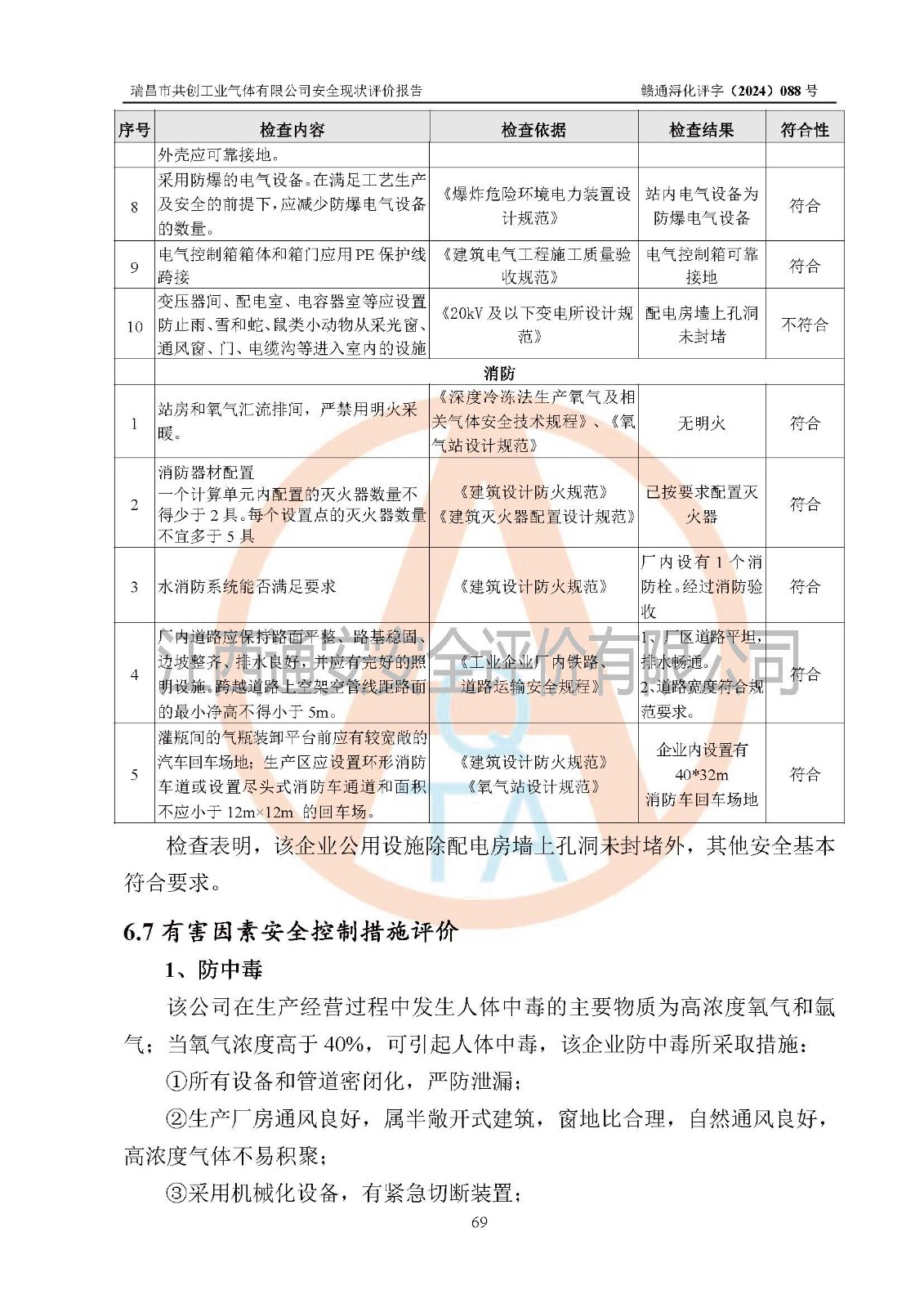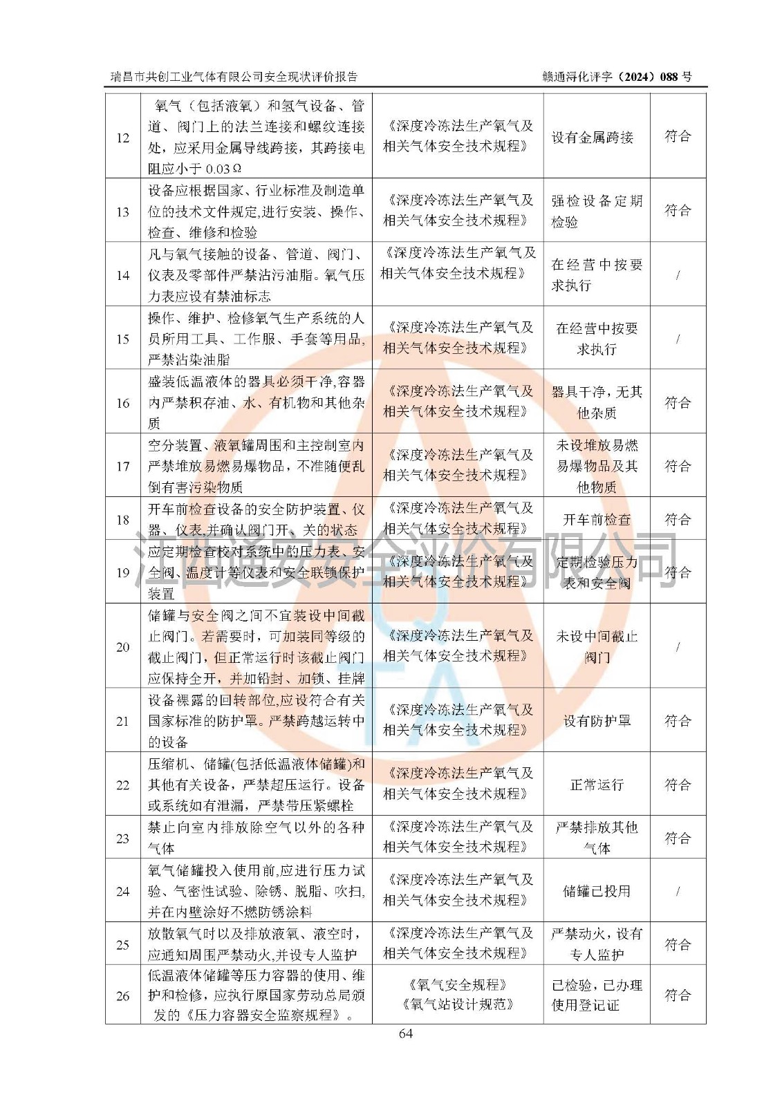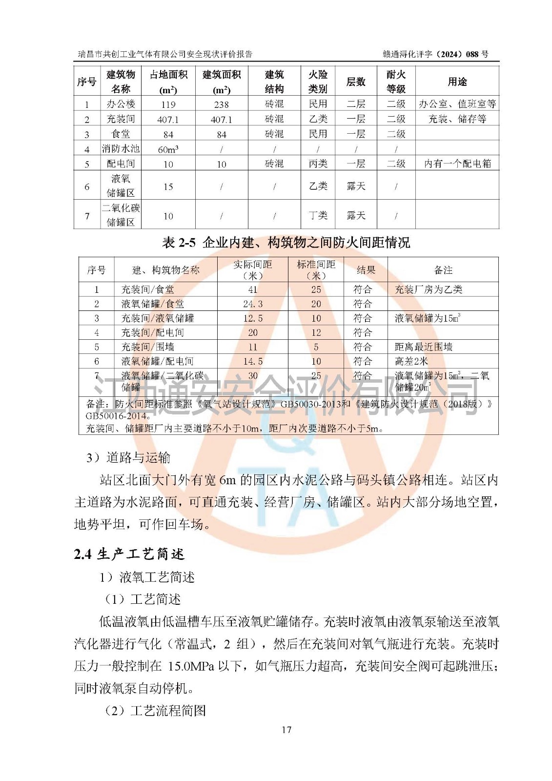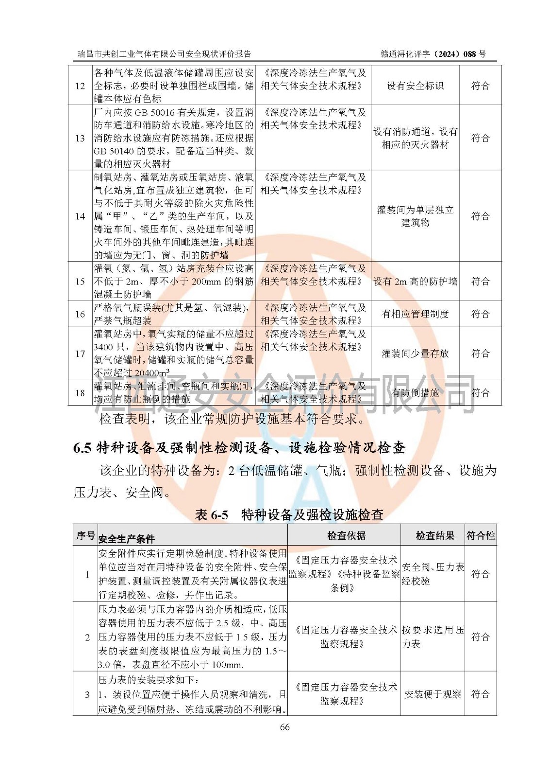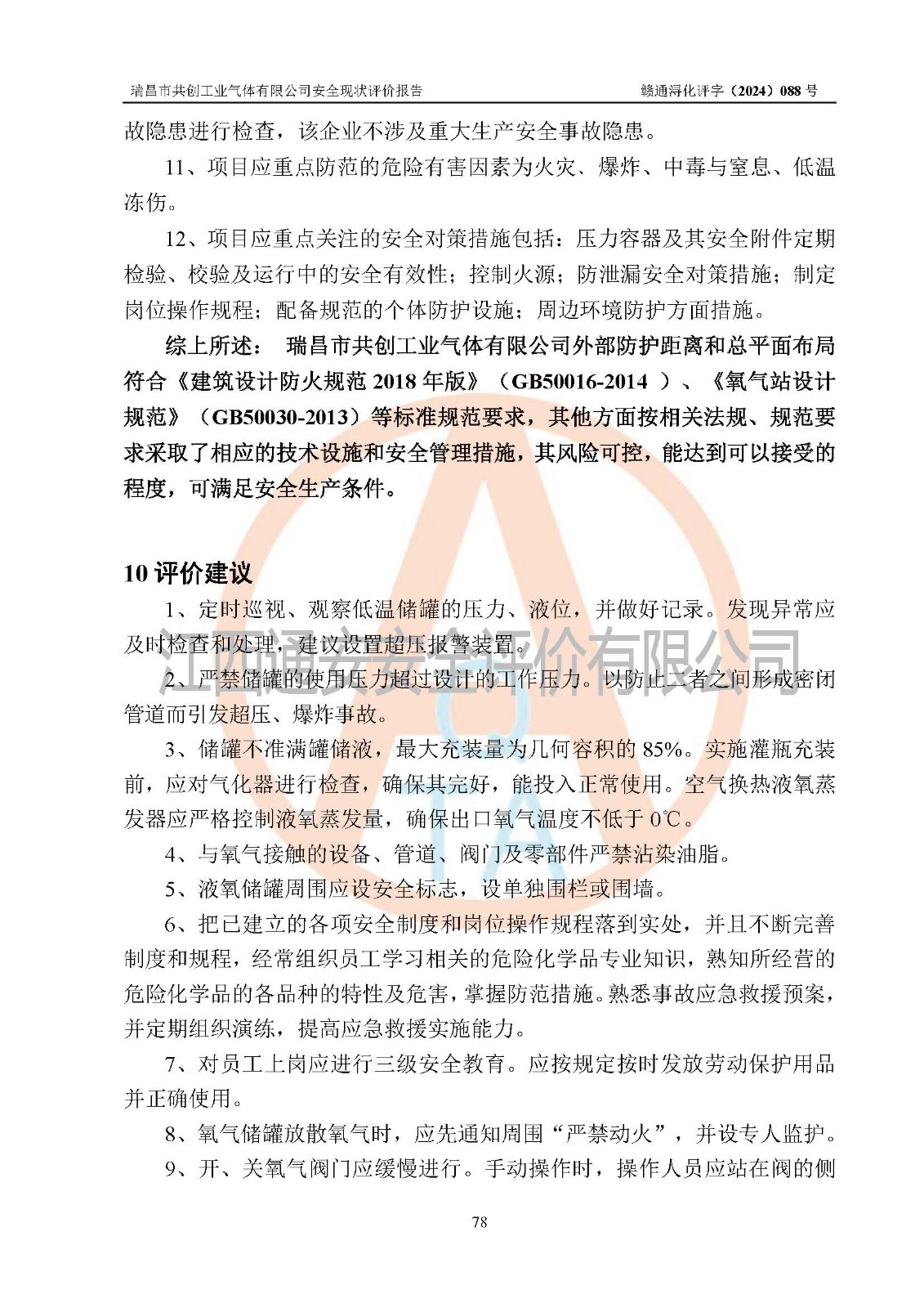 評(píng)價(jià)結(jié)論 | 綜上所述:瑞昌市共創(chuàng)工業(yè)氣體有限公司外部防護(hù)距離和總平面布局符合《建筑設(shè)計(jì)防火規(guī)范2018年版》(GB50016-2014 )、《氧氣站設(shè)計(jì)規(guī)范》(GB50030-2013)等標(biāo)準(zhǔn)規(guī)范要求,其他方面按相關(guān)法規(guī)、規(guī)范要求采取了相應(yīng)的技術(shù)設(shè)施和安全管理措施,其風(fēng)險(xiǎn)可控,能達(dá)到可以接受的程度,可滿足安全生產(chǎn)條件。 | ||||||
