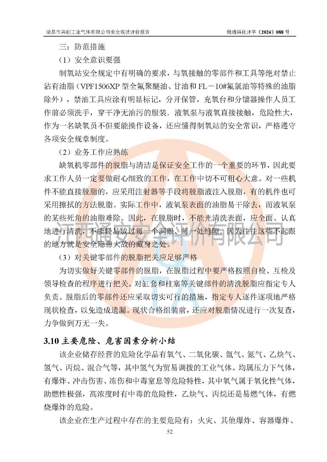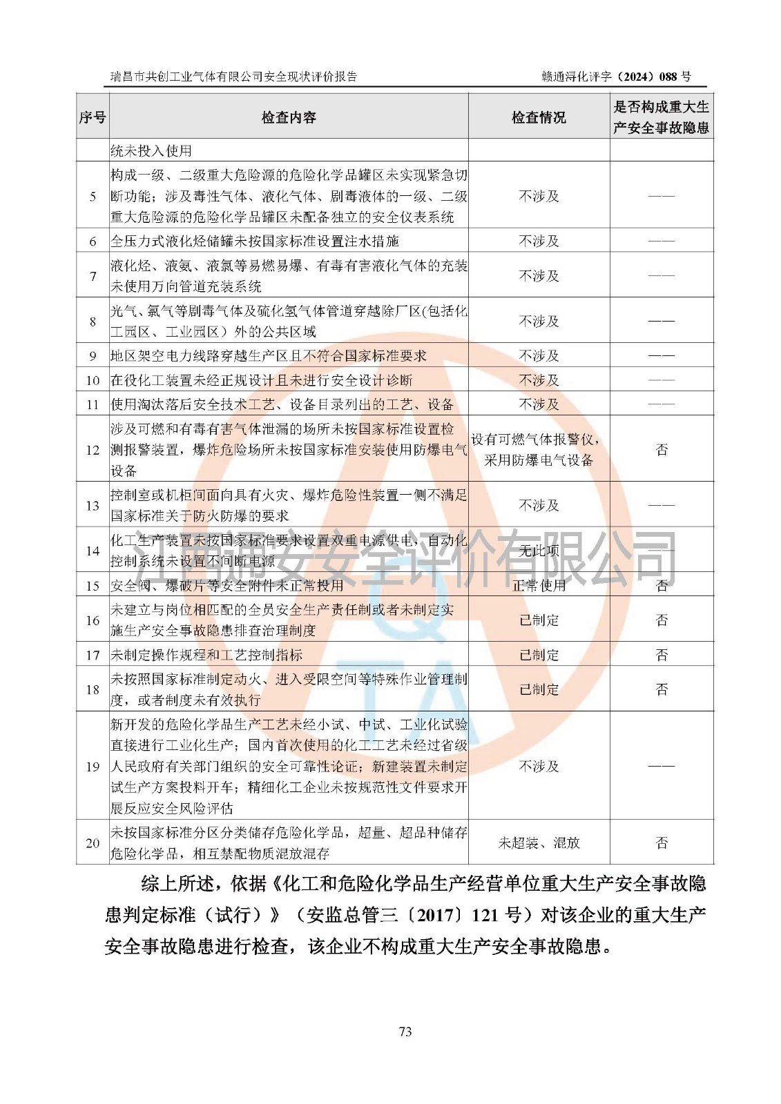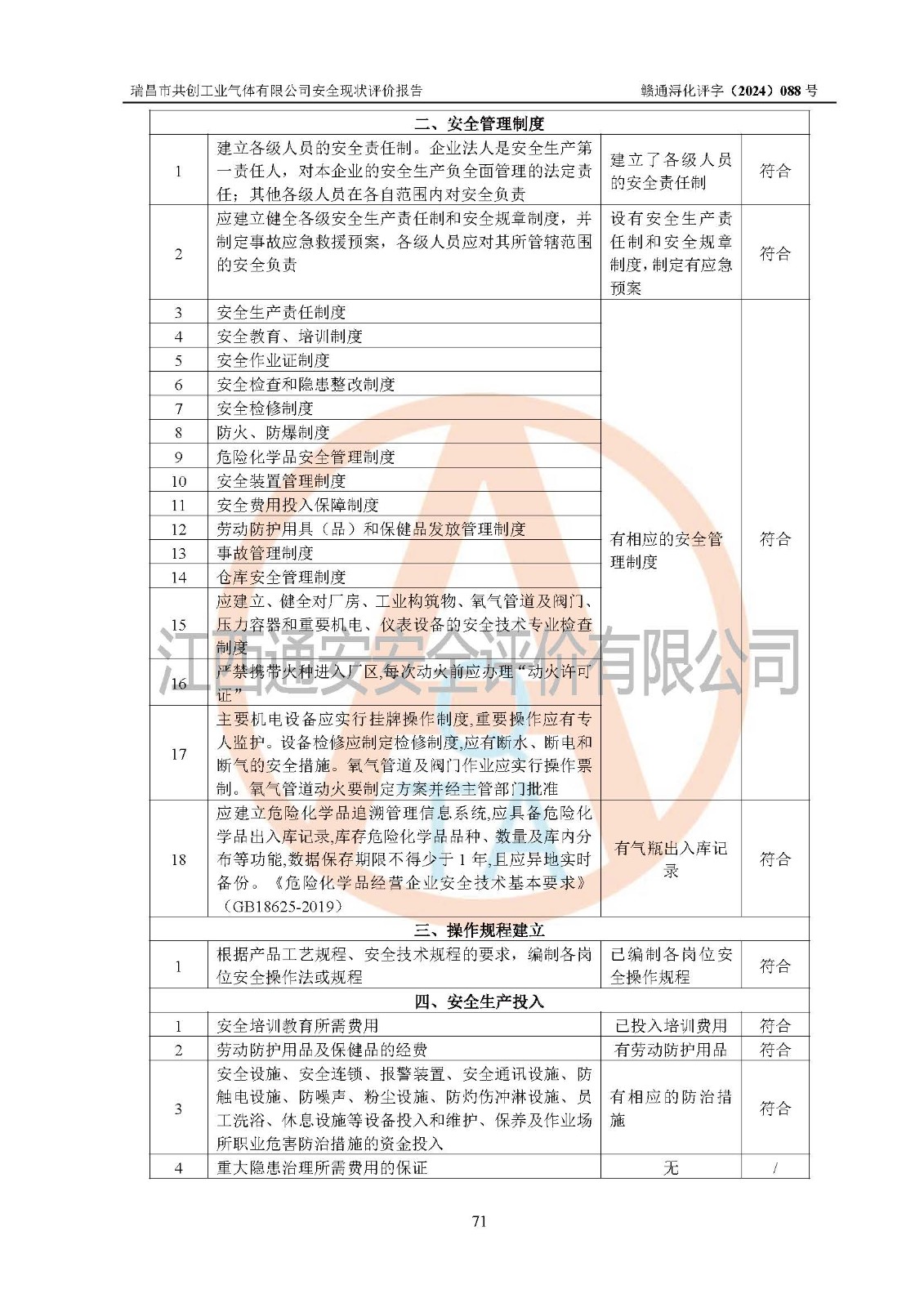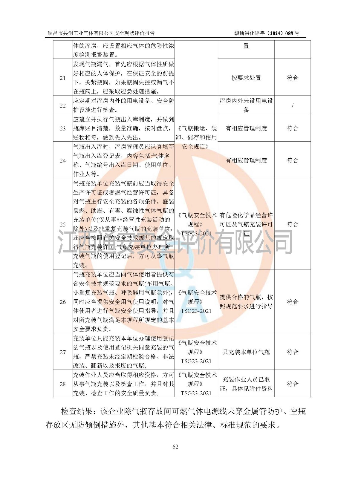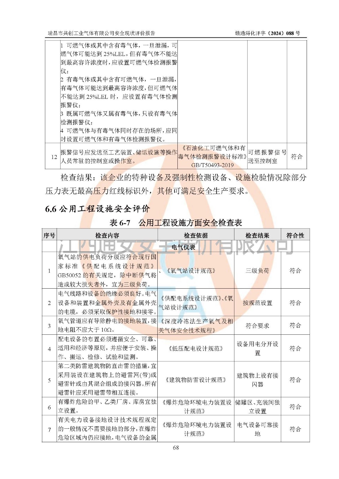 評(píng)價(jià)結(jié)論 | 綜上所述:瑞昌市共創(chuàng)工業(yè)氣體有限公司外部防護(hù)距離和總平面布局符合《建筑設(shè)計(jì)防火規(guī)范2018年版》(GB50016-2014 )、《氧氣站設(shè)計(jì)規(guī)范》(GB50030-2013)等標(biāo)準(zhǔn)規(guī)范要求,其他方面按相關(guān)法規(guī)、規(guī)范要求采取了相應(yīng)的技術(shù)設(shè)施和安全管理措施,其風(fēng)險(xiǎn)可控,能達(dá)到可以接受的程度,可滿足安全生產(chǎn)條件。 | ||||||
