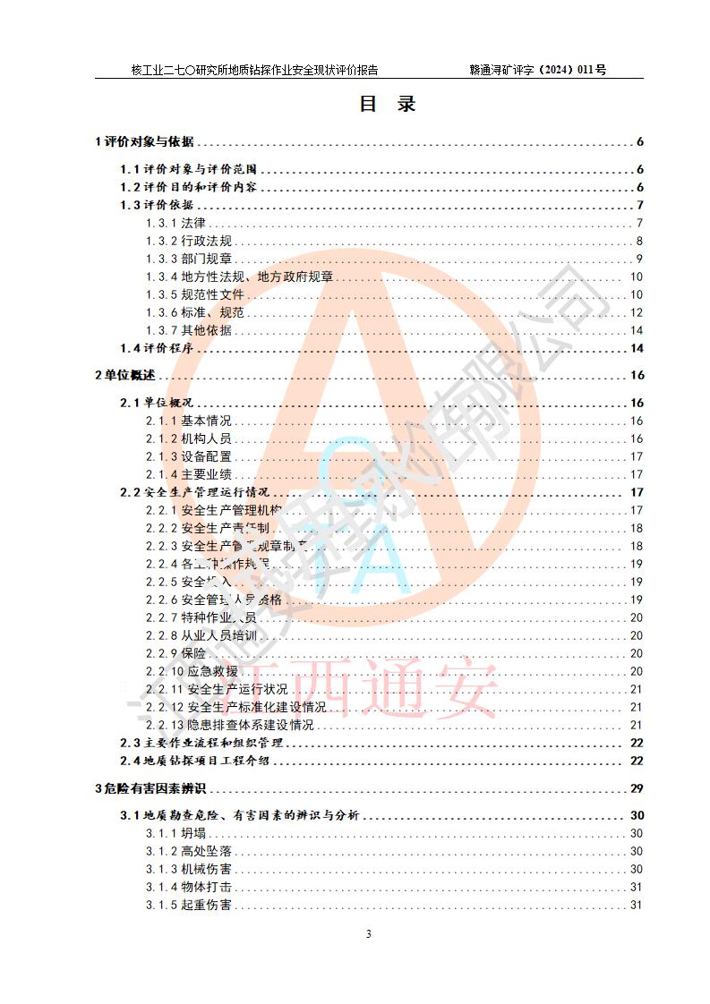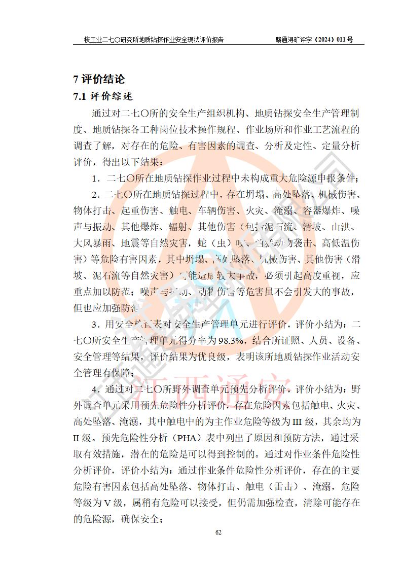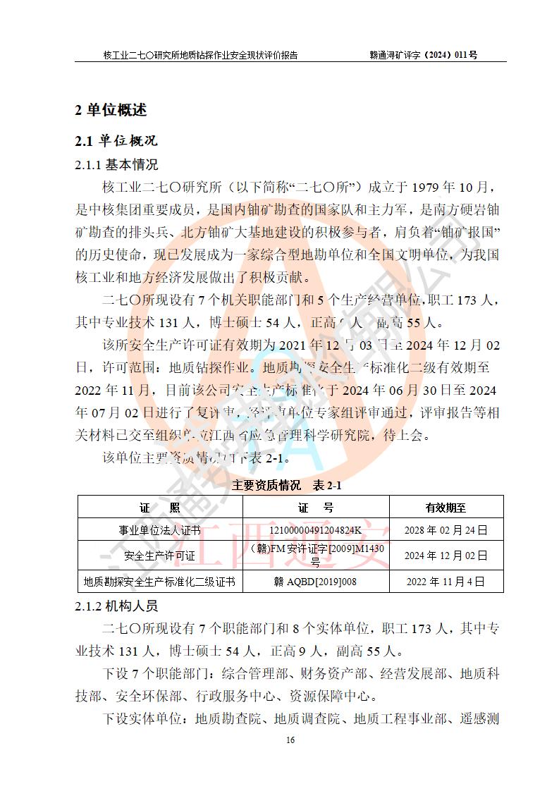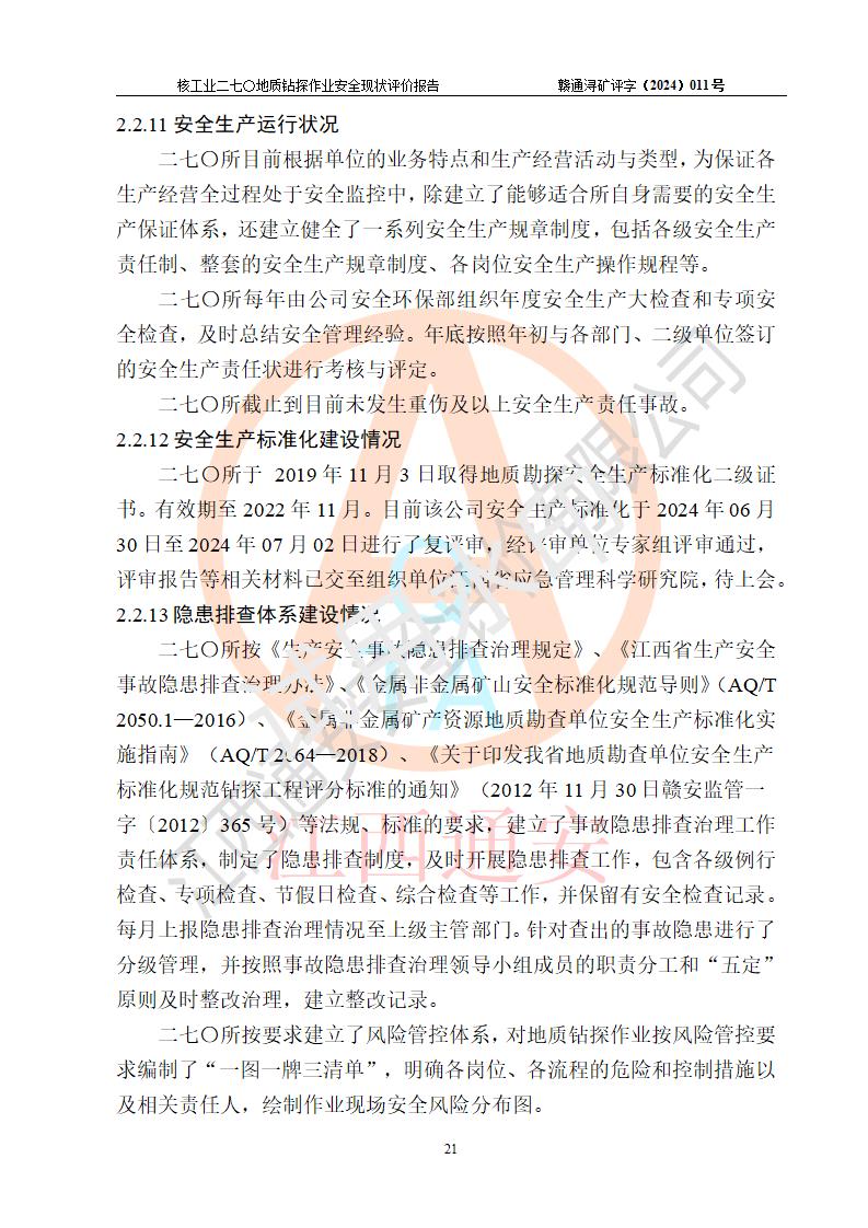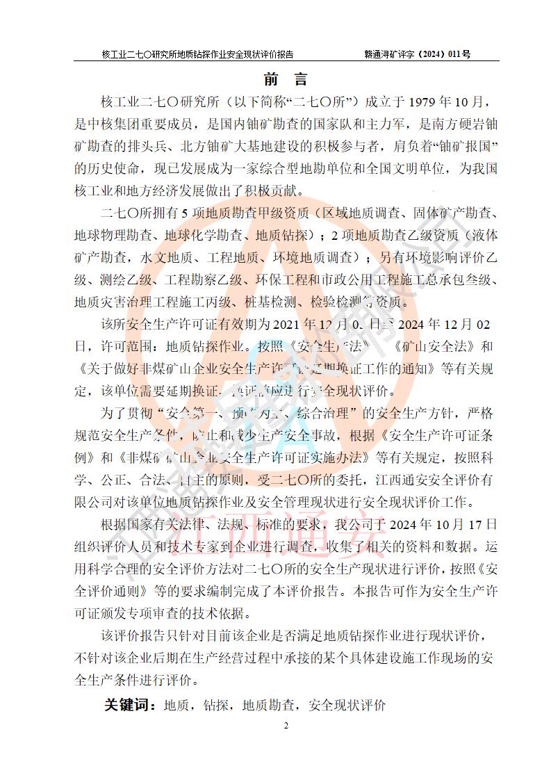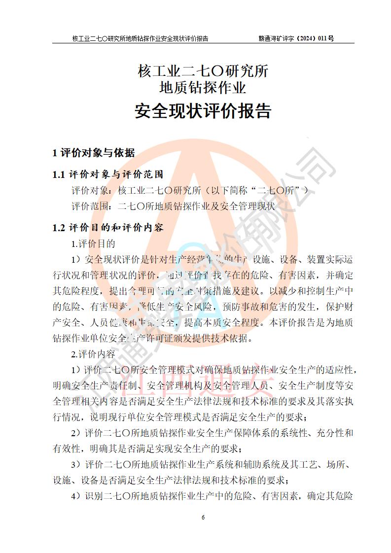 報(bào)告名稱 | 核工業(yè)二七〇研究所地質(zhì)鉆探作業(yè)安全現(xiàn)狀評(píng)價(jià)報(bào)告 | |||||