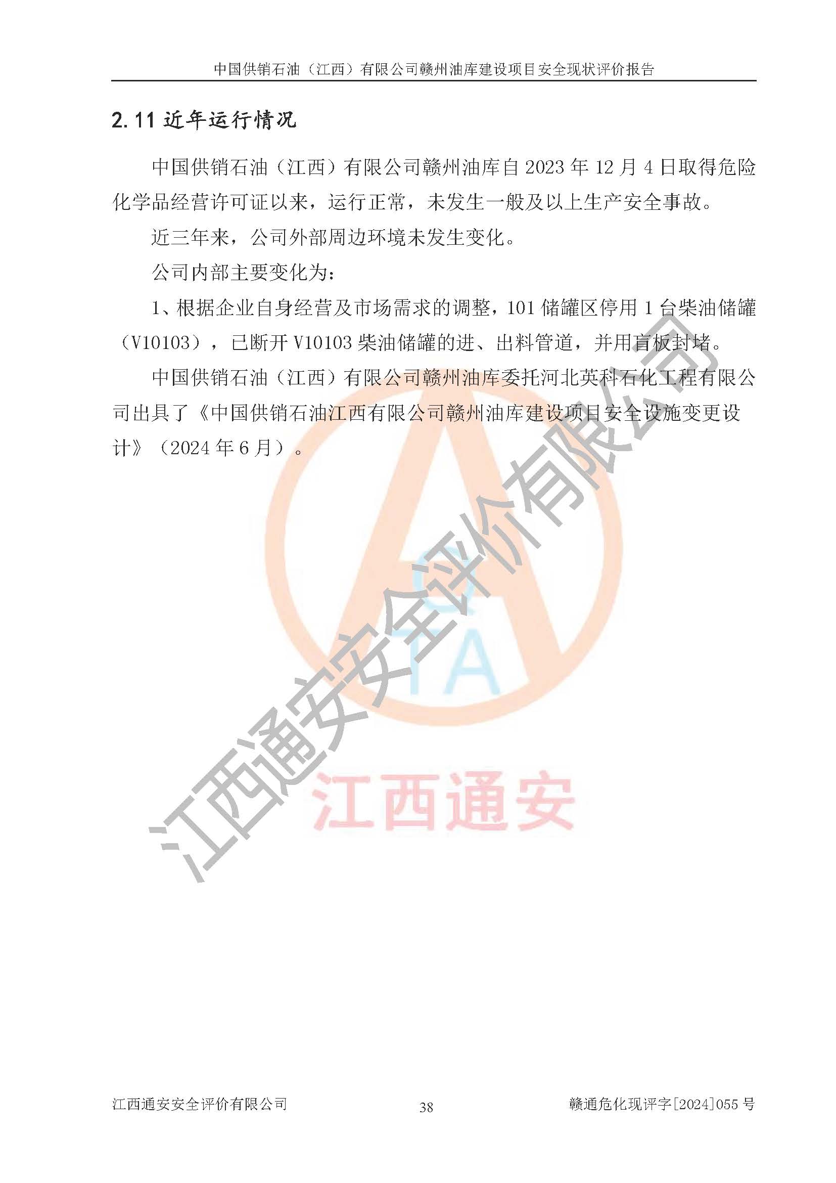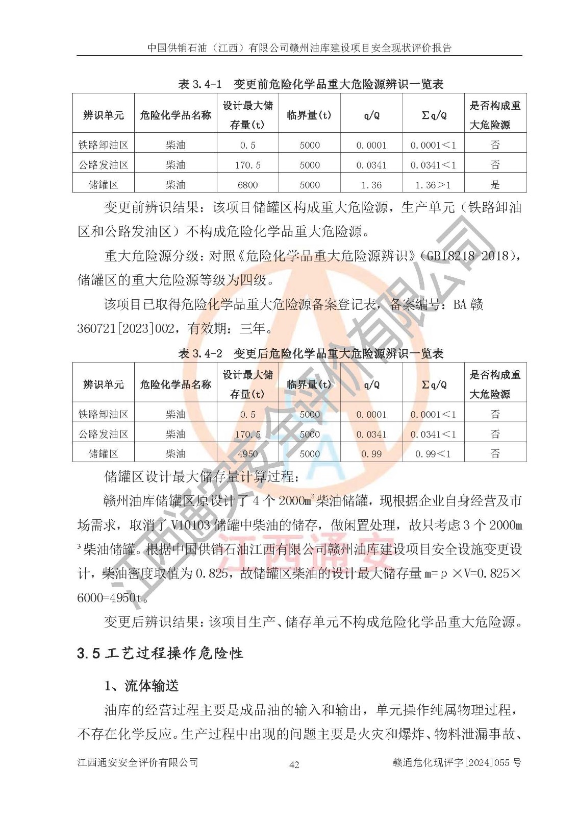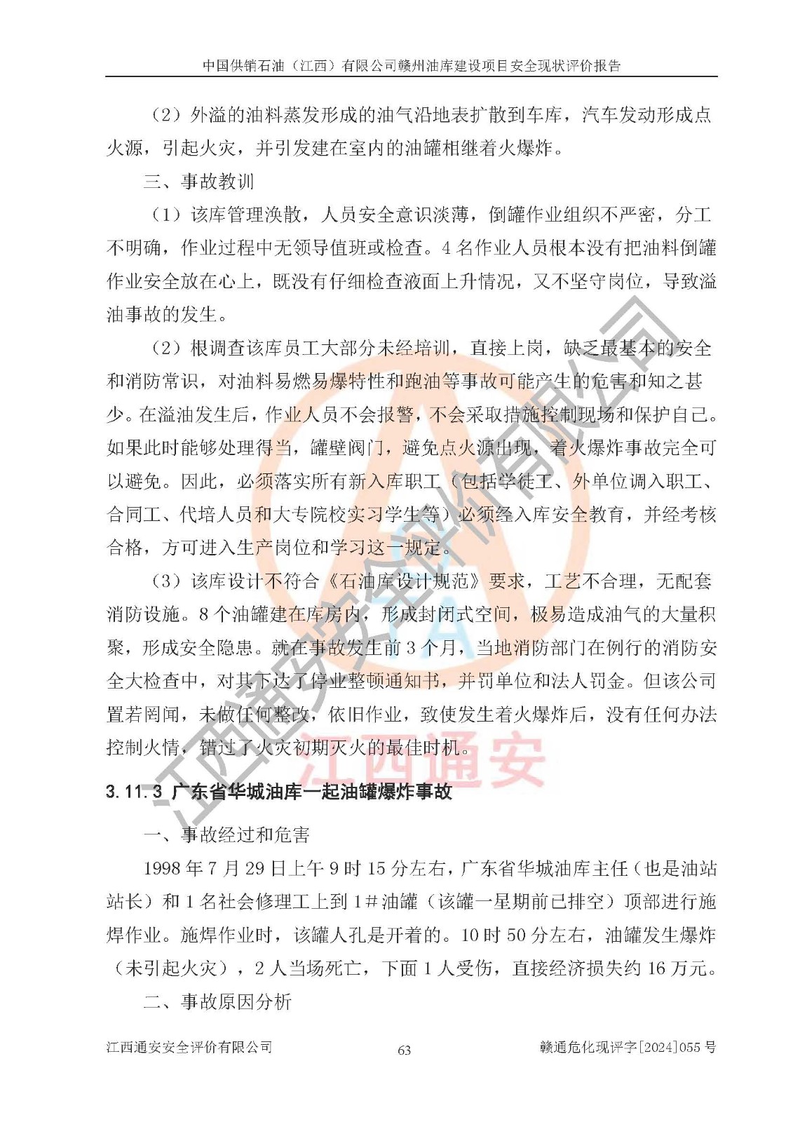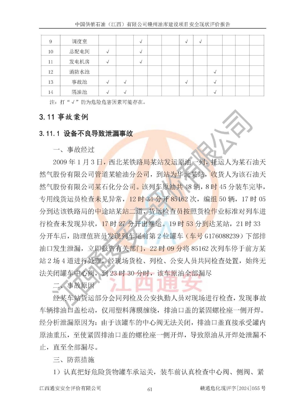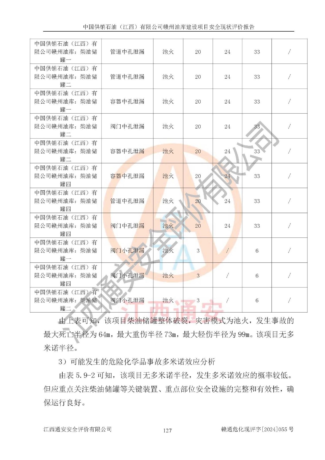 項目簡介 | 中國供銷石油(江西)有限公司贛州油庫位于江西省贛州市贛縣區(qū)梅林鎮(zhèn)雙龍村2-47號,負責人為王偉民,成立于2023年05月24日,營業(yè)執(zhí)照經(jīng)營范圍為成品油批發(fā)。該項目的油庫由中國供銷石油(江西)有限公司贛州油庫承租,并負責油庫后期運營及管理。 中國供銷石油(江西)有限公司贛州油庫占地面積約20000m2,油庫儲運油品為0#柴油,卸油方式為鐵路進油,內(nèi)設2000m3地上立式固定頂油罐4座,總?cè)萘?000m3,出油通過管道供給公路發(fā)油區(qū)裝卸設施。該油庫西北面設有卸油鐵路**線(設兩條卸車線),1處卸油棧橋,棧橋上設有卸油鶴管6個。根據(jù)《石油庫設計規(guī)范》(GB 50074-2014)第3.0.1條,0#柴油為丙A類液體,容量乘以系數(shù)0.5計入儲罐計算總?cè)萘?;該油庫儲罐計算總?cè)萘縏V為4000m3,為四級石油庫,庫內(nèi)設有公路發(fā)油區(qū)。 中國供銷石油(江西)有限公司贛州油庫建設項目2023年5月31日取得了項目備案通知書,委托江西贛安安全生產(chǎn)科學技術(shù)咨詢服務中心編制了項目安全條件評價報告,并取得了安全條件審查的批復,委托海灣工程有限公司編制了項目安全設施設計(2023年8月),并取得了安全設施設計審查的批復,月委托江西通安安全評價有限公司出具了項目安全驗收評價報告(2023年11月)。中國供銷石油(江西)有限公司贛州油庫2023年12月4日取得了危險化學品經(jīng)營許可證,證書編號:贛虔安經(jīng)(甲)字[2023]000032,經(jīng)營方式為帶有儲存設施經(jīng)營,許可范圍為柴油,**期2023年12月4日至2026年12月3日。該公司現(xiàn)有員工12人,其中專職安全管理人員1人。 中國供銷石油(江西)有限公司贛州油庫建設項目儲罐區(qū)設置了4個固定頂0#柴油儲罐,單罐容積為2000m3,總罐容積為8000m3,其中V10101儲罐主要供鐵路自用,其他三個V10102~4儲罐油品主要用于對外經(jīng)營。經(jīng)辨識,儲罐區(qū)構(gòu)成四級危險化學品重大危險源。根據(jù)企業(yè)自身經(jīng)營及市場需求的調(diào)整,在原有的三個V10102~4儲罐,現(xiàn)只保留兩個儲罐(V10102、V10104)油品用于對外經(jīng)營,故對V10103儲罐作閑置處理,不再用于油品儲存。本次變更降低了柴油的儲存量,進一步降低了事故風險。中國供銷石油(江西)有限公司贛州油庫委托河北英科石化工程有限公司進行了變更設計,并出具了《中國供銷石油江西有限公司贛州油庫建設項目安全設施變更設計》(2024年6月)。現(xiàn)場勘查時,企業(yè)已將V10103儲罐儲存的柴油發(fā)完,已斷開的進、出料管道,并用盲板封堵。 中國供銷石油(江西)有限公司贛州油庫建設項目經(jīng)營過程中涉及的物料為柴油。根據(jù)《危險化學品目錄》,該項目涉及的柴油屬于危險化學品。經(jīng)辨識,該項目不涉及監(jiān)控化學品、易制毒化學品、易制爆危險化學品、劇毒化學品、高毒物品、特別管控的危險化學品和重點監(jiān)管的危險化學品,不涉及重點監(jiān)管的危險化工工藝,生產(chǎn)、儲存單元不構(gòu)成危險化學品重大危險源。根據(jù)工藝特點及物料的理化特性可知,該項目經(jīng)營過程中存在火災與爆炸、中毒與窒息、觸電、機械傷害等危險有害因素。 | ||||||