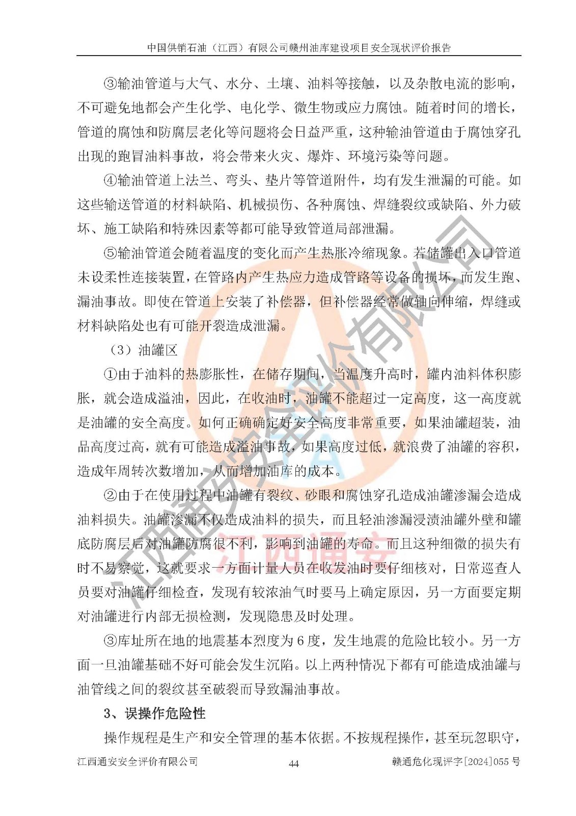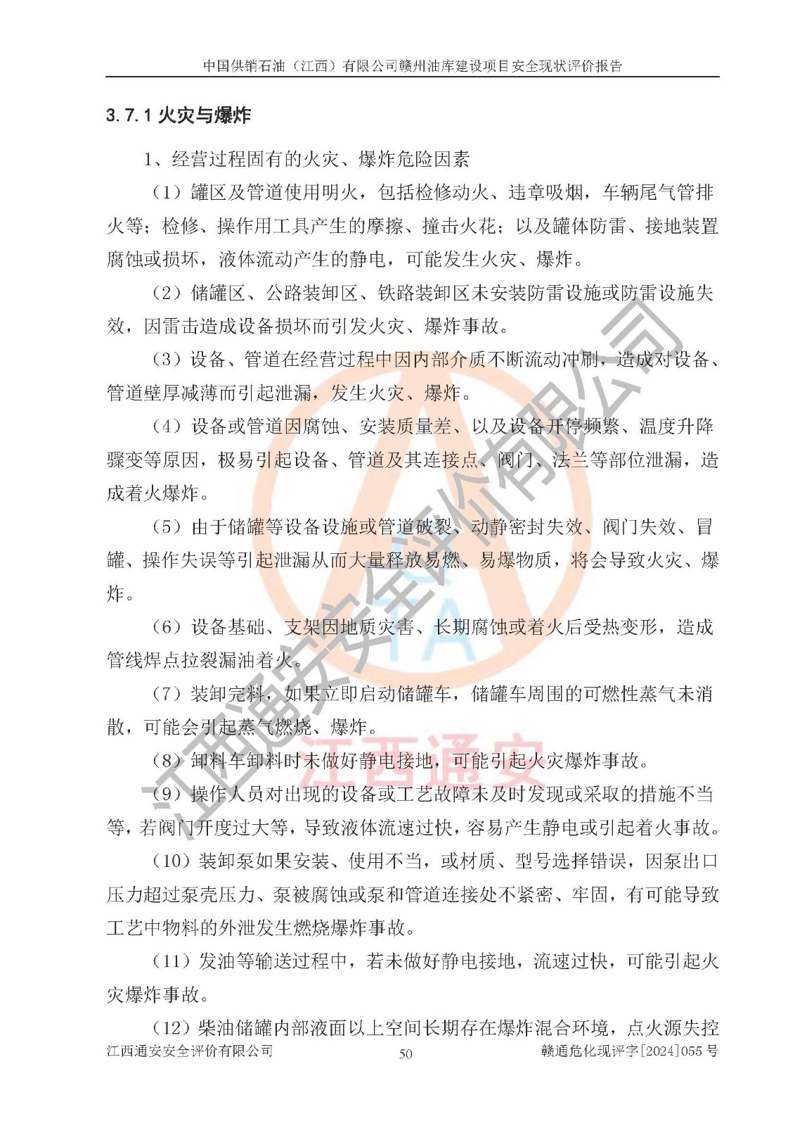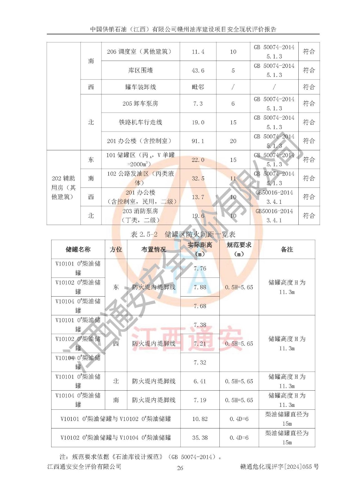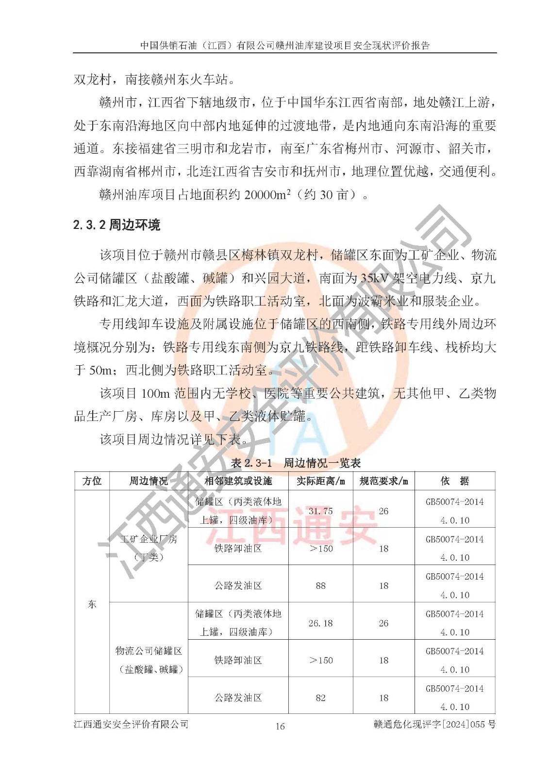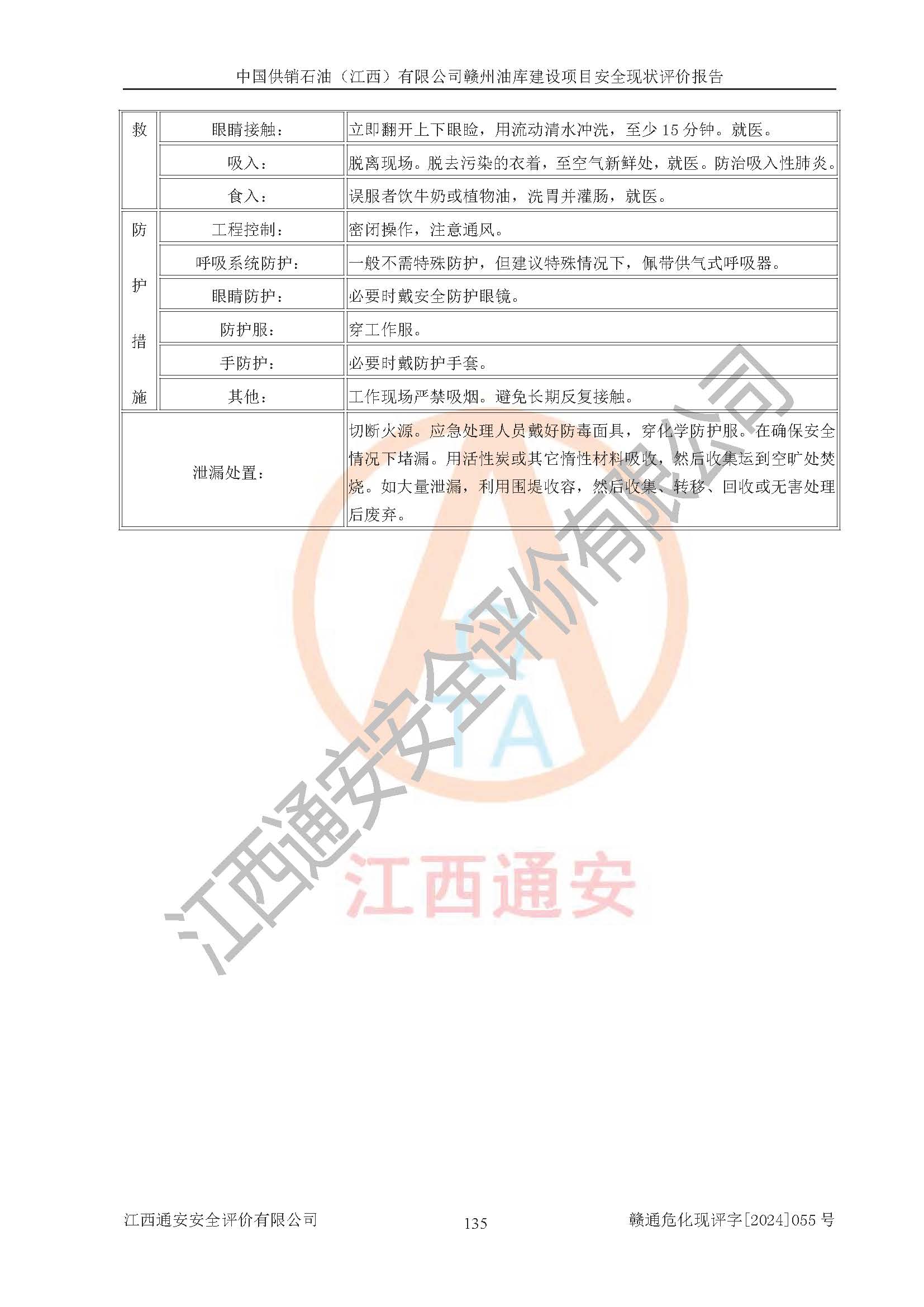 項目簡介 | 中國供銷石油(江西)有限公司贛州油庫位于江西省贛州市贛縣區(qū)梅林鎮(zhèn)雙龍村2-47號,負責人為王偉民,成立于2023年05月24日,營業(yè)執(zhí)照經(jīng)營范圍為成品油批發(fā)。該項目的油庫由中國供銷石油(江西)有限公司贛州油庫承租,并負責油庫后期運營及管理。 中國供銷石油(江西)有限公司贛州油庫占地面積約20000m2,油庫儲運油品為0#柴油,卸油方式為鐵路進油,內(nèi)設2000m3地上立式固定頂油罐4座,總?cè)萘?000m3,出油通過管道供給公路發(fā)油區(qū)裝卸設施。該油庫西北面設有卸油鐵路**線(設兩條卸車線),1處卸油棧橋,棧橋上設有卸油鶴管6個。根據(jù)《石油庫設計規(guī)范》(GB 50074-2014)第3.0.1條,0#柴油為丙A類液體,容量乘以系數(shù)0.5計入儲罐計算總?cè)萘?;該油庫儲罐計算總?cè)萘縏V為4000m3,為四級石油庫,庫內(nèi)設有公路發(fā)油區(qū)。 中國供銷石油(江西)有限公司贛州油庫建設項目2023年5月31日取得了項目備案通知書,委托江西贛安安全生產(chǎn)科學技術(shù)咨詢服務中心編制了項目安全條件評價報告,并取得了安全條件審查的批復,委托海灣工程有限公司編制了項目安全設施設計(2023年8月),并取得了安全設施設計審查的批復,月委托江西通安安全評價有限公司出具了項目安全驗收評價報告(2023年11月)。中國供銷石油(江西)有限公司贛州油庫2023年12月4日取得了危險化學品經(jīng)營許可證,證書編號:贛虔安經(jīng)(甲)字[2023]000032,經(jīng)營方式為帶有儲存設施經(jīng)營,許可范圍為柴油,**期2023年12月4日至2026年12月3日。該公司現(xiàn)有員工12人,其中專職安全管理人員1人。 中國供銷石油(江西)有限公司贛州油庫建設項目儲罐區(qū)設置了4個固定頂0#柴油儲罐,單罐容積為2000m3,總罐容積為8000m3,其中V10101儲罐主要供鐵路自用,其他三個V10102~4儲罐油品主要用于對外經(jīng)營。經(jīng)辨識,儲罐區(qū)構(gòu)成四級危險化學品重大危險源。根據(jù)企業(yè)自身經(jīng)營及市場需求的調(diào)整,在原有的三個V10102~4儲罐,現(xiàn)只保留兩個儲罐(V10102、V10104)油品用于對外經(jīng)營,故對V10103儲罐作閑置處理,不再用于油品儲存。本次變更降低了柴油的儲存量,進一步降低了事故風險。中國供銷石油(江西)有限公司贛州油庫委托河北英科石化工程有限公司進行了變更設計,并出具了《中國供銷石油江西有限公司贛州油庫建設項目安全設施變更設計》(2024年6月)。現(xiàn)場勘查時,企業(yè)已將V10103儲罐儲存的柴油發(fā)完,已斷開的進、出料管道,并用盲板封堵。 中國供銷石油(江西)有限公司贛州油庫建設項目經(jīng)營過程中涉及的物料為柴油。根據(jù)《危險化學品目錄》,該項目涉及的柴油屬于危險化學品。經(jīng)辨識,該項目不涉及監(jiān)控化學品、易制毒化學品、易制爆危險化學品、劇毒化學品、高毒物品、特別管控的危險化學品和重點監(jiān)管的危險化學品,不涉及重點監(jiān)管的危險化工工藝,生產(chǎn)、儲存單元不構(gòu)成危險化學品重大危險源。根據(jù)工藝特點及物料的理化特性可知,該項目經(jīng)營過程中存在火災與爆炸、中毒與窒息、觸電、機械傷害等危險有害因素。 | ||||||