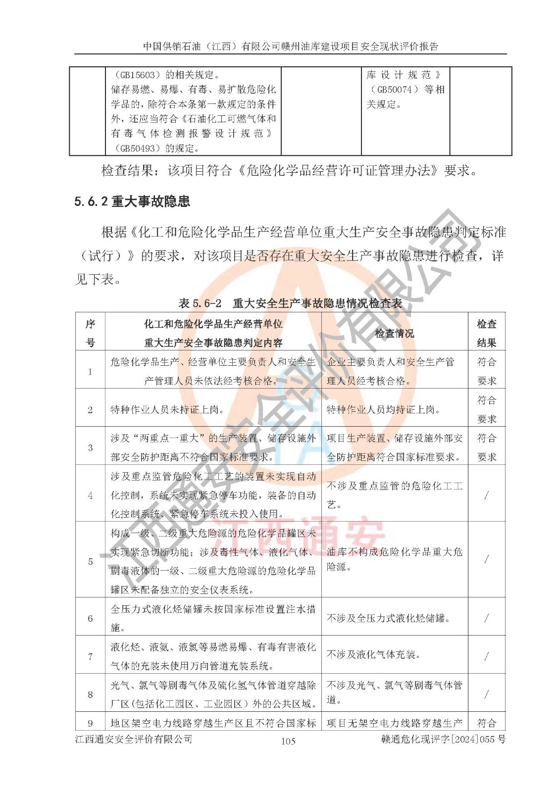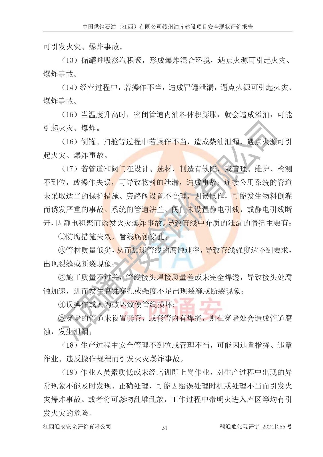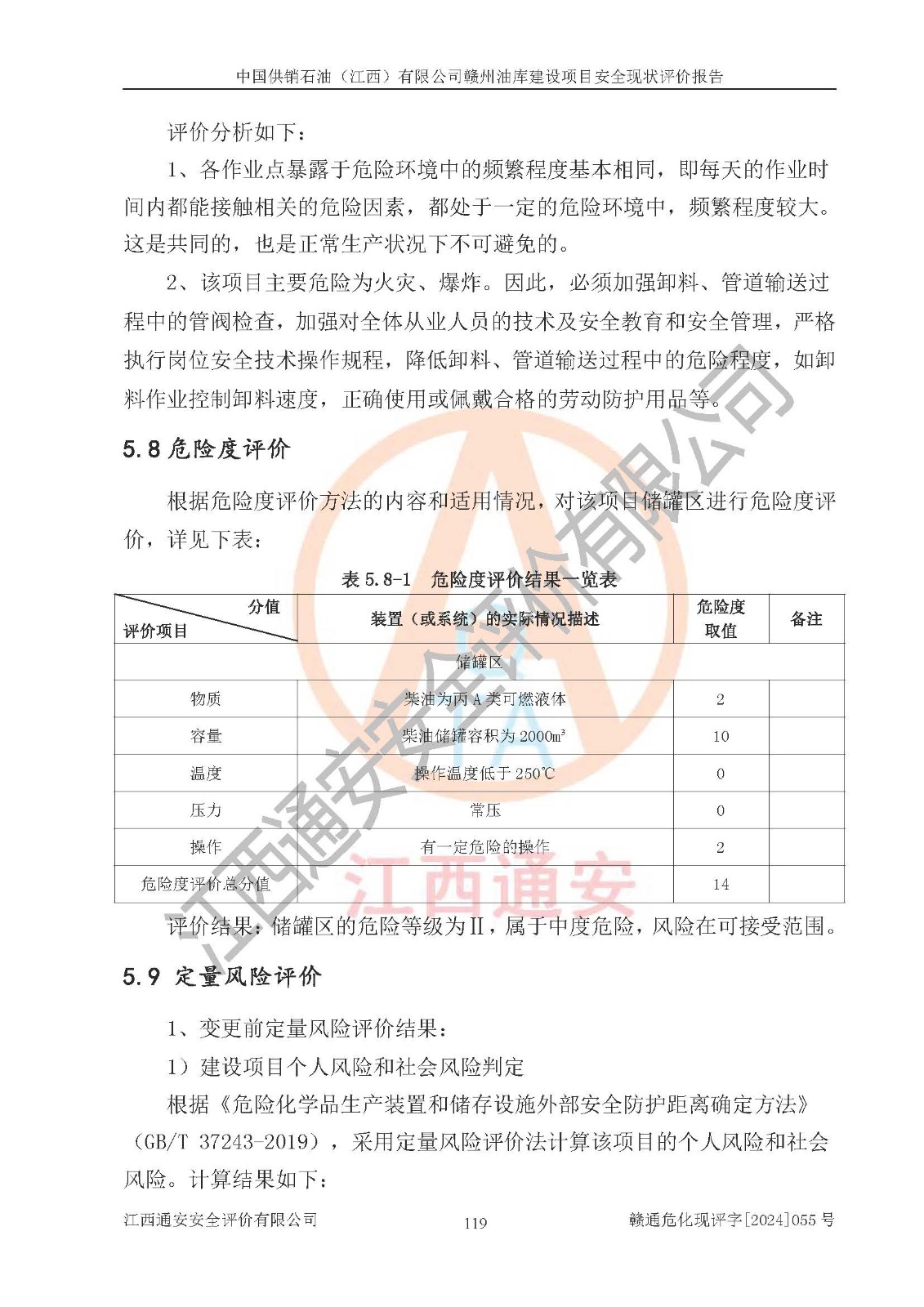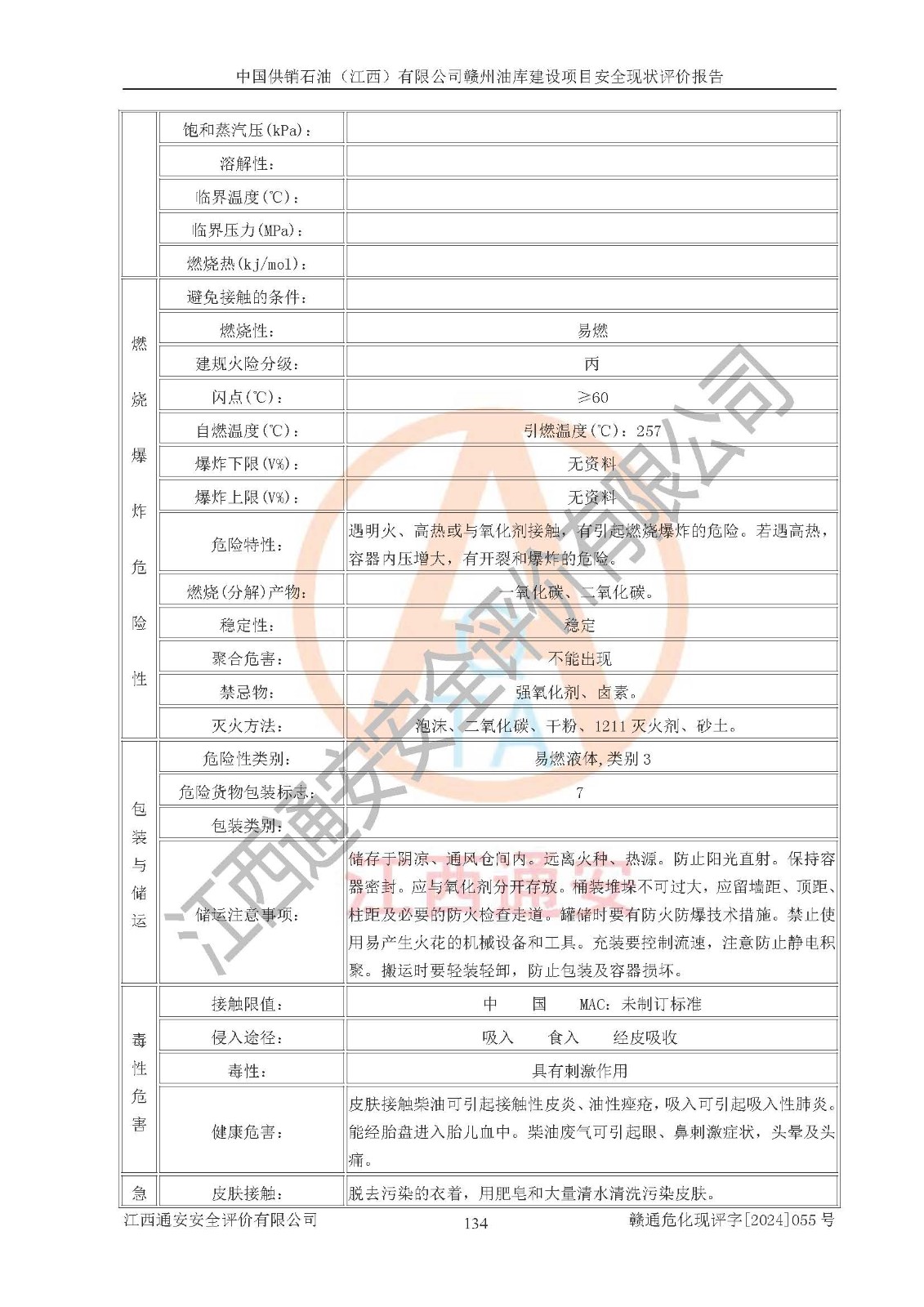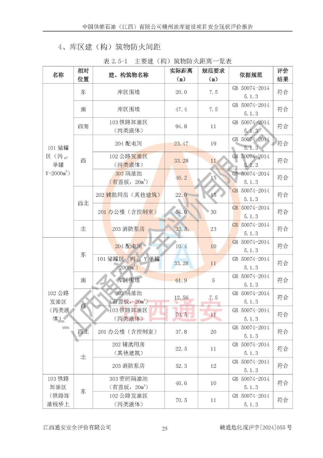 項目簡介 | 中國供銷石油(江西)有限公司贛州油庫位于江西省贛州市贛縣區(qū)梅林鎮(zhèn)雙龍村2-47號,負責人為王偉民,成立于2023年05月24日,營業(yè)執(zhí)照經(jīng)營范圍為成品油批發(fā)。該項目的油庫由中國供銷石油(江西)有限公司贛州油庫承租,并負責油庫后期運營及管理。 中國供銷石油(江西)有限公司贛州油庫占地面積約20000m2,油庫儲運油品為0#柴油,卸油方式為鐵路進油,內(nèi)設2000m3地上立式固定頂油罐4座,總?cè)萘?000m3,出油通過管道供給公路發(fā)油區(qū)裝卸設施。該油庫西北面設有卸油鐵路**線(設兩條卸車線),1處卸油棧橋,棧橋上設有卸油鶴管6個。根據(jù)《石油庫設計規(guī)范》(GB 50074-2014)第3.0.1條,0#柴油為丙A類液體,容量乘以系數(shù)0.5計入儲罐計算總?cè)萘?;該油庫儲罐計算總?cè)萘縏V為4000m3,為四級石油庫,庫內(nèi)設有公路發(fā)油區(qū)。 中國供銷石油(江西)有限公司贛州油庫建設項目2023年5月31日取得了項目備案通知書,委托江西贛安安全生產(chǎn)科學技術(shù)咨詢服務中心編制了項目安全條件評價報告,并取得了安全條件審查的批復,委托海灣工程有限公司編制了項目安全設施設計(2023年8月),并取得了安全設施設計審查的批復,月委托江西通安安全評價有限公司出具了項目安全驗收評價報告(2023年11月)。中國供銷石油(江西)有限公司贛州油庫2023年12月4日取得了危險化學品經(jīng)營許可證,證書編號:贛虔安經(jīng)(甲)字[2023]000032,經(jīng)營方式為帶有儲存設施經(jīng)營,許可范圍為柴油,**期2023年12月4日至2026年12月3日。該公司現(xiàn)有員工12人,其中專職安全管理人員1人。 中國供銷石油(江西)有限公司贛州油庫建設項目儲罐區(qū)設置了4個固定頂0#柴油儲罐,單罐容積為2000m3,總罐容積為8000m3,其中V10101儲罐主要供鐵路自用,其他三個V10102~4儲罐油品主要用于對外經(jīng)營。經(jīng)辨識,儲罐區(qū)構(gòu)成四級危險化學品重大危險源。根據(jù)企業(yè)自身經(jīng)營及市場需求的調(diào)整,在原有的三個V10102~4儲罐,現(xiàn)只保留兩個儲罐(V10102、V10104)油品用于對外經(jīng)營,故對V10103儲罐作閑置處理,不再用于油品儲存。本次變更降低了柴油的儲存量,進一步降低了事故風險。中國供銷石油(江西)有限公司贛州油庫委托河北英科石化工程有限公司進行了變更設計,并出具了《中國供銷石油江西有限公司贛州油庫建設項目安全設施變更設計》(2024年6月)。現(xiàn)場勘查時,企業(yè)已將V10103儲罐儲存的柴油發(fā)完,已斷開的進、出料管道,并用盲板封堵。 中國供銷石油(江西)有限公司贛州油庫建設項目經(jīng)營過程中涉及的物料為柴油。根據(jù)《危險化學品目錄》,該項目涉及的柴油屬于危險化學品。經(jīng)辨識,該項目不涉及監(jiān)控化學品、易制毒化學品、易制爆危險化學品、劇毒化學品、高毒物品、特別管控的危險化學品和重點監(jiān)管的危險化學品,不涉及重點監(jiān)管的危險化工工藝,生產(chǎn)、儲存單元不構(gòu)成危險化學品重大危險源。根據(jù)工藝特點及物料的理化特性可知,該項目經(jīng)營過程中存在火災與爆炸、中毒與窒息、觸電、機械傷害等危險有害因素。 | ||||||