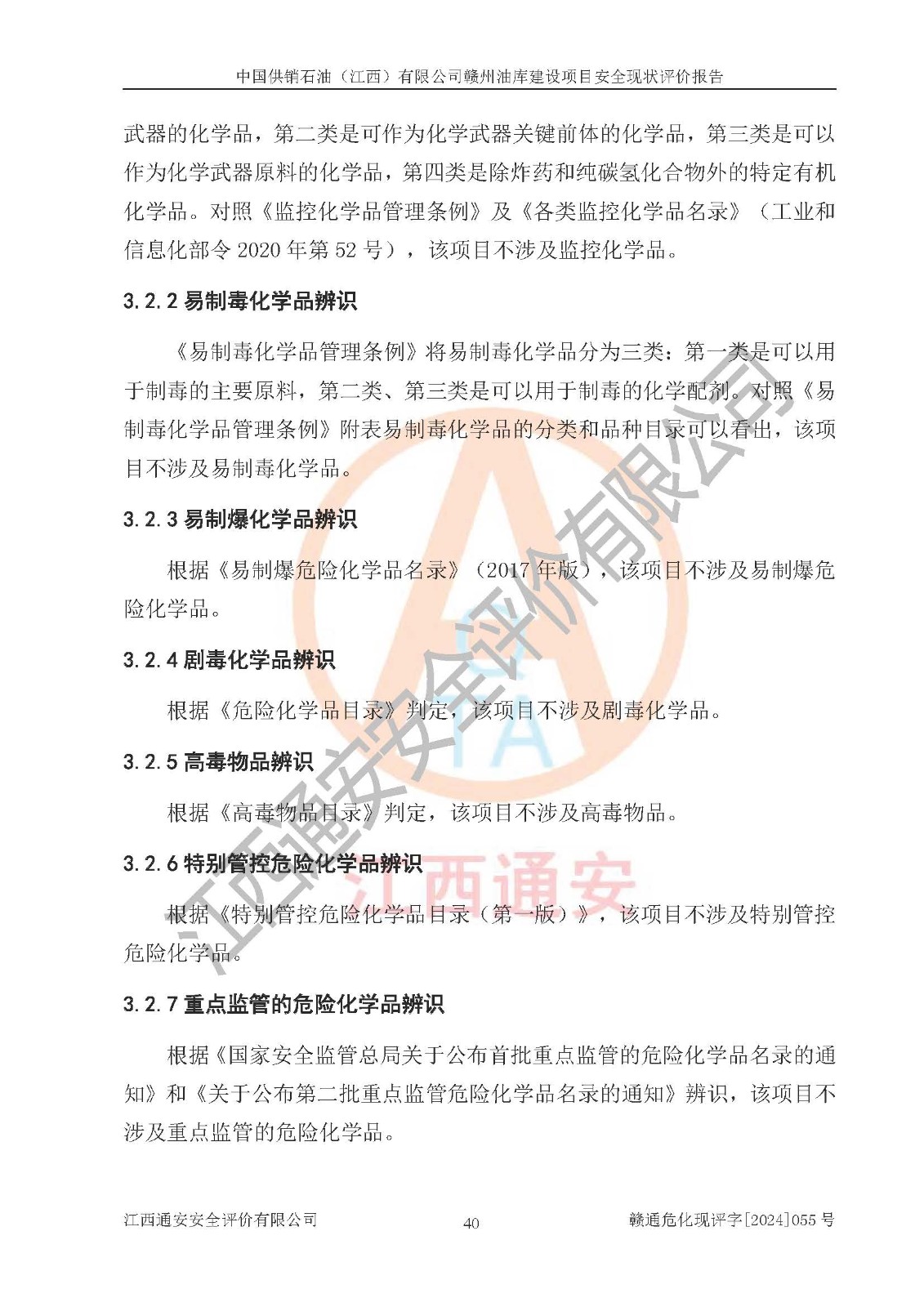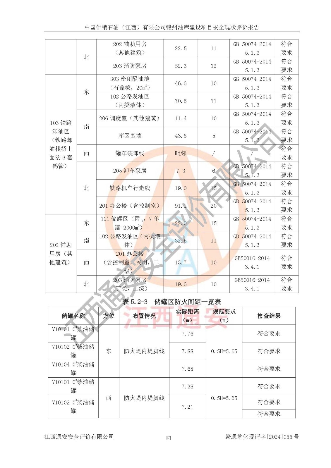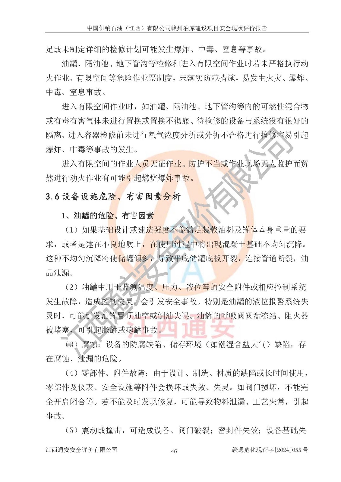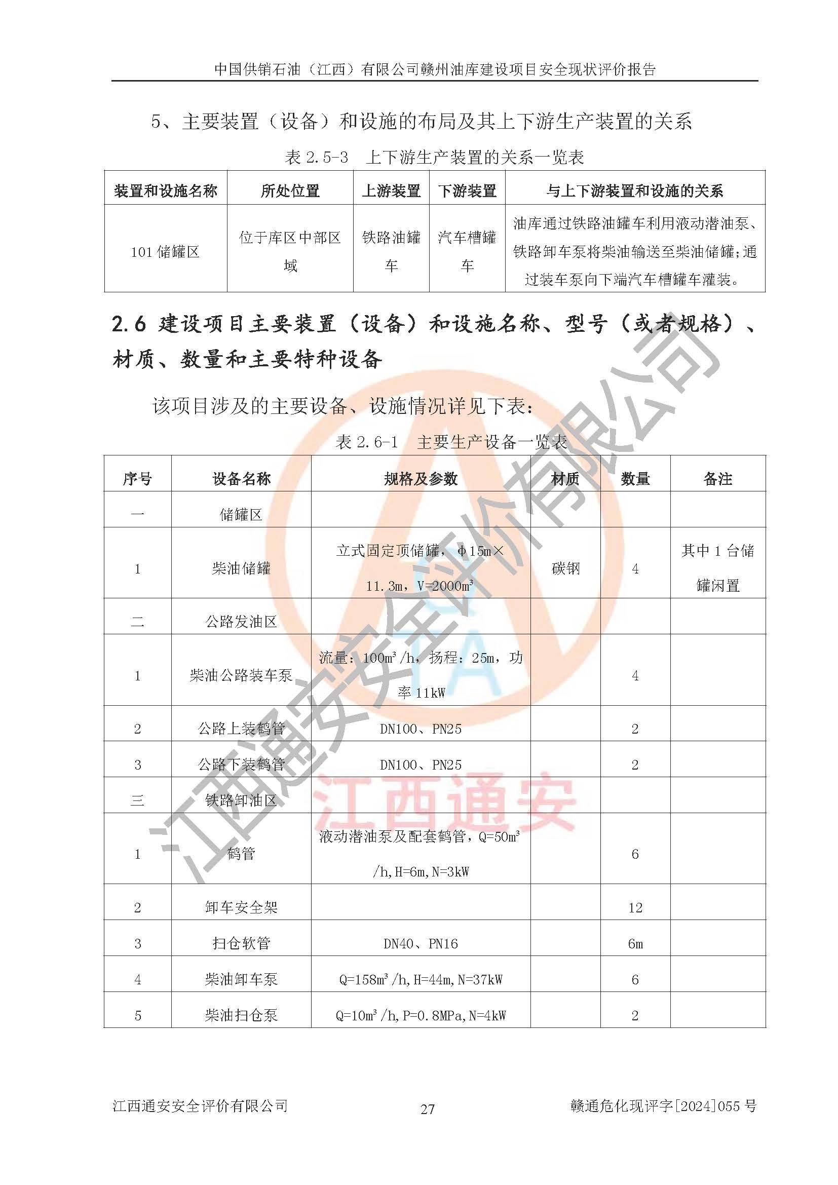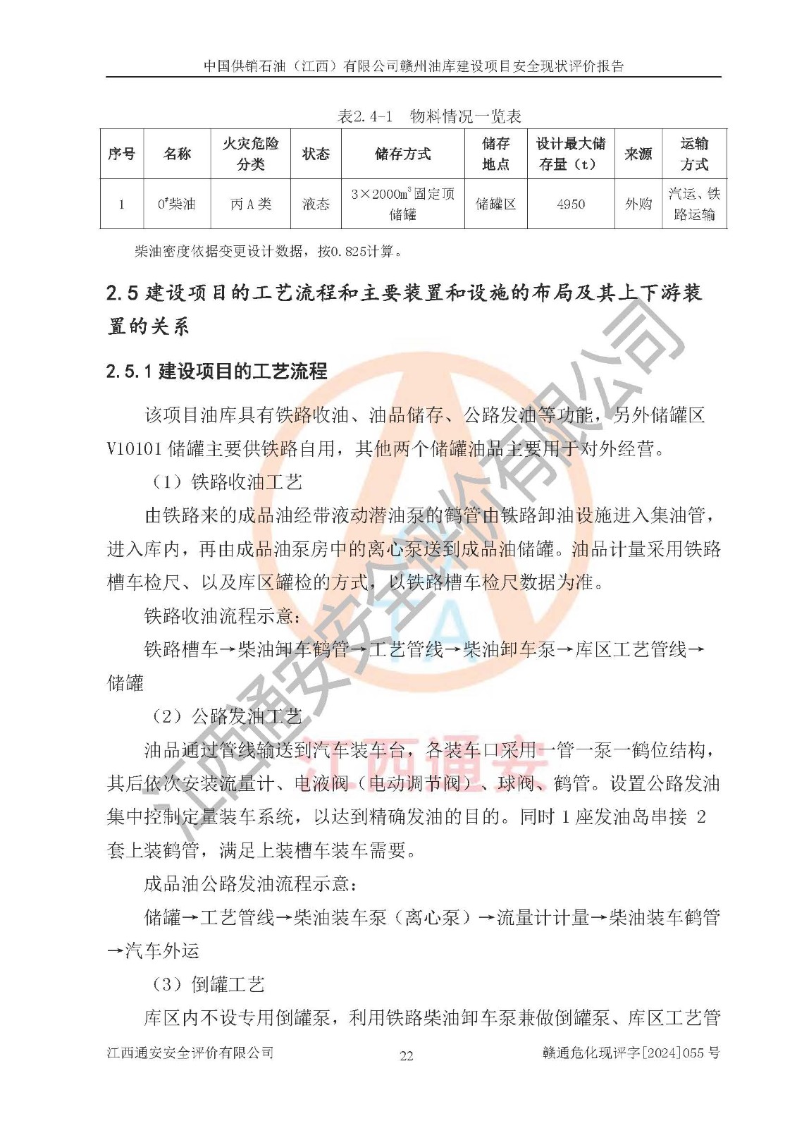 項目簡介 | 中國供銷石油(江西)有限公司贛州油庫位于江西省贛州市贛縣區(qū)梅林鎮(zhèn)雙龍村2-47號,負責人為王偉民,成立于2023年05月24日,營業(yè)執(zhí)照經(jīng)營范圍為成品油批發(fā)。該項目的油庫由中國供銷石油(江西)有限公司贛州油庫承租,并負責油庫后期運營及管理。 中國供銷石油(江西)有限公司贛州油庫占地面積約20000m2,油庫儲運油品為0#柴油,卸油方式為鐵路進油,內(nèi)設2000m3地上立式固定頂油罐4座,總?cè)萘?000m3,出油通過管道供給公路發(fā)油區(qū)裝卸設施。該油庫西北面設有卸油鐵路**線(設兩條卸車線),1處卸油棧橋,棧橋上設有卸油鶴管6個。根據(jù)《石油庫設計規(guī)范》(GB 50074-2014)第3.0.1條,0#柴油為丙A類液體,容量乘以系數(shù)0.5計入儲罐計算總?cè)萘?;該油庫儲罐計算總?cè)萘縏V為4000m3,為四級石油庫,庫內(nèi)設有公路發(fā)油區(qū)。 中國供銷石油(江西)有限公司贛州油庫建設項目2023年5月31日取得了項目備案通知書,委托江西贛安安全生產(chǎn)科學技術(shù)咨詢服務中心編制了項目安全條件評價報告,并取得了安全條件審查的批復,委托海灣工程有限公司編制了項目安全設施設計(2023年8月),并取得了安全設施設計審查的批復,月委托江西通安安全評價有限公司出具了項目安全驗收評價報告(2023年11月)。中國供銷石油(江西)有限公司贛州油庫2023年12月4日取得了危險化學品經(jīng)營許可證,證書編號:贛虔安經(jīng)(甲)字[2023]000032,經(jīng)營方式為帶有儲存設施經(jīng)營,許可范圍為柴油,**期2023年12月4日至2026年12月3日。該公司現(xiàn)有員工12人,其中專職安全管理人員1人。 中國供銷石油(江西)有限公司贛州油庫建設項目儲罐區(qū)設置了4個固定頂0#柴油儲罐,單罐容積為2000m3,總罐容積為8000m3,其中V10101儲罐主要供鐵路自用,其他三個V10102~4儲罐油品主要用于對外經(jīng)營。經(jīng)辨識,儲罐區(qū)構(gòu)成四級危險化學品重大危險源。根據(jù)企業(yè)自身經(jīng)營及市場需求的調(diào)整,在原有的三個V10102~4儲罐,現(xiàn)只保留兩個儲罐(V10102、V10104)油品用于對外經(jīng)營,故對V10103儲罐作閑置處理,不再用于油品儲存。本次變更降低了柴油的儲存量,進一步降低了事故風險。中國供銷石油(江西)有限公司贛州油庫委托河北英科石化工程有限公司進行了變更設計,并出具了《中國供銷石油江西有限公司贛州油庫建設項目安全設施變更設計》(2024年6月)。現(xiàn)場勘查時,企業(yè)已將V10103儲罐儲存的柴油發(fā)完,已斷開的進、出料管道,并用盲板封堵。 中國供銷石油(江西)有限公司贛州油庫建設項目經(jīng)營過程中涉及的物料為柴油。根據(jù)《危險化學品目錄》,該項目涉及的柴油屬于危險化學品。經(jīng)辨識,該項目不涉及監(jiān)控化學品、易制毒化學品、易制爆危險化學品、劇毒化學品、高毒物品、特別管控的危險化學品和重點監(jiān)管的危險化學品,不涉及重點監(jiān)管的危險化工工藝,生產(chǎn)、儲存單元不構(gòu)成危險化學品重大危險源。根據(jù)工藝特點及物料的理化特性可知,該項目經(jīng)營過程中存在火災與爆炸、中毒與窒息、觸電、機械傷害等危險有害因素。 | ||||||