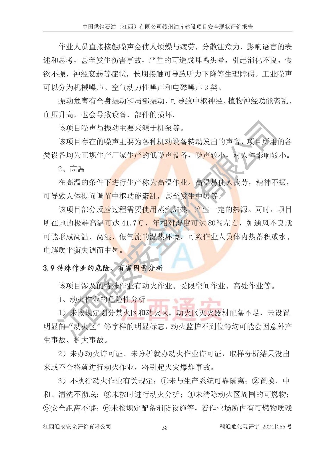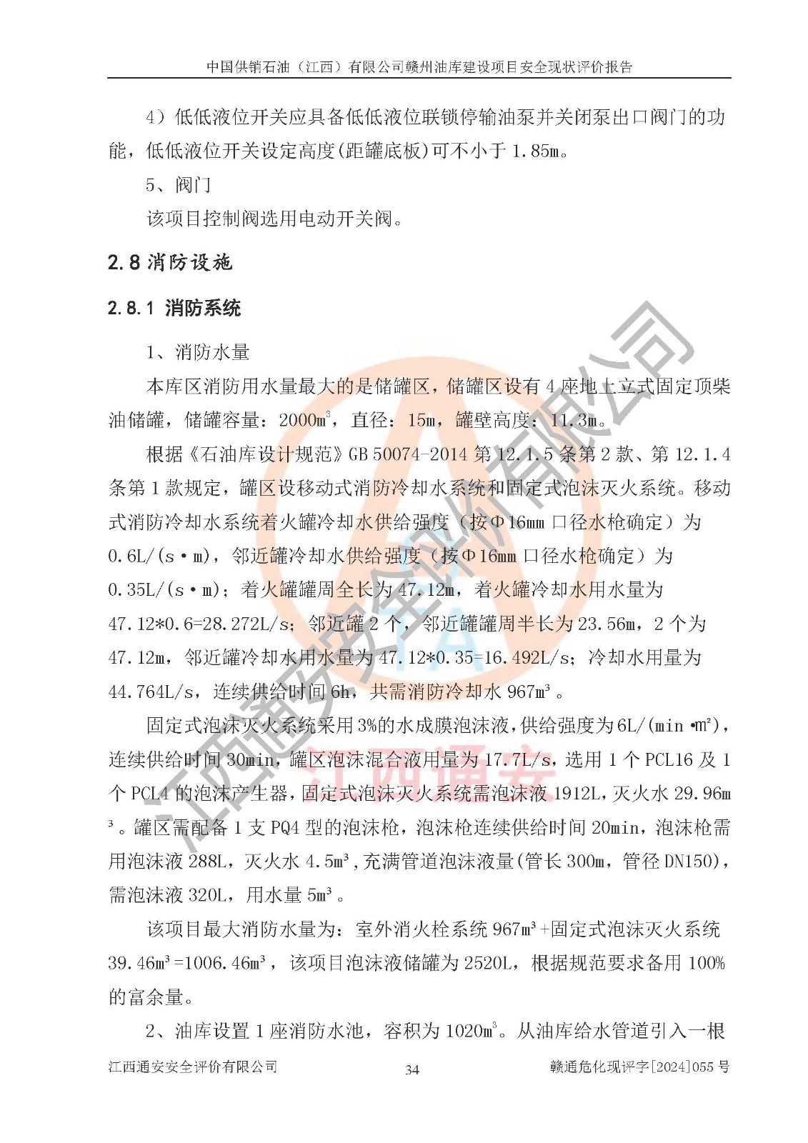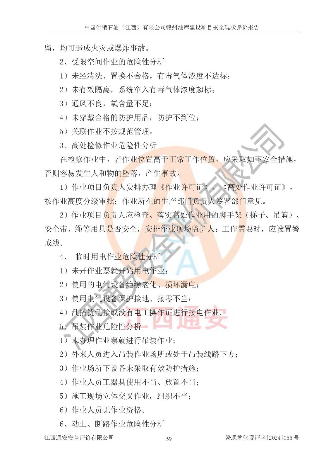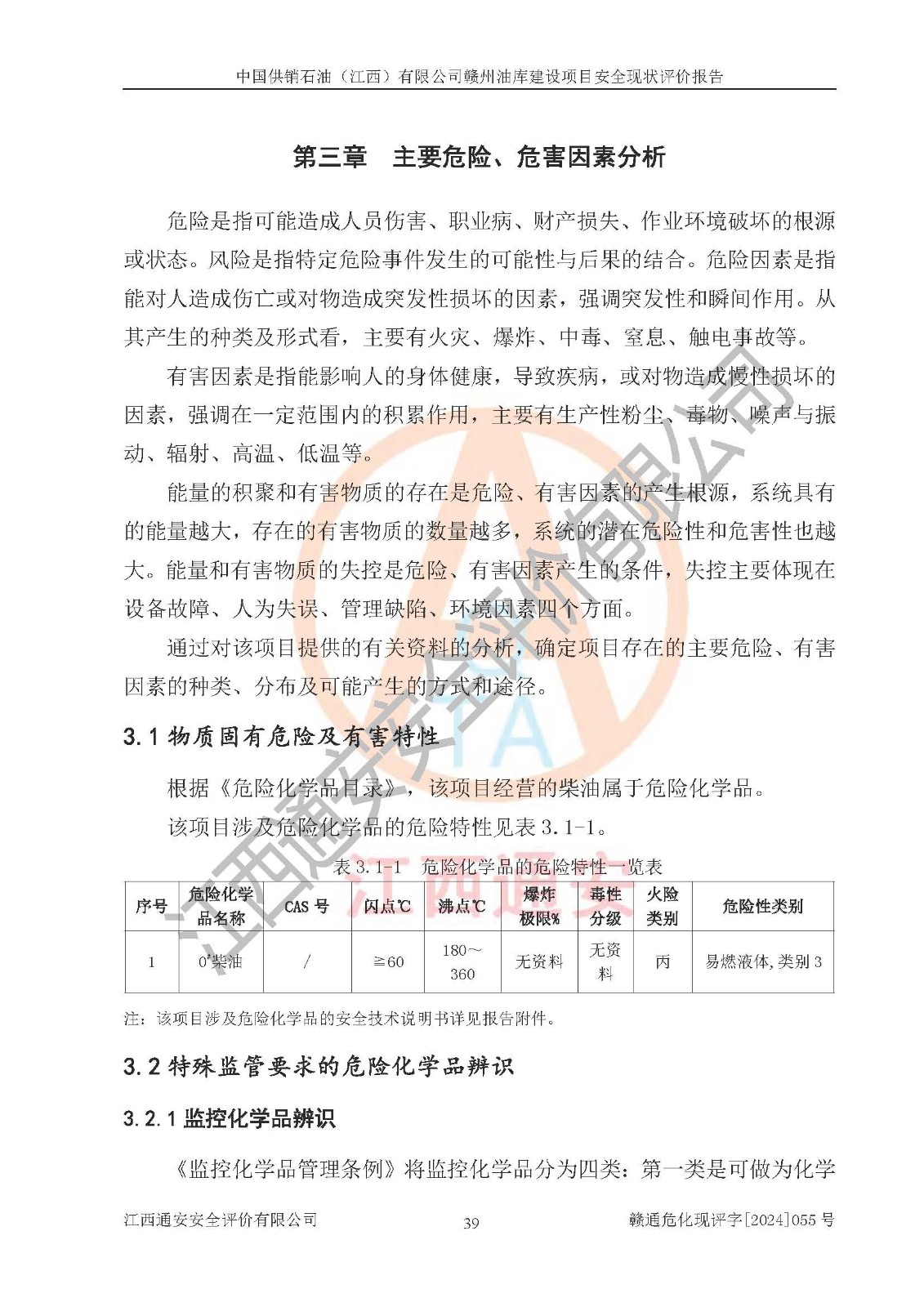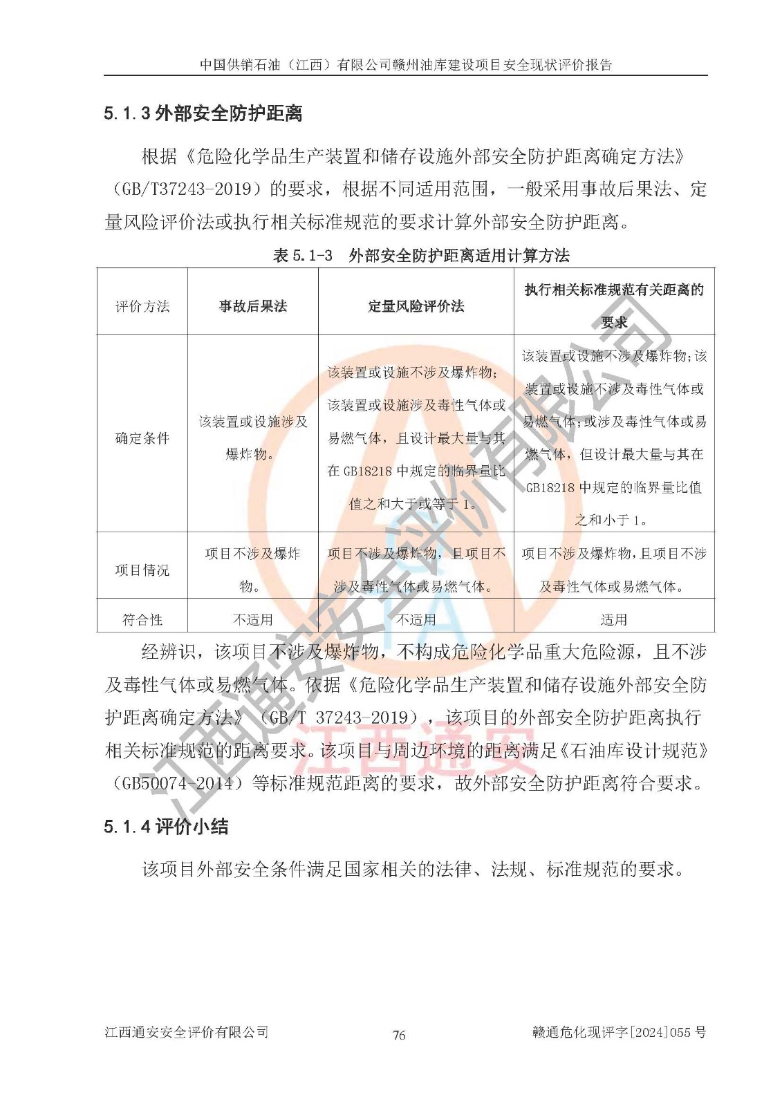 項目簡介 | 中國供銷石油(江西)有限公司贛州油庫位于江西省贛州市贛縣區(qū)梅林鎮(zhèn)雙龍村2-47號,負責人為王偉民,成立于2023年05月24日,營業(yè)執(zhí)照經(jīng)營范圍為成品油批發(fā)。該項目的油庫由中國供銷石油(江西)有限公司贛州油庫承租,并負責油庫后期運營及管理。 中國供銷石油(江西)有限公司贛州油庫占地面積約20000m2,油庫儲運油品為0#柴油,卸油方式為鐵路進油,內(nèi)設2000m3地上立式固定頂油罐4座,總?cè)萘?000m3,出油通過管道供給公路發(fā)油區(qū)裝卸設施。該油庫西北面設有卸油鐵路**線(設兩條卸車線),1處卸油棧橋,棧橋上設有卸油鶴管6個。根據(jù)《石油庫設計規(guī)范》(GB 50074-2014)第3.0.1條,0#柴油為丙A類液體,容量乘以系數(shù)0.5計入儲罐計算總?cè)萘?;該油庫儲罐計算總?cè)萘縏V為4000m3,為四級石油庫,庫內(nèi)設有公路發(fā)油區(qū)。 中國供銷石油(江西)有限公司贛州油庫建設項目2023年5月31日取得了項目備案通知書,委托江西贛安安全生產(chǎn)科學技術(shù)咨詢服務中心編制了項目安全條件評價報告,并取得了安全條件審查的批復,委托海灣工程有限公司編制了項目安全設施設計(2023年8月),并取得了安全設施設計審查的批復,月委托江西通安安全評價有限公司出具了項目安全驗收評價報告(2023年11月)。中國供銷石油(江西)有限公司贛州油庫2023年12月4日取得了危險化學品經(jīng)營許可證,證書編號:贛虔安經(jīng)(甲)字[2023]000032,經(jīng)營方式為帶有儲存設施經(jīng)營,許可范圍為柴油,**期2023年12月4日至2026年12月3日。該公司現(xiàn)有員工12人,其中專職安全管理人員1人。 中國供銷石油(江西)有限公司贛州油庫建設項目儲罐區(qū)設置了4個固定頂0#柴油儲罐,單罐容積為2000m3,總罐容積為8000m3,其中V10101儲罐主要供鐵路自用,其他三個V10102~4儲罐油品主要用于對外經(jīng)營。經(jīng)辨識,儲罐區(qū)構(gòu)成四級危險化學品重大危險源。根據(jù)企業(yè)自身經(jīng)營及市場需求的調(diào)整,在原有的三個V10102~4儲罐,現(xiàn)只保留兩個儲罐(V10102、V10104)油品用于對外經(jīng)營,故對V10103儲罐作閑置處理,不再用于油品儲存。本次變更降低了柴油的儲存量,進一步降低了事故風險。中國供銷石油(江西)有限公司贛州油庫委托河北英科石化工程有限公司進行了變更設計,并出具了《中國供銷石油江西有限公司贛州油庫建設項目安全設施變更設計》(2024年6月)。現(xiàn)場勘查時,企業(yè)已將V10103儲罐儲存的柴油發(fā)完,已斷開的進、出料管道,并用盲板封堵。 中國供銷石油(江西)有限公司贛州油庫建設項目經(jīng)營過程中涉及的物料為柴油。根據(jù)《危險化學品目錄》,該項目涉及的柴油屬于危險化學品。經(jīng)辨識,該項目不涉及監(jiān)控化學品、易制毒化學品、易制爆危險化學品、劇毒化學品、高毒物品、特別管控的危險化學品和重點監(jiān)管的危險化學品,不涉及重點監(jiān)管的危險化工工藝,生產(chǎn)、儲存單元不構(gòu)成危險化學品重大危險源。根據(jù)工藝特點及物料的理化特性可知,該項目經(jīng)營過程中存在火災與爆炸、中毒與窒息、觸電、機械傷害等危險有害因素。 | ||||||