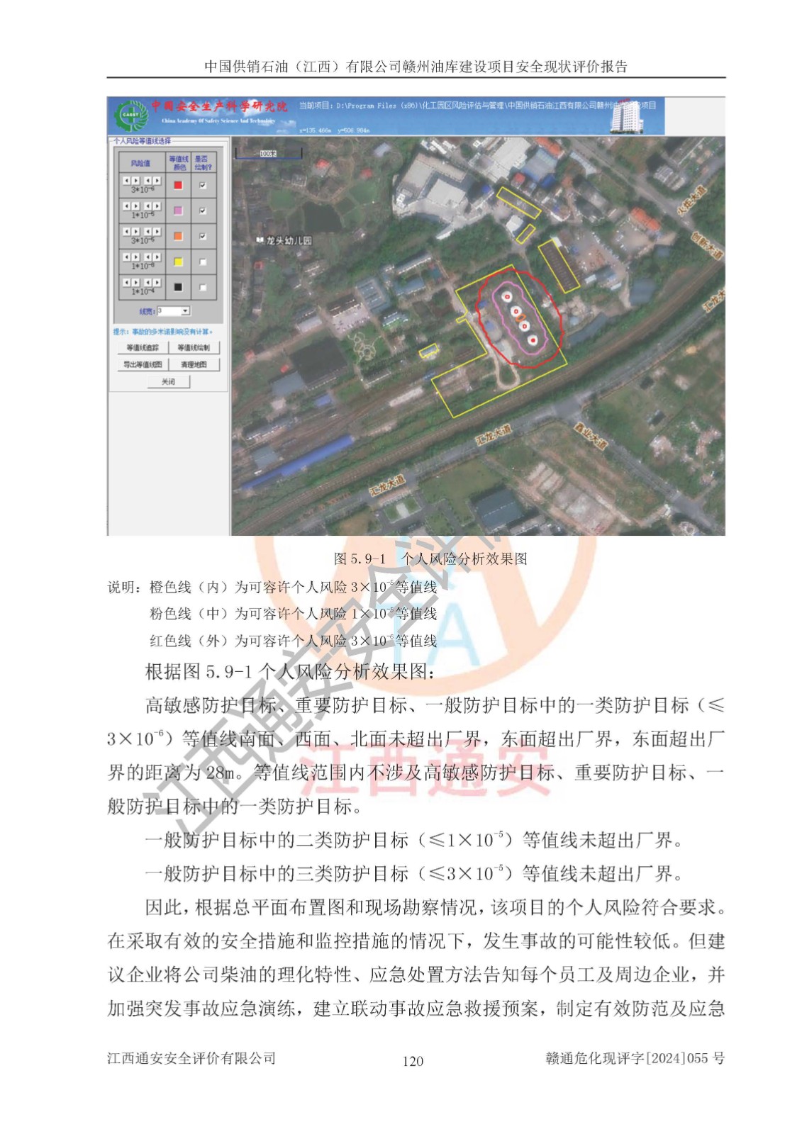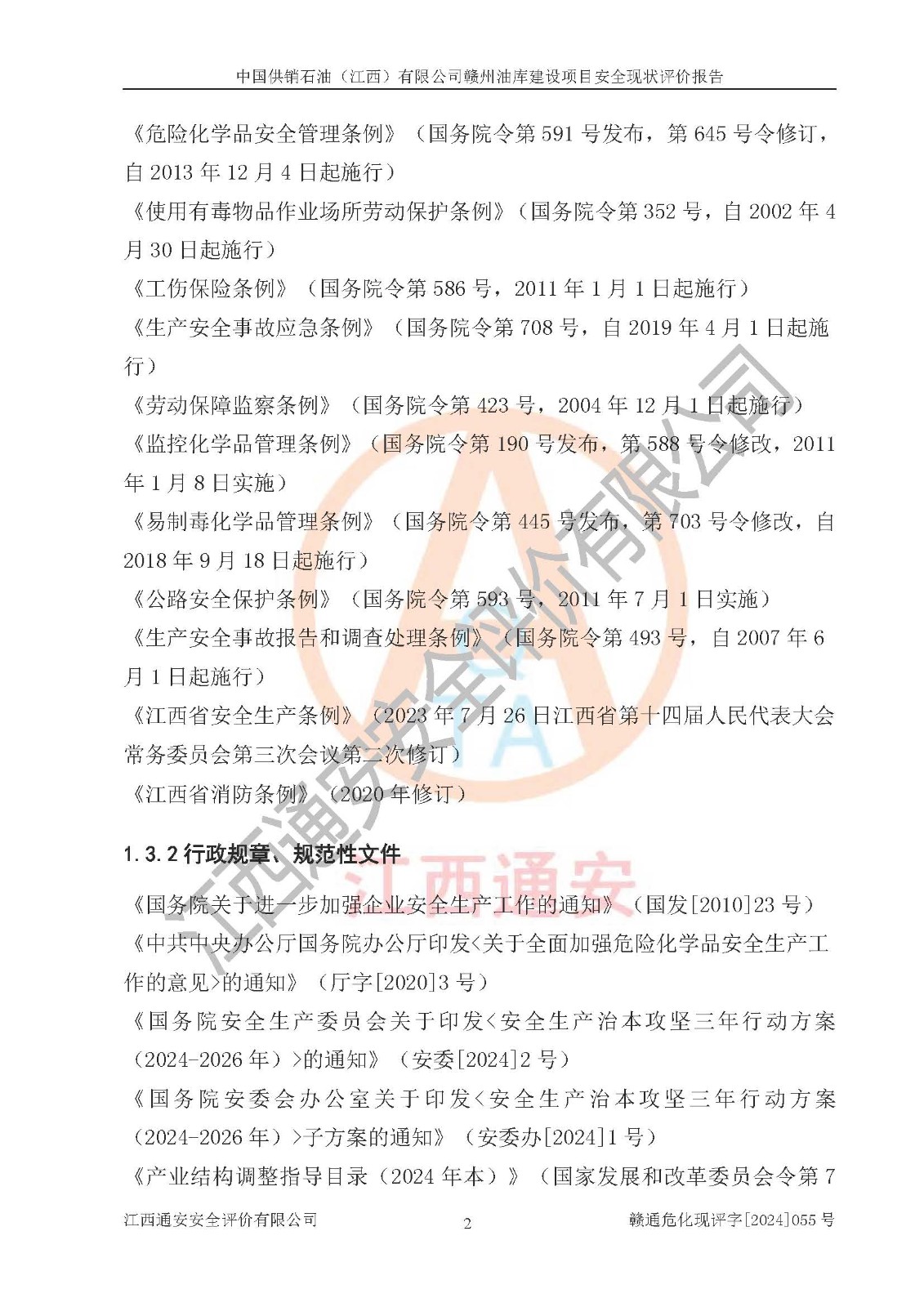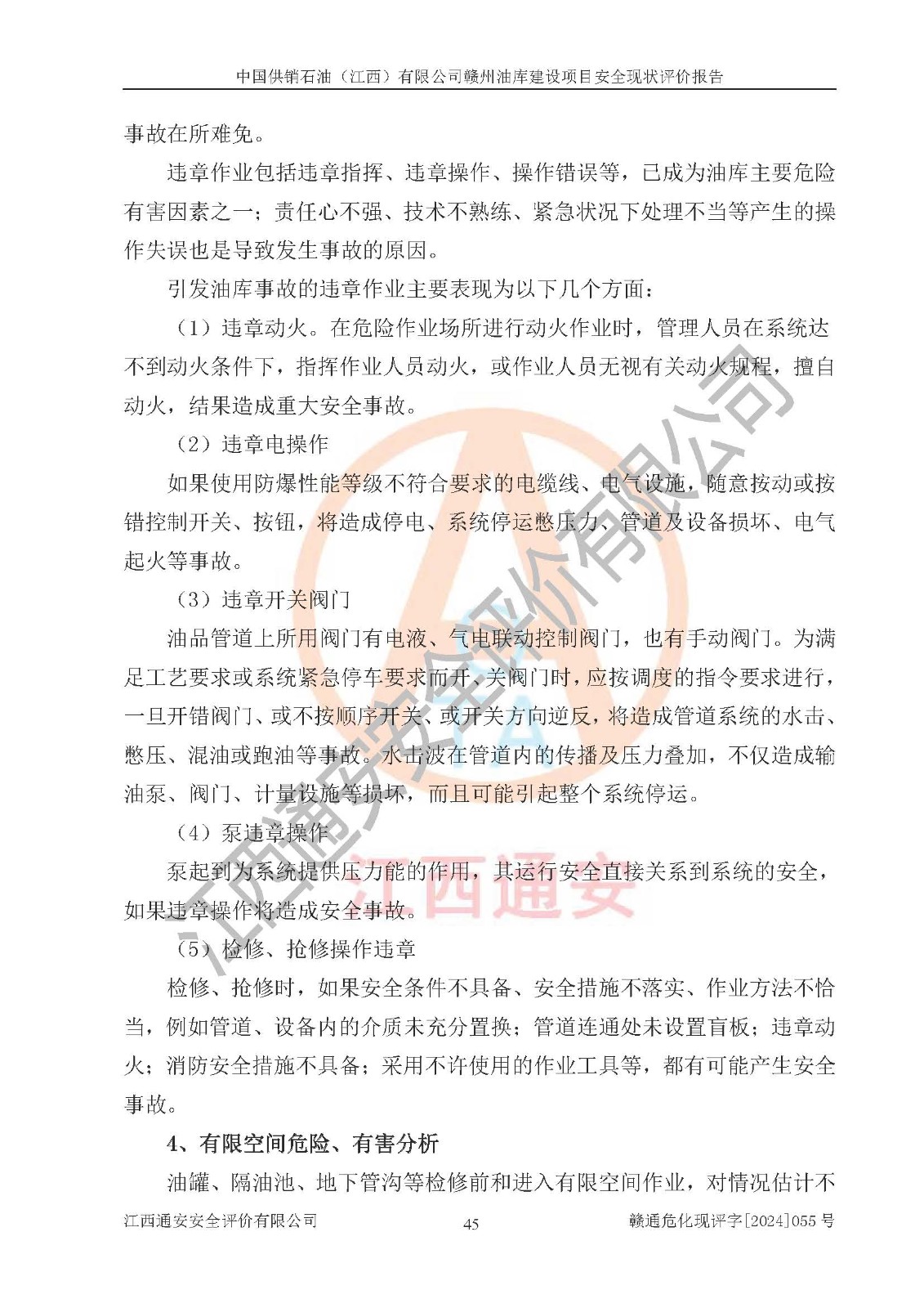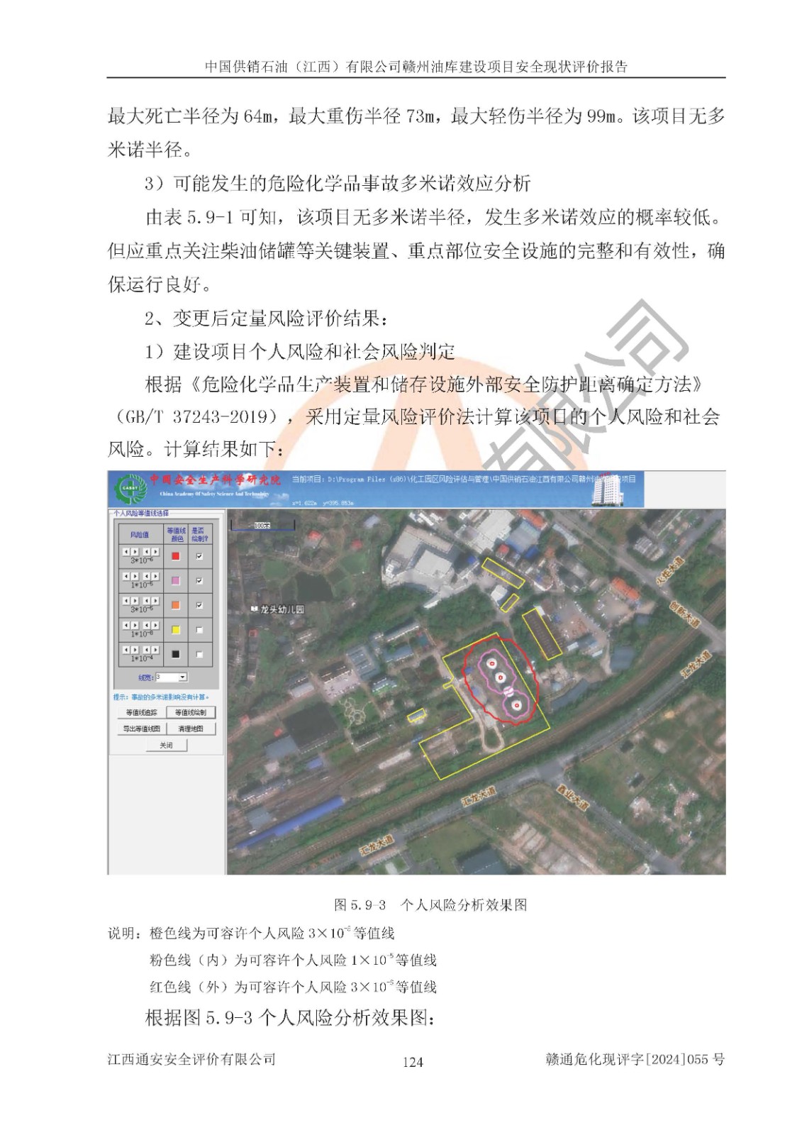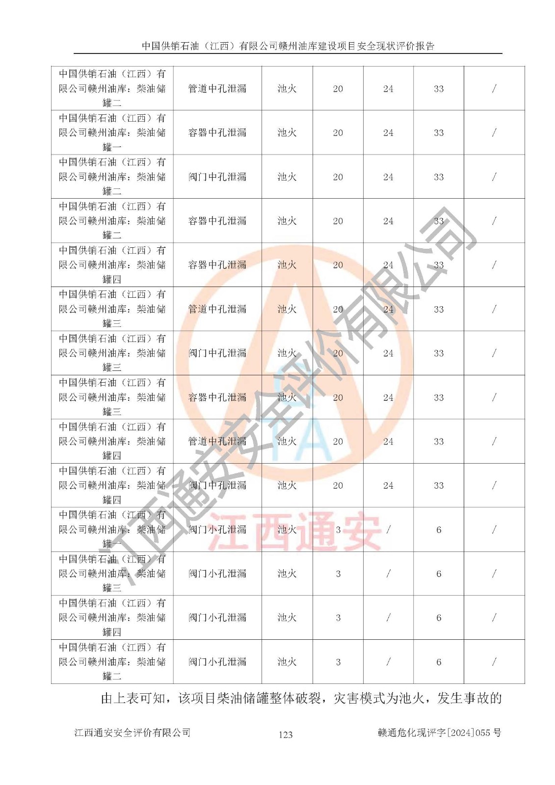 項目簡介 | 中國供銷石油(江西)有限公司贛州油庫位于江西省贛州市贛縣區(qū)梅林鎮(zhèn)雙龍村2-47號,負責人為王偉民,成立于2023年05月24日,營業(yè)執(zhí)照經(jīng)營范圍為成品油批發(fā)。該項目的油庫由中國供銷石油(江西)有限公司贛州油庫承租,并負責油庫后期運營及管理。 中國供銷石油(江西)有限公司贛州油庫占地面積約20000m2,油庫儲運油品為0#柴油,卸油方式為鐵路進油,內(nèi)設2000m3地上立式固定頂油罐4座,總?cè)萘?000m3,出油通過管道供給公路發(fā)油區(qū)裝卸設施。該油庫西北面設有卸油鐵路**線(設兩條卸車線),1處卸油棧橋,棧橋上設有卸油鶴管6個。根據(jù)《石油庫設計規(guī)范》(GB 50074-2014)第3.0.1條,0#柴油為丙A類液體,容量乘以系數(shù)0.5計入儲罐計算總?cè)萘?;該油庫儲罐計算總?cè)萘縏V為4000m3,為四級石油庫,庫內(nèi)設有公路發(fā)油區(qū)。 中國供銷石油(江西)有限公司贛州油庫建設項目2023年5月31日取得了項目備案通知書,委托江西贛安安全生產(chǎn)科學技術(shù)咨詢服務中心編制了項目安全條件評價報告,并取得了安全條件審查的批復,委托海灣工程有限公司編制了項目安全設施設計(2023年8月),并取得了安全設施設計審查的批復,月委托江西通安安全評價有限公司出具了項目安全驗收評價報告(2023年11月)。中國供銷石油(江西)有限公司贛州油庫2023年12月4日取得了危險化學品經(jīng)營許可證,證書編號:贛虔安經(jīng)(甲)字[2023]000032,經(jīng)營方式為帶有儲存設施經(jīng)營,許可范圍為柴油,**期2023年12月4日至2026年12月3日。該公司現(xiàn)有員工12人,其中專職安全管理人員1人。 中國供銷石油(江西)有限公司贛州油庫建設項目儲罐區(qū)設置了4個固定頂0#柴油儲罐,單罐容積為2000m3,總罐容積為8000m3,其中V10101儲罐主要供鐵路自用,其他三個V10102~4儲罐油品主要用于對外經(jīng)營。經(jīng)辨識,儲罐區(qū)構(gòu)成四級危險化學品重大危險源。根據(jù)企業(yè)自身經(jīng)營及市場需求的調(diào)整,在原有的三個V10102~4儲罐,現(xiàn)只保留兩個儲罐(V10102、V10104)油品用于對外經(jīng)營,故對V10103儲罐作閑置處理,不再用于油品儲存。本次變更降低了柴油的儲存量,進一步降低了事故風險。中國供銷石油(江西)有限公司贛州油庫委托河北英科石化工程有限公司進行了變更設計,并出具了《中國供銷石油江西有限公司贛州油庫建設項目安全設施變更設計》(2024年6月)。現(xiàn)場勘查時,企業(yè)已將V10103儲罐儲存的柴油發(fā)完,已斷開的進、出料管道,并用盲板封堵。 中國供銷石油(江西)有限公司贛州油庫建設項目經(jīng)營過程中涉及的物料為柴油。根據(jù)《危險化學品目錄》,該項目涉及的柴油屬于危險化學品。經(jīng)辨識,該項目不涉及監(jiān)控化學品、易制毒化學品、易制爆危險化學品、劇毒化學品、高毒物品、特別管控的危險化學品和重點監(jiān)管的危險化學品,不涉及重點監(jiān)管的危險化工工藝,生產(chǎn)、儲存單元不構(gòu)成危險化學品重大危險源。根據(jù)工藝特點及物料的理化特性可知,該項目經(jīng)營過程中存在火災與爆炸、中毒與窒息、觸電、機械傷害等危險有害因素。 | ||||||