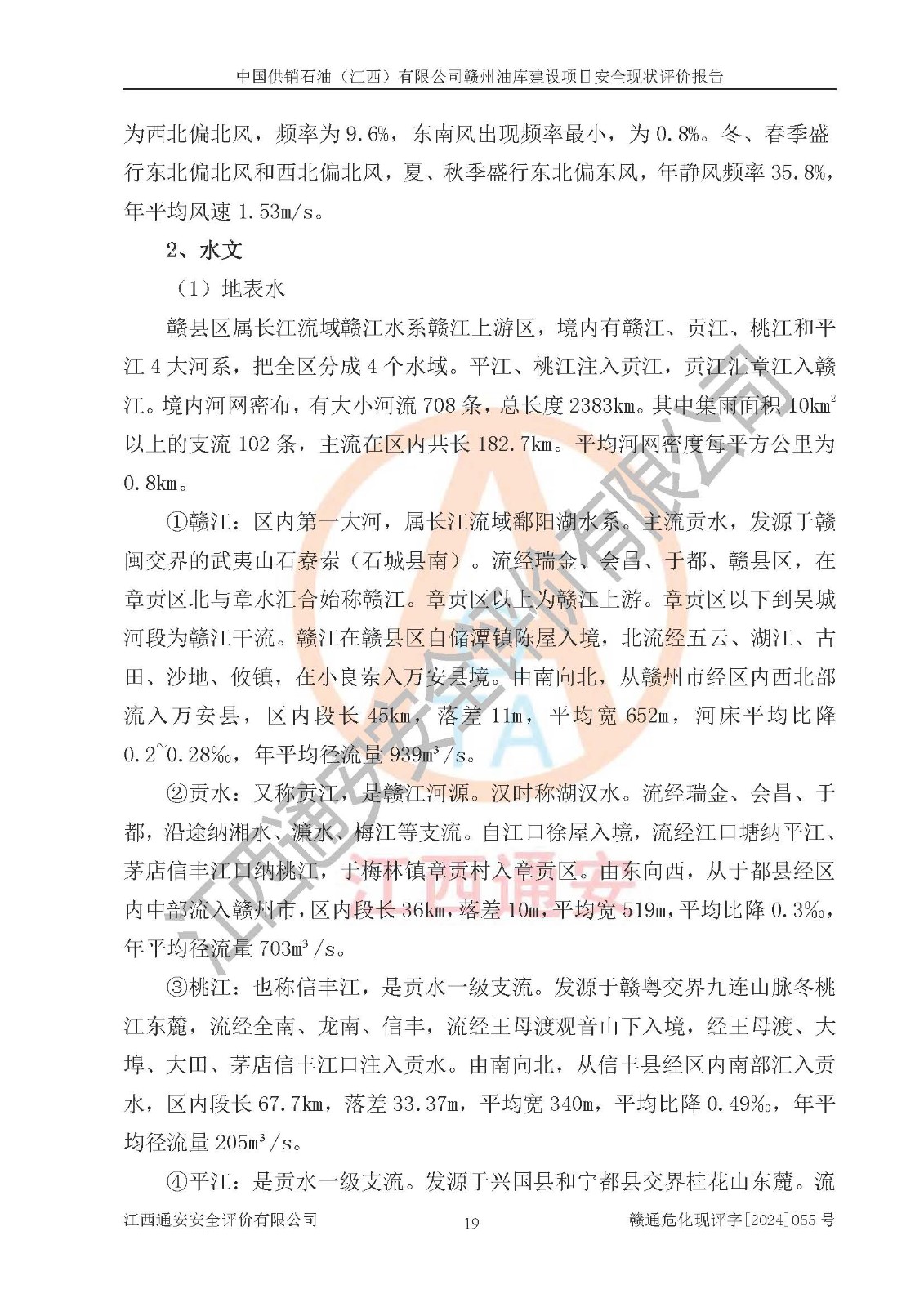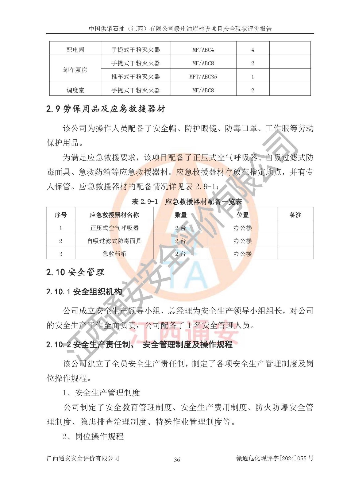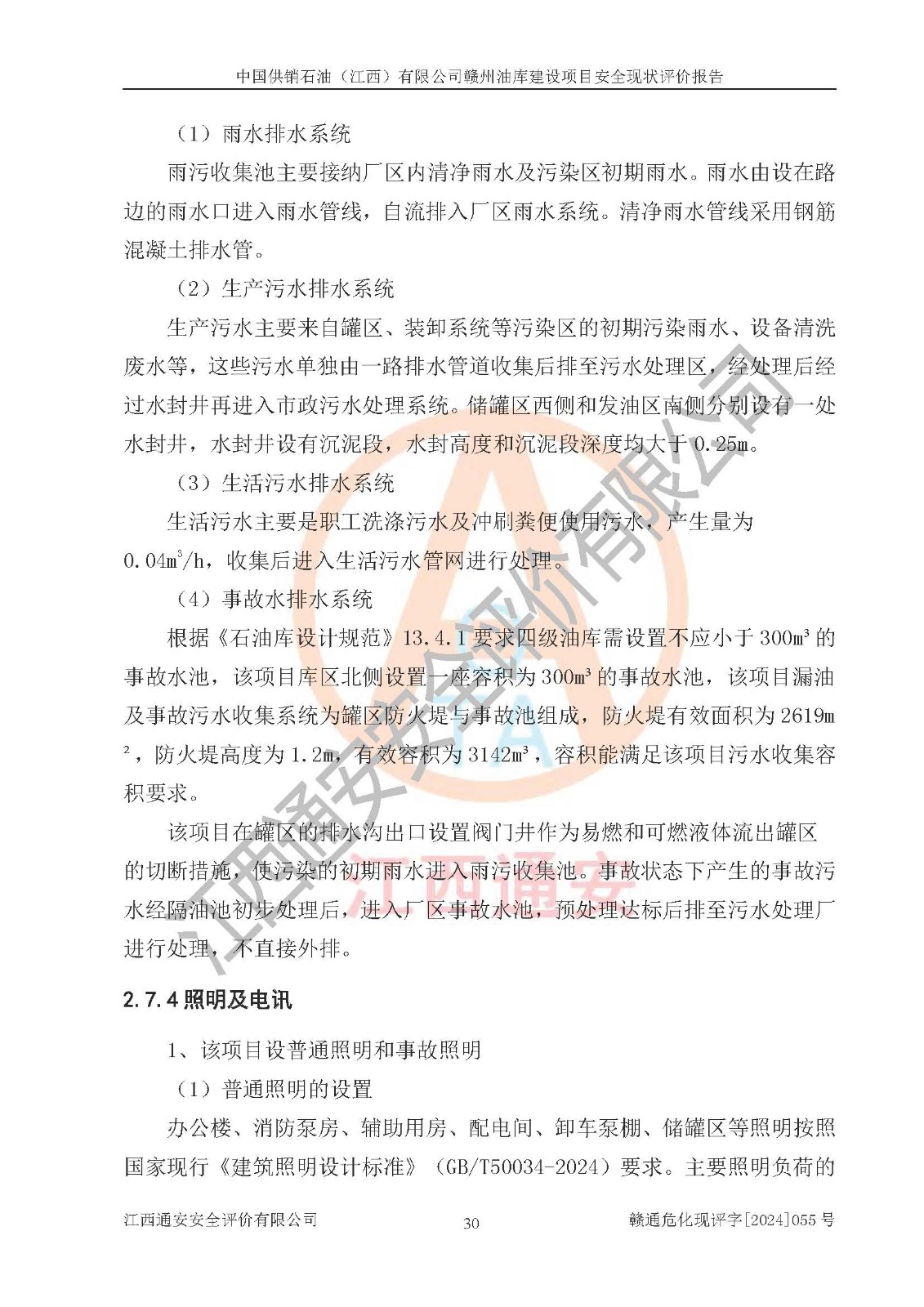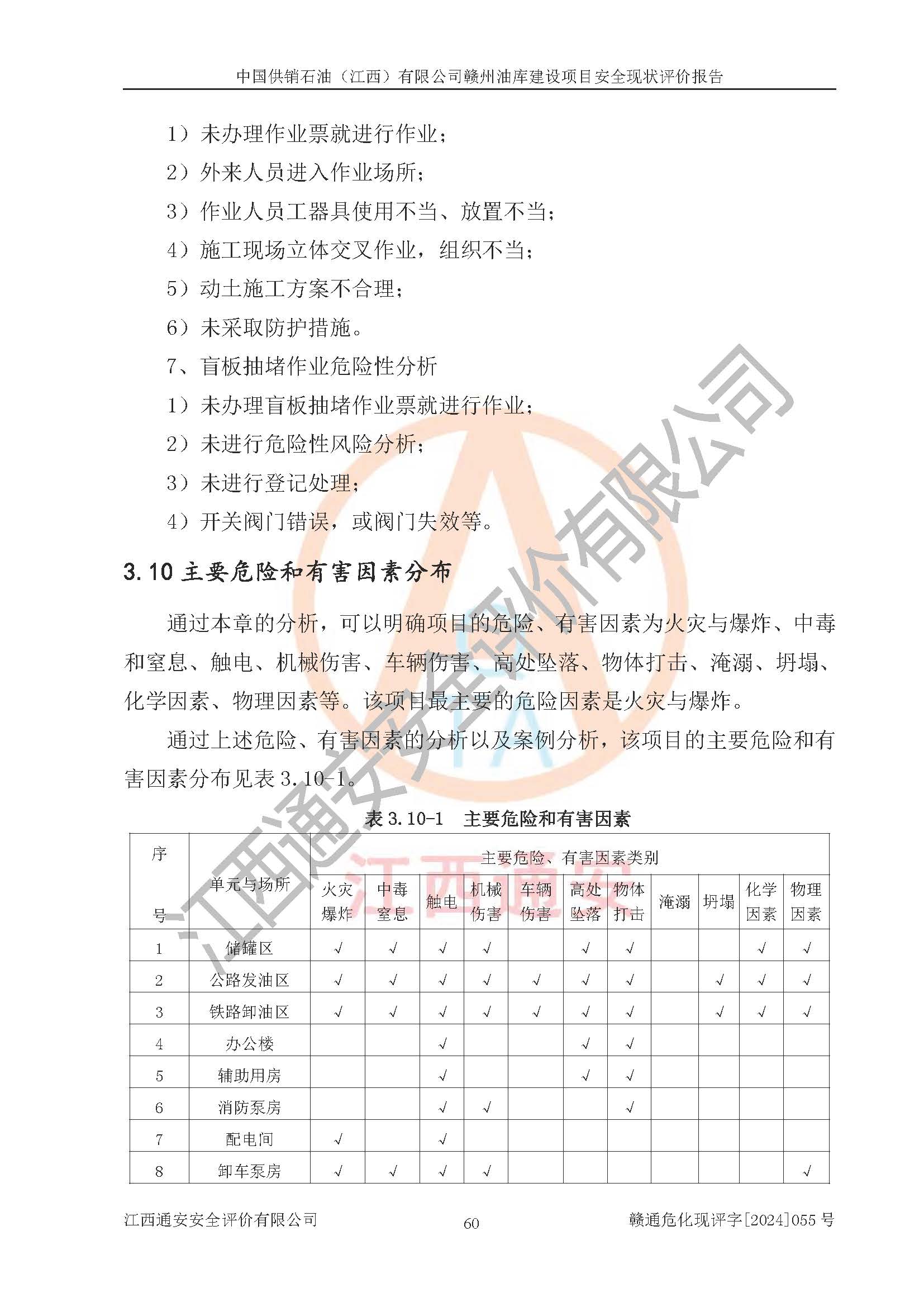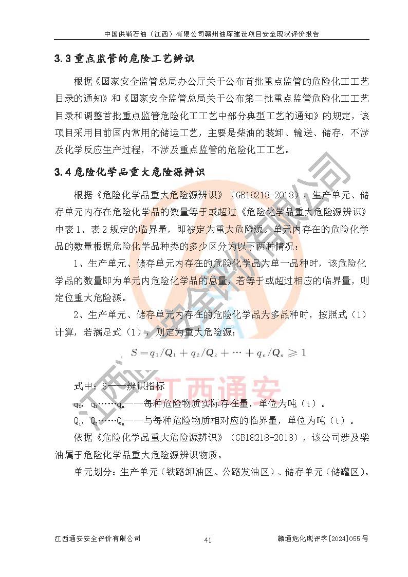 項目簡介 | 中國供銷石油(江西)有限公司贛州油庫位于江西省贛州市贛縣區(qū)梅林鎮(zhèn)雙龍村2-47號,負責人為王偉民,成立于2023年05月24日,營業(yè)執(zhí)照經(jīng)營范圍為成品油批發(fā)。該項目的油庫由中國供銷石油(江西)有限公司贛州油庫承租,并負責油庫后期運營及管理。 中國供銷石油(江西)有限公司贛州油庫占地面積約20000m2,油庫儲運油品為0#柴油,卸油方式為鐵路進油,內(nèi)設2000m3地上立式固定頂油罐4座,總?cè)萘?000m3,出油通過管道供給公路發(fā)油區(qū)裝卸設施。該油庫西北面設有卸油鐵路**線(設兩條卸車線),1處卸油棧橋,棧橋上設有卸油鶴管6個。根據(jù)《石油庫設計規(guī)范》(GB 50074-2014)第3.0.1條,0#柴油為丙A類液體,容量乘以系數(shù)0.5計入儲罐計算總?cè)萘?;該油庫儲罐計算總?cè)萘縏V為4000m3,為四級石油庫,庫內(nèi)設有公路發(fā)油區(qū)。 中國供銷石油(江西)有限公司贛州油庫建設項目2023年5月31日取得了項目備案通知書,委托江西贛安安全生產(chǎn)科學技術(shù)咨詢服務中心編制了項目安全條件評價報告,并取得了安全條件審查的批復,委托海灣工程有限公司編制了項目安全設施設計(2023年8月),并取得了安全設施設計審查的批復,月委托江西通安安全評價有限公司出具了項目安全驗收評價報告(2023年11月)。中國供銷石油(江西)有限公司贛州油庫2023年12月4日取得了危險化學品經(jīng)營許可證,證書編號:贛虔安經(jīng)(甲)字[2023]000032,經(jīng)營方式為帶有儲存設施經(jīng)營,許可范圍為柴油,**期2023年12月4日至2026年12月3日。該公司現(xiàn)有員工12人,其中專職安全管理人員1人。 中國供銷石油(江西)有限公司贛州油庫建設項目儲罐區(qū)設置了4個固定頂0#柴油儲罐,單罐容積為2000m3,總罐容積為8000m3,其中V10101儲罐主要供鐵路自用,其他三個V10102~4儲罐油品主要用于對外經(jīng)營。經(jīng)辨識,儲罐區(qū)構(gòu)成四級危險化學品重大危險源。根據(jù)企業(yè)自身經(jīng)營及市場需求的調(diào)整,在原有的三個V10102~4儲罐,現(xiàn)只保留兩個儲罐(V10102、V10104)油品用于對外經(jīng)營,故對V10103儲罐作閑置處理,不再用于油品儲存。本次變更降低了柴油的儲存量,進一步降低了事故風險。中國供銷石油(江西)有限公司贛州油庫委托河北英科石化工程有限公司進行了變更設計,并出具了《中國供銷石油江西有限公司贛州油庫建設項目安全設施變更設計》(2024年6月)。現(xiàn)場勘查時,企業(yè)已將V10103儲罐儲存的柴油發(fā)完,已斷開的進、出料管道,并用盲板封堵。 中國供銷石油(江西)有限公司贛州油庫建設項目經(jīng)營過程中涉及的物料為柴油。根據(jù)《危險化學品目錄》,該項目涉及的柴油屬于危險化學品。經(jīng)辨識,該項目不涉及監(jiān)控化學品、易制毒化學品、易制爆危險化學品、劇毒化學品、高毒物品、特別管控的危險化學品和重點監(jiān)管的危險化學品,不涉及重點監(jiān)管的危險化工工藝,生產(chǎn)、儲存單元不構(gòu)成危險化學品重大危險源。根據(jù)工藝特點及物料的理化特性可知,該項目經(jīng)營過程中存在火災與爆炸、中毒與窒息、觸電、機械傷害等危險有害因素。 | ||||||