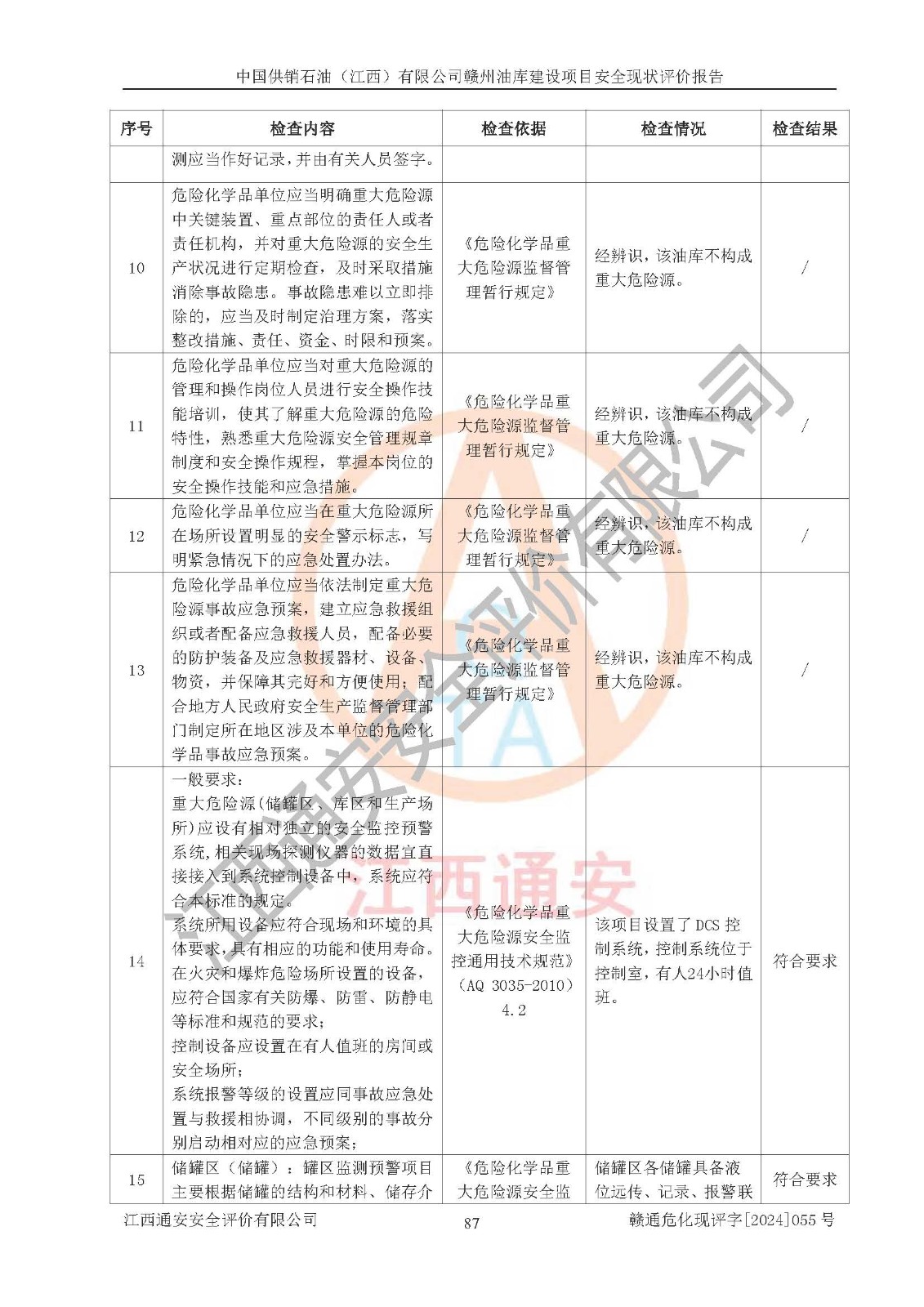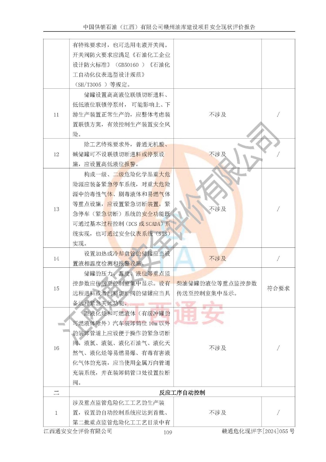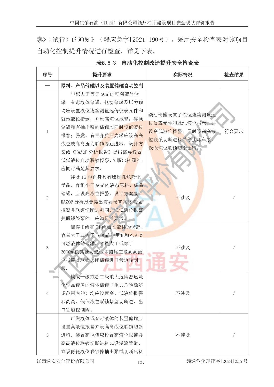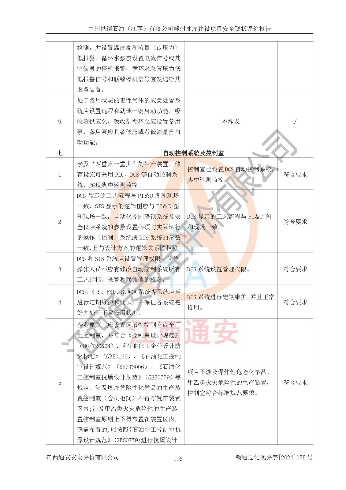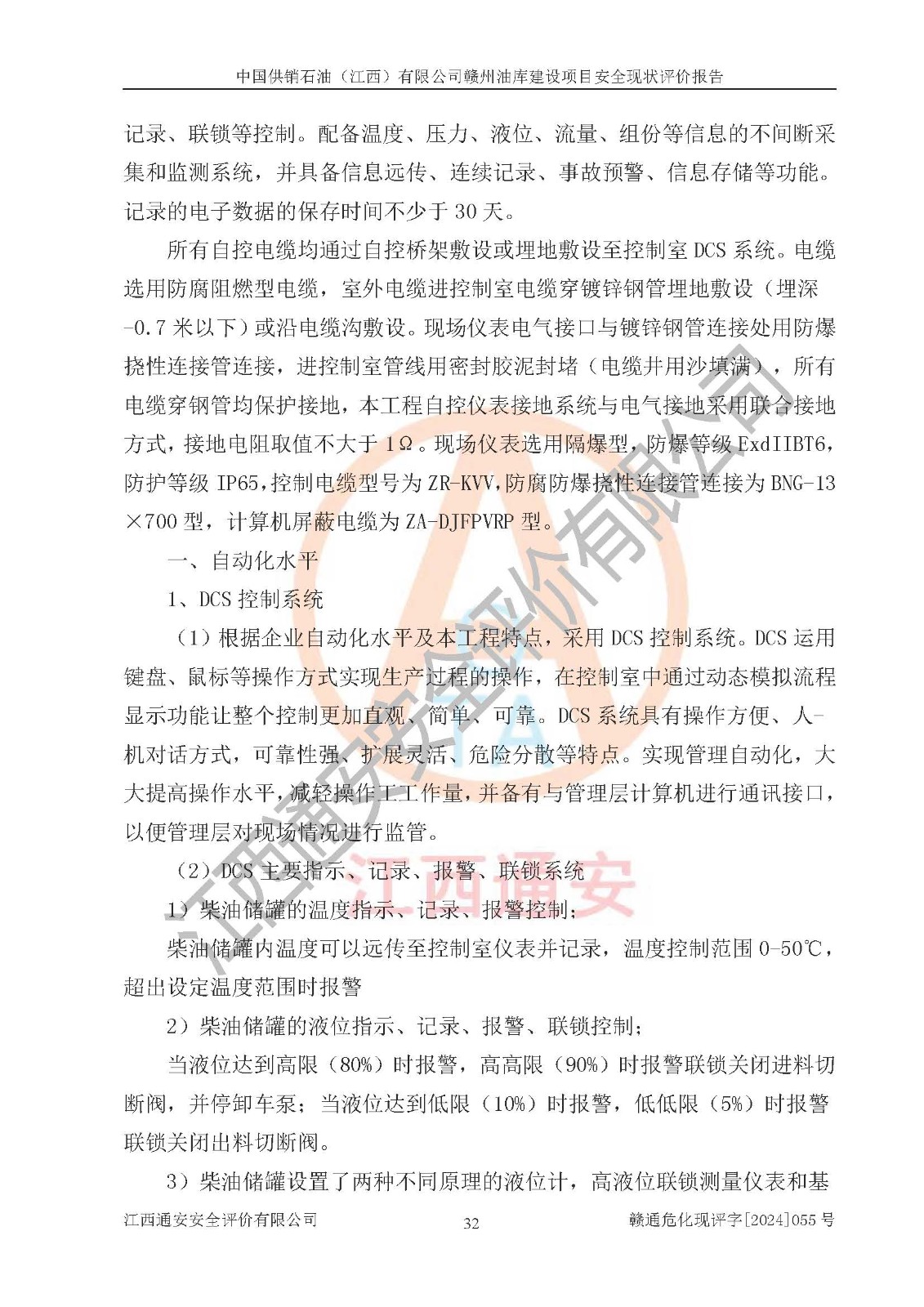 評價結(jié)論 | 中國供銷石油(江西)有限公司贛州油庫建設項目現(xiàn)場情況與變更設計圖紙一致,DCS系統(tǒng)設計符合要求、運行正常,安全設施及安全管理符合法律、法規(guī)、標準的要求,安全風險是受控制的,其風險程度是可以接受的,安全設施符合安全經(jīng)營條件,能夠滿足安全經(jīng)營的要求。 | ||||||