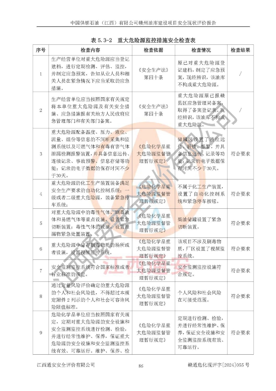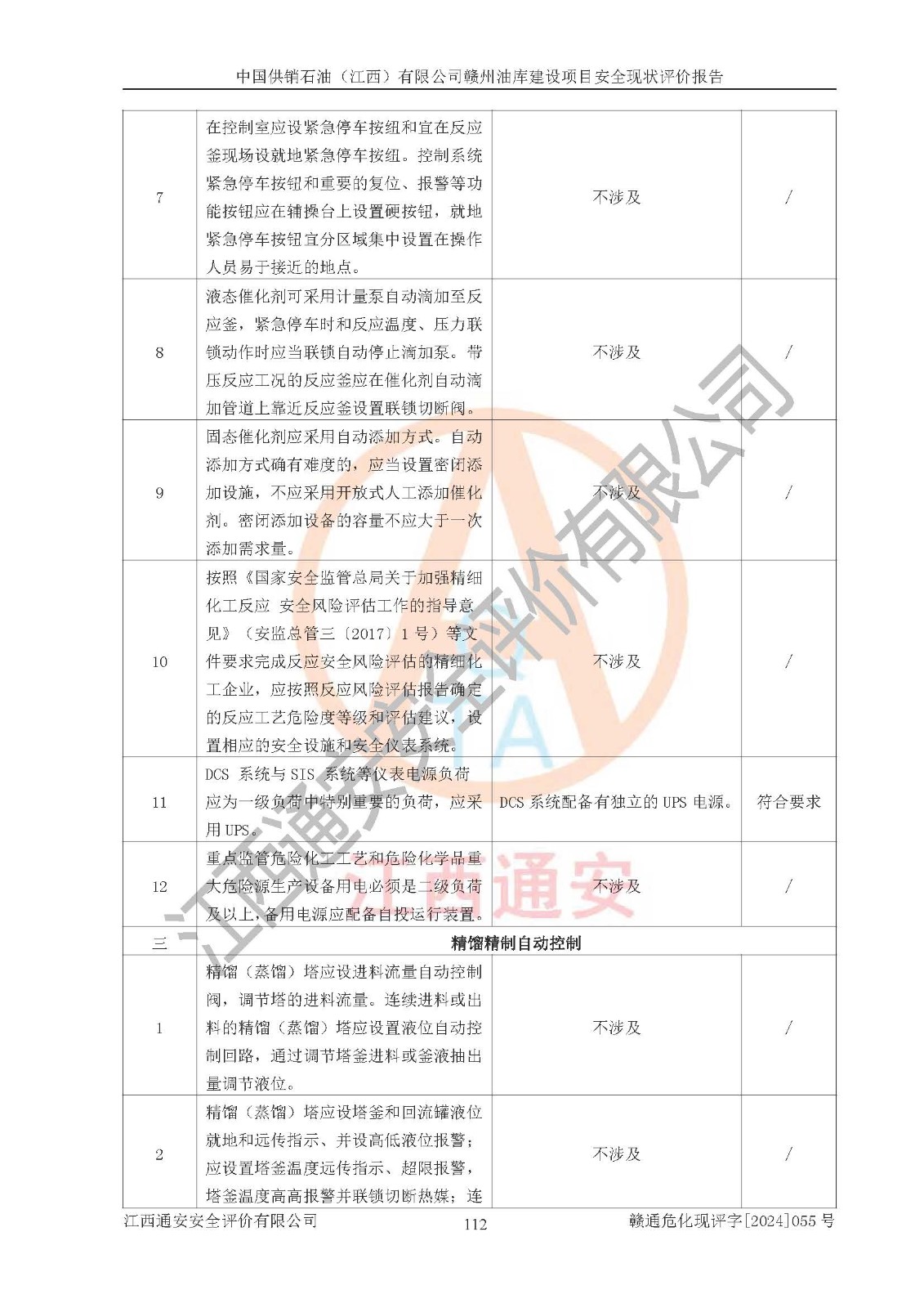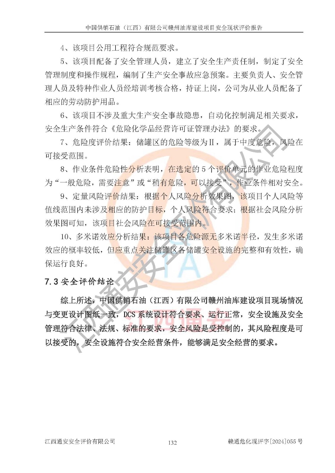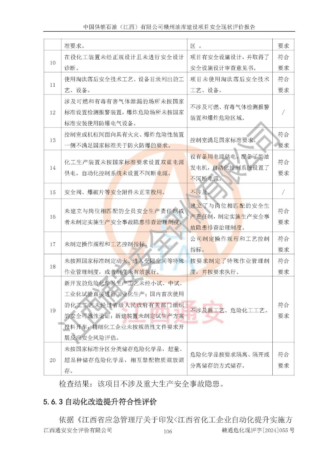評價結(jié)論 | 中國供銷石油(江西)有限公司贛州油庫建設項目現(xiàn)場情況與變更設計圖紙一致,DCS系統(tǒng)設計符合要求、運行正常,安全設施及安全管理符合法律、法規(guī)、標準的要求,安全風險是受控制的,其風險程度是可以接受的,安全設施符合安全經(jīng)營條件,能夠滿足安全經(jīng)營的要求。 | ||||||