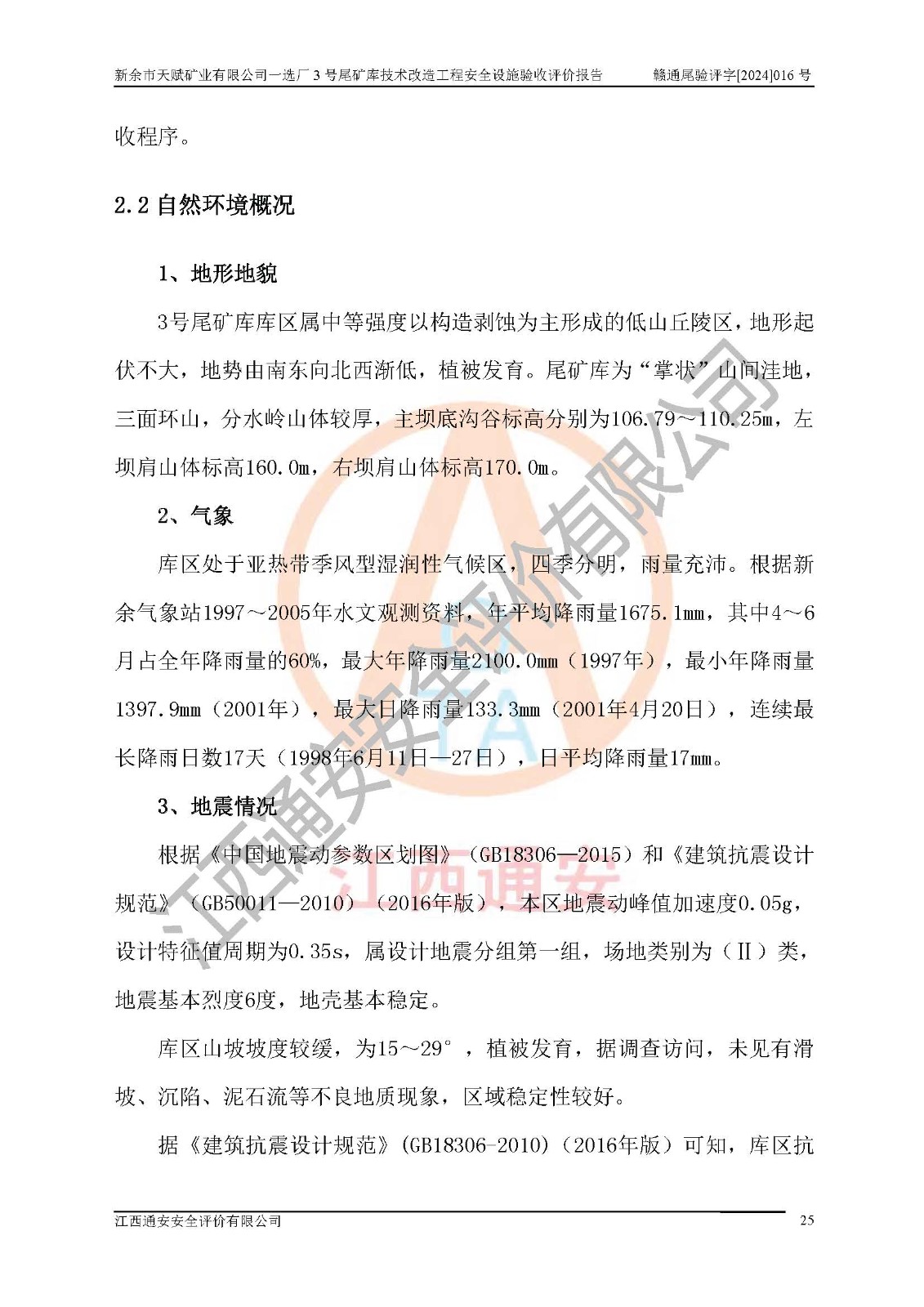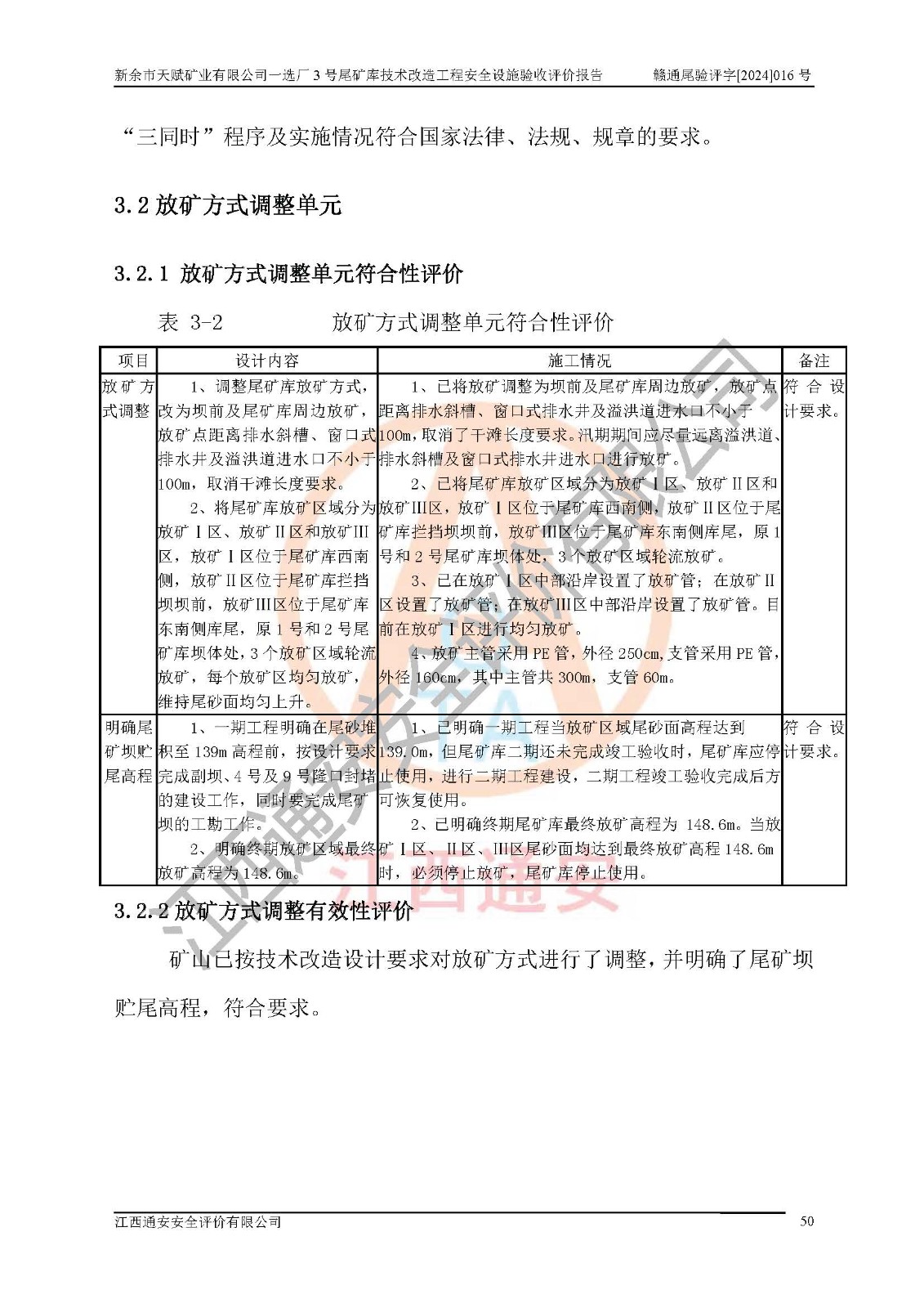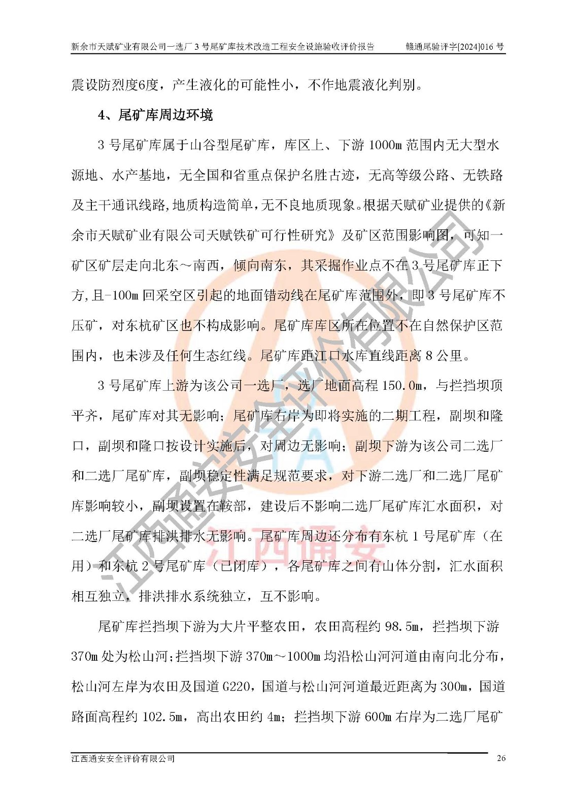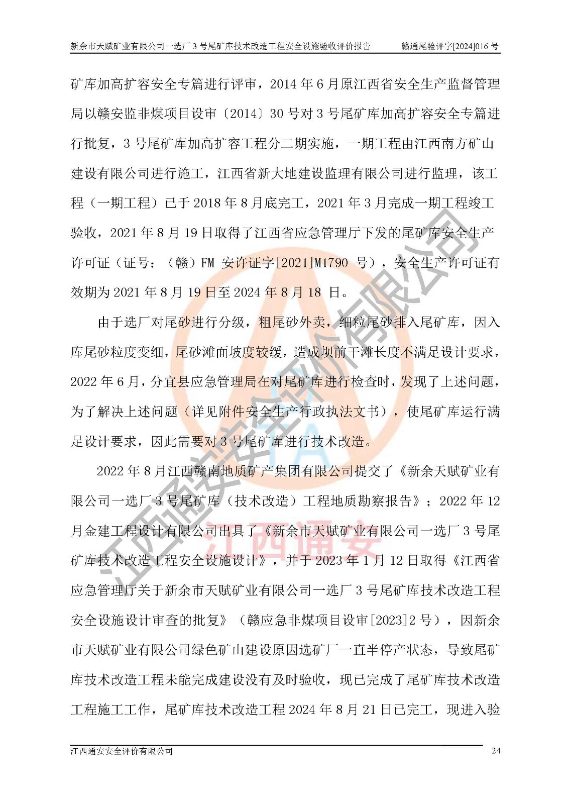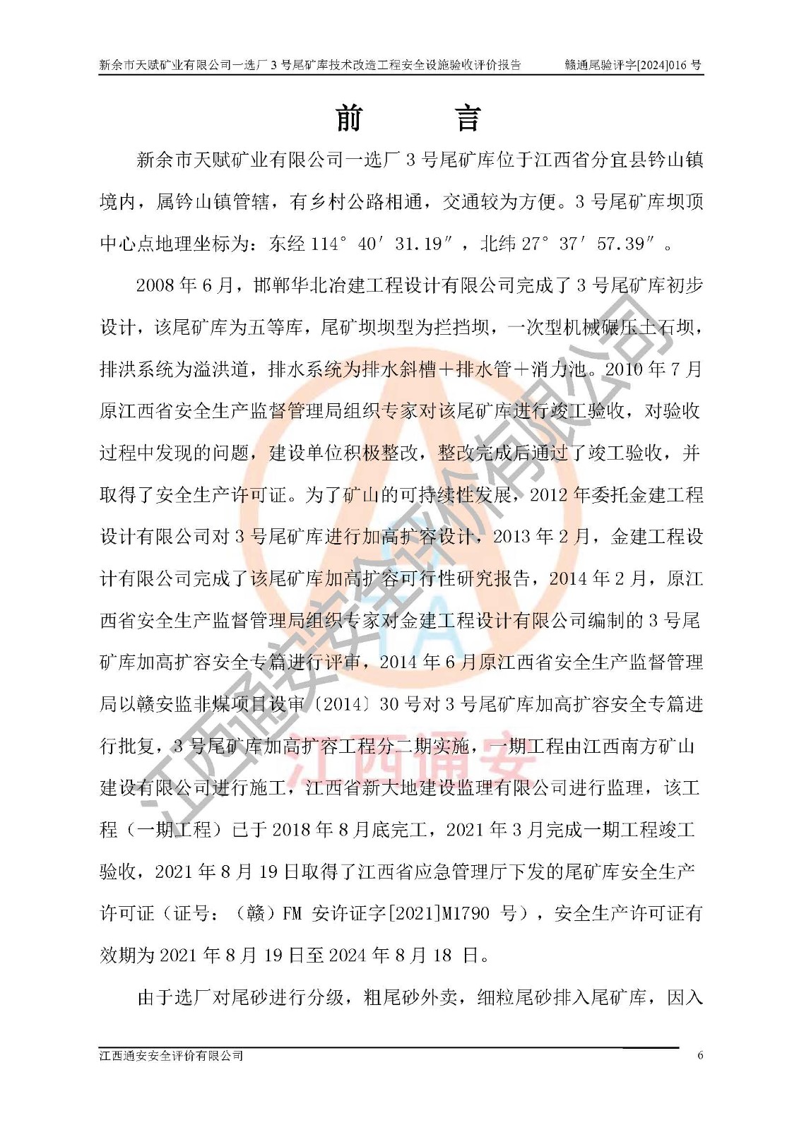 新余市天賦礦業(yè)有限公司一選廠3號尾礦庫位于江西省分宜縣鈐山鎮(zhèn)境內(nèi),屬鈐山鎮(zhèn)管轄,有鄉(xiāng)村公路相通,交通較為方便。3號尾礦庫壩頂中心點地理坐標(biāo)為:X=3058292,Y=38566139。 2008年6月,邯鄲華北冶建工程設(shè)計有限公司完成了3號尾礦庫初步設(shè)計,該尾礦庫為五等庫,尾礦壩壩型為攔擋壩,一次型機(jī)械碾壓土石壩,排洪系統(tǒng)為溢洪道,排水系統(tǒng)為排水斜槽+排水管+消力池。2010年7月原江西省安全生產(chǎn)監(jiān)督管理局組織專家對該尾礦庫進(jìn)行竣工驗收,對驗收過程中發(fā)現(xiàn)的問題,建設(shè)單位積極整改,整改完成后通過了竣工驗收,并取得了安全生產(chǎn)許可證。為了礦山的可持續(xù)性發(fā)展,2012年委托金建工程設(shè)計有限公司對3號尾礦庫進(jìn)行加高擴(kuò)容設(shè)計,2013年2月,金建工程設(shè)計有限公司完成了該尾礦庫加高擴(kuò)容可行性研究報告,2014年2月,原江西省安全生產(chǎn)監(jiān)督管理局組織專家對金建工程設(shè)計有限公司編制的3號尾礦庫加高擴(kuò)容安全專篇進(jìn)行評審,2014年6月原江西省安全生產(chǎn)監(jiān)督管理局以贛安監(jiān)非煤項目設(shè)審〔2014〕30號對3號尾礦庫加高擴(kuò)容安全專篇進(jìn)行批復(fù),3號尾礦庫加高擴(kuò)容工程分二期實施,一期工程由江西南方礦山建設(shè)有限公司進(jìn)行施工,江西省新大地建設(shè)監(jiān)理有限公司進(jìn)行監(jiān)理,該工程(一期工程)已于2018年8月底完工,2021年3月完成一期工程竣工驗收,2021年8月19日取得了江西省應(yīng)急管理廳下發(fā)的尾礦庫安全生產(chǎn)許可證(證號:(贛)FM 安許證字[2021]M1790 號),安全生產(chǎn)許可證**期為2021年8月19日至2024年8月18 日。 由于選廠對尾砂進(jìn)行分級,粗尾砂外賣,細(xì)粒尾砂排入尾礦庫,因入庫尾砂粒度變細(xì),尾砂灘面坡度較緩,造成壩前干灘長度不滿足設(shè)計要求,2022年6月,分宜縣應(yīng)急管理局在對尾礦庫進(jìn)行檢查時,發(fā)現(xiàn)了上述問題(詳見附件安全生產(chǎn)行政執(zhí)法文書),為了解決上述問題,使尾礦庫運行滿足設(shè)計要求,因此需要對3號尾礦庫進(jìn)行技術(shù)改造。 2022年12月金建工程設(shè)計有限公司出具了《新余市天賦礦業(yè)有限公司一選廠3號尾礦庫技術(shù)改造工程安全設(shè)施設(shè)計》,并于2023年1月12日取得《江西省應(yīng)急管理廳關(guān)于新余市天賦礦業(yè)有限公司一選廠3號尾礦庫技術(shù)改造工程安全設(shè)施設(shè)計審查的批復(fù)》(贛應(yīng)急非煤項目設(shè)審[2023]2號)。因新余市天賦礦業(yè)有限公司綠色礦山建設(shè)原因選礦廠一直半停產(chǎn)狀態(tài),導(dǎo)致尾礦庫技術(shù)改造工程未能完成建設(shè)并沒有及時驗收,現(xiàn)已完成了尾礦庫技術(shù)改造工程施工建設(shè)工作,尾礦庫技術(shù)改造工程2024年8月21日已完工,現(xiàn)進(jìn)入驗收程序。 |