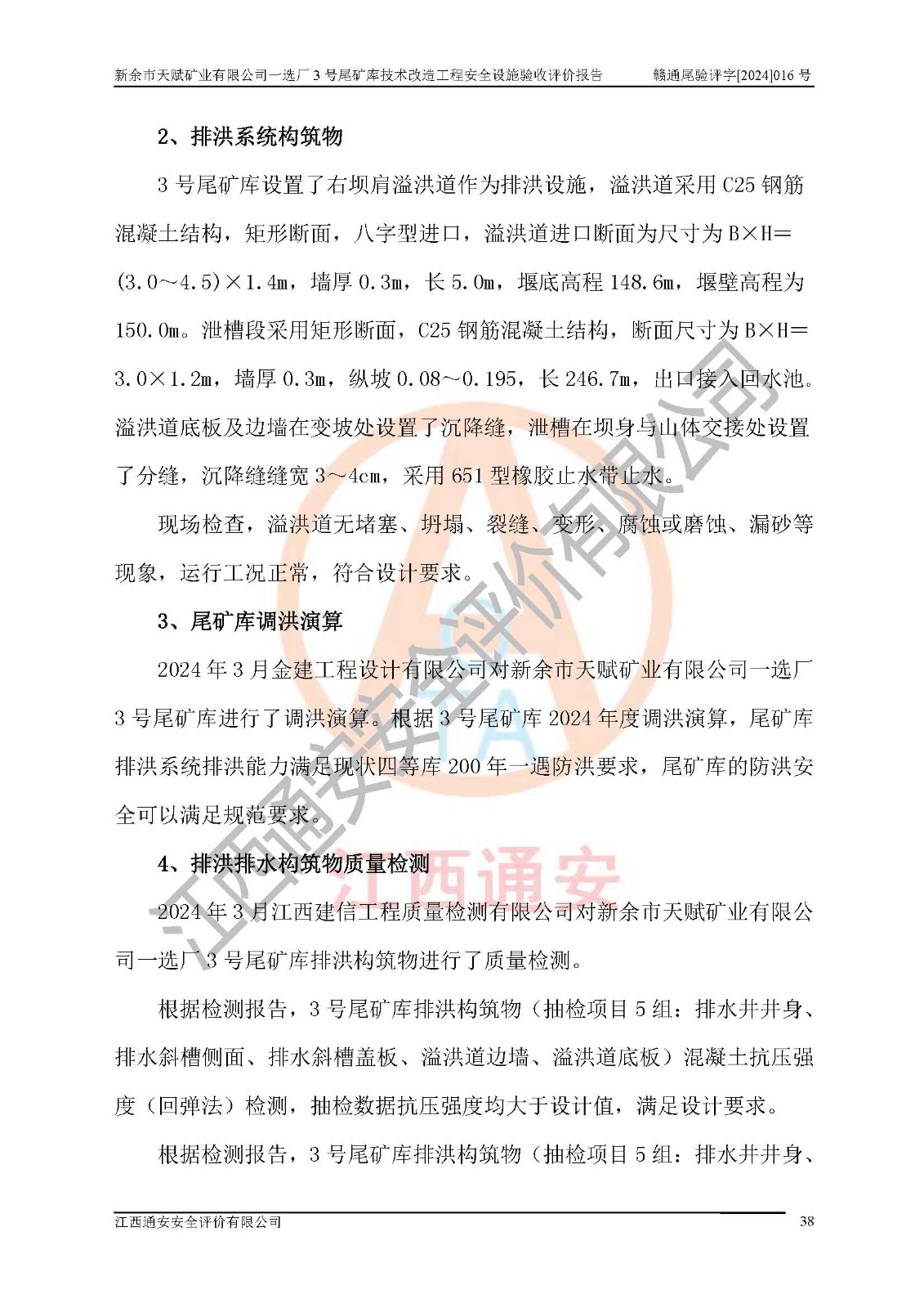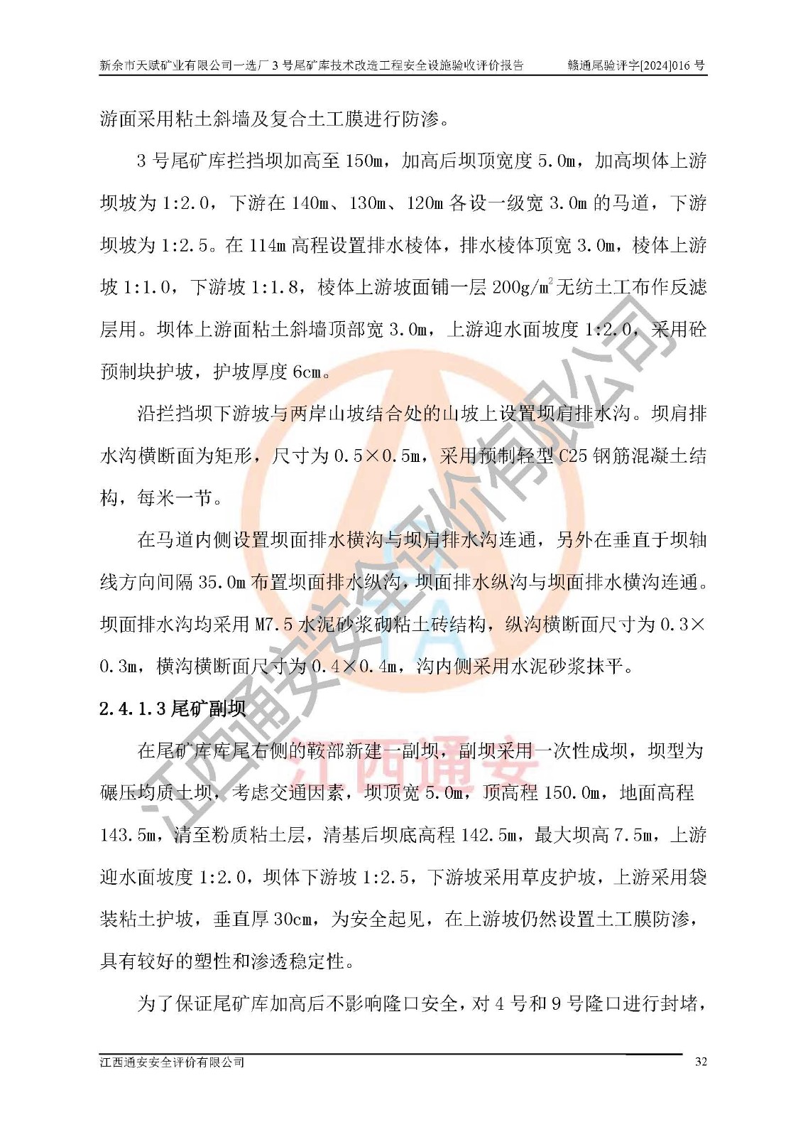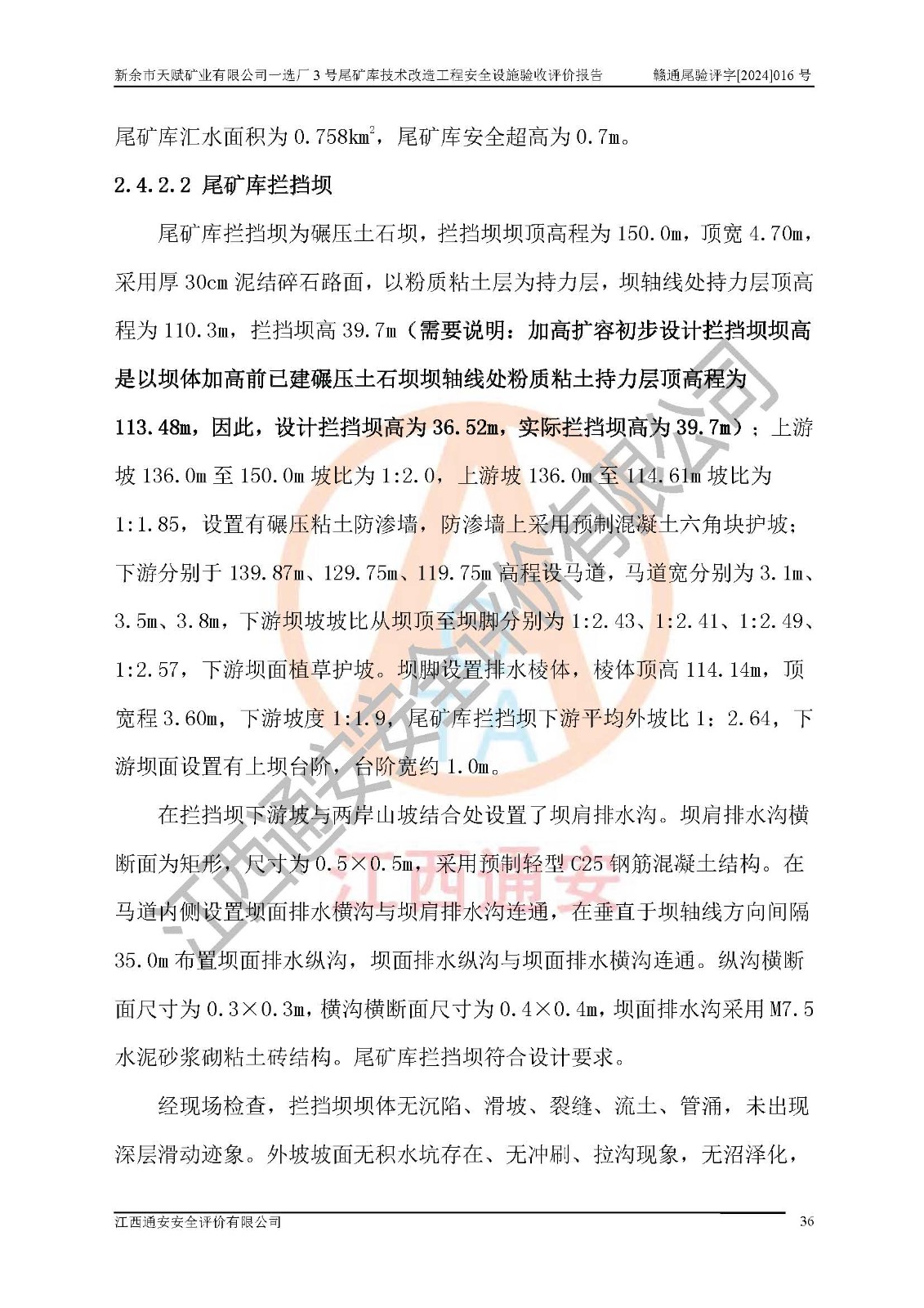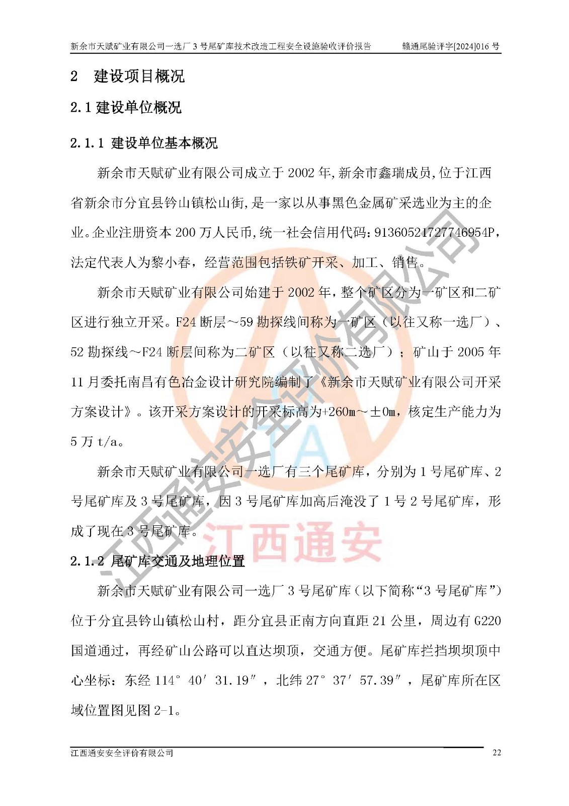 新余市天賦礦業(yè)有限公司一選廠3號尾礦庫位于江西省分宜縣鈐山鎮(zhèn)境內(nèi),屬鈐山鎮(zhèn)管轄,有鄉(xiāng)村公路相通,交通較為方便。3號尾礦庫壩頂中心點地理坐標(biāo)為:X=3058292,Y=38566139。 2008年6月,邯鄲華北冶建工程設(shè)計有限公司完成了3號尾礦庫初步設(shè)計,該尾礦庫為五等庫,尾礦壩壩型為攔擋壩,一次型機(jī)械碾壓土石壩,排洪系統(tǒng)為溢洪道,排水系統(tǒng)為排水斜槽+排水管+消力池。2010年7月原江西省安全生產(chǎn)監(jiān)督管理局組織專家對該尾礦庫進(jìn)行竣工驗收,對驗收過程中發(fā)現(xiàn)的問題,建設(shè)單位積極整改,整改完成后通過了竣工驗收,并取得了安全生產(chǎn)許可證。為了礦山的可持續(xù)性發(fā)展,2012年委托金建工程設(shè)計有限公司對3號尾礦庫進(jìn)行加高擴(kuò)容設(shè)計,2013年2月,金建工程設(shè)計有限公司完成了該尾礦庫加高擴(kuò)容可行性研究報告,2014年2月,原江西省安全生產(chǎn)監(jiān)督管理局組織專家對金建工程設(shè)計有限公司編制的3號尾礦庫加高擴(kuò)容安全專篇進(jìn)行評審,2014年6月原江西省安全生產(chǎn)監(jiān)督管理局以贛安監(jiān)非煤項目設(shè)審〔2014〕30號對3號尾礦庫加高擴(kuò)容安全專篇進(jìn)行批復(fù),3號尾礦庫加高擴(kuò)容工程分二期實施,一期工程由江西南方礦山建設(shè)有限公司進(jìn)行施工,江西省新大地建設(shè)監(jiān)理有限公司進(jìn)行監(jiān)理,該工程(一期工程)已于2018年8月底完工,2021年3月完成一期工程竣工驗收,2021年8月19日取得了江西省應(yīng)急管理廳下發(fā)的尾礦庫安全生產(chǎn)許可證(證號:(贛)FM 安許證字[2021]M1790 號),安全生產(chǎn)許可證**期為2021年8月19日至2024年8月18 日。 由于選廠對尾砂進(jìn)行分級,粗尾砂外賣,細(xì)粒尾砂排入尾礦庫,因入庫尾砂粒度變細(xì),尾砂灘面坡度較緩,造成壩前干灘長度不滿足設(shè)計要求,2022年6月,分宜縣應(yīng)急管理局在對尾礦庫進(jìn)行檢查時,發(fā)現(xiàn)了上述問題(詳見附件安全生產(chǎn)行政執(zhí)法文書),為了解決上述問題,使尾礦庫運行滿足設(shè)計要求,因此需要對3號尾礦庫進(jìn)行技術(shù)改造。 2022年12月金建工程設(shè)計有限公司出具了《新余市天賦礦業(yè)有限公司一選廠3號尾礦庫技術(shù)改造工程安全設(shè)施設(shè)計》,并于2023年1月12日取得《江西省應(yīng)急管理廳關(guān)于新余市天賦礦業(yè)有限公司一選廠3號尾礦庫技術(shù)改造工程安全設(shè)施設(shè)計審查的批復(fù)》(贛應(yīng)急非煤項目設(shè)審[2023]2號)。因新余市天賦礦業(yè)有限公司綠色礦山建設(shè)原因選礦廠一直半停產(chǎn)狀態(tài),導(dǎo)致尾礦庫技術(shù)改造工程未能完成建設(shè)并沒有及時驗收,現(xiàn)已完成了尾礦庫技術(shù)改造工程施工建設(shè)工作,尾礦庫技術(shù)改造工程2024年8月21日已完工,現(xiàn)進(jìn)入驗收程序。 |