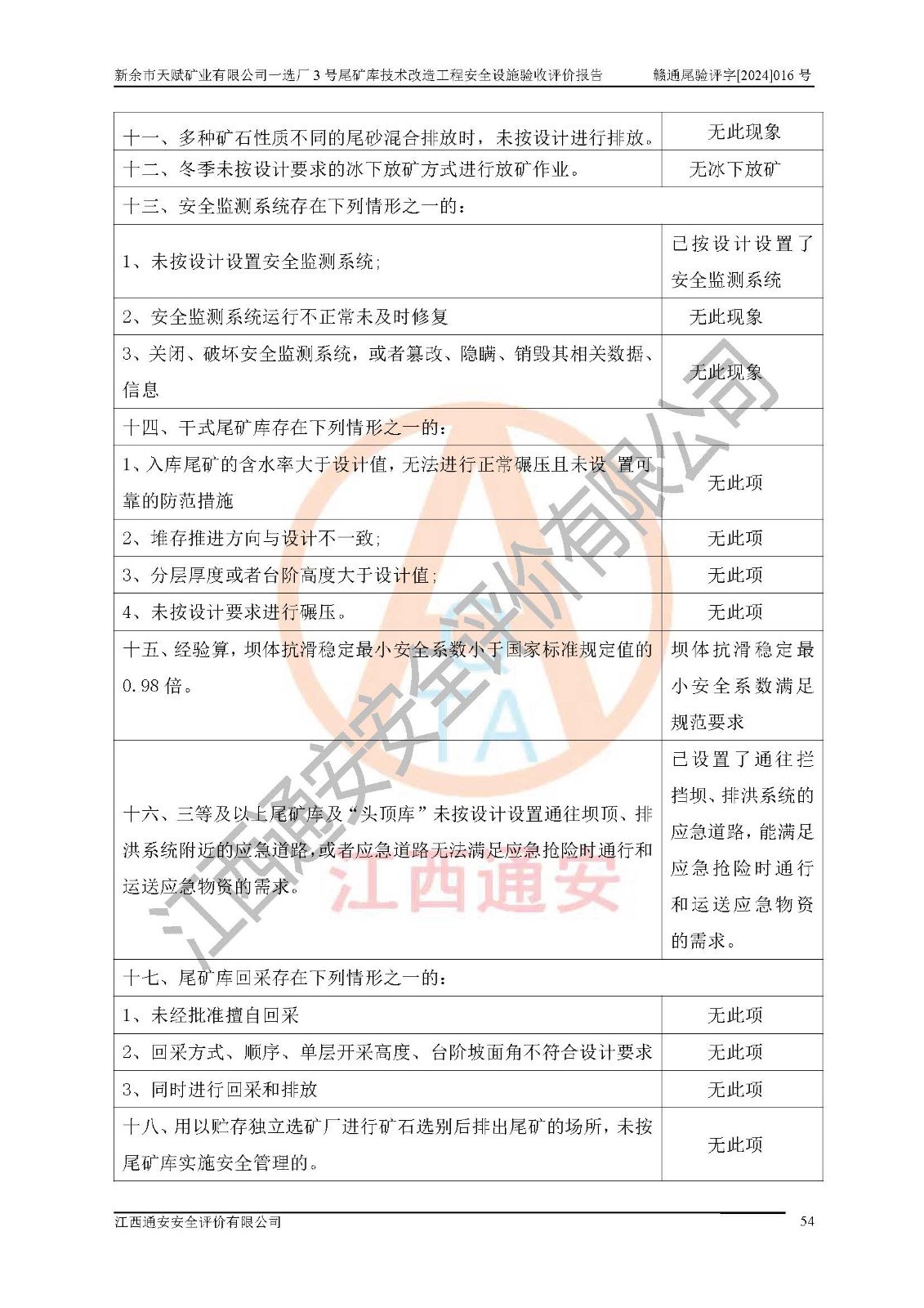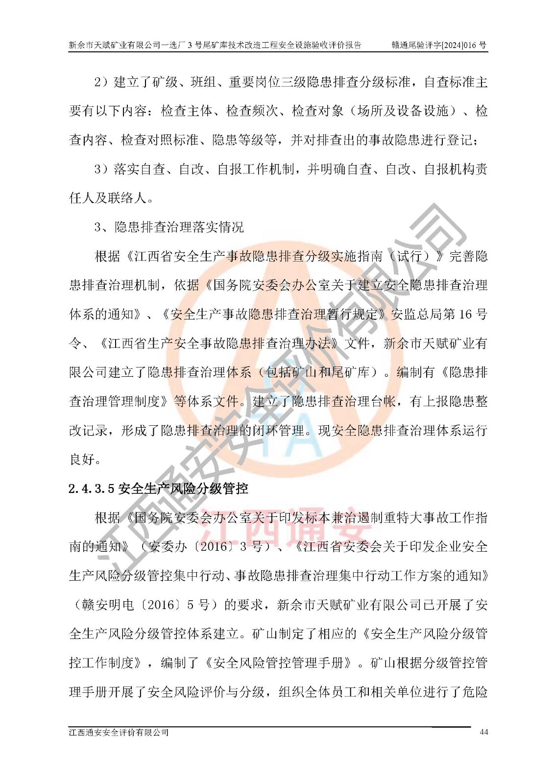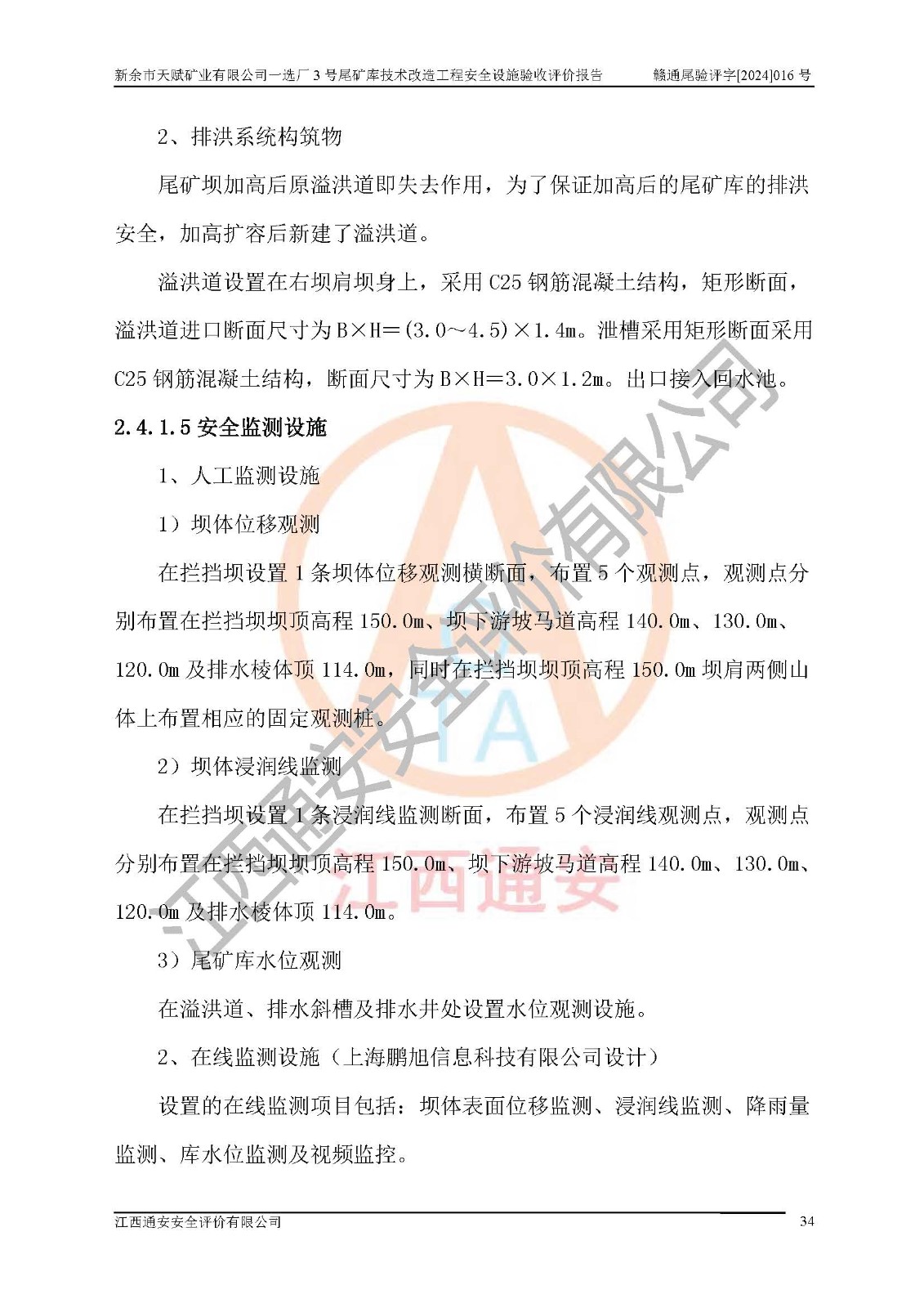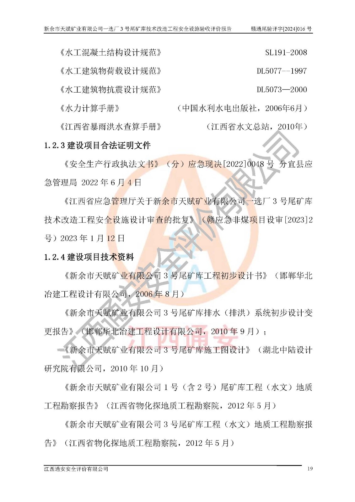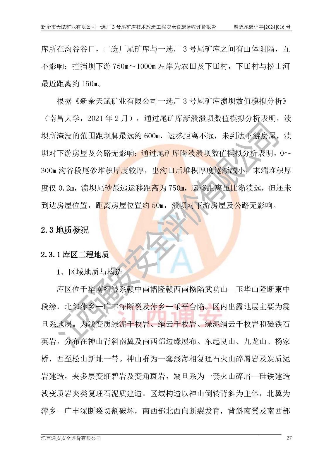 新余市天賦礦業(yè)有限公司一選廠3號尾礦庫位于江西省分宜縣鈐山鎮(zhèn)境內(nèi),屬鈐山鎮(zhèn)管轄,有鄉(xiāng)村公路相通,交通較為方便。3號尾礦庫壩頂中心點地理坐標(biāo)為:X=3058292,Y=38566139。 2008年6月,邯鄲華北冶建工程設(shè)計有限公司完成了3號尾礦庫初步設(shè)計,該尾礦庫為五等庫,尾礦壩壩型為攔擋壩,一次型機(jī)械碾壓土石壩,排洪系統(tǒng)為溢洪道,排水系統(tǒng)為排水斜槽+排水管+消力池。2010年7月原江西省安全生產(chǎn)監(jiān)督管理局組織專家對該尾礦庫進(jìn)行竣工驗收,對驗收過程中發(fā)現(xiàn)的問題,建設(shè)單位積極整改,整改完成后通過了竣工驗收,并取得了安全生產(chǎn)許可證。為了礦山的可持續(xù)性發(fā)展,2012年委托金建工程設(shè)計有限公司對3號尾礦庫進(jìn)行加高擴(kuò)容設(shè)計,2013年2月,金建工程設(shè)計有限公司完成了該尾礦庫加高擴(kuò)容可行性研究報告,2014年2月,原江西省安全生產(chǎn)監(jiān)督管理局組織專家對金建工程設(shè)計有限公司編制的3號尾礦庫加高擴(kuò)容安全專篇進(jìn)行評審,2014年6月原江西省安全生產(chǎn)監(jiān)督管理局以贛安監(jiān)非煤項目設(shè)審〔2014〕30號對3號尾礦庫加高擴(kuò)容安全專篇進(jìn)行批復(fù),3號尾礦庫加高擴(kuò)容工程分二期實施,一期工程由江西南方礦山建設(shè)有限公司進(jìn)行施工,江西省新大地建設(shè)監(jiān)理有限公司進(jìn)行監(jiān)理,該工程(一期工程)已于2018年8月底完工,2021年3月完成一期工程竣工驗收,2021年8月19日取得了江西省應(yīng)急管理廳下發(fā)的尾礦庫安全生產(chǎn)許可證(證號:(贛)FM 安許證字[2021]M1790 號),安全生產(chǎn)許可證**期為2021年8月19日至2024年8月18 日。 由于選廠對尾砂進(jìn)行分級,粗尾砂外賣,細(xì)粒尾砂排入尾礦庫,因入庫尾砂粒度變細(xì),尾砂灘面坡度較緩,造成壩前干灘長度不滿足設(shè)計要求,2022年6月,分宜縣應(yīng)急管理局在對尾礦庫進(jìn)行檢查時,發(fā)現(xiàn)了上述問題(詳見附件安全生產(chǎn)行政執(zhí)法文書),為了解決上述問題,使尾礦庫運行滿足設(shè)計要求,因此需要對3號尾礦庫進(jìn)行技術(shù)改造。 2022年12月金建工程設(shè)計有限公司出具了《新余市天賦礦業(yè)有限公司一選廠3號尾礦庫技術(shù)改造工程安全設(shè)施設(shè)計》,并于2023年1月12日取得《江西省應(yīng)急管理廳關(guān)于新余市天賦礦業(yè)有限公司一選廠3號尾礦庫技術(shù)改造工程安全設(shè)施設(shè)計審查的批復(fù)》(贛應(yīng)急非煤項目設(shè)審[2023]2號)。因新余市天賦礦業(yè)有限公司綠色礦山建設(shè)原因選礦廠一直半停產(chǎn)狀態(tài),導(dǎo)致尾礦庫技術(shù)改造工程未能完成建設(shè)并沒有及時驗收,現(xiàn)已完成了尾礦庫技術(shù)改造工程施工建設(shè)工作,尾礦庫技術(shù)改造工程2024年8月21日已完工,現(xiàn)進(jìn)入驗收程序。 |