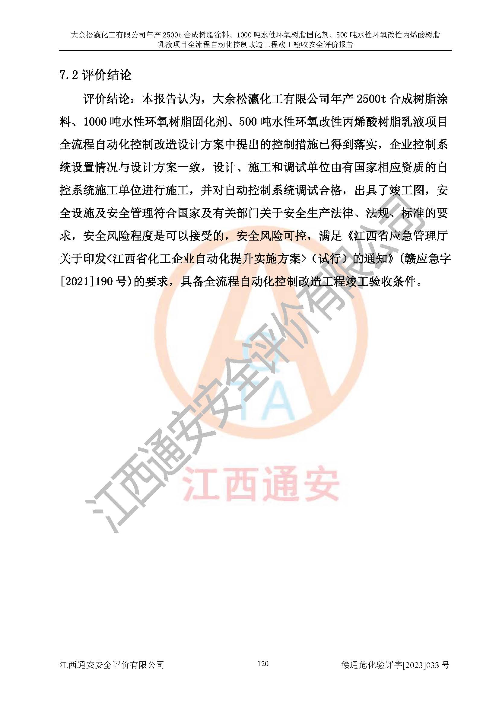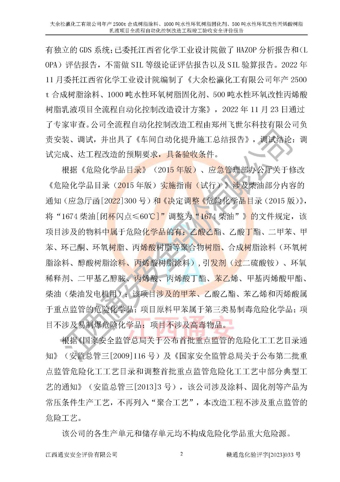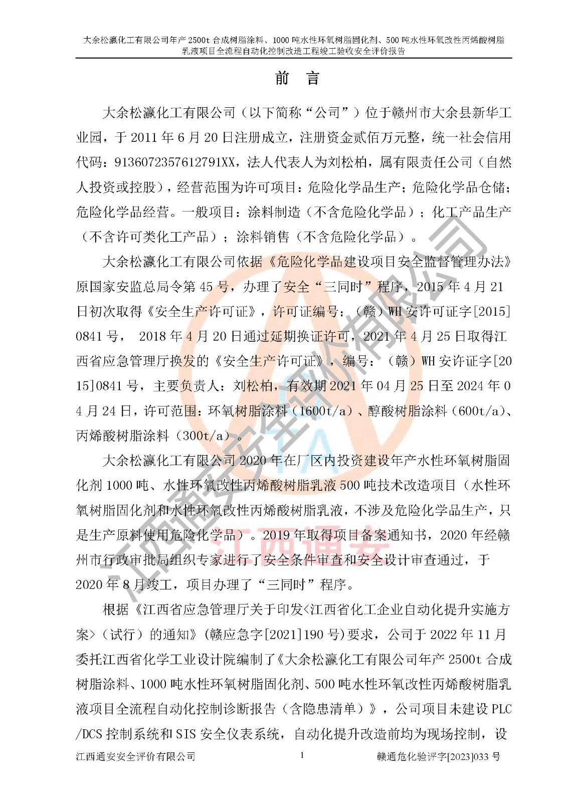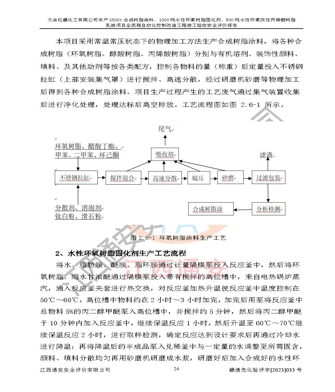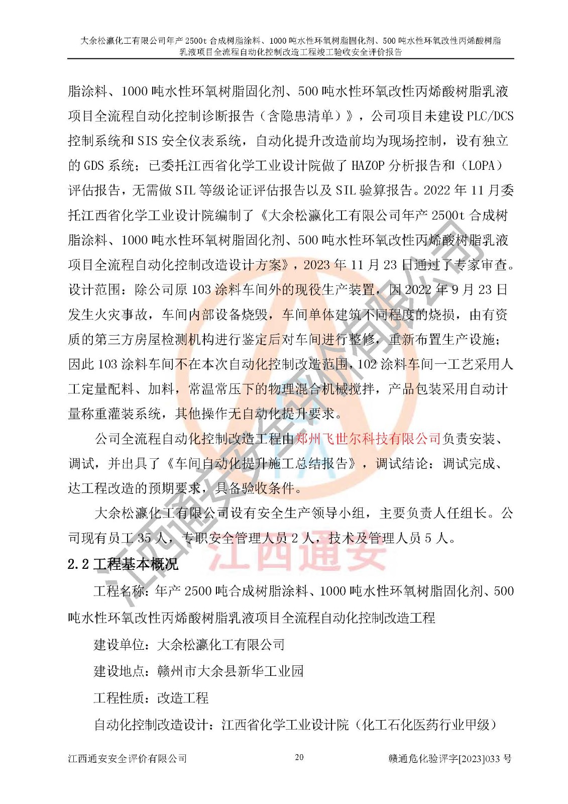 項目名稱 | 大余松瀛化工有限公司年產2500t合成樹脂涂料、1000噸水性環(huán)氧樹脂固化劑、500噸水性環(huán)氧改性丙烯酸樹脂乳液項目全流程自動化控制改造工程竣工驗收安全評價報告 | ||||