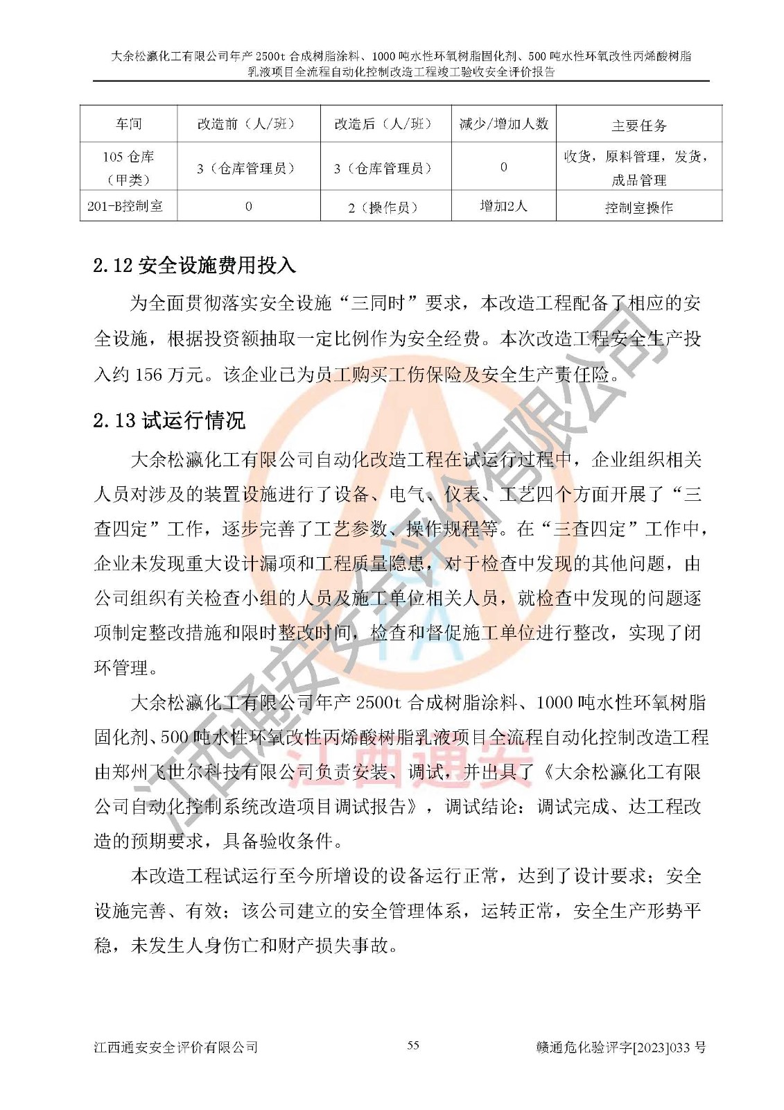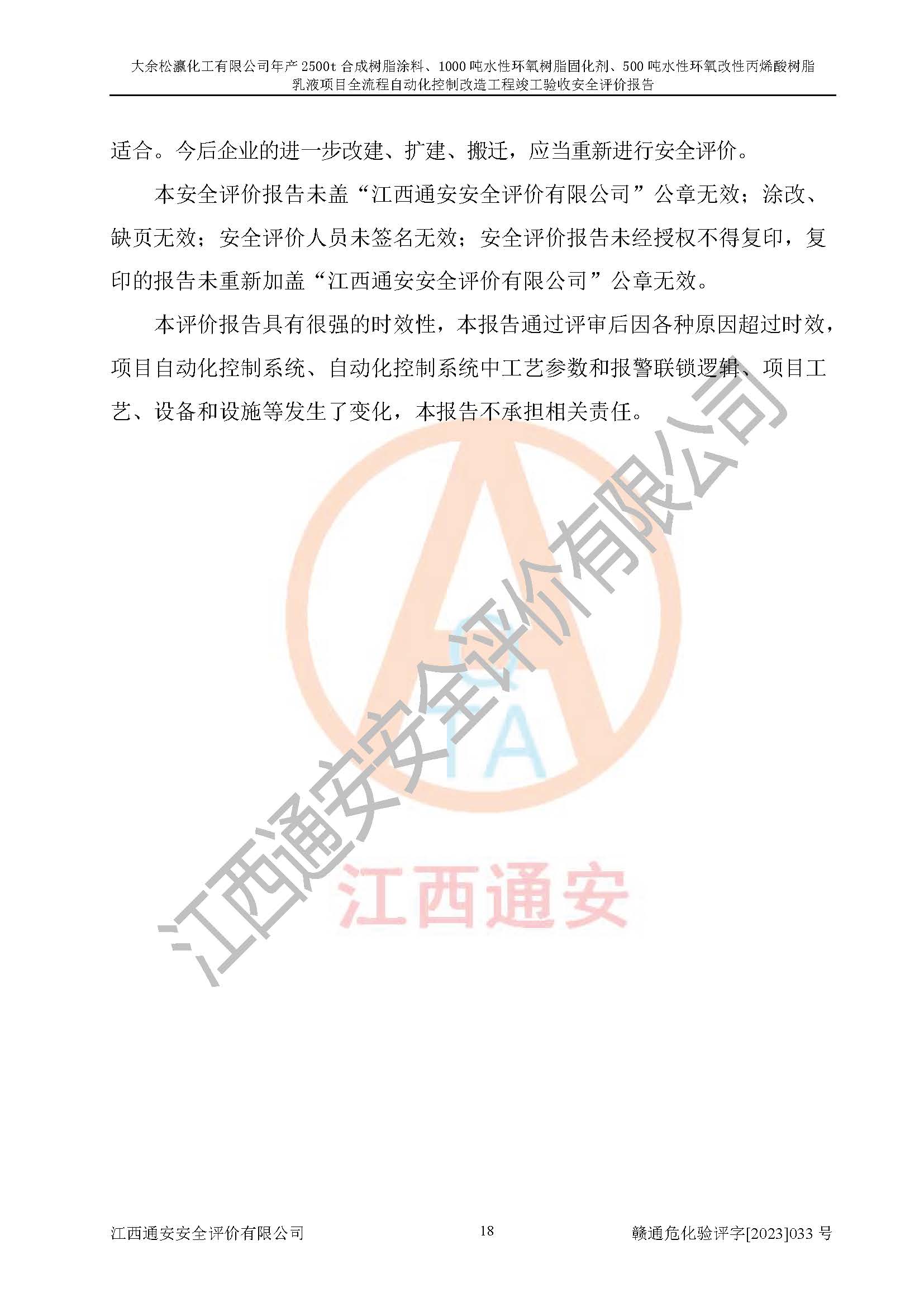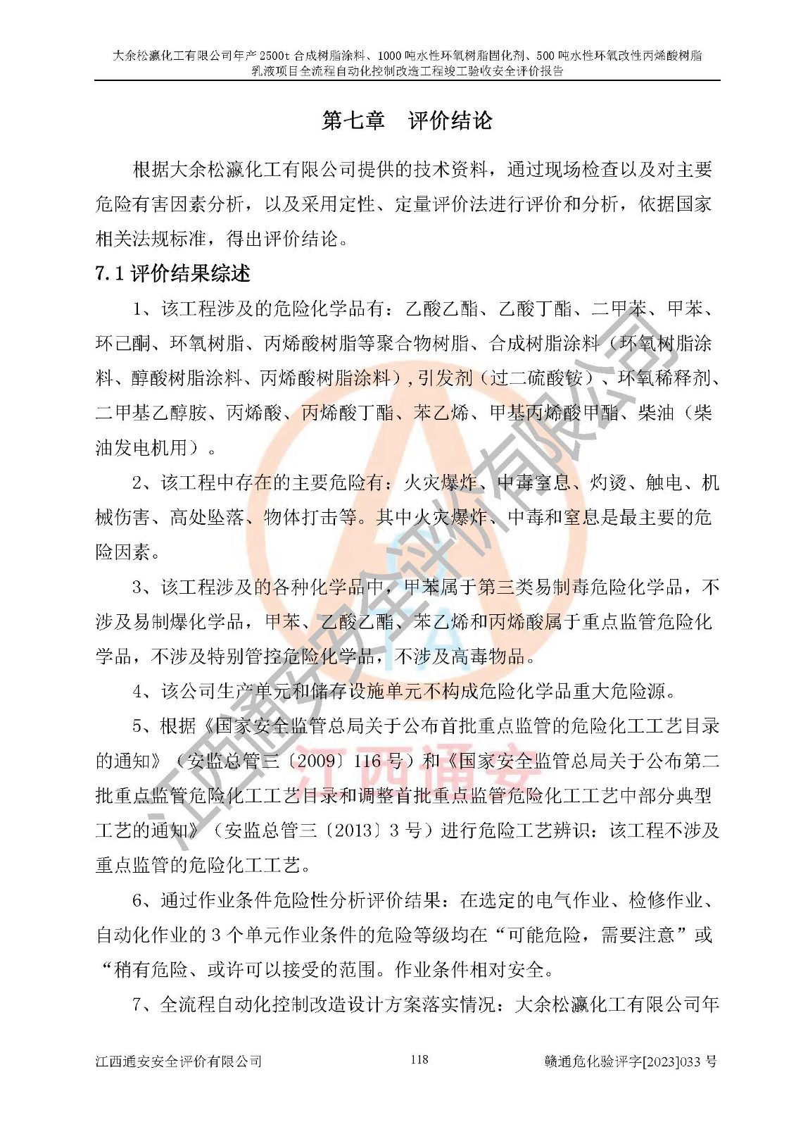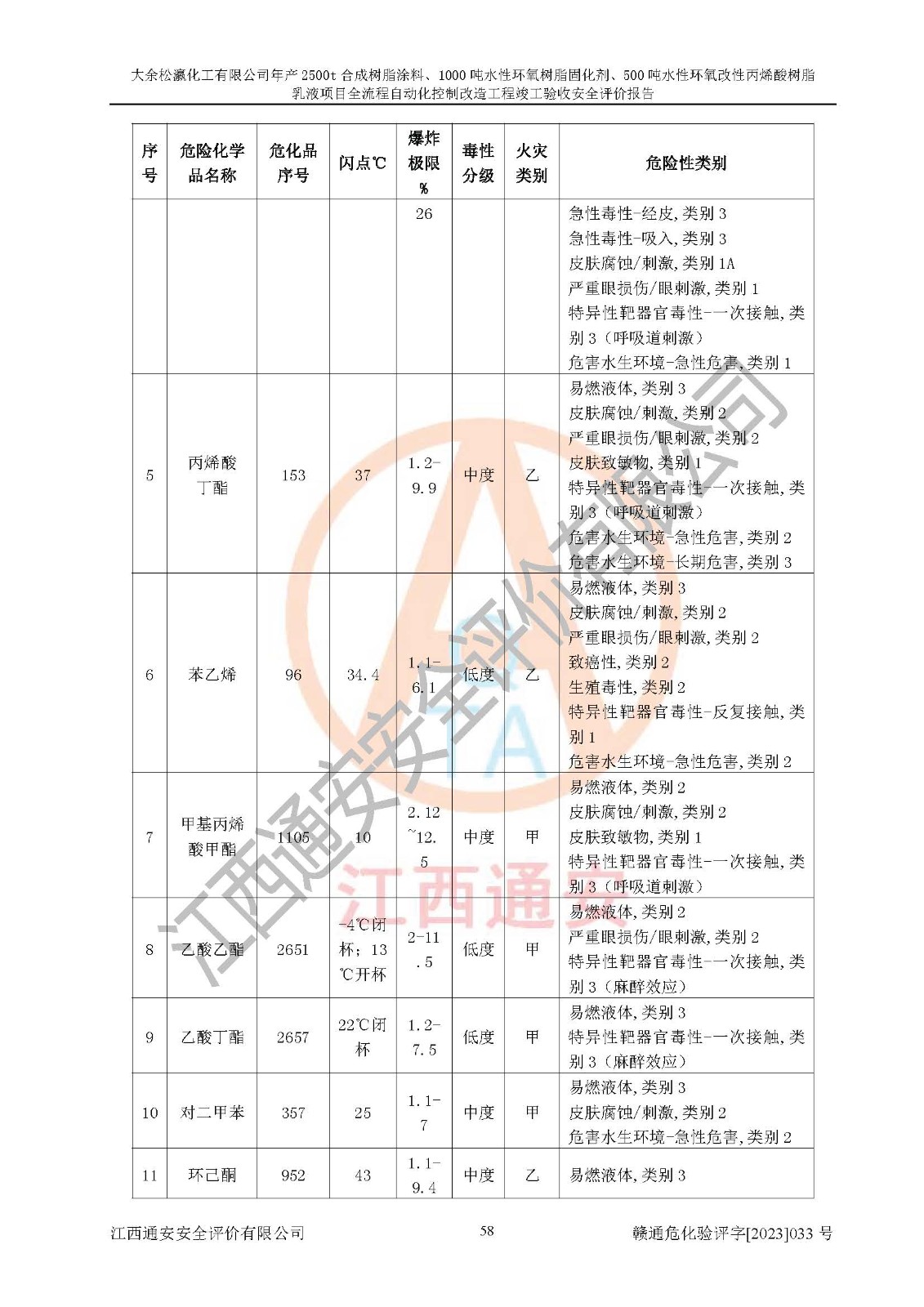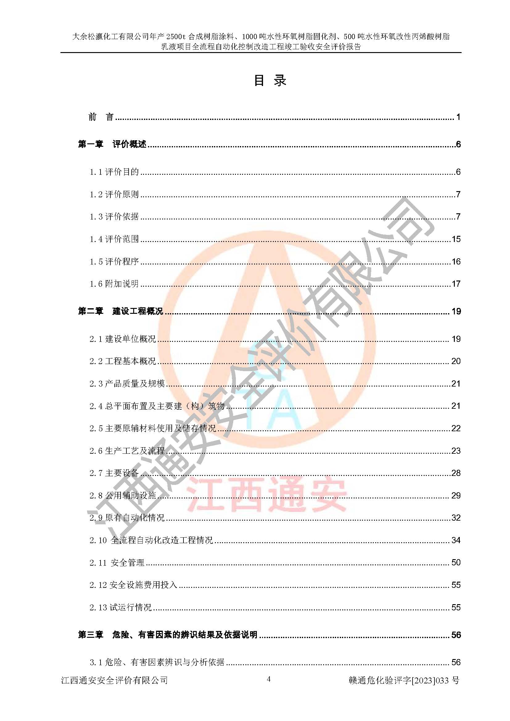 項目名稱 | 大余松瀛化工有限公司年產2500t合成樹脂涂料、1000噸水性環(huán)氧樹脂固化劑、500噸水性環(huán)氧改性丙烯酸樹脂乳液項目全流程自動化控制改造工程竣工驗收安全評價報告 | ||||