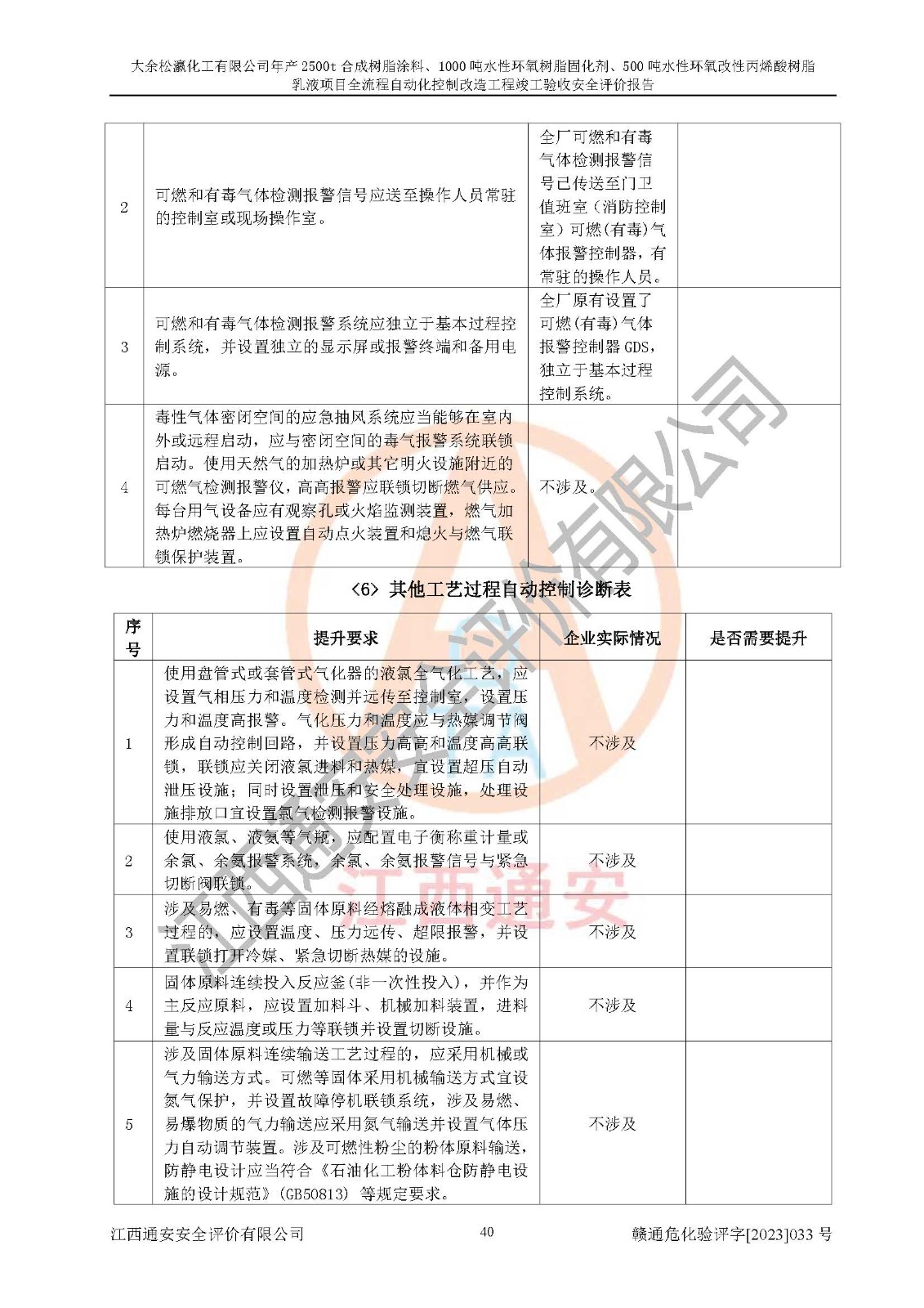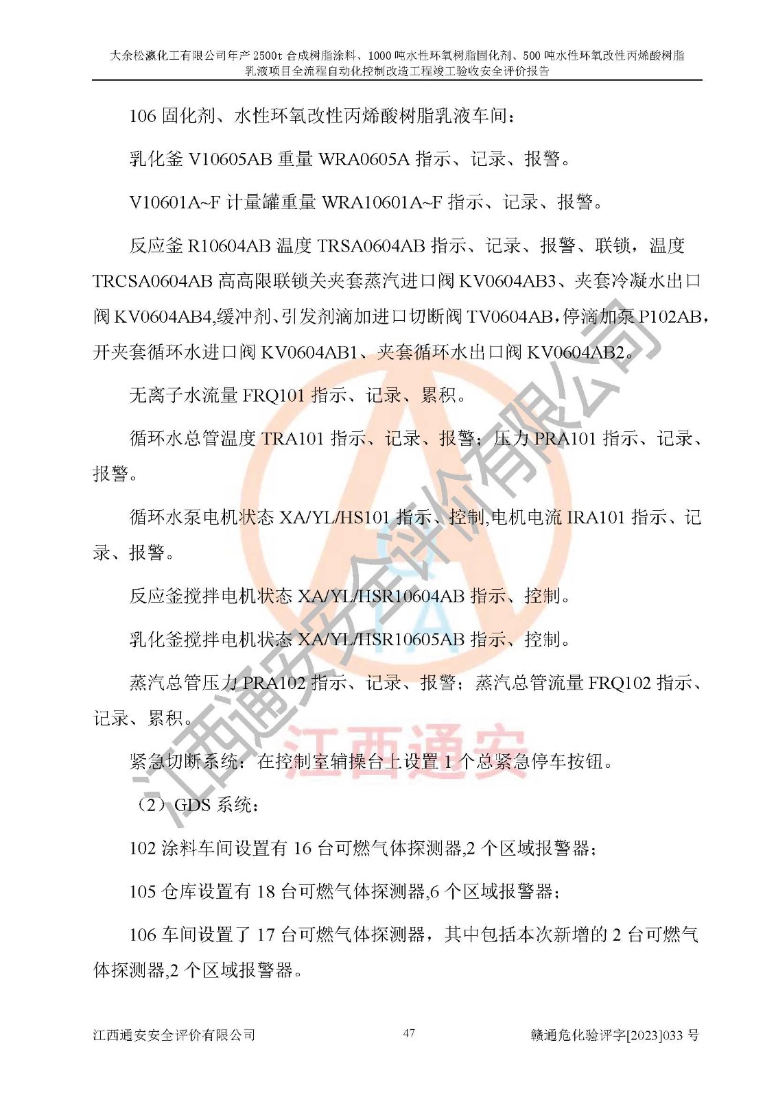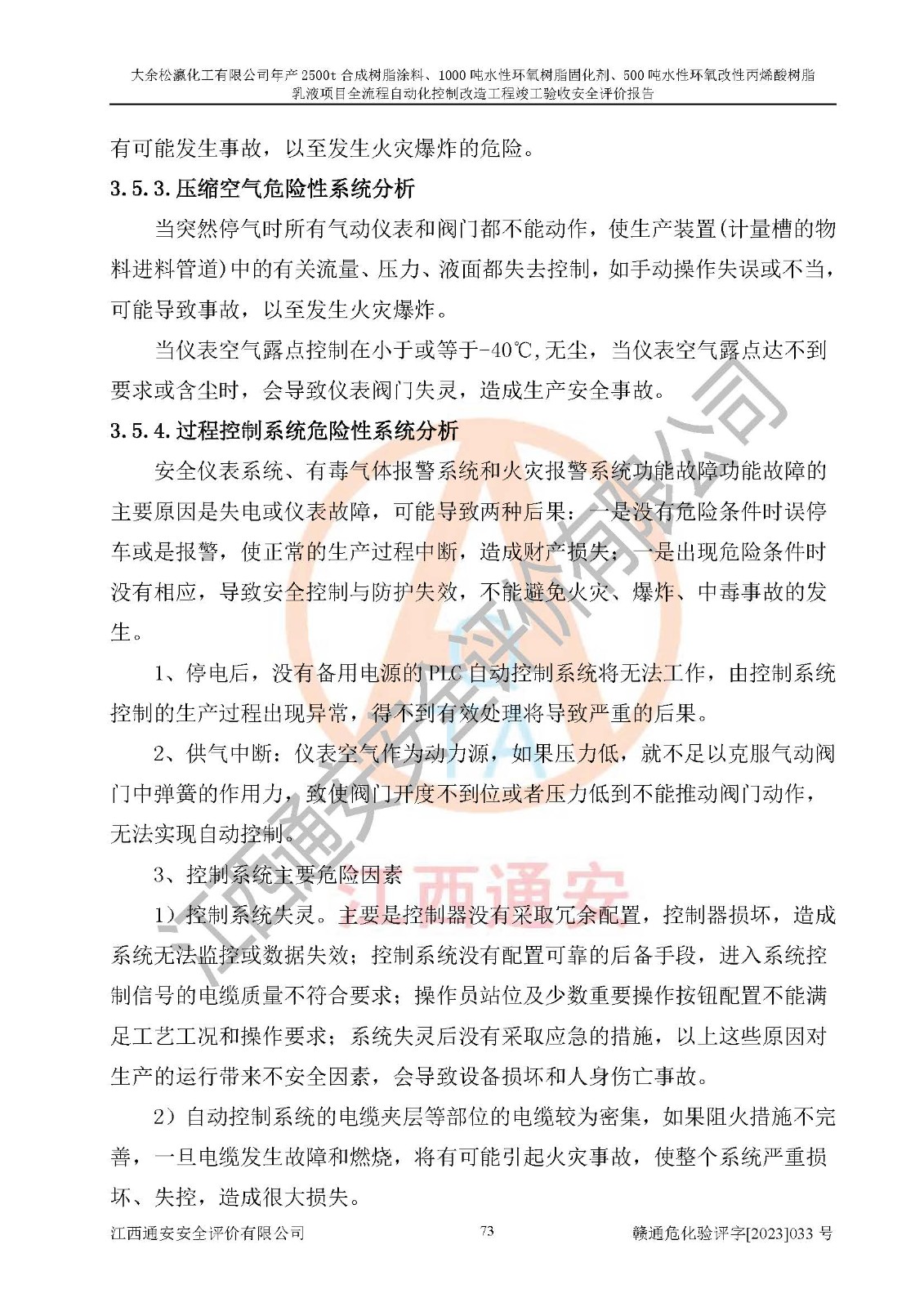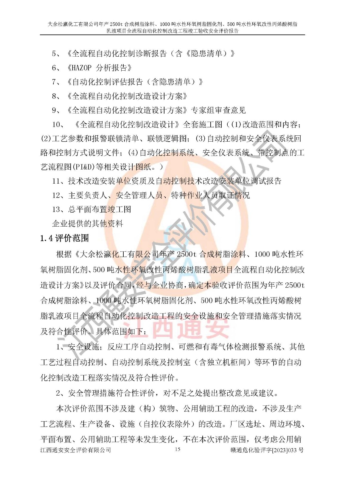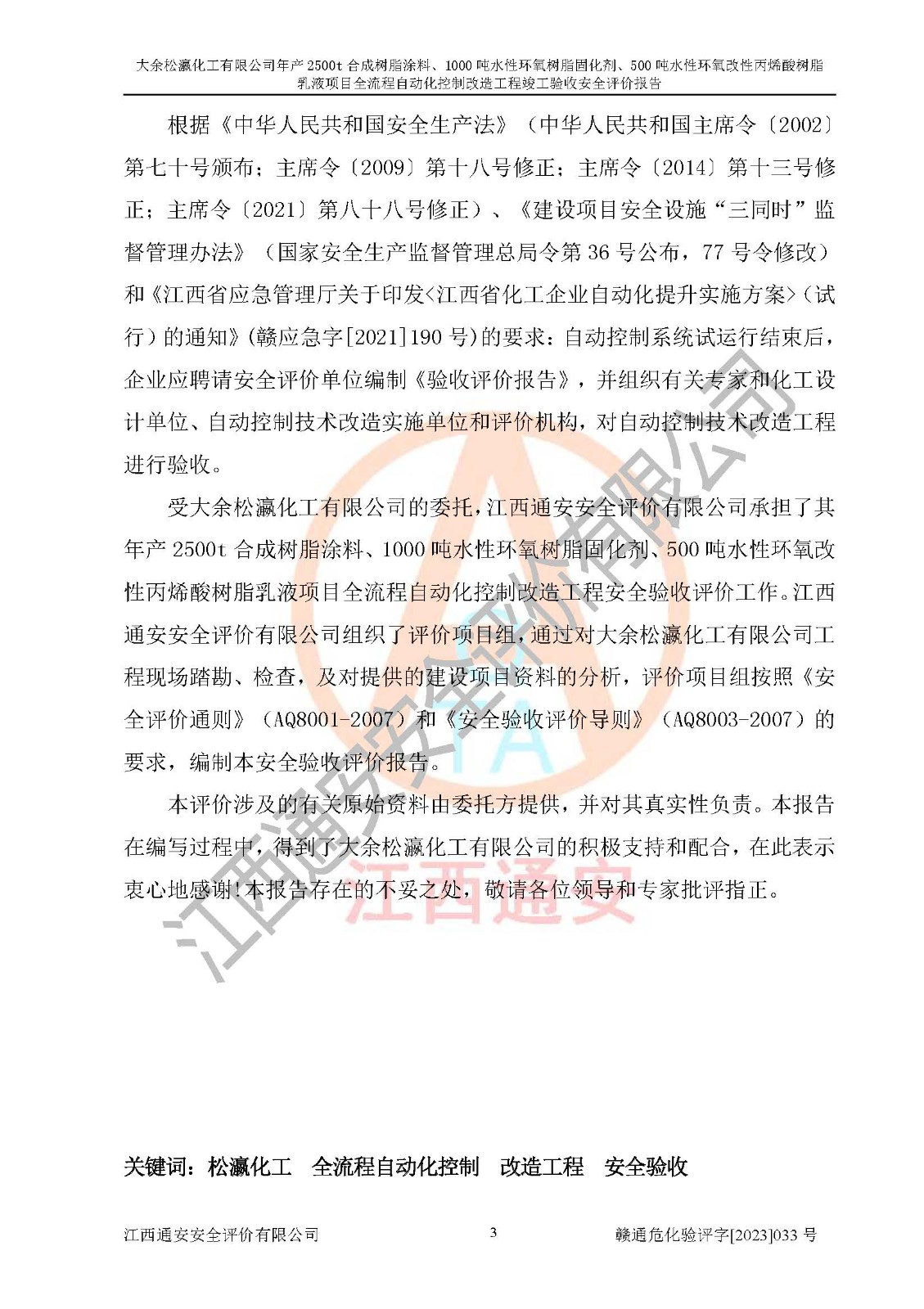 項目名稱 | 大余松瀛化工有限公司年產2500t合成樹脂涂料、1000噸水性環(huán)氧樹脂固化劑、500噸水性環(huán)氧改性丙烯酸樹脂乳液項目全流程自動化控制改造工程竣工驗收安全評價報告 | ||||