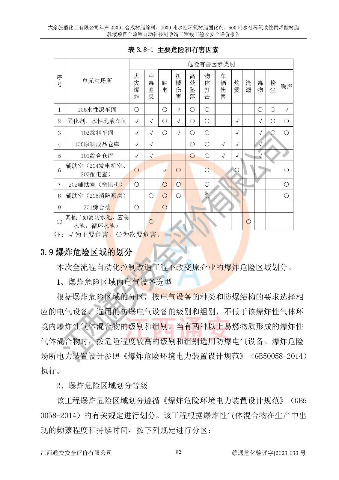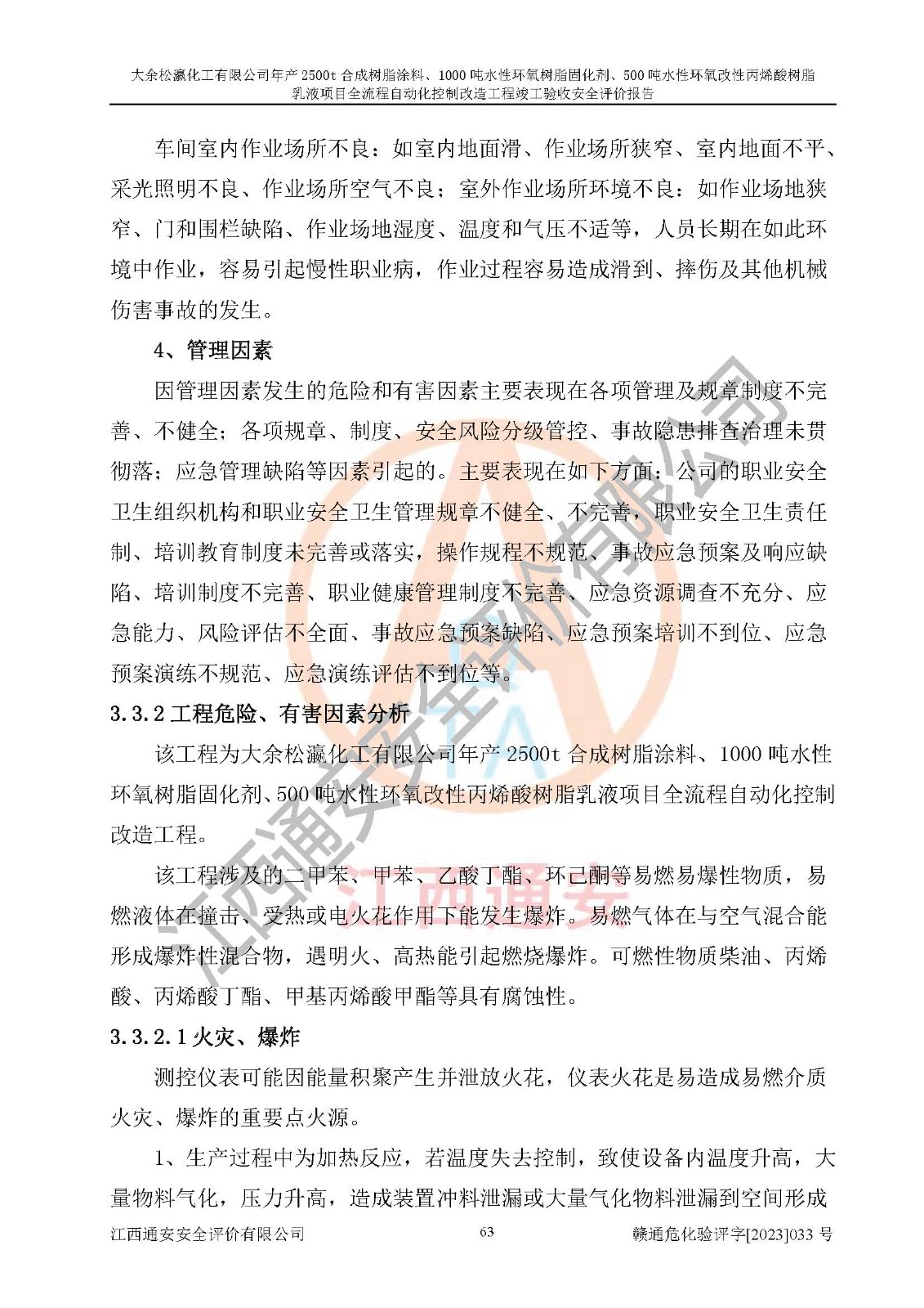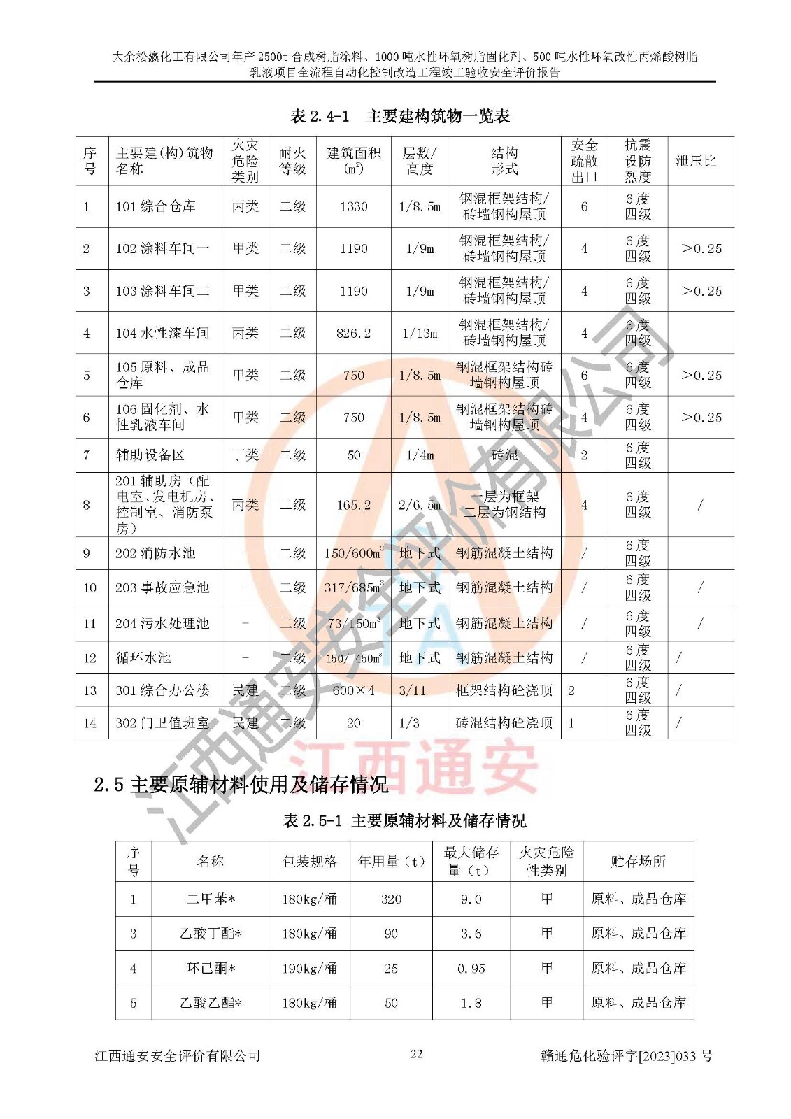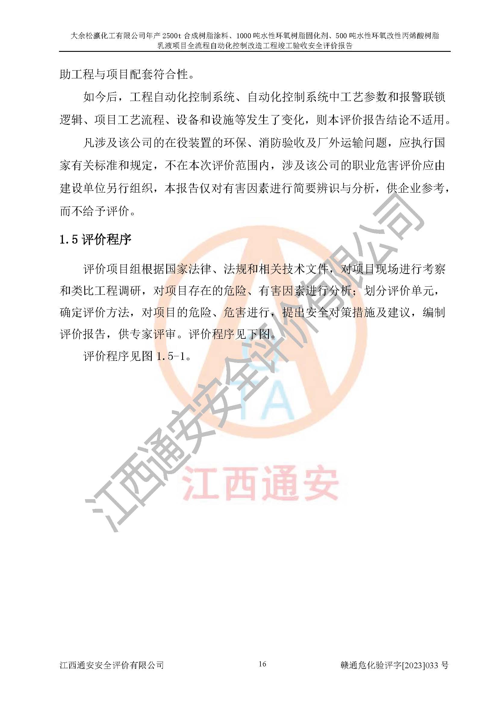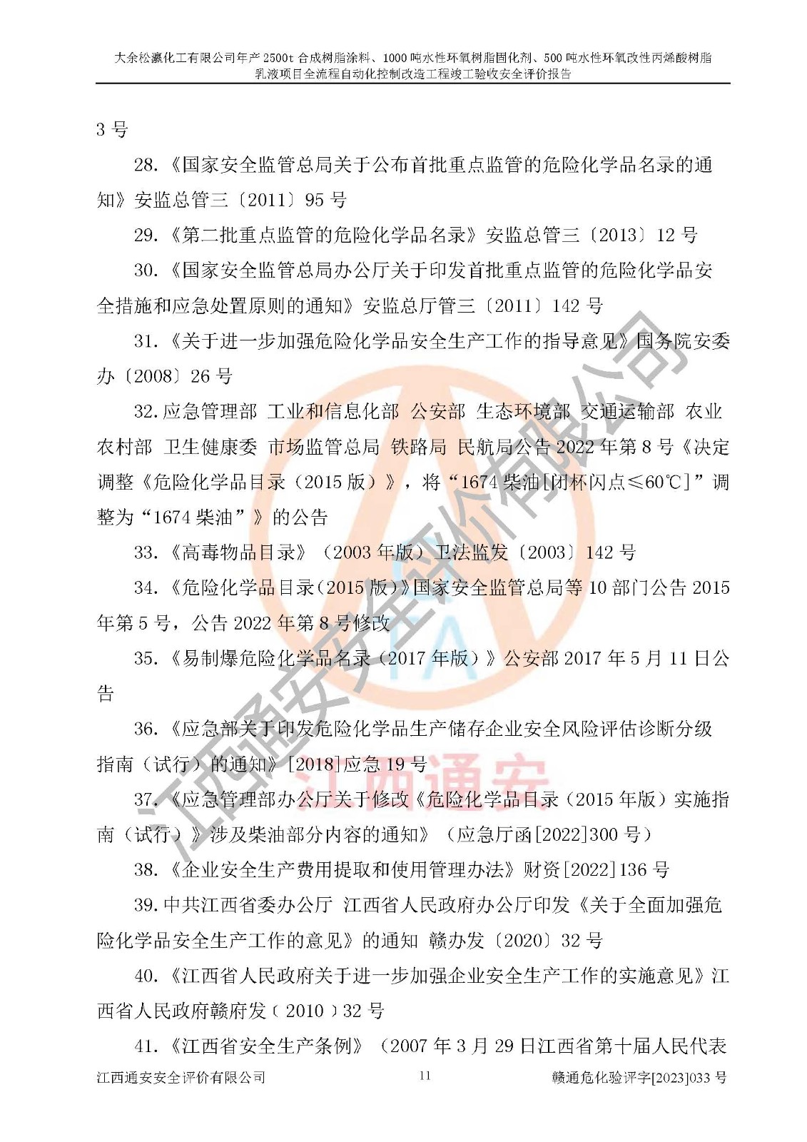 項目名稱 | 大余松瀛化工有限公司年產2500t合成樹脂涂料、1000噸水性環(huán)氧樹脂固化劑、500噸水性環(huán)氧改性丙烯酸樹脂乳液項目全流程自動化控制改造工程竣工驗收安全評價報告 | ||||