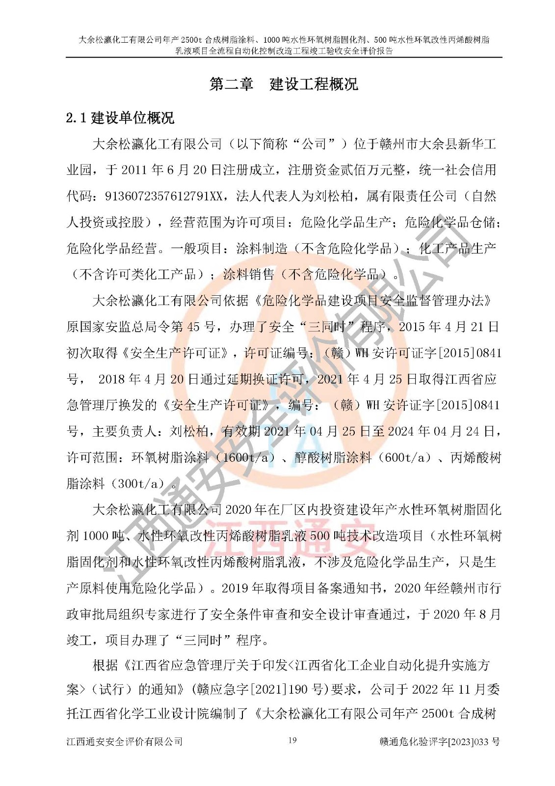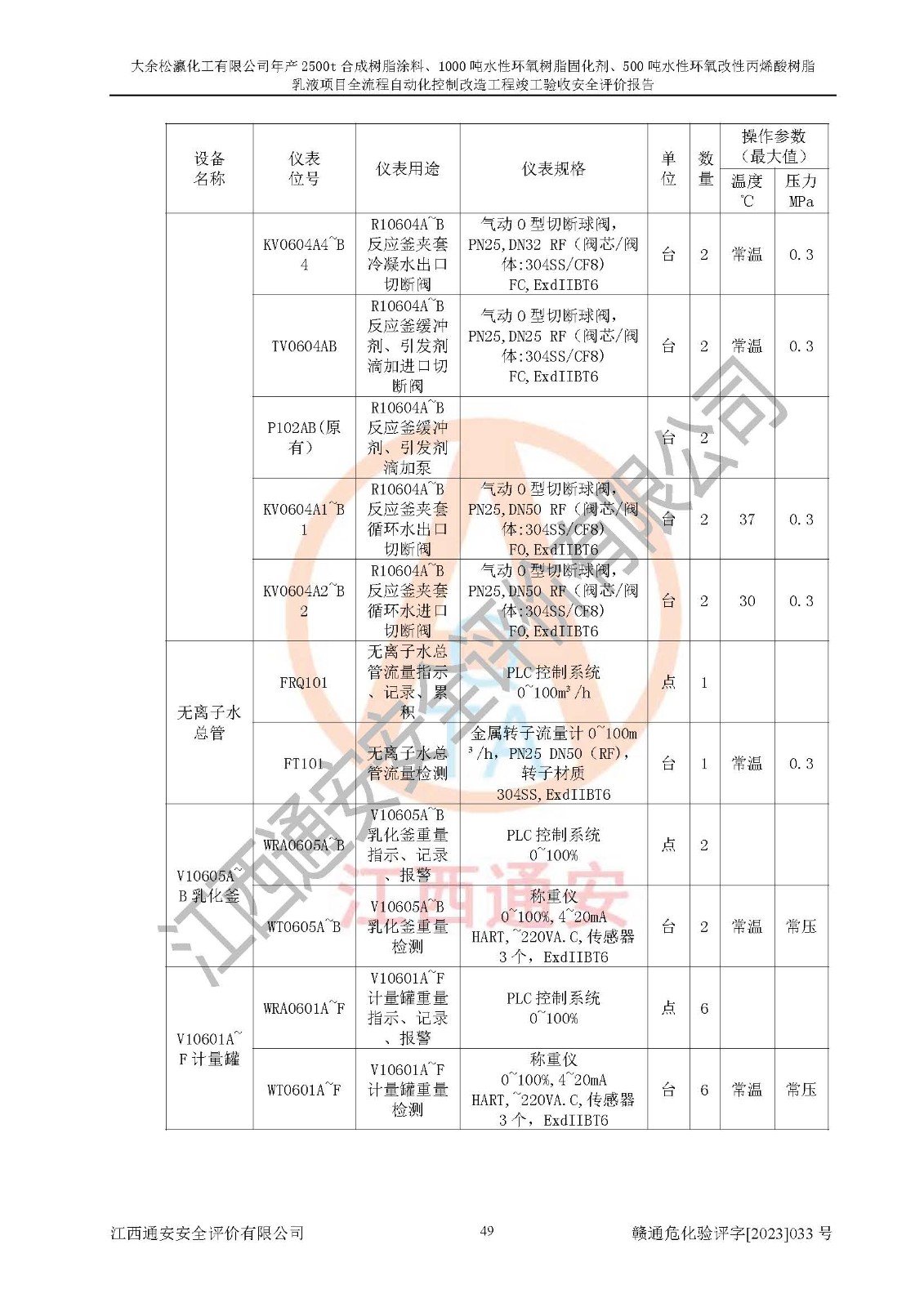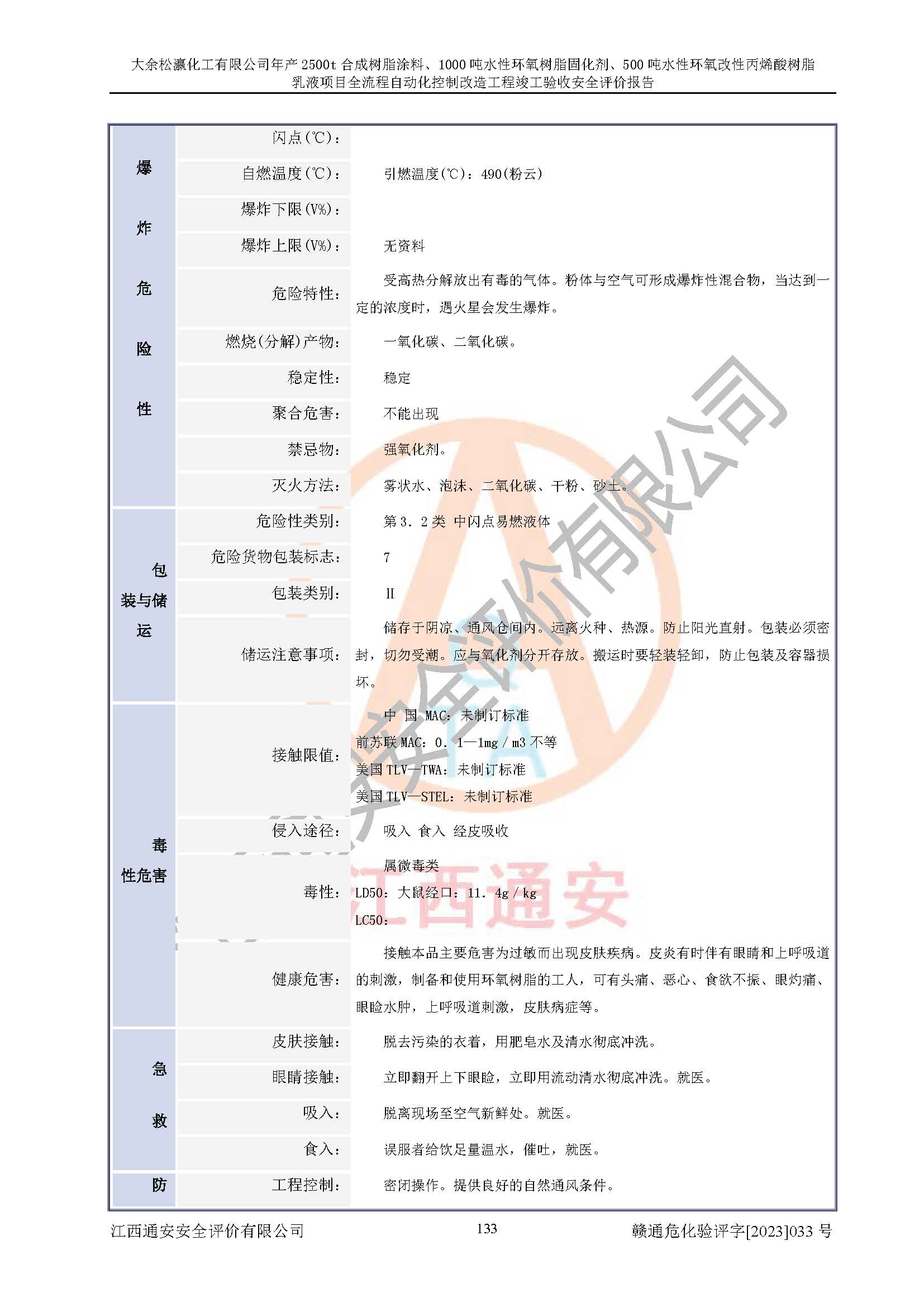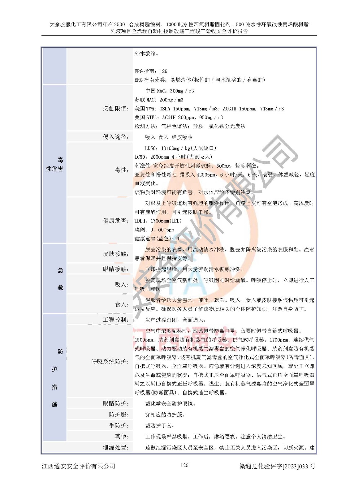 項目名稱 | 大余松瀛化工有限公司年產2500t合成樹脂涂料、1000噸水性環(huán)氧樹脂固化劑、500噸水性環(huán)氧改性丙烯酸樹脂乳液項目全流程自動化控制改造工程竣工驗收安全評價報告 | ||||
